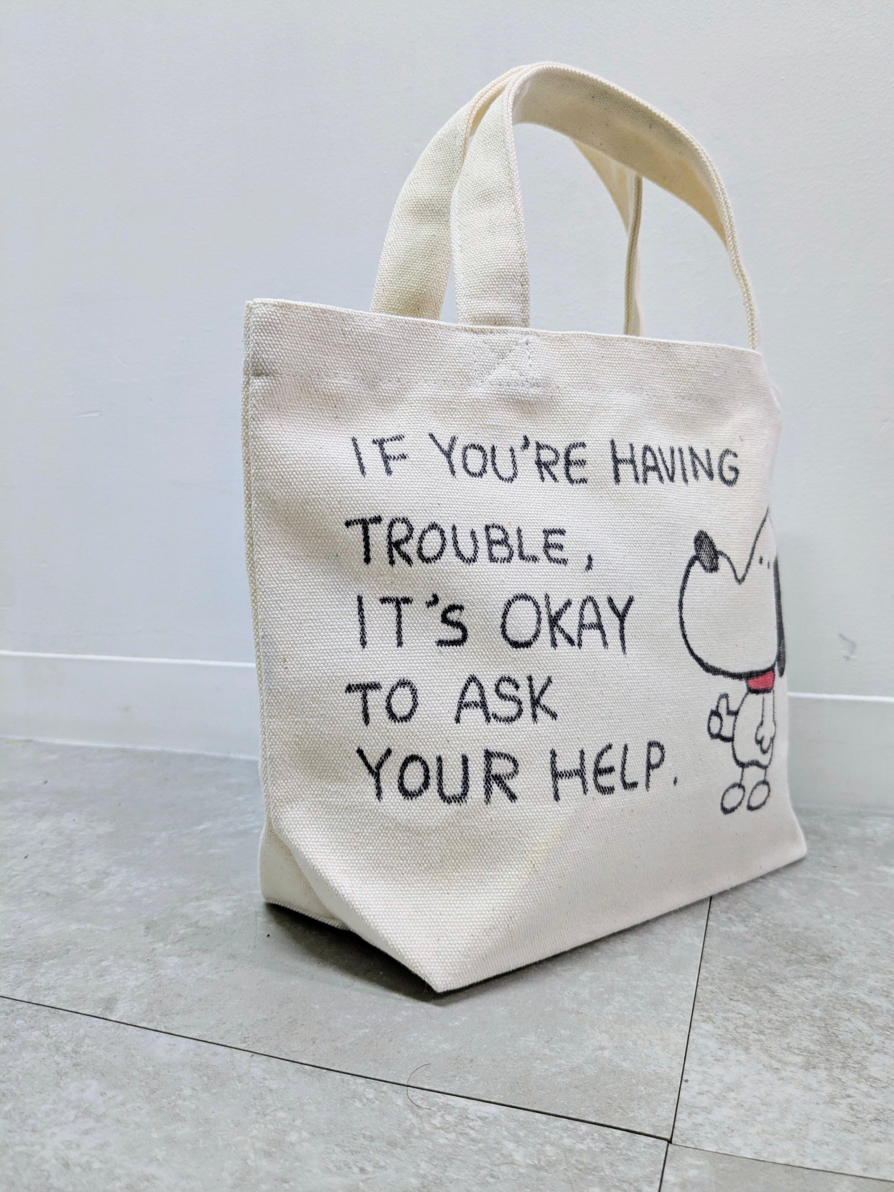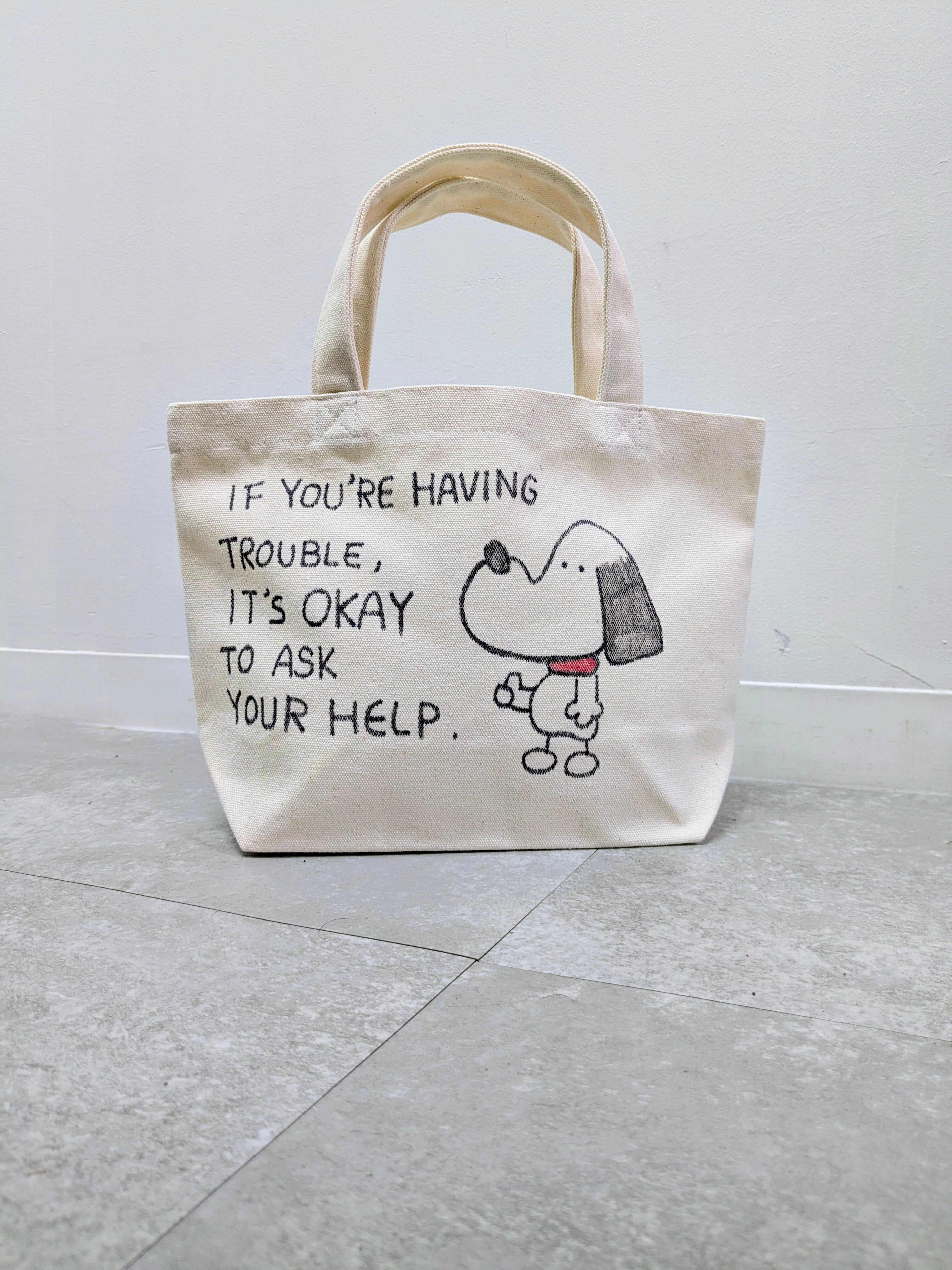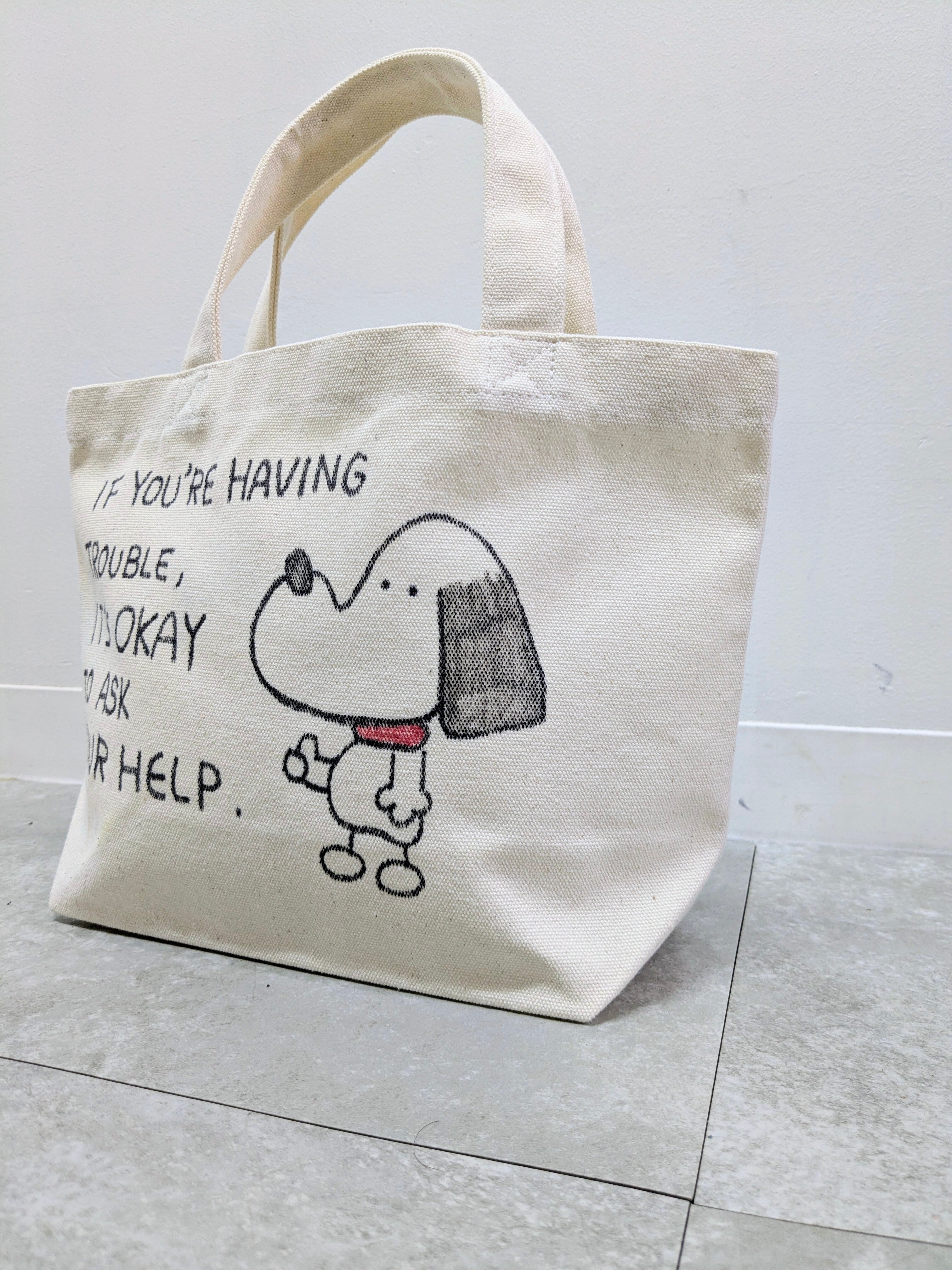 キャンバスのトートバッグにイラストを加えています。メモリアルの要素があり、どこか見たことあるキャラクターがいたりと、とにかく可愛いアイテム。全て手作業になるので、唯一無二の一点物となります。