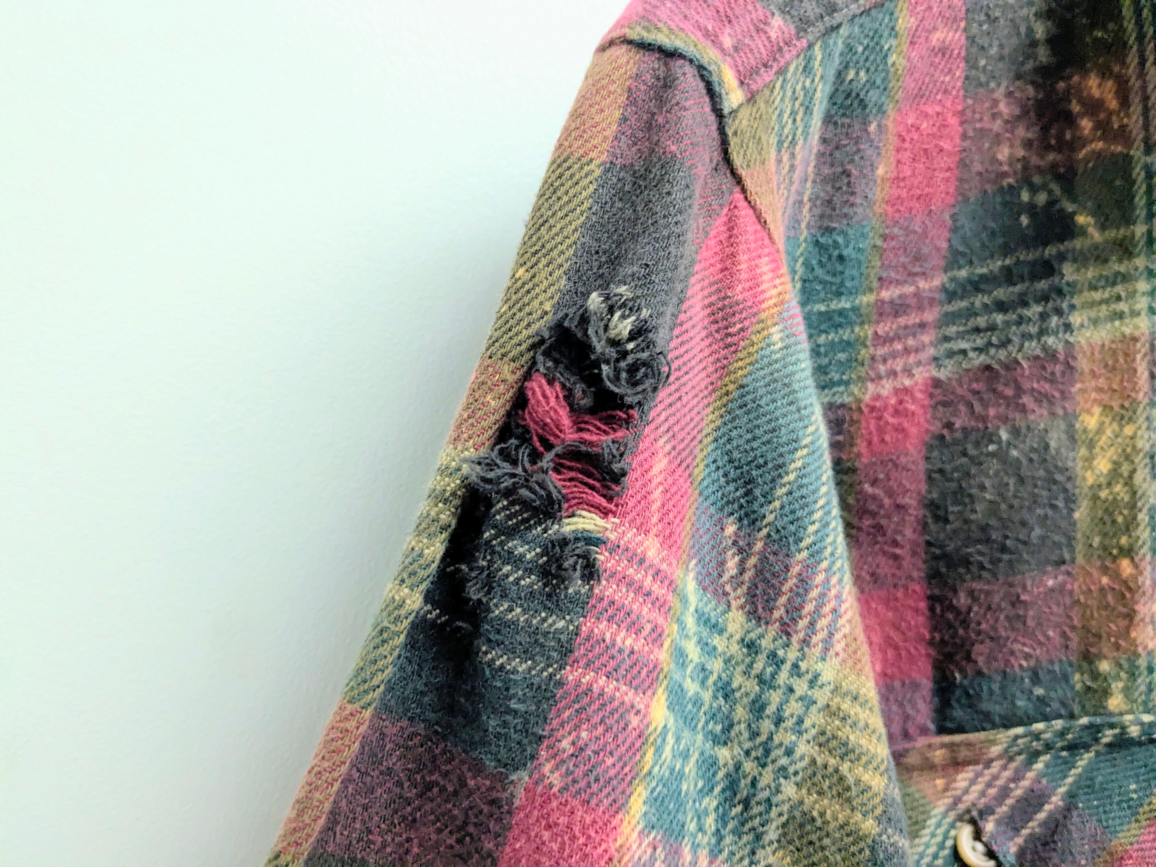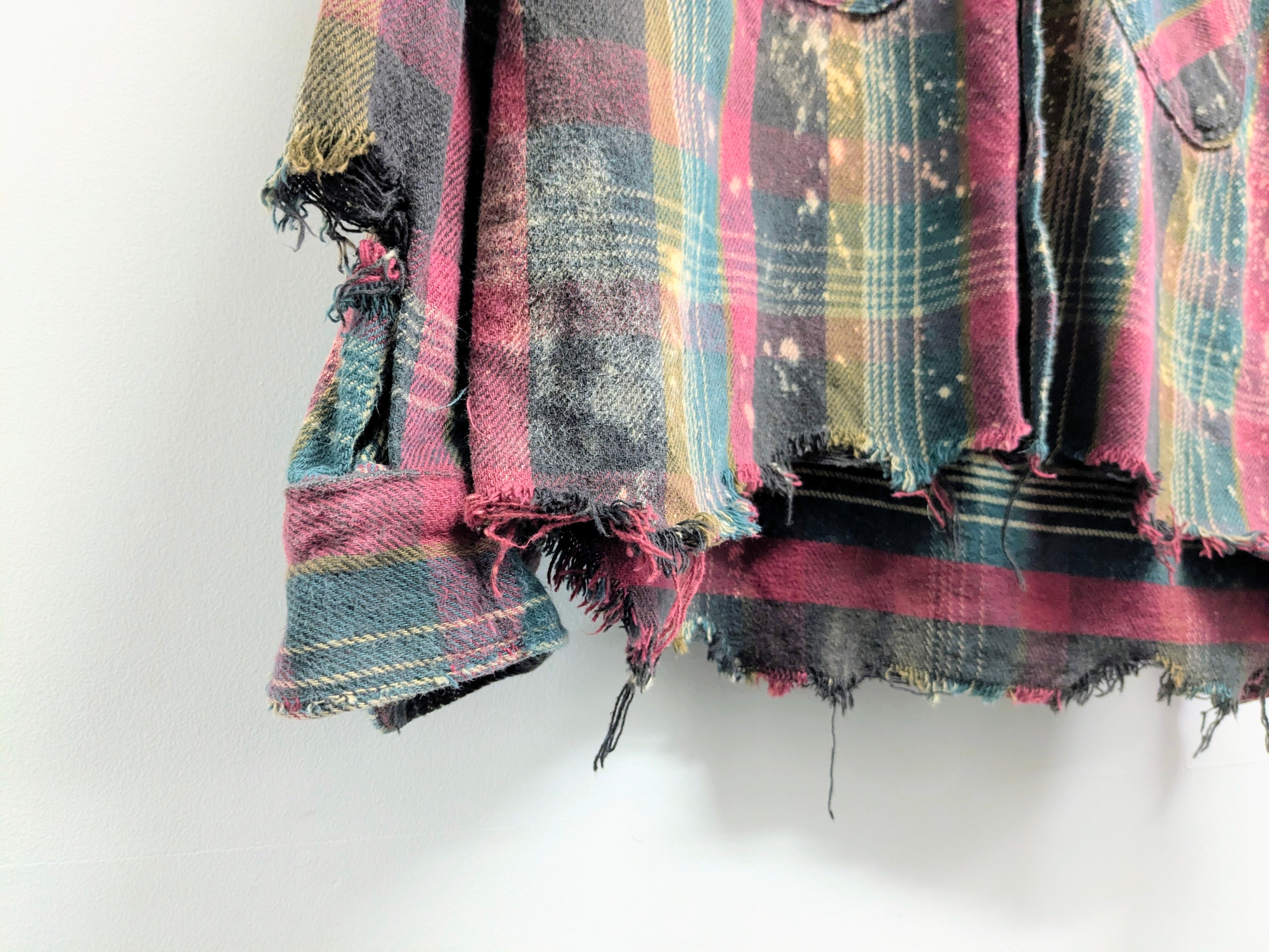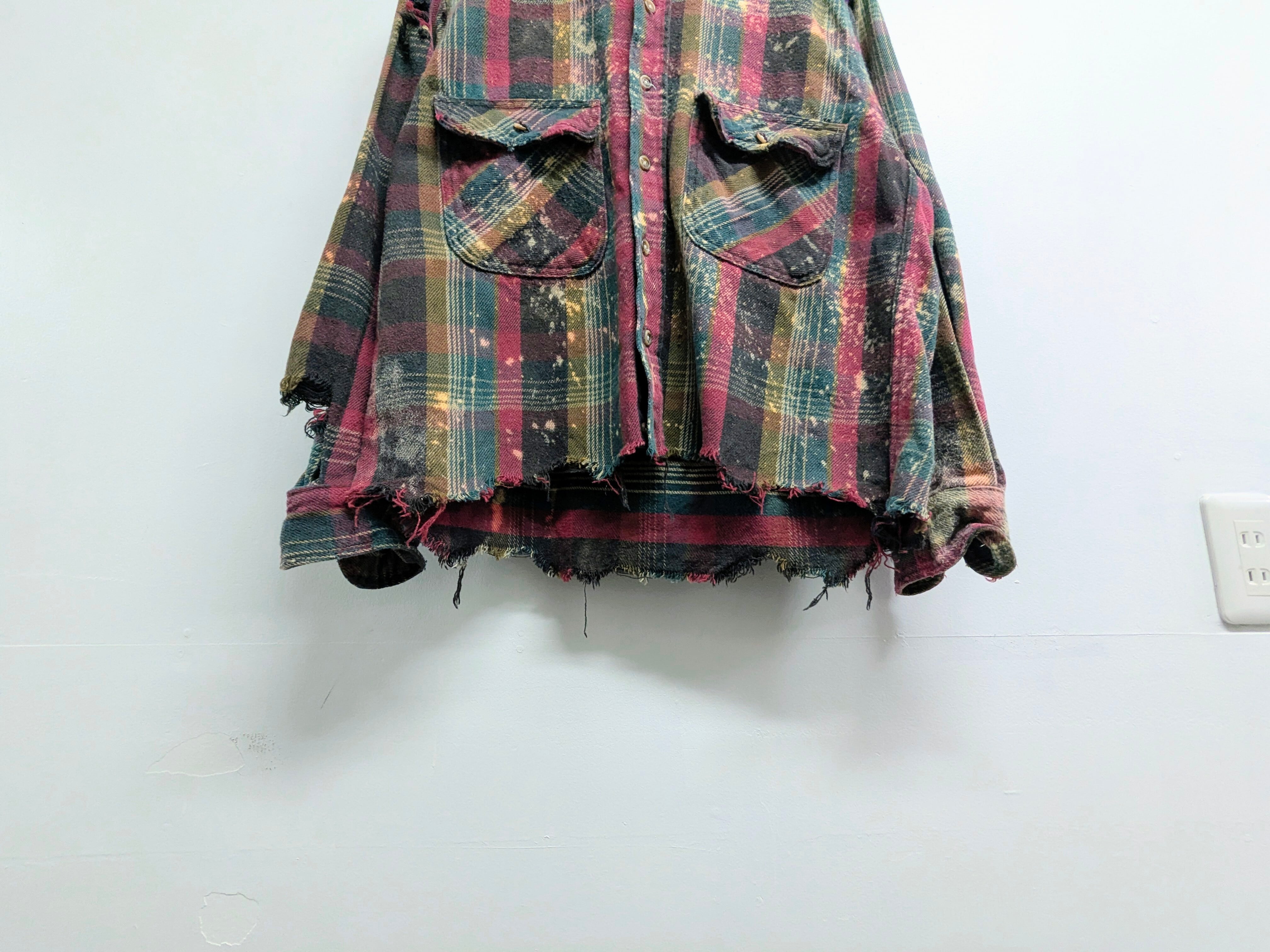 フェード加工、襟、袖などにダメージ、裾カットオフがされているボロ加工ネルシャツ。裾に関しては、真っ直ぐでなくランダムにカットされています。短丈になることで、バランス良く着れるところと、ブルゾンのような形になるので、シャツとして中間着、ブルゾンとしてアウターの用途と使い分けができます。結果、着れる時期が長くとれるのもポイント。元々のボディのダメージなどもあります。