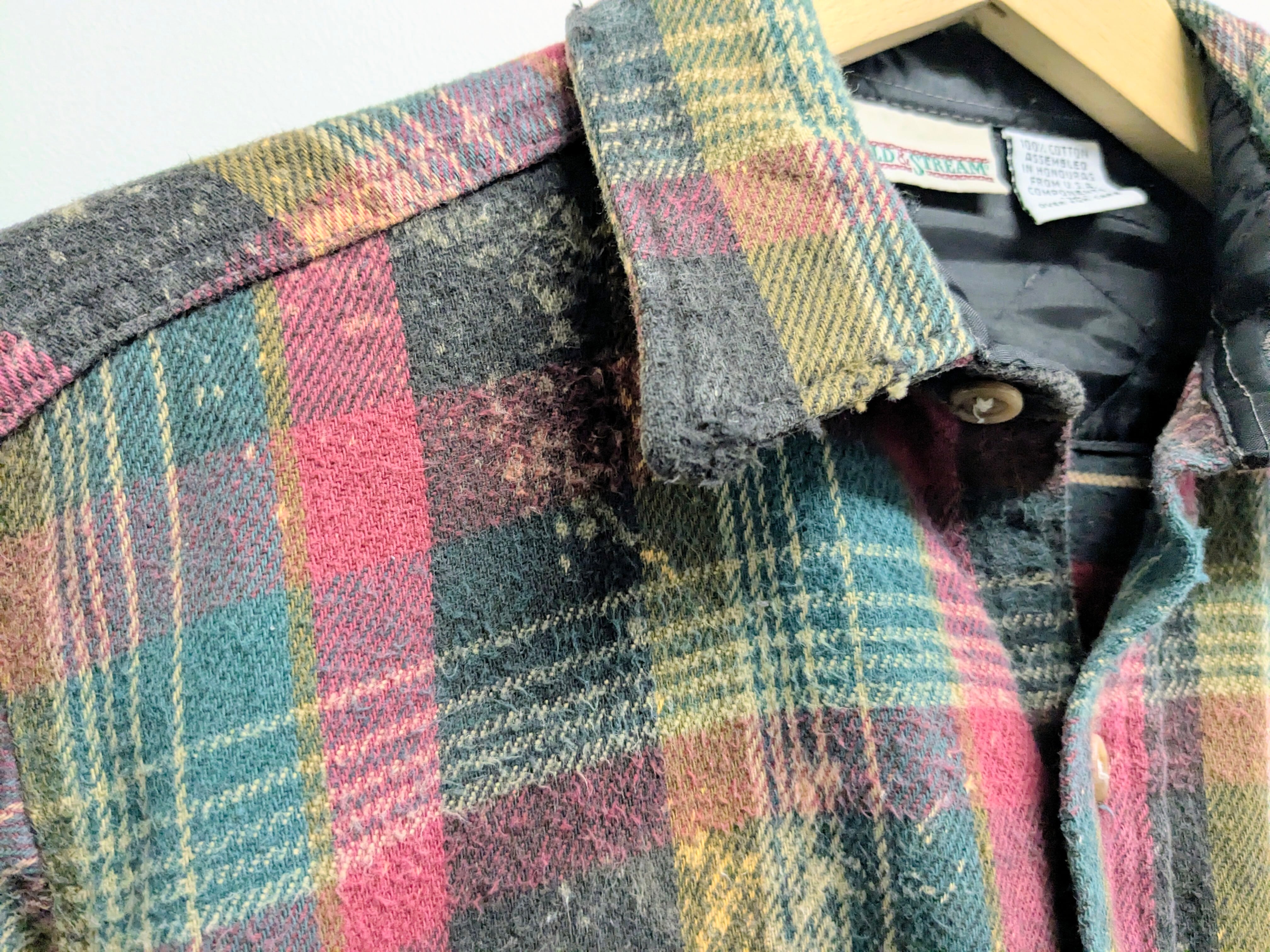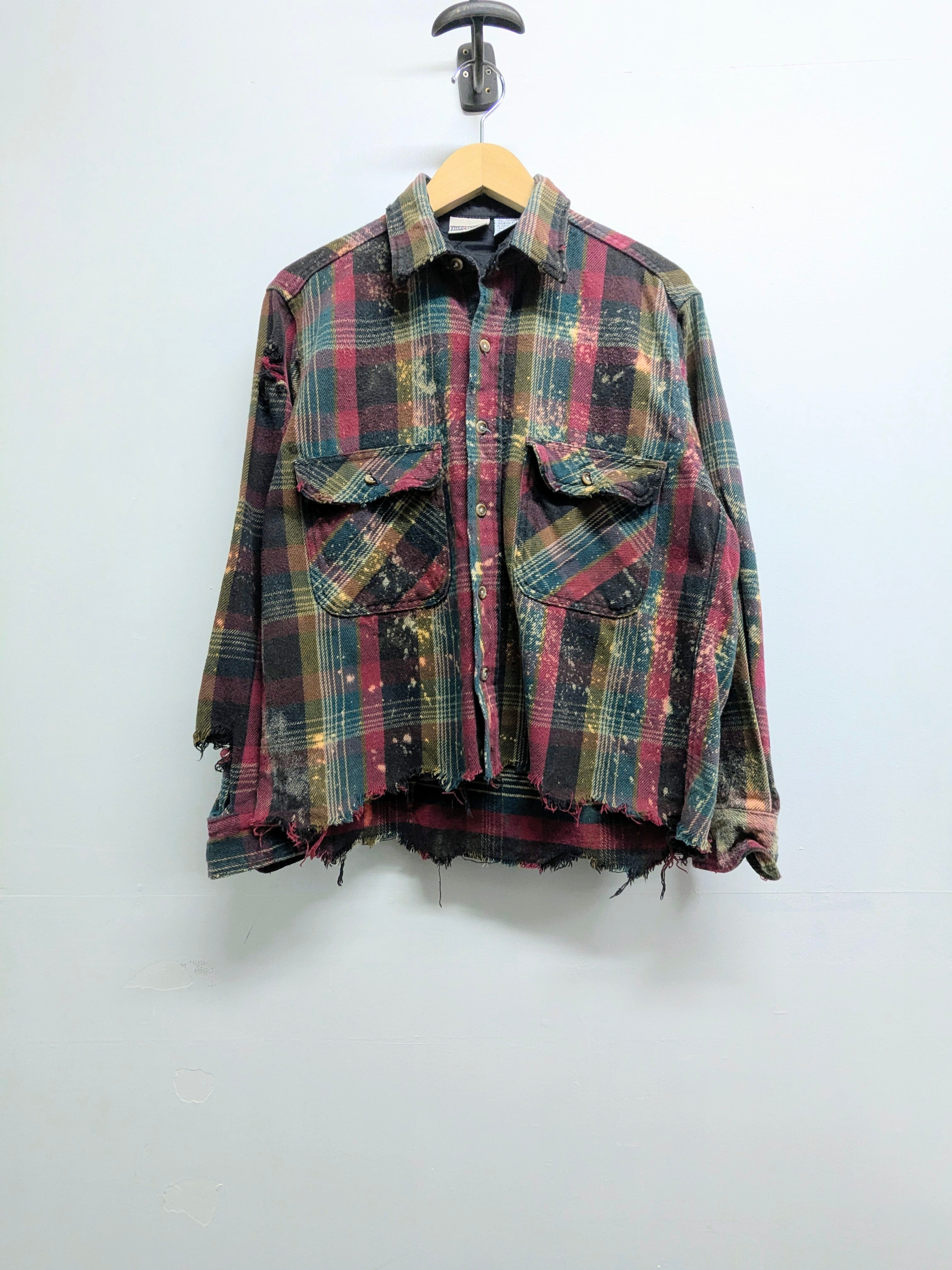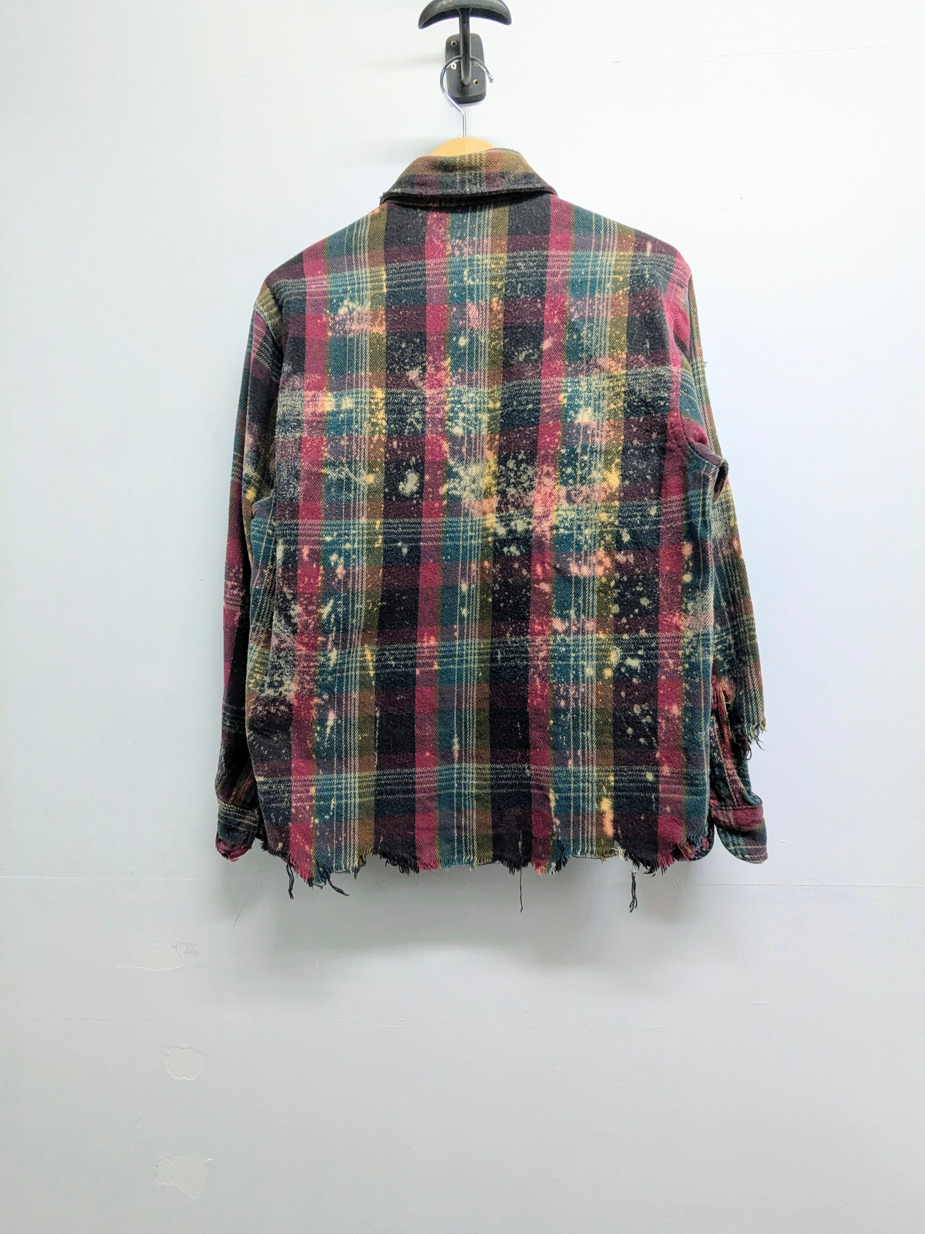 フェード加工、襟、袖などにダメージ、裾カットオフがされているボロ加工ネルシャツ。裾に関しては、真っ直ぐでなくランダムにカットされています。短丈になることで、バランス良く着れるところと、ブルゾンのような形になるので、シャツとして中間着、ブルゾンとしてアウターの用途と使い分けができます。結果、着れる時期が長くとれるのもポイント。元々のボディのダメージなどもあります。
