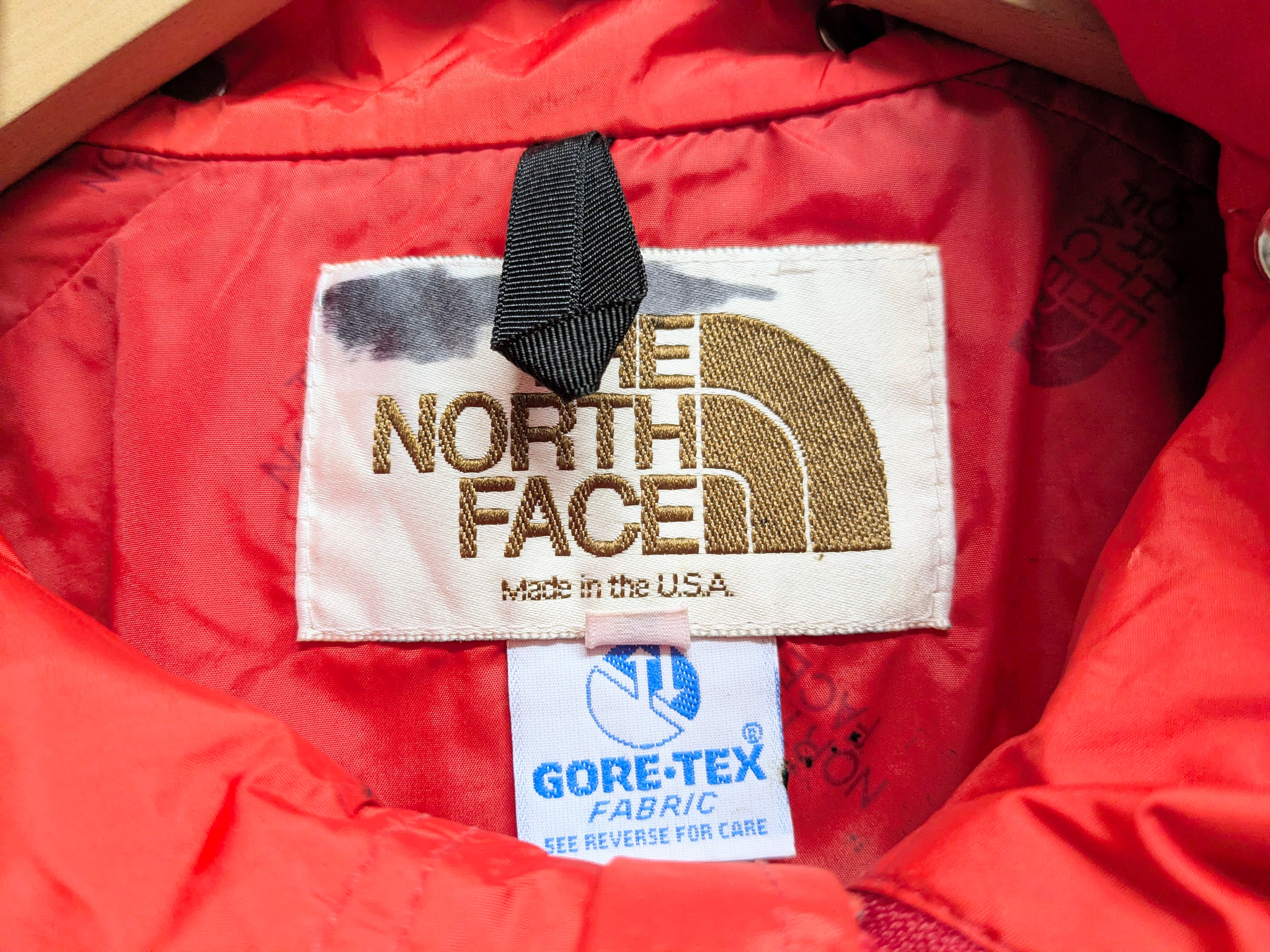 1970-1980年代頃のノースフェイス。茶タグのアメリカ製。フードも付属。フードのトップボタンが付けづらい、ポケットのジップの持ち手欠損使用には問題なし。ゴアテックスなのも嬉しいポイント。汚れあり。