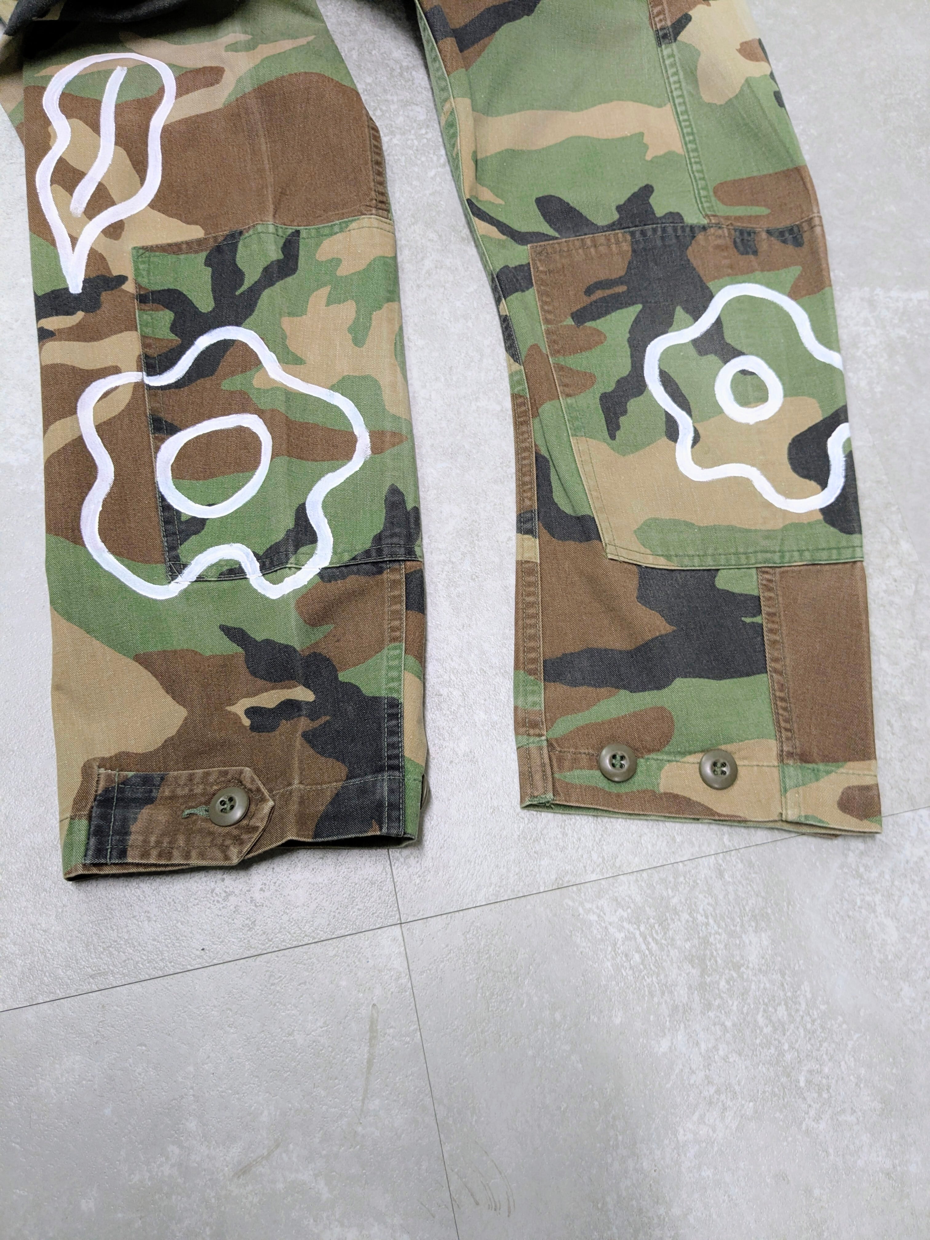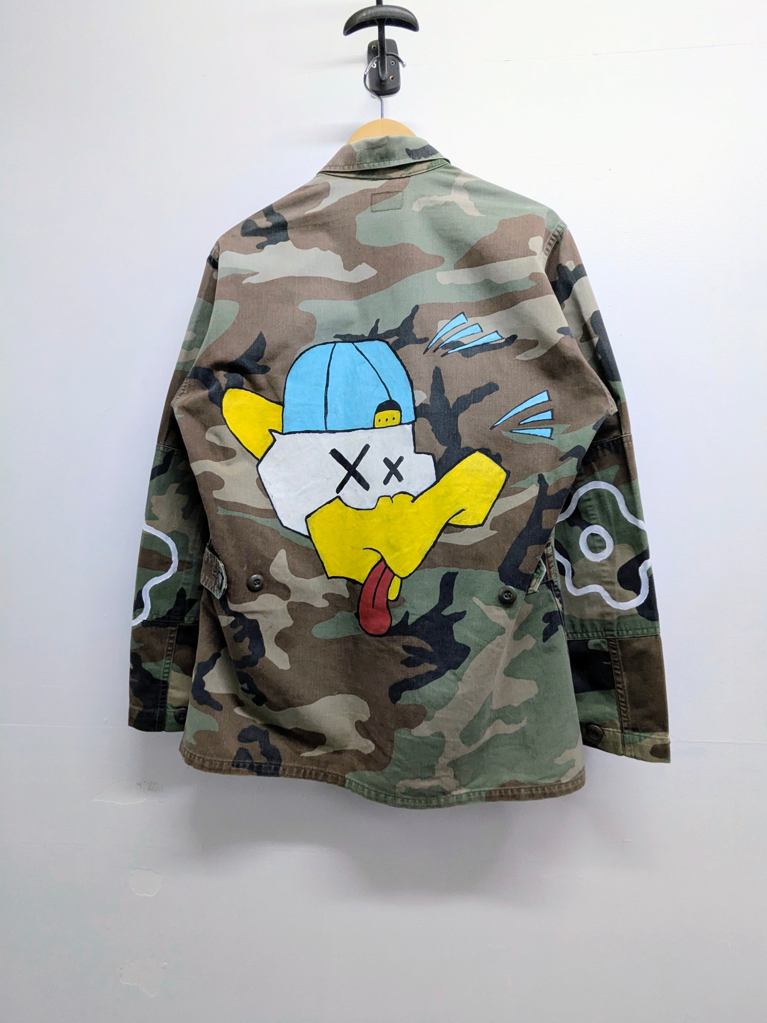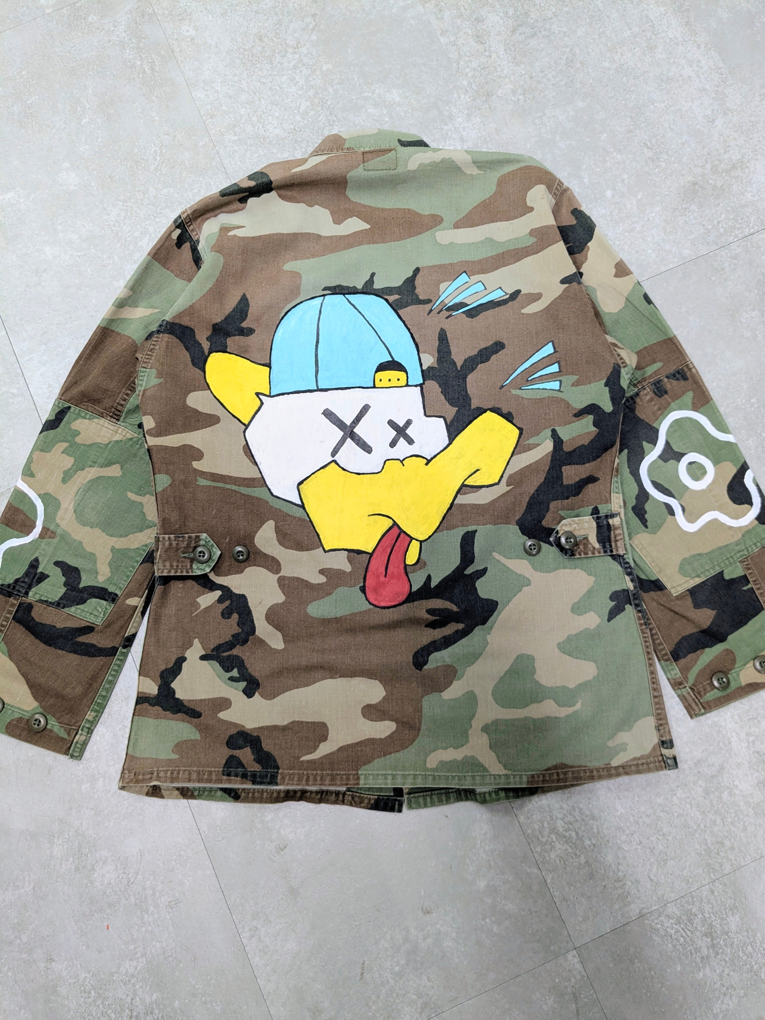 ミリタリーブルゾンに手描きでイラストを加えたアイテム。アートのような花柄とどこか見たことあるようなキャラクター、パーツがイラストとして加えてあります。ちょっと変化のあるミリタリーアイテムをお探しの方へオススメ。