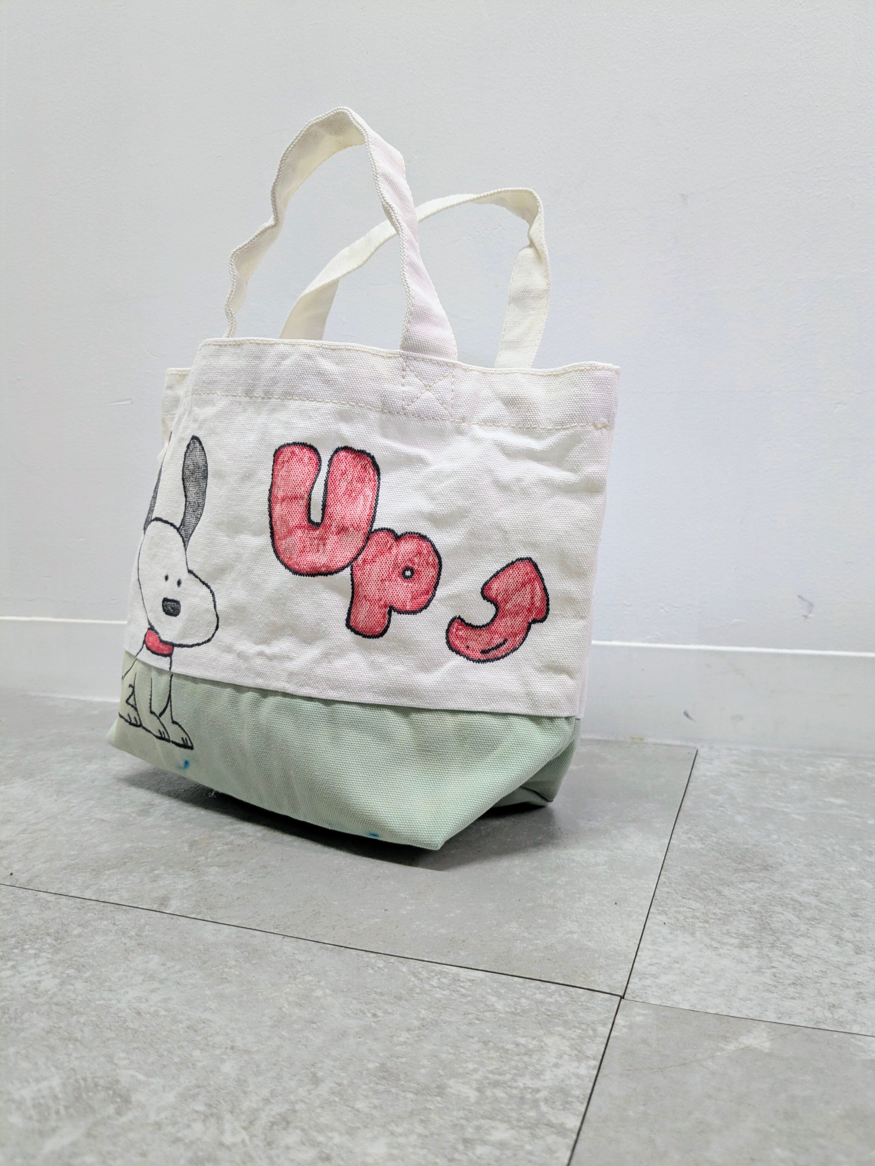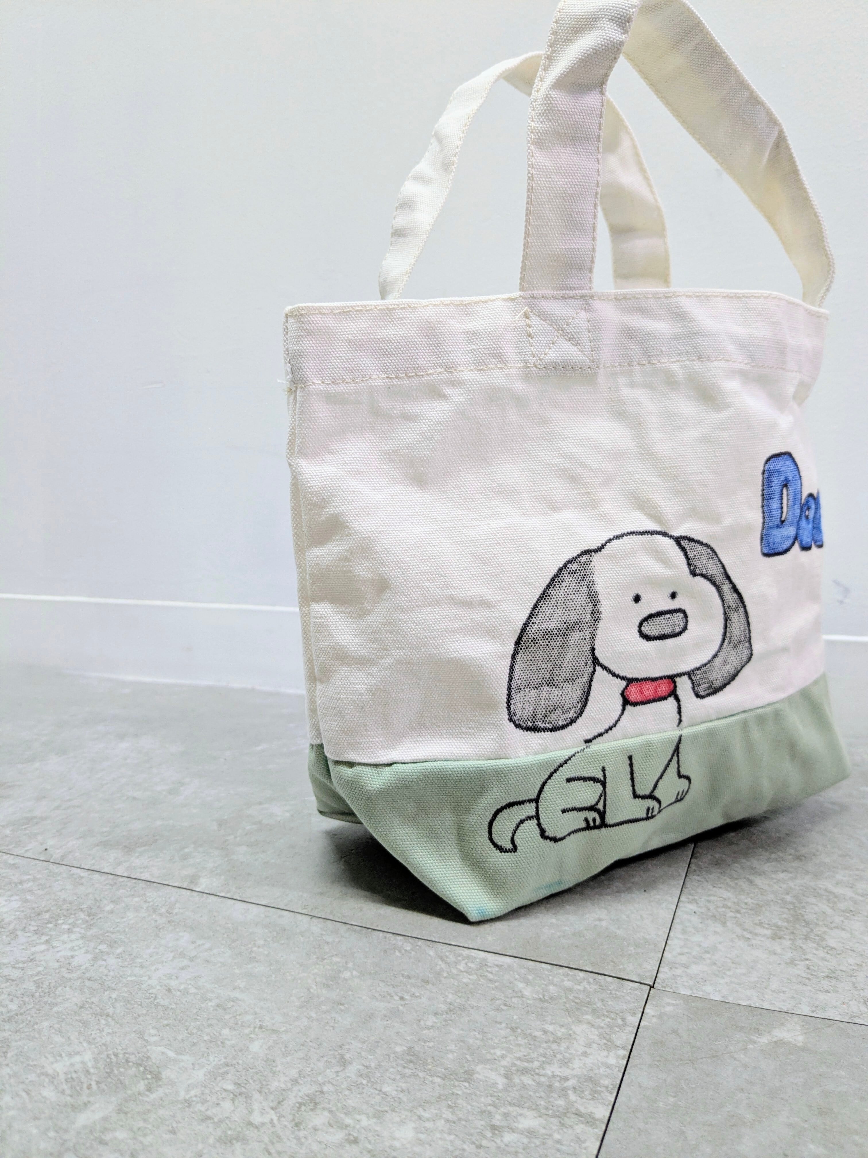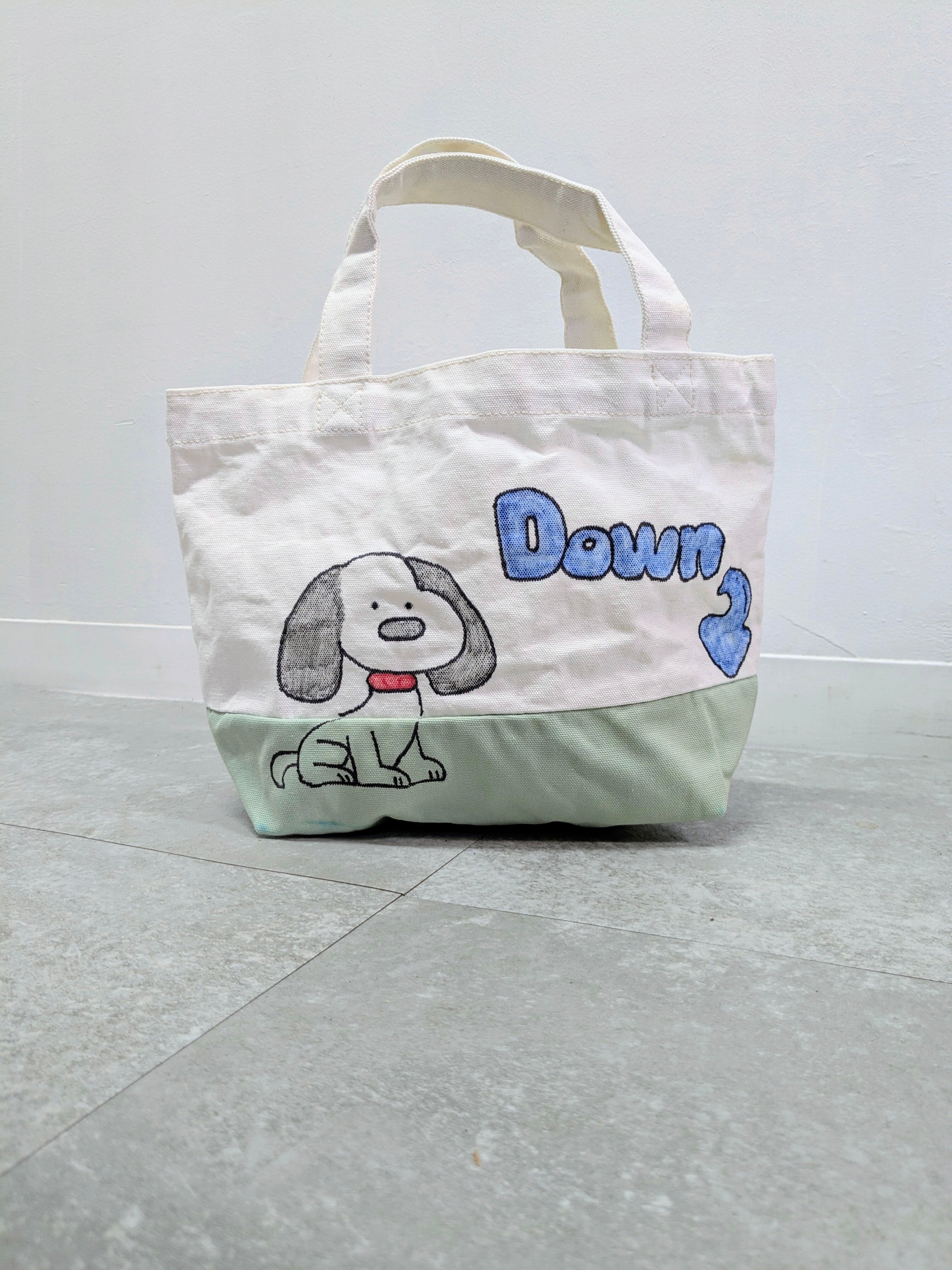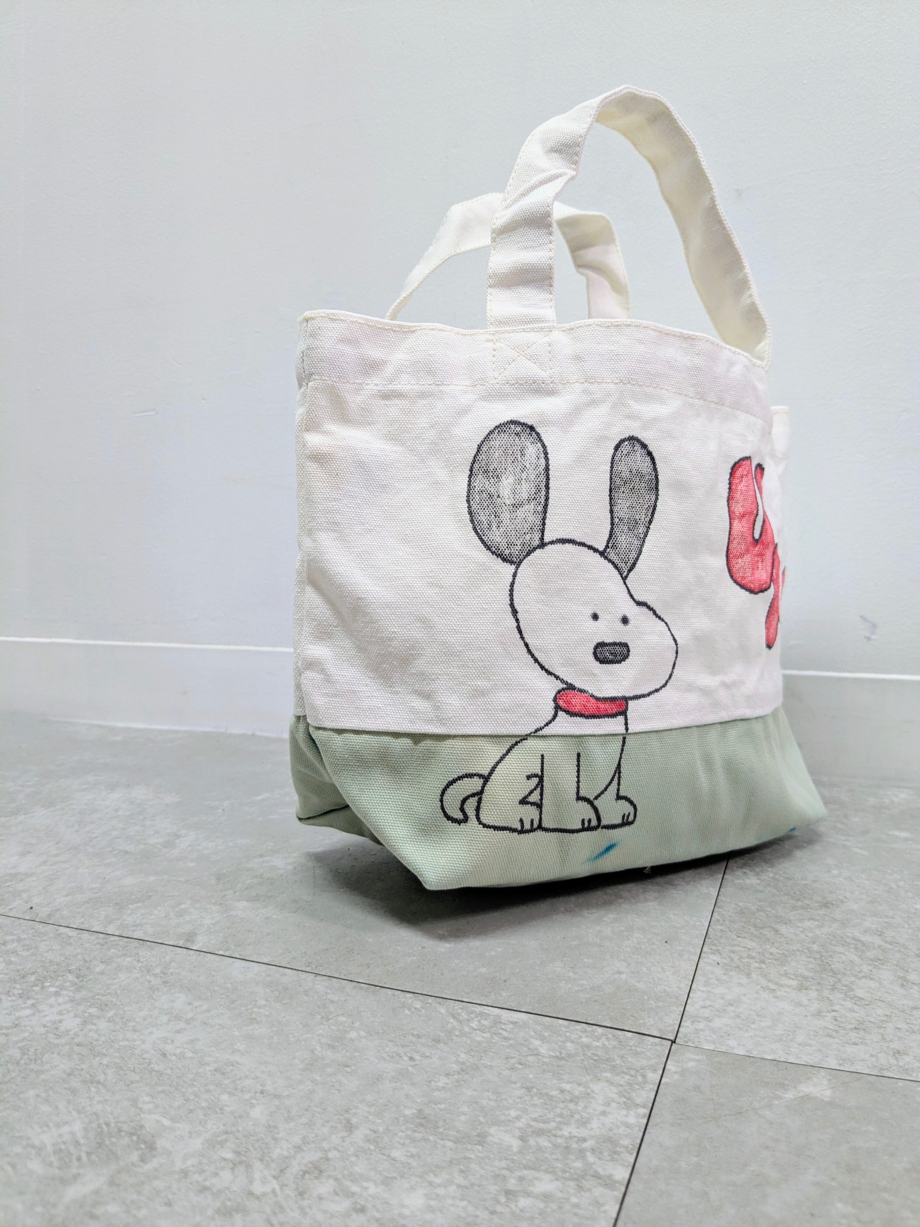 キャンバスのトートバッグにイラストを加えています。こちらは退色の加工、洗いをかけておりますので、使用感をあえて出しているデザインになります。