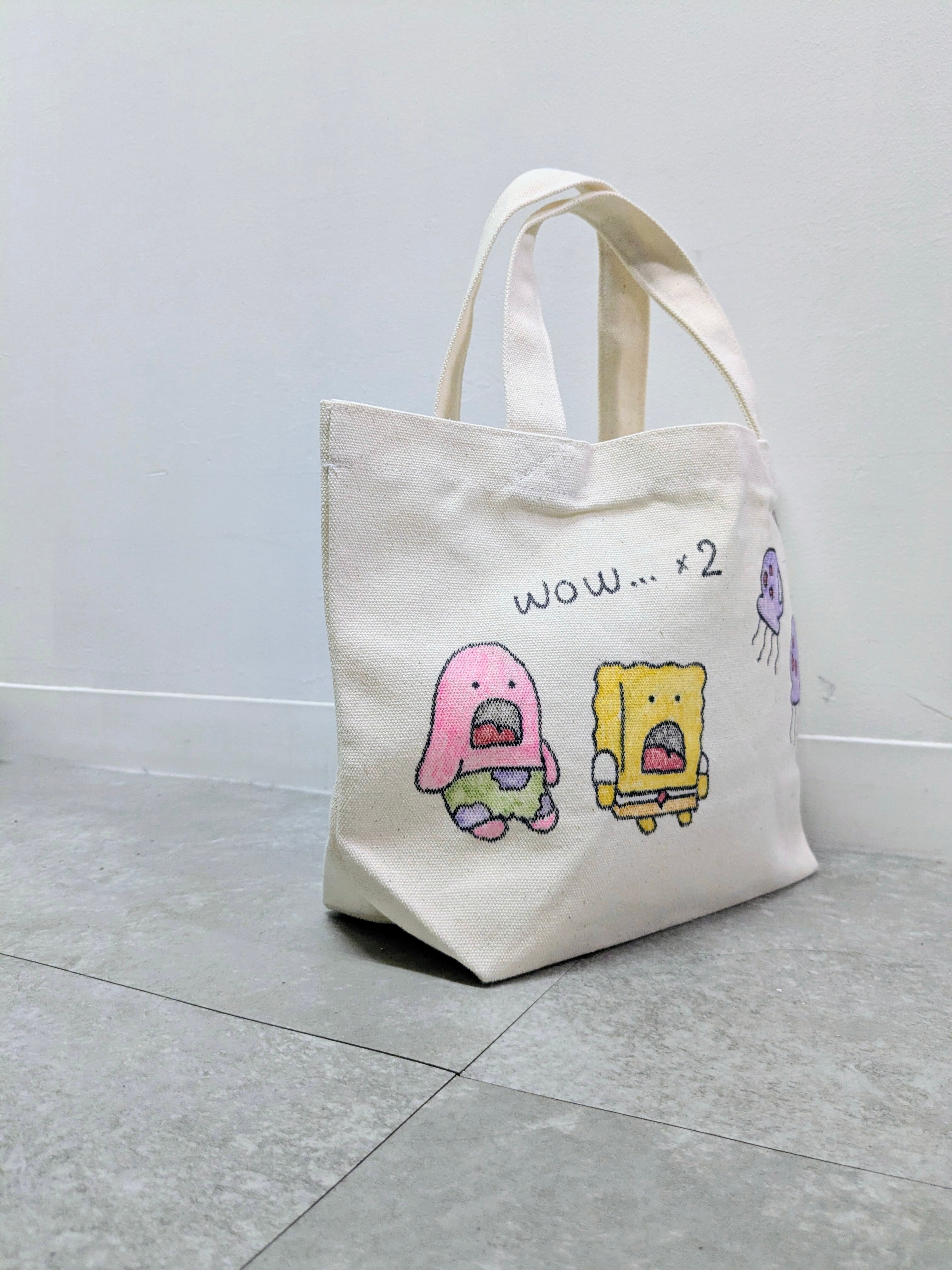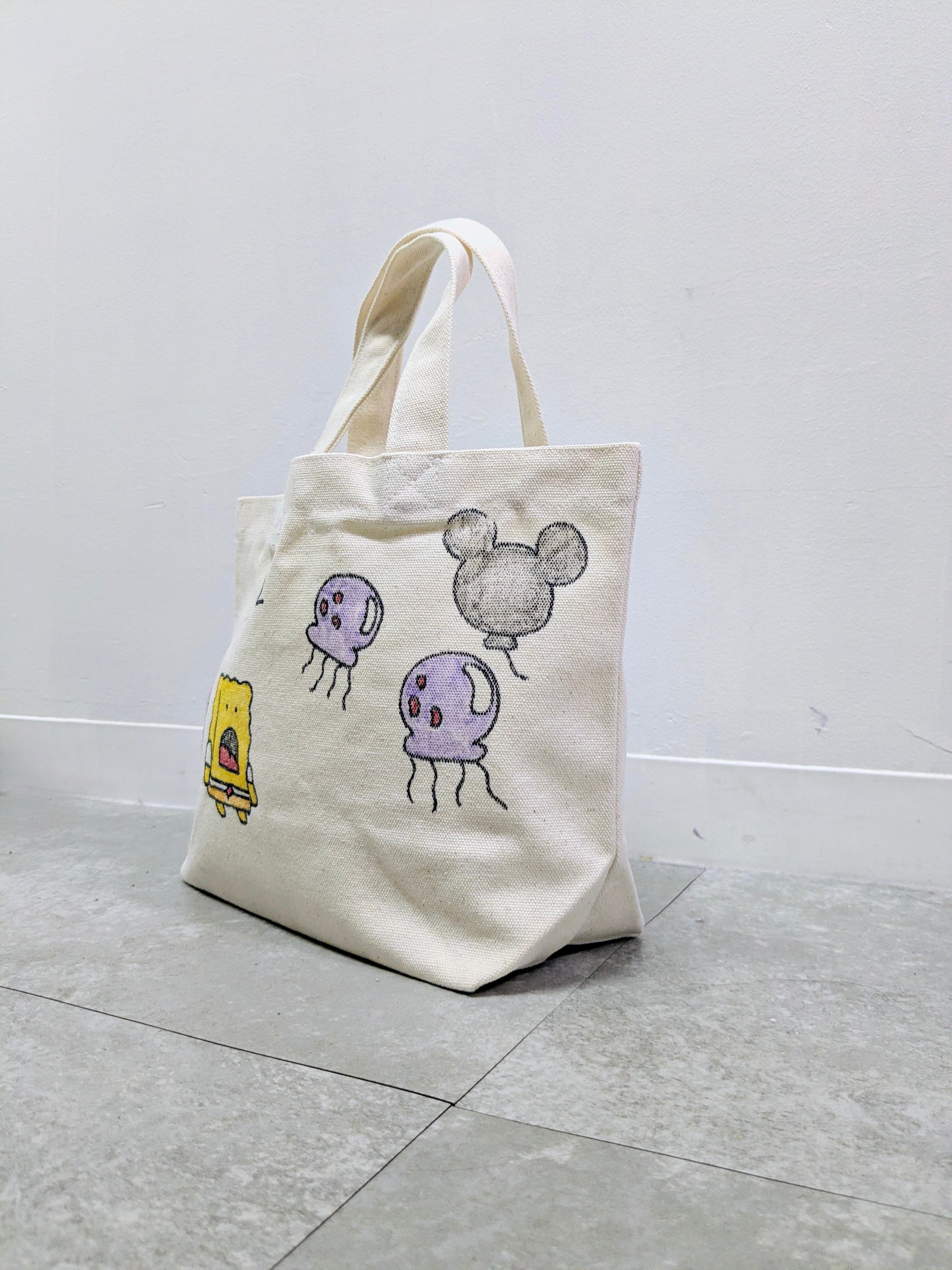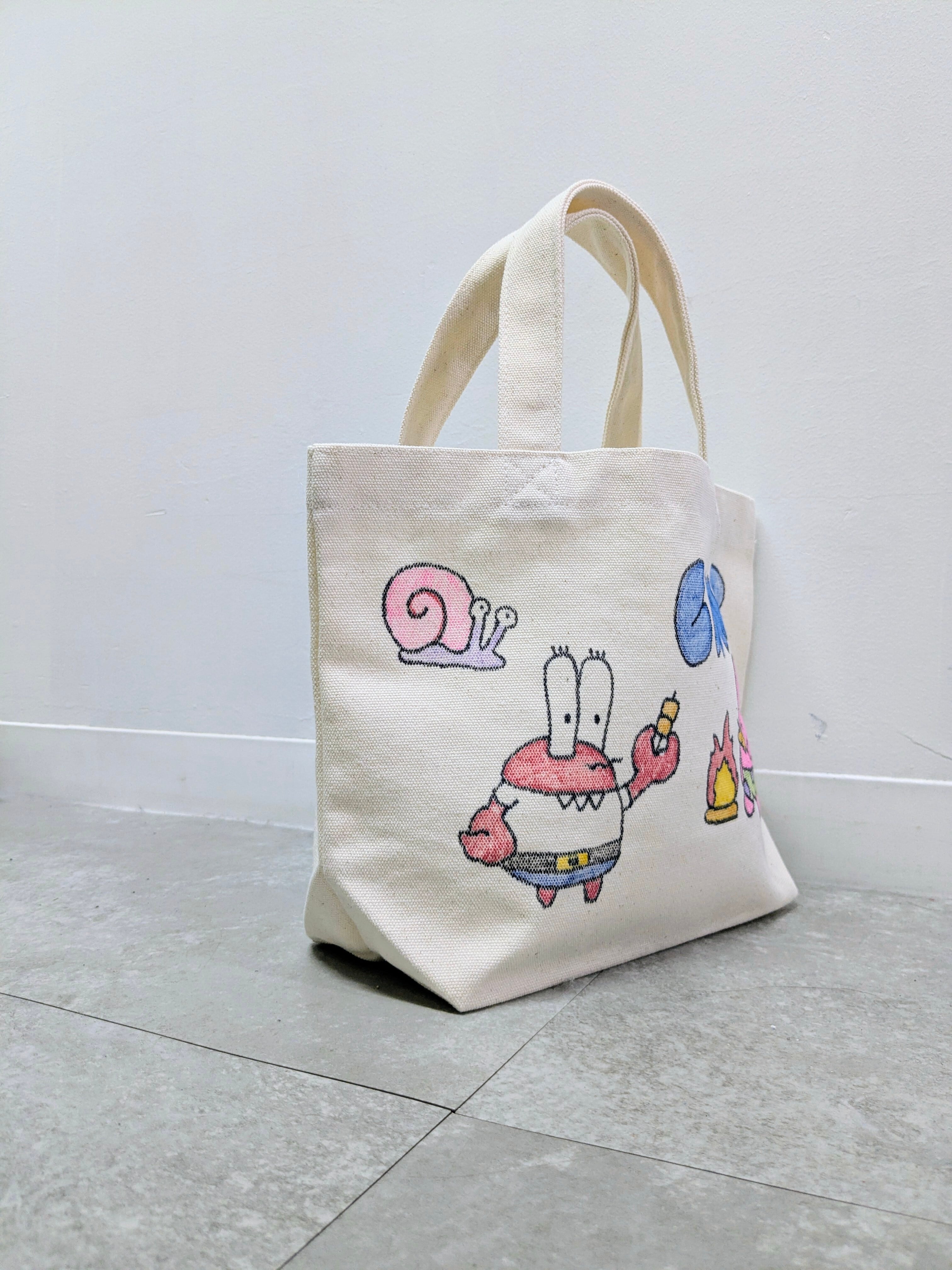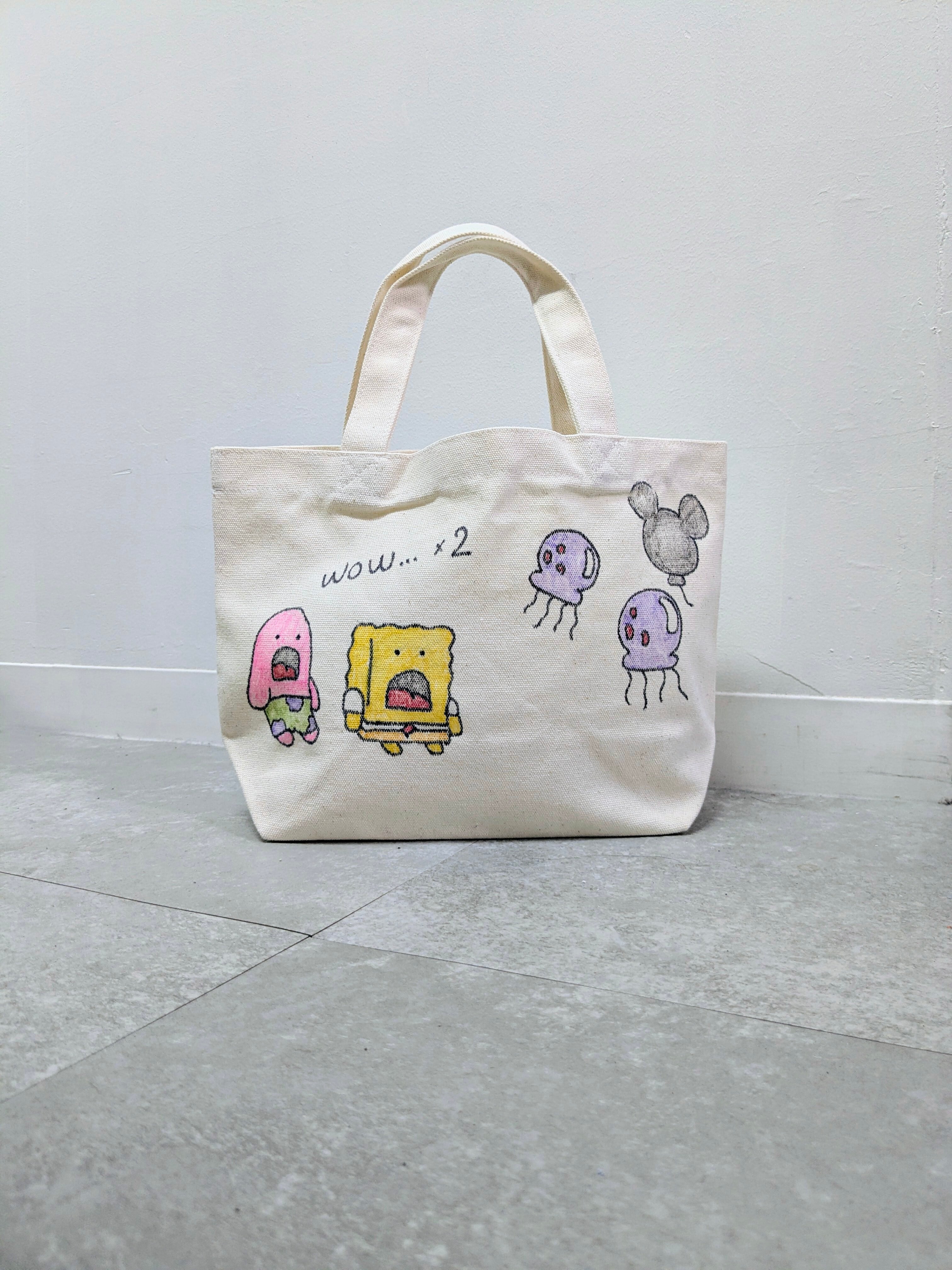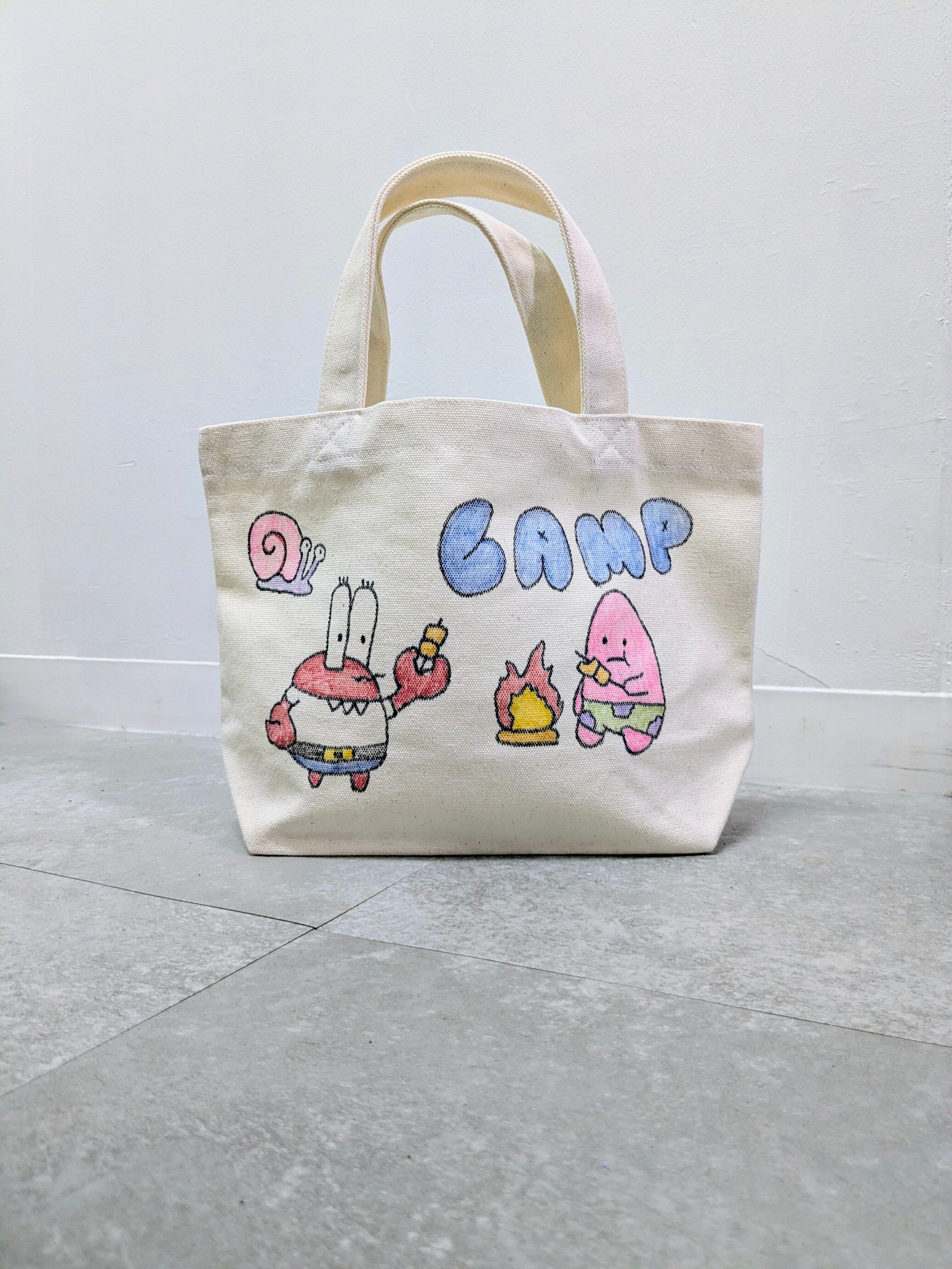 キャンバスのトートバッグにイラストを加えています。メモリアルの要素があり、どこか見たことあるキャラクターがいたりと、とにかく可愛いアイテム。全て手描きになるので、唯一無二の一点物となります。