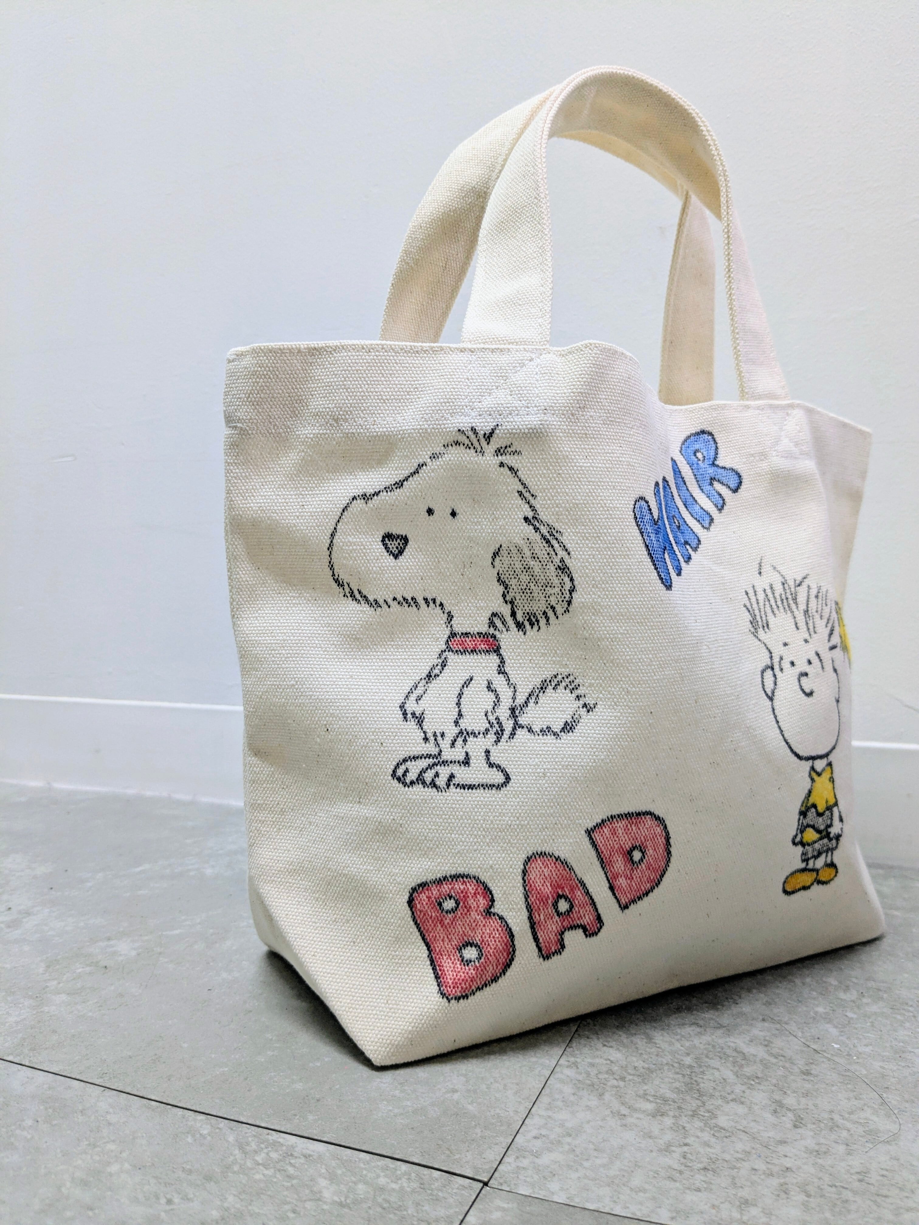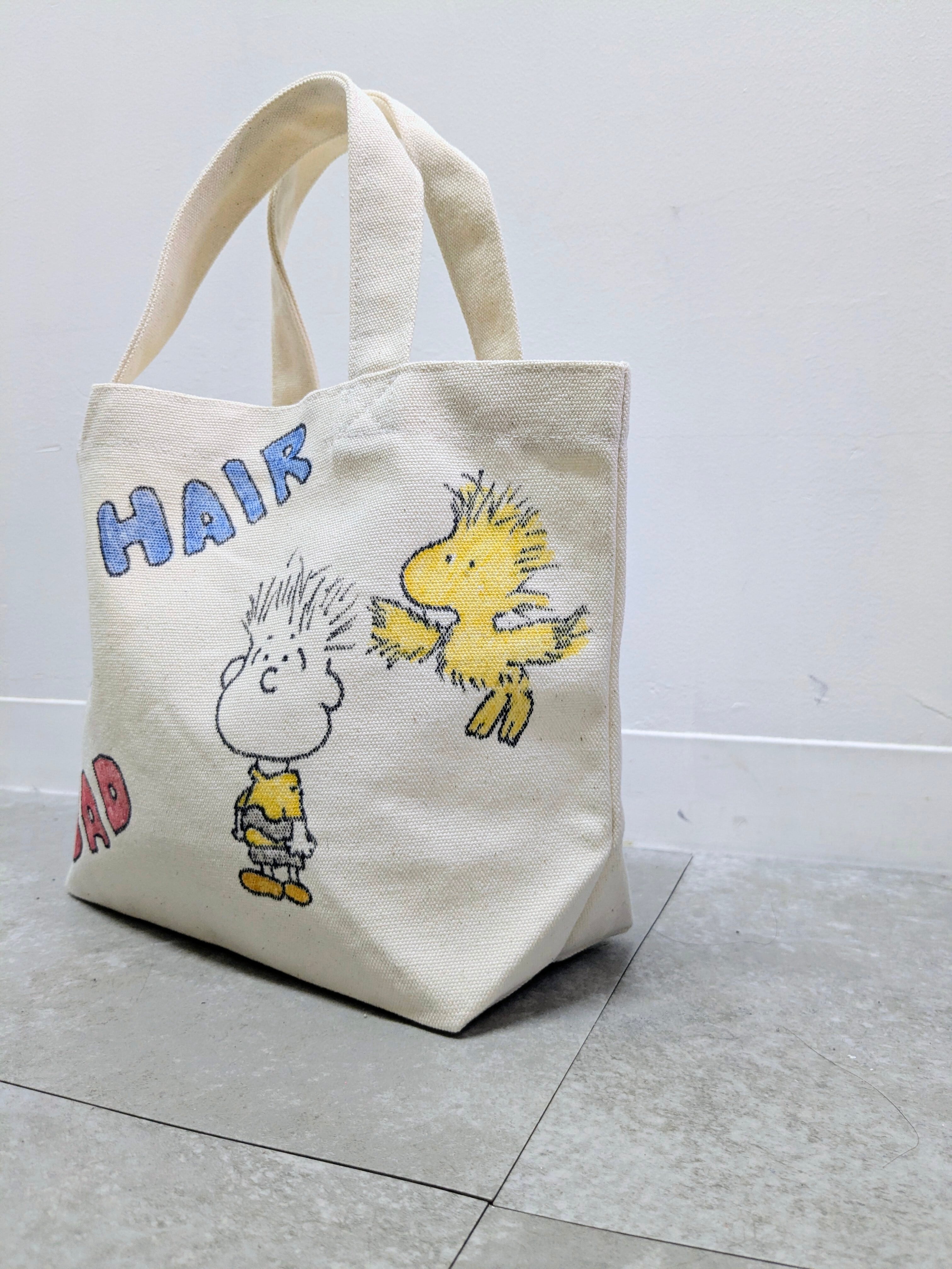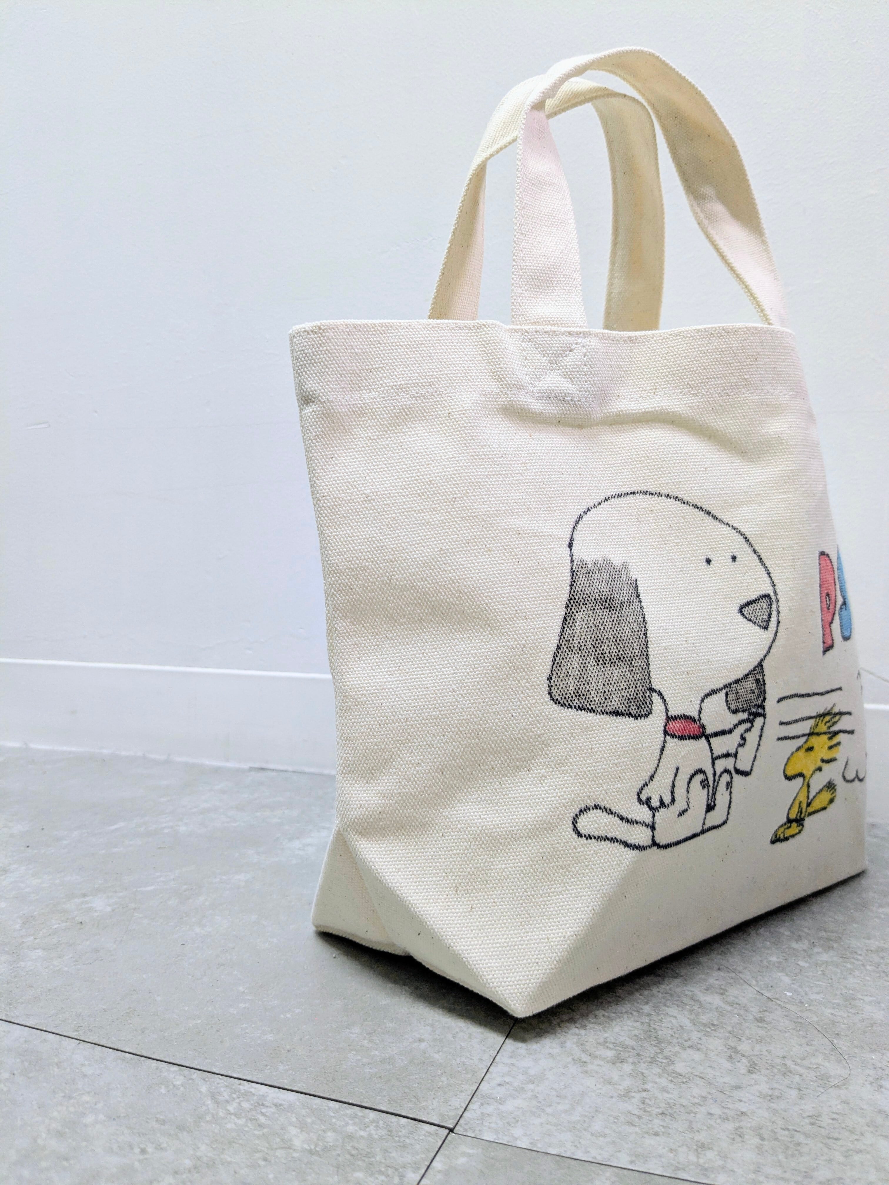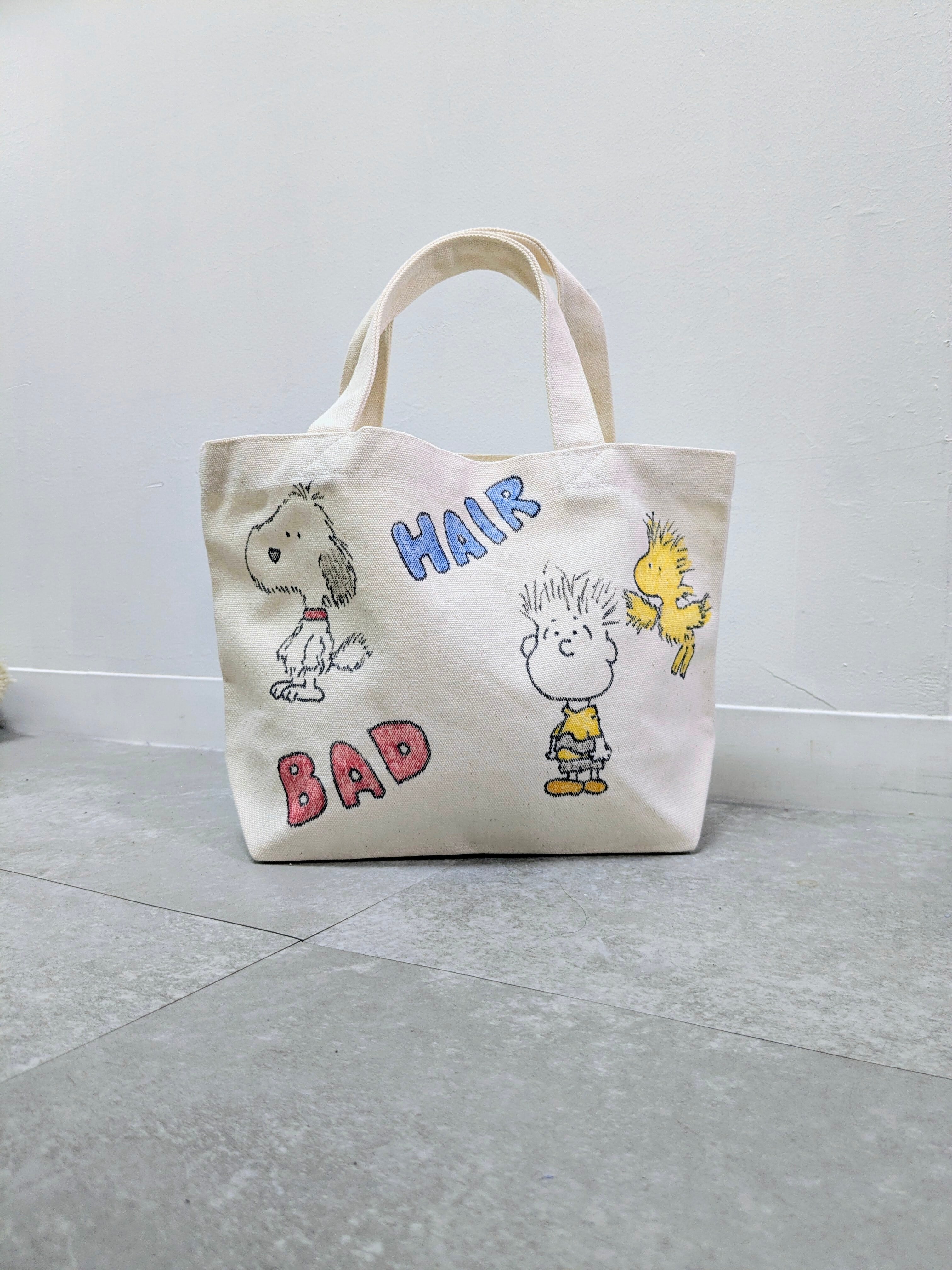 キャンバスのトートバッグにイラストを加えています。メモリアルの要素があり、どこか見たことあるキャラクターがいたりと、とにかく可愛いアイテム。全て手描きになるので、唯一無二の一点物となります。