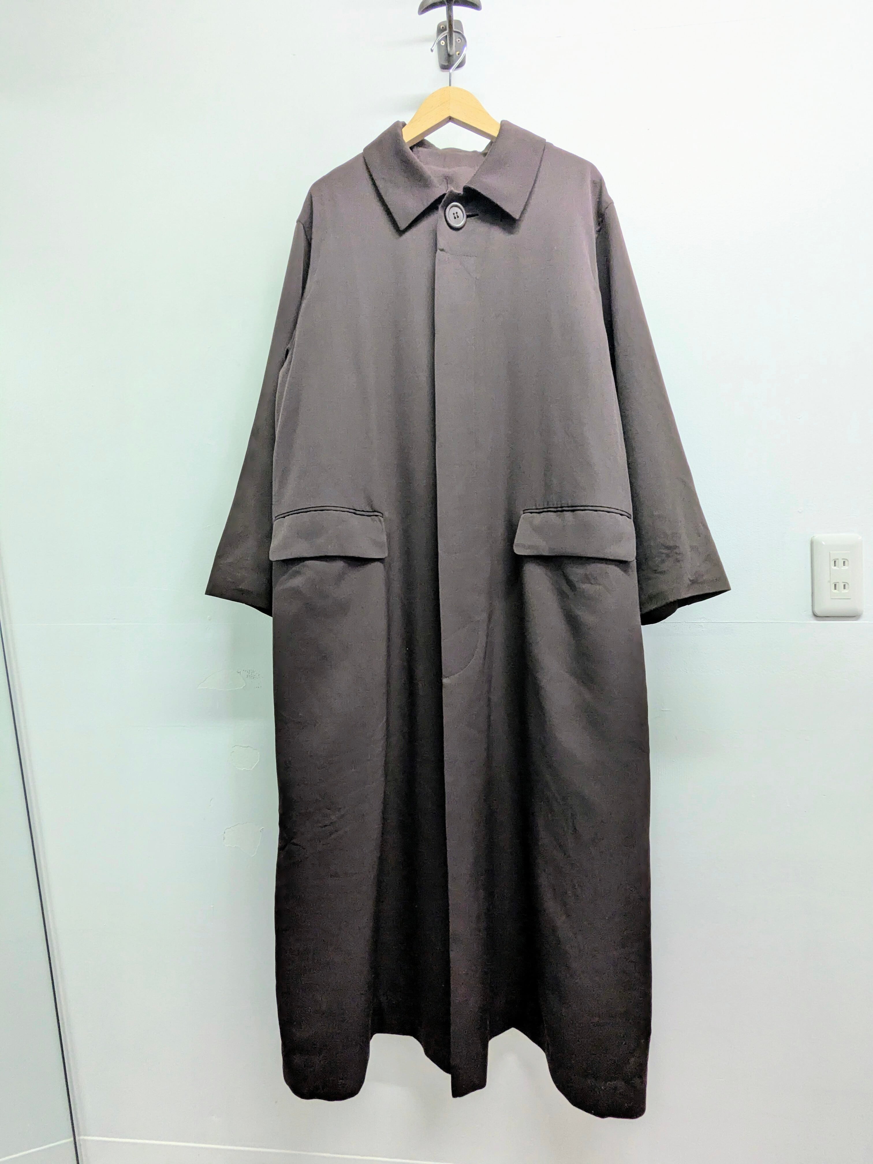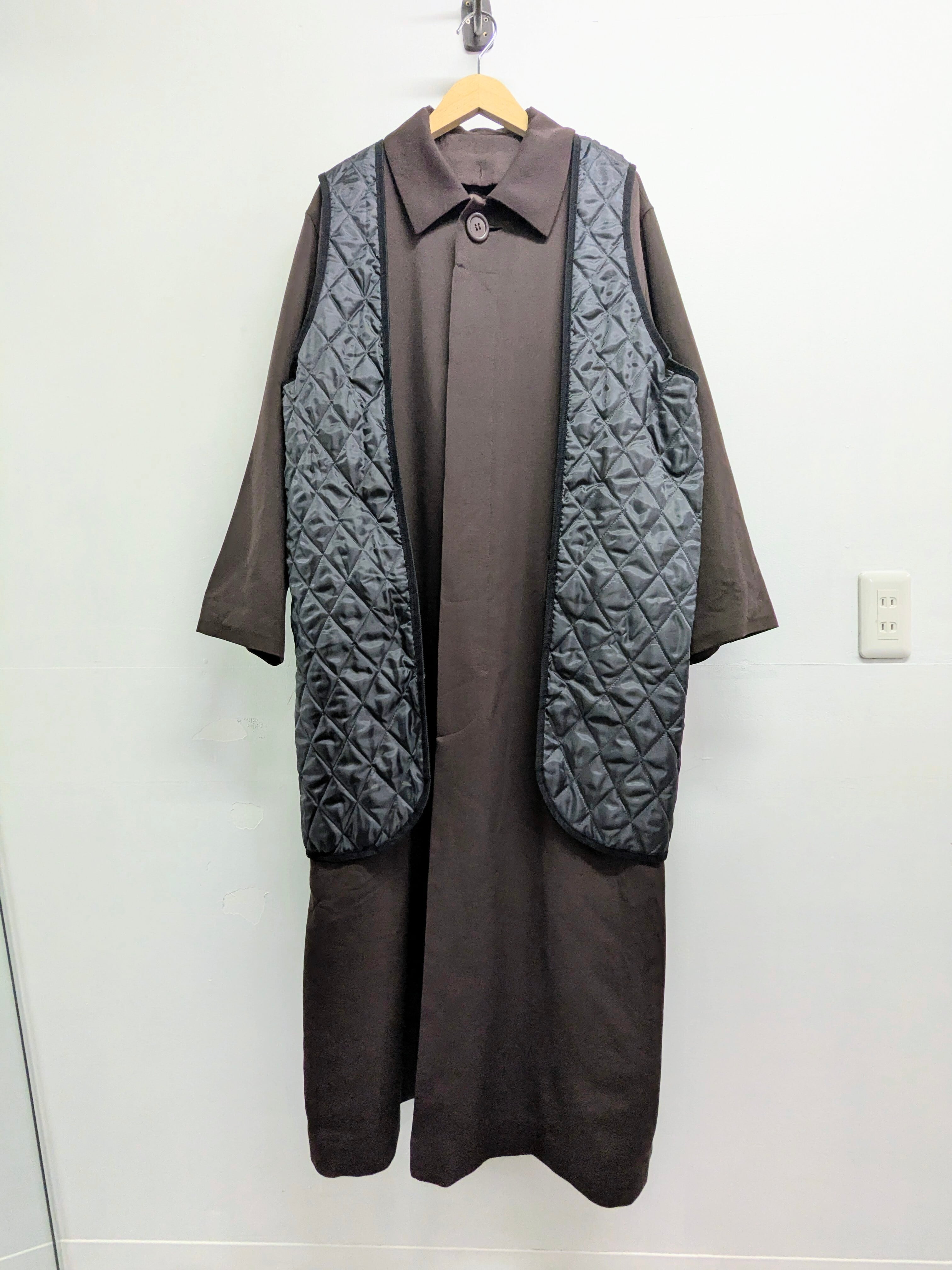 写真はライナーのキルティングベストを上に羽織らせてあります。通常は中にボタンで止めて着ていただけます。ロング、ルーズなシルエットが個人的に好きなやつ。スプリングコートとかは難しいのであまりやらないのですが、こちらはシルエット、素材感に惹かれ入れました。
