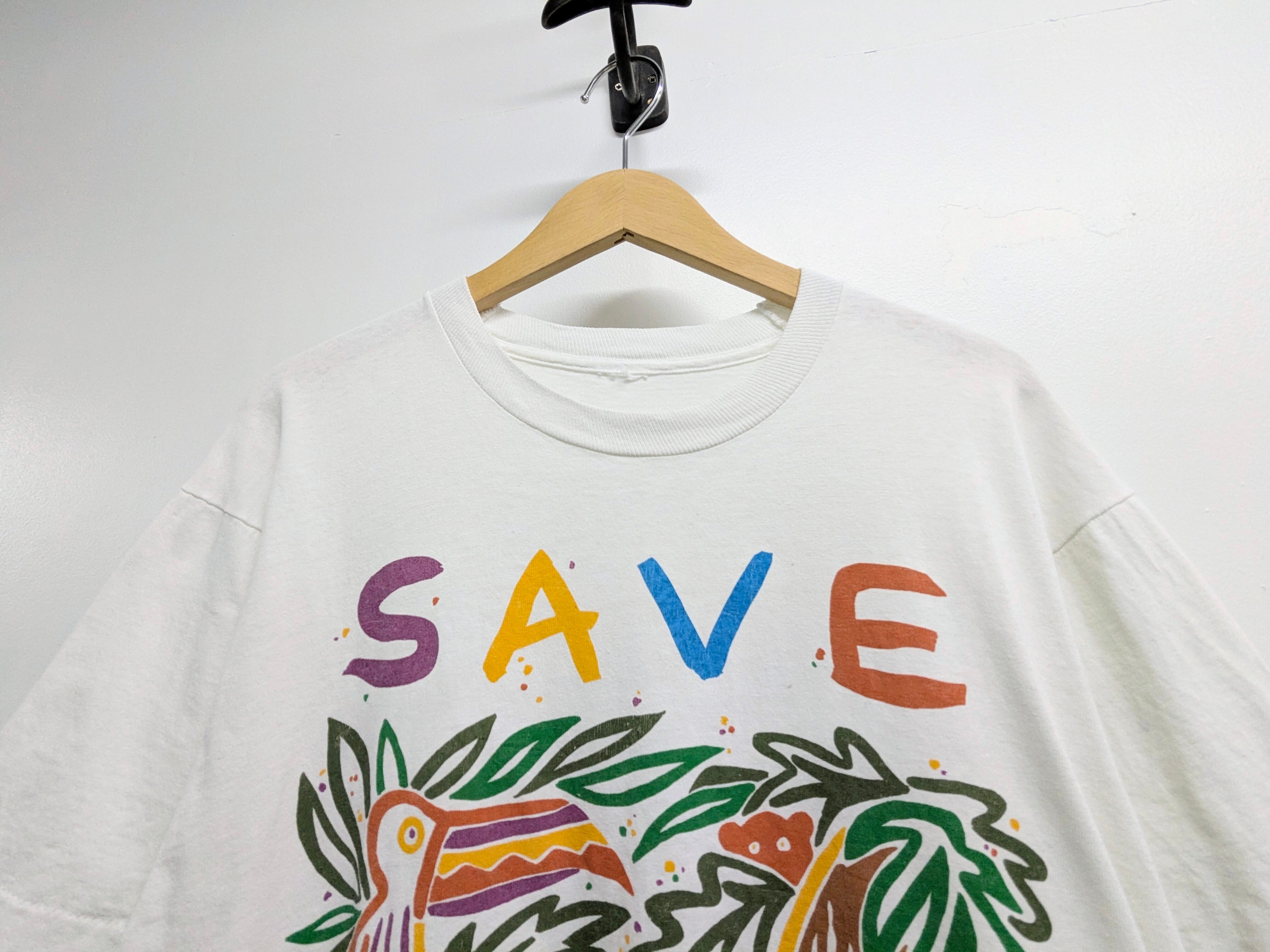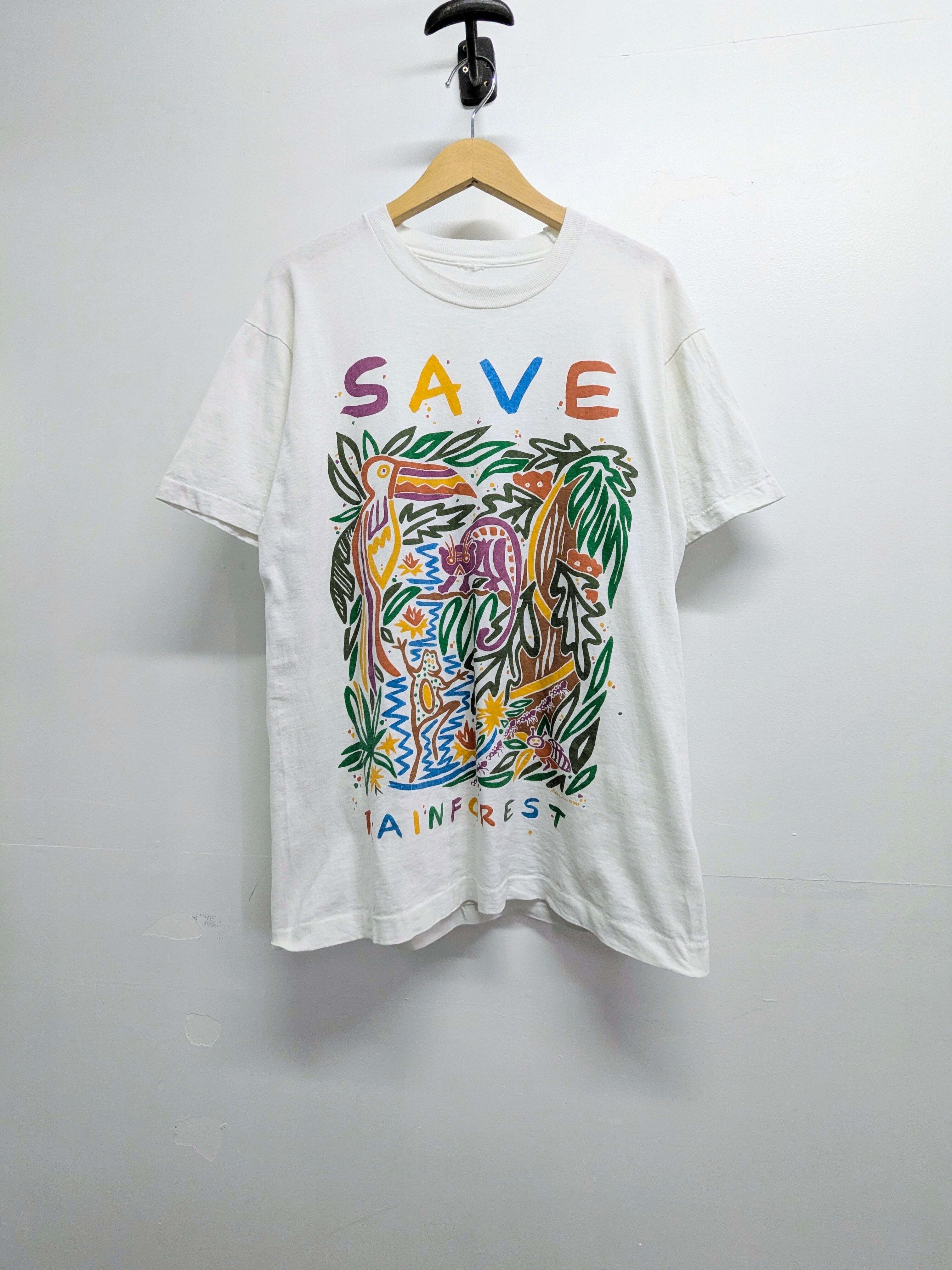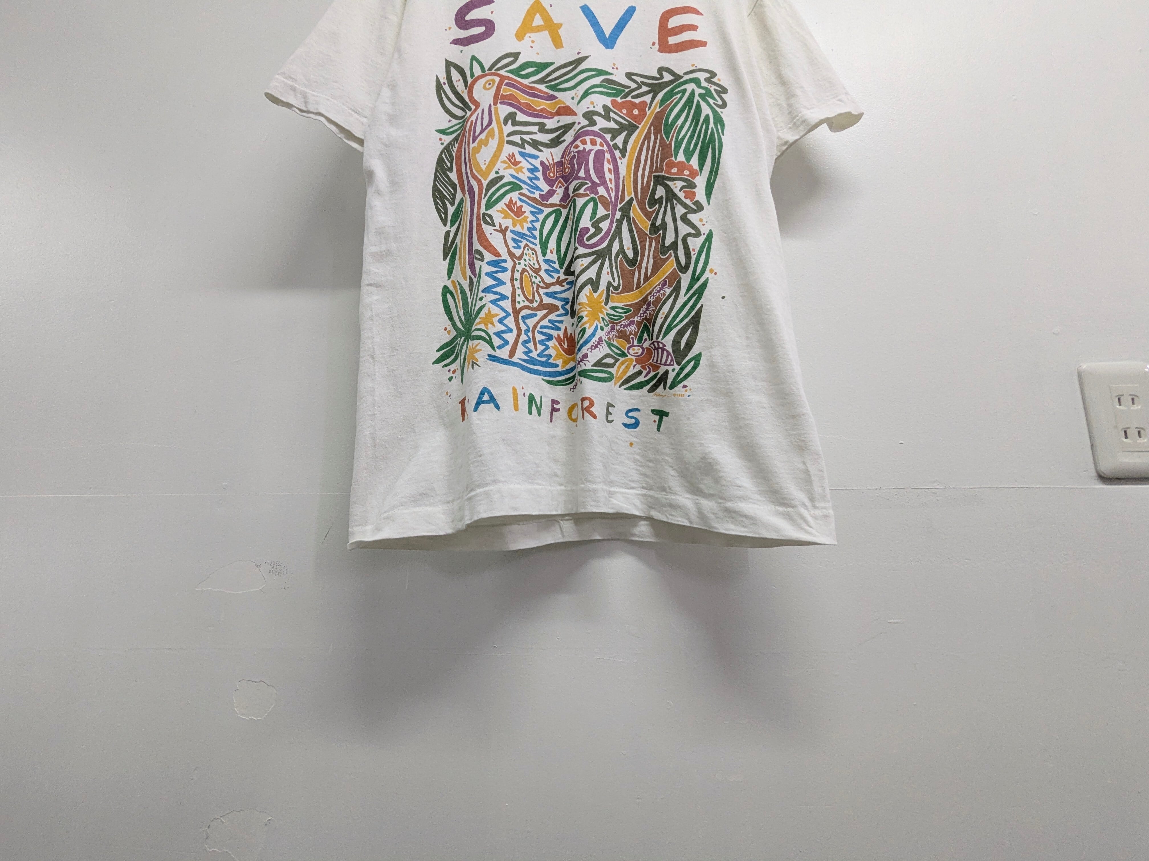 手描きタッチの温かみあるアートピース1枚で主役になるグラフィックデザイン。環境保護系のメッセージTシャツ。色使いがカラフルで着映えするアイテムです。