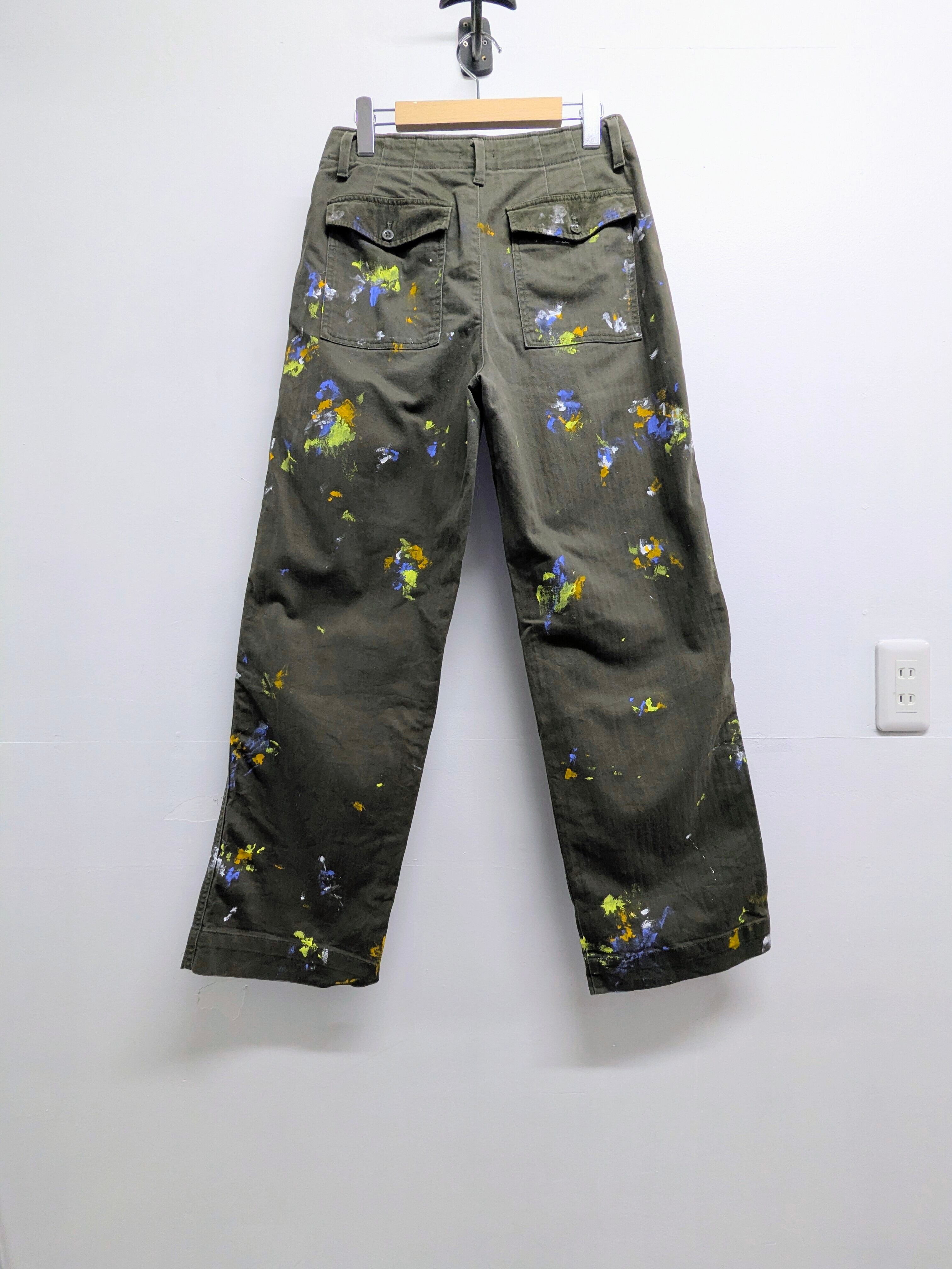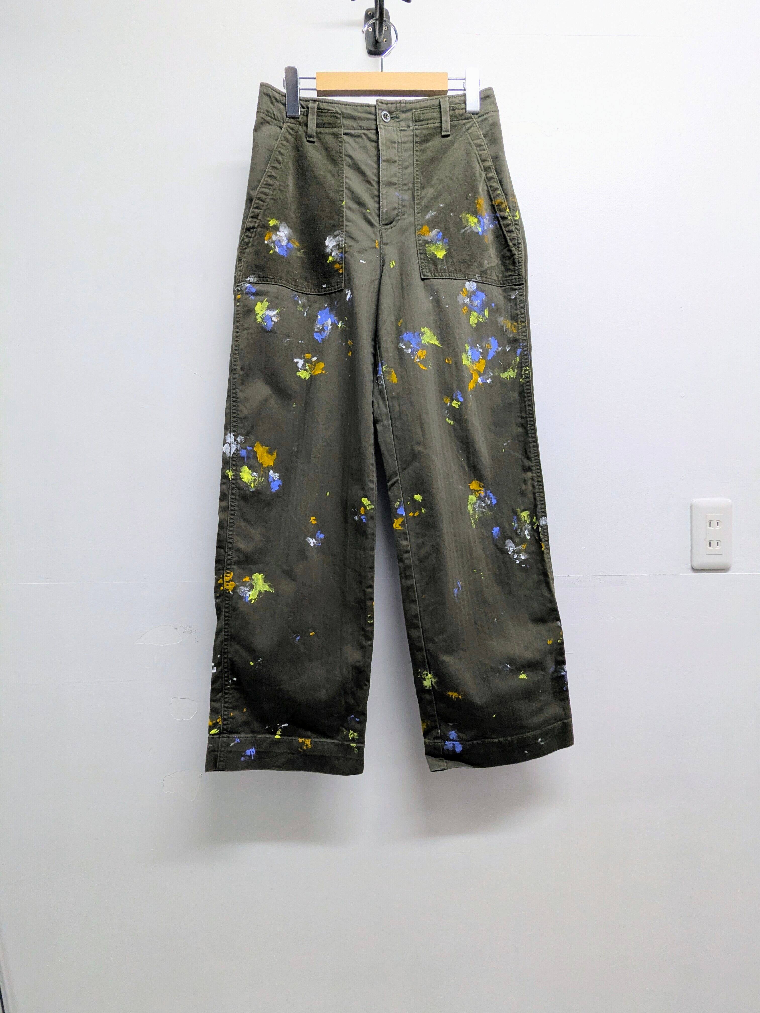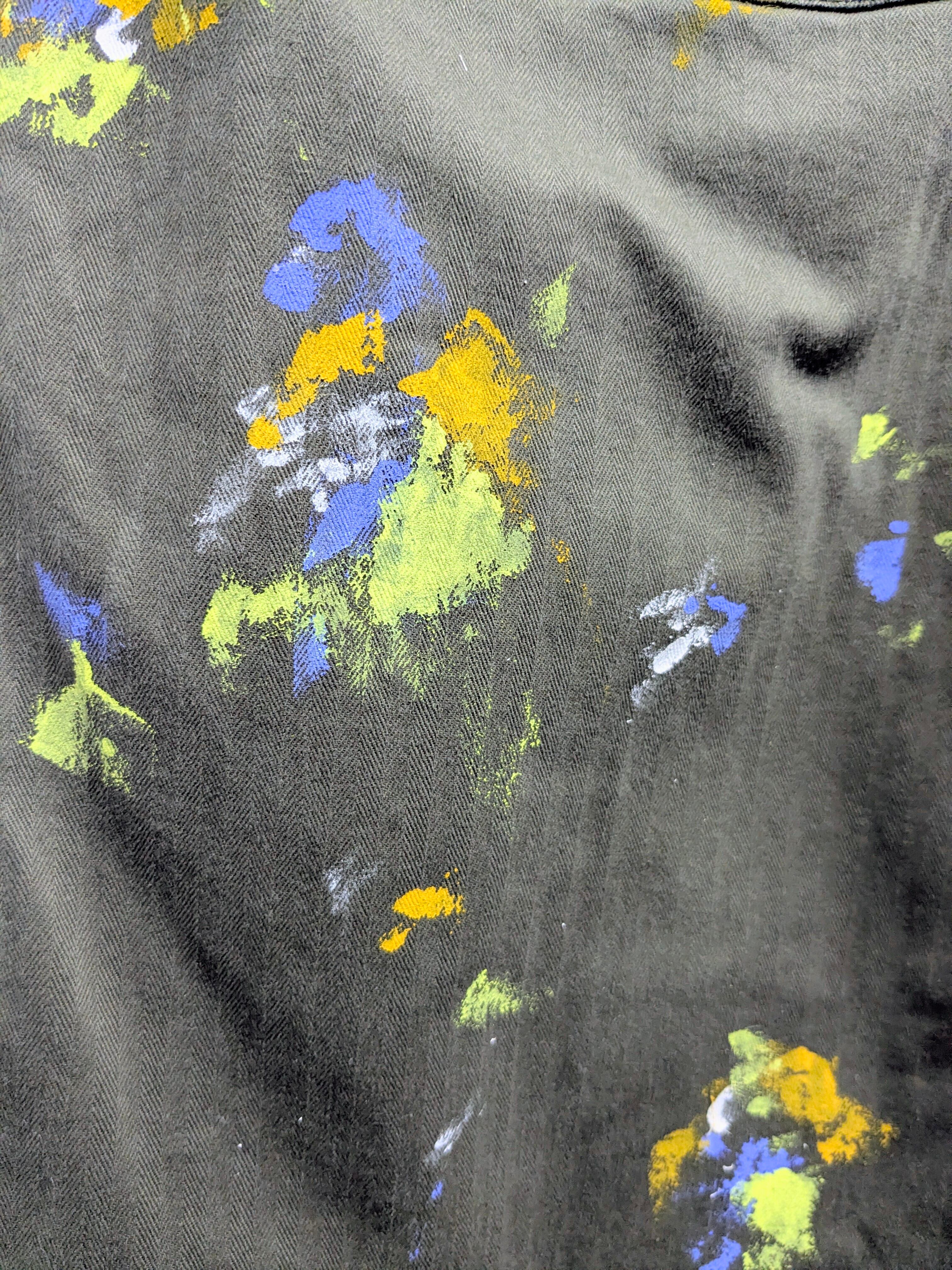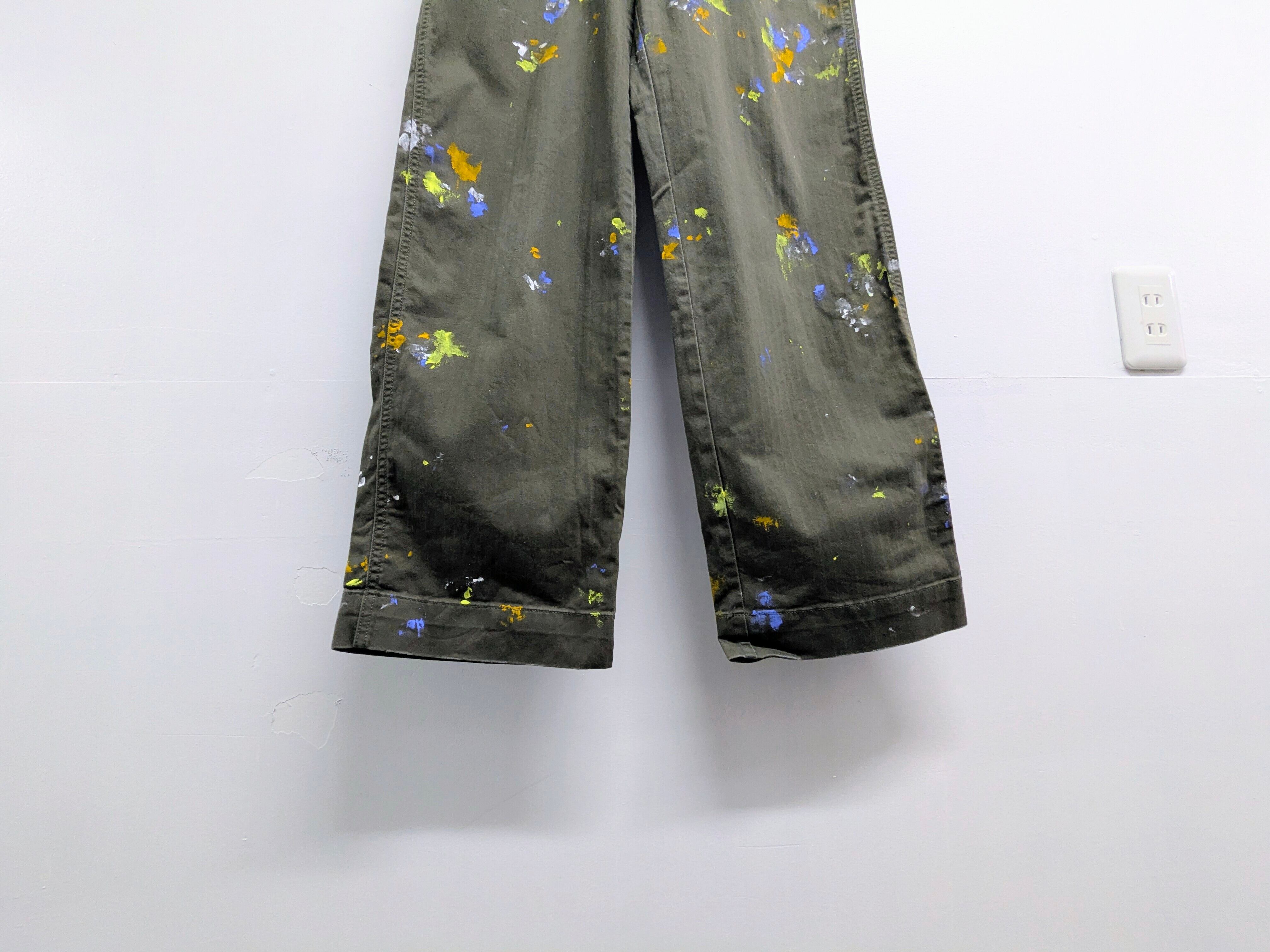 リアルワークではありえないようなペイントを加えたアイテムとなります。むしろ洋服をキャンパスに見立てて、絵を描く、アートな洋服となっています。全て手作業のため唯一無二の一点物となっております。