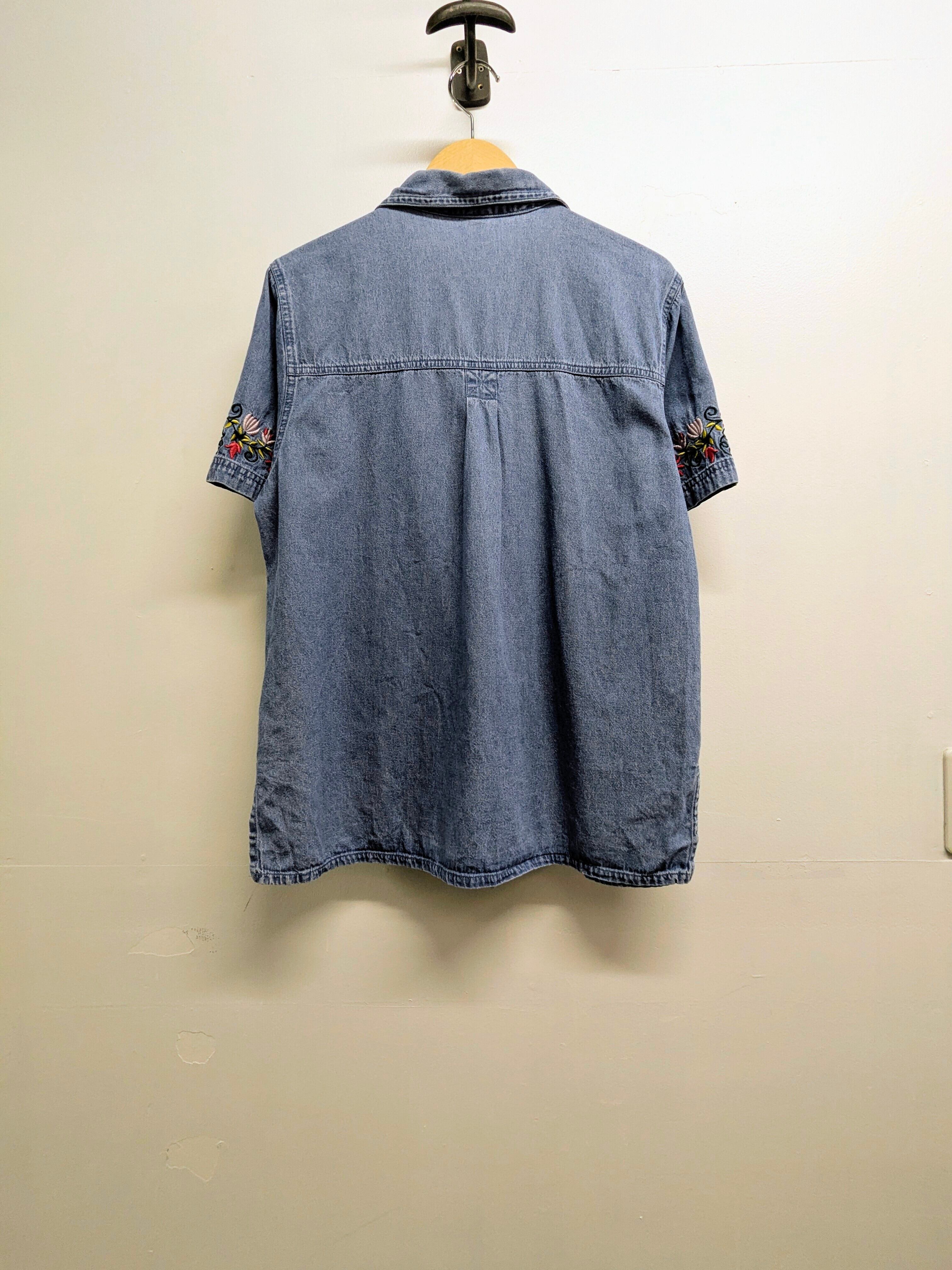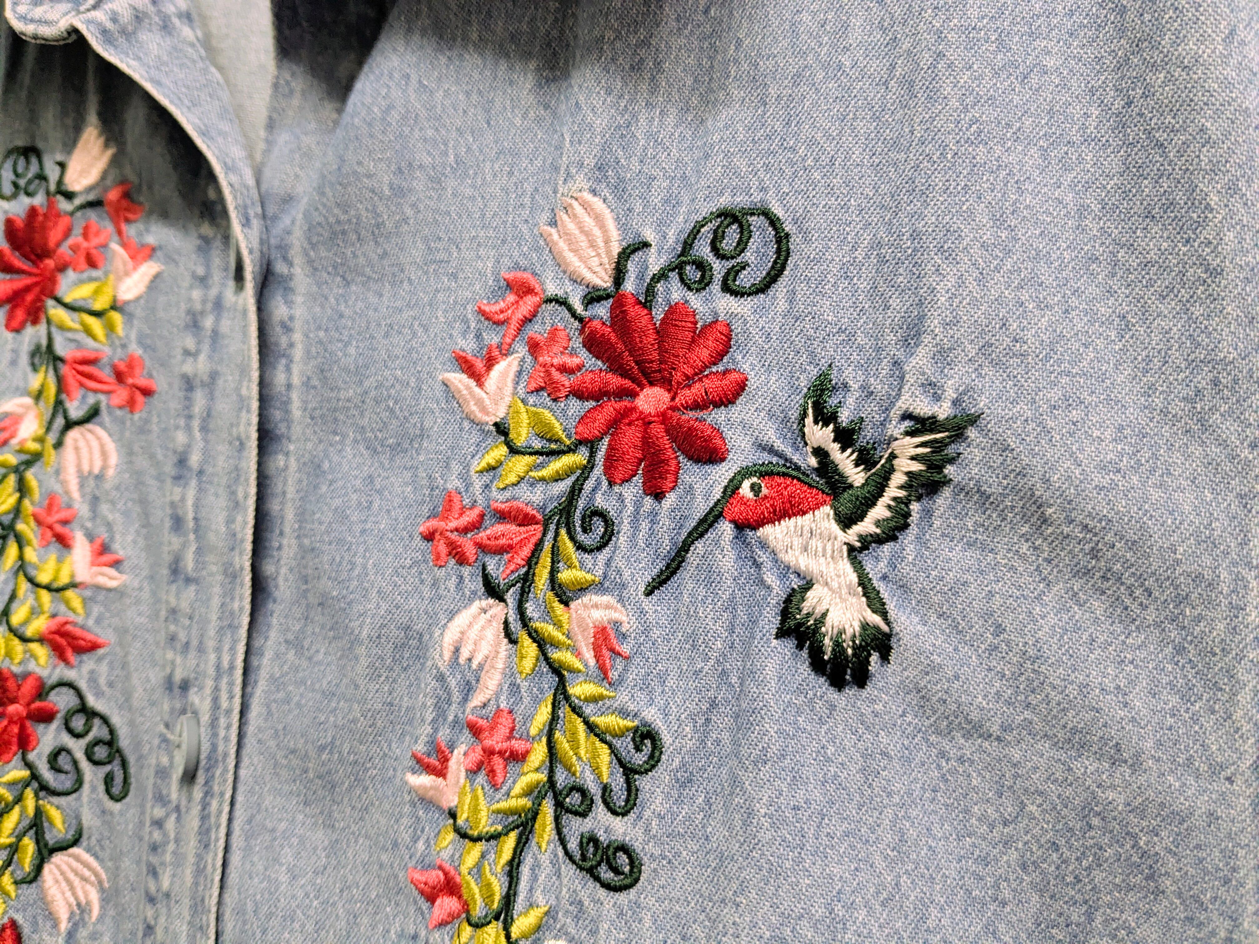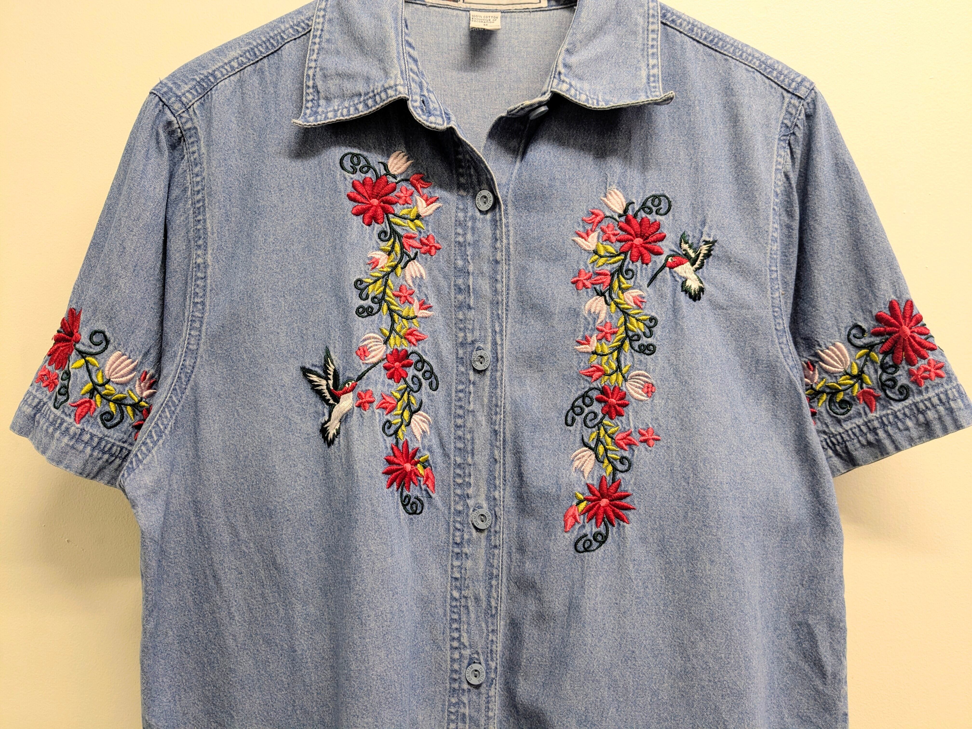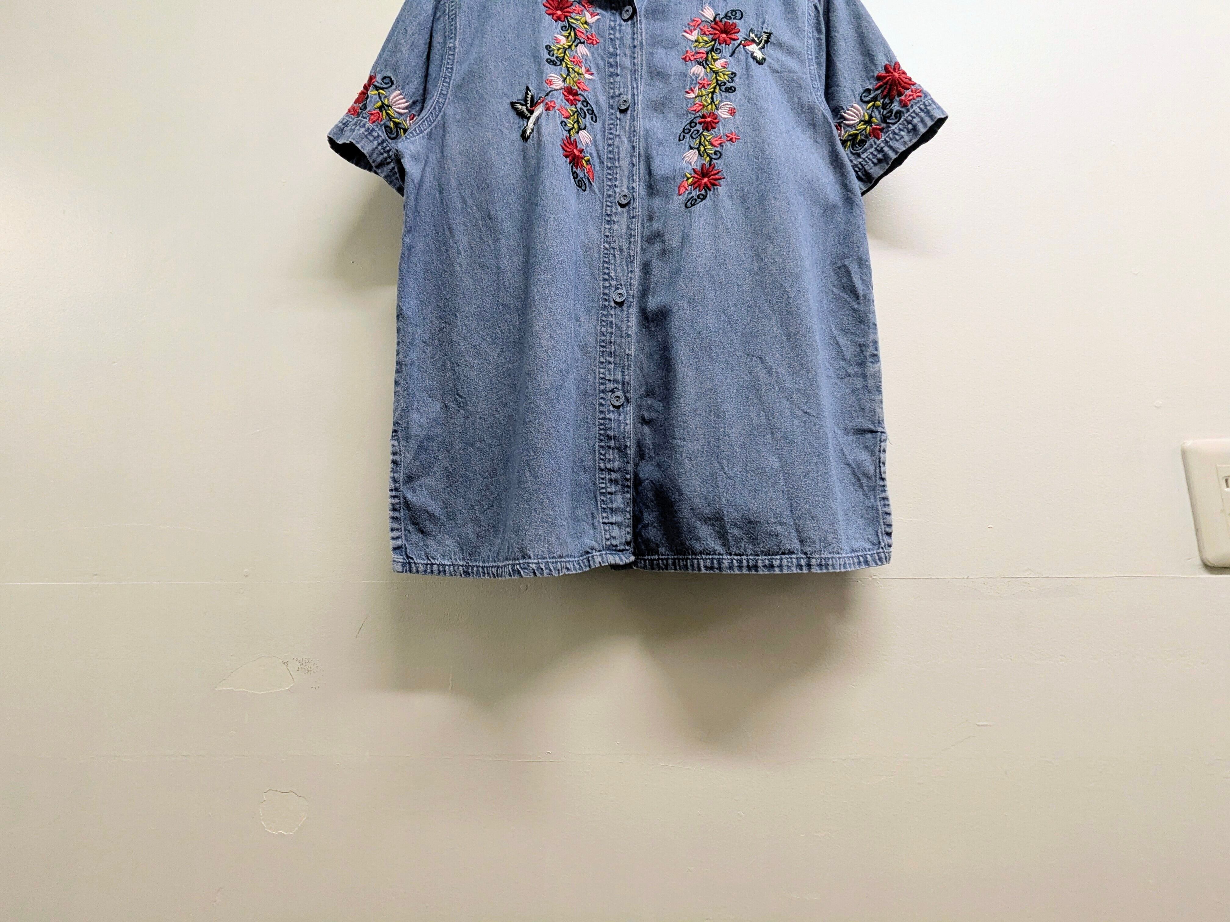 Bird And Flower Embroidered Design Denim Shirt