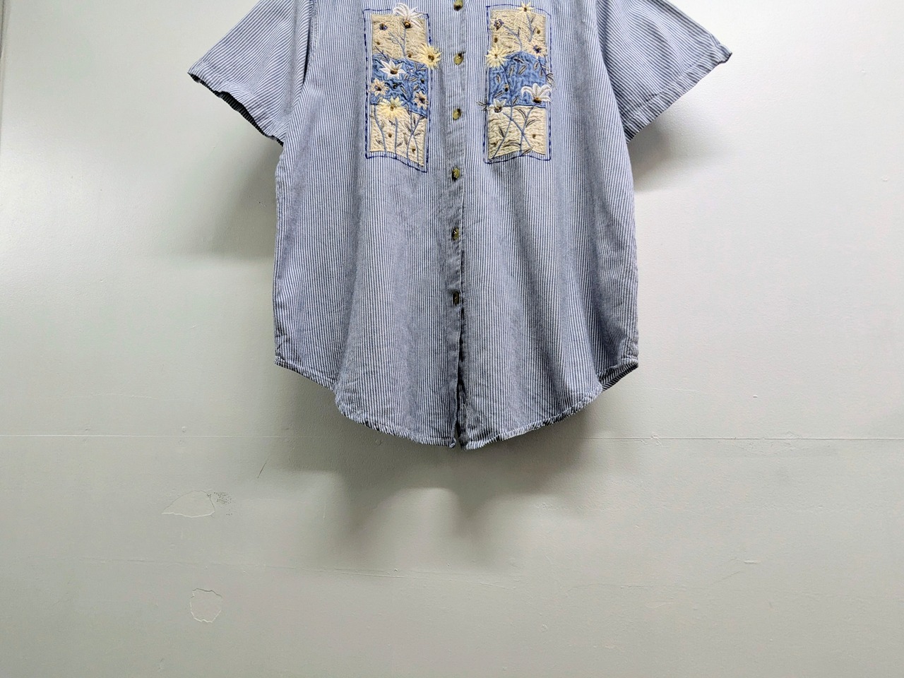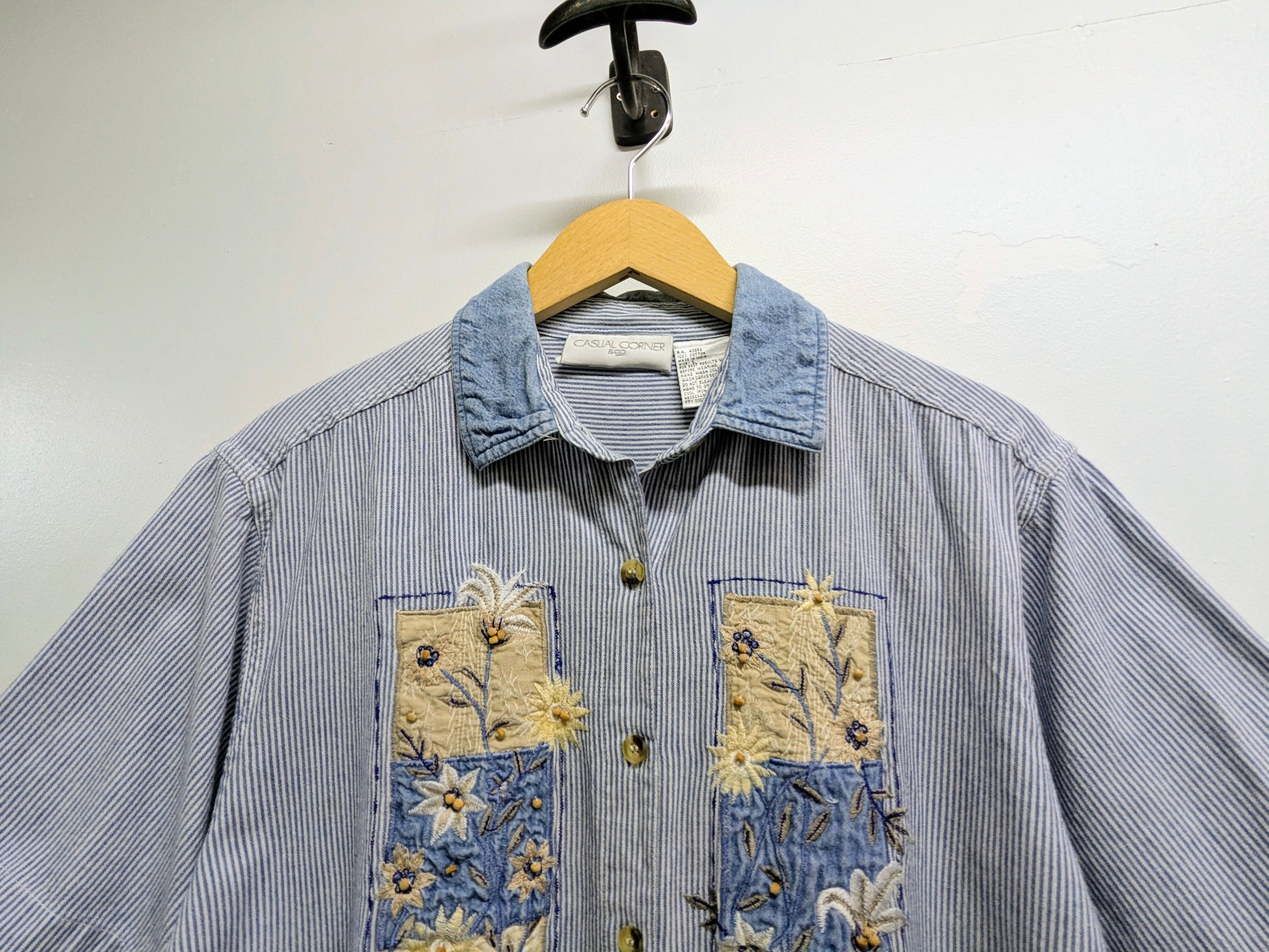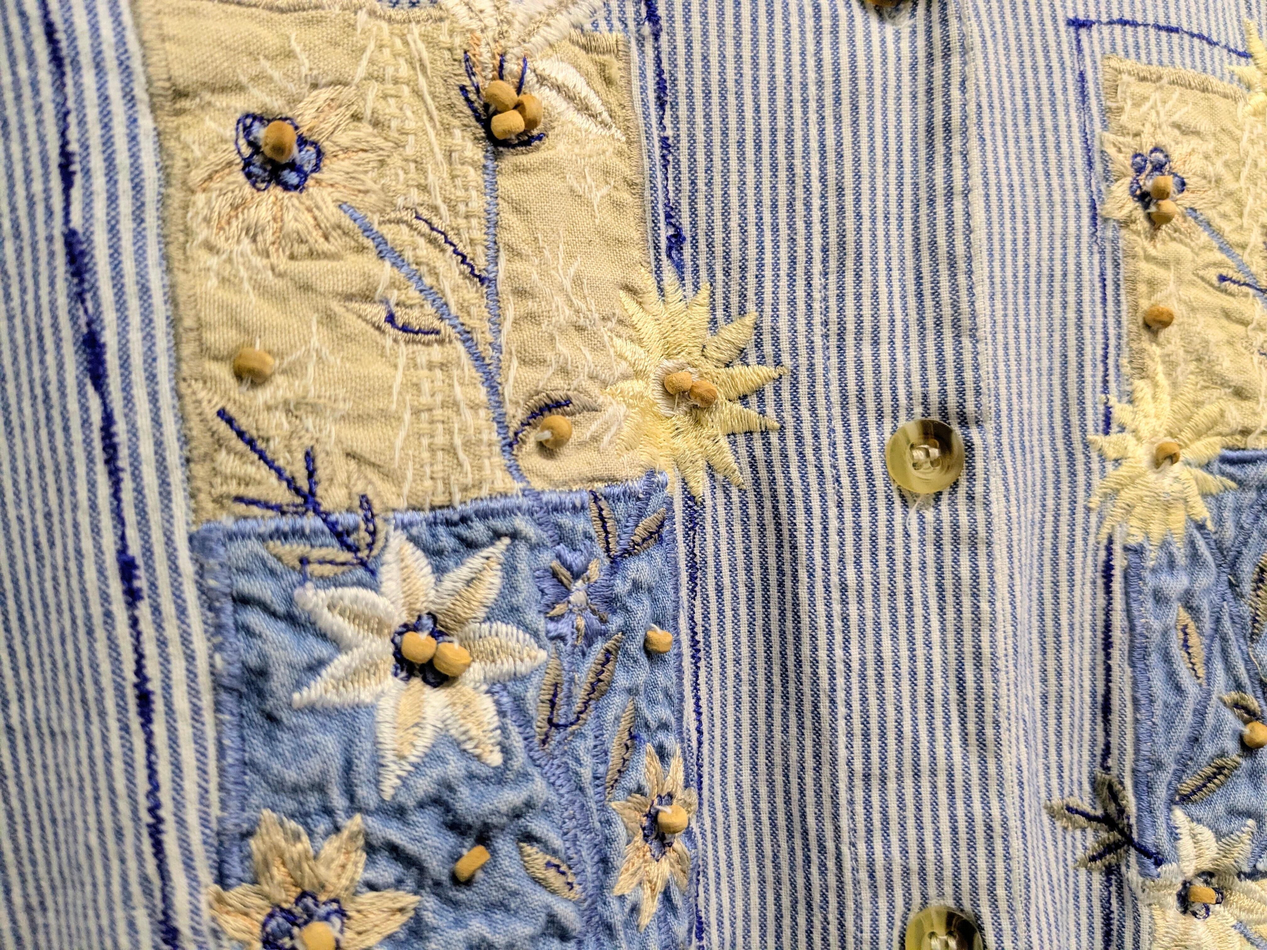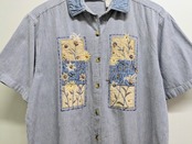 花柄の刺繍が入ったストライプシャツ。ビーズ使いなど細かいところにまで手がこんだ一着。ジャケットなど羽織ったときも、フロントデザインが目を引きます。