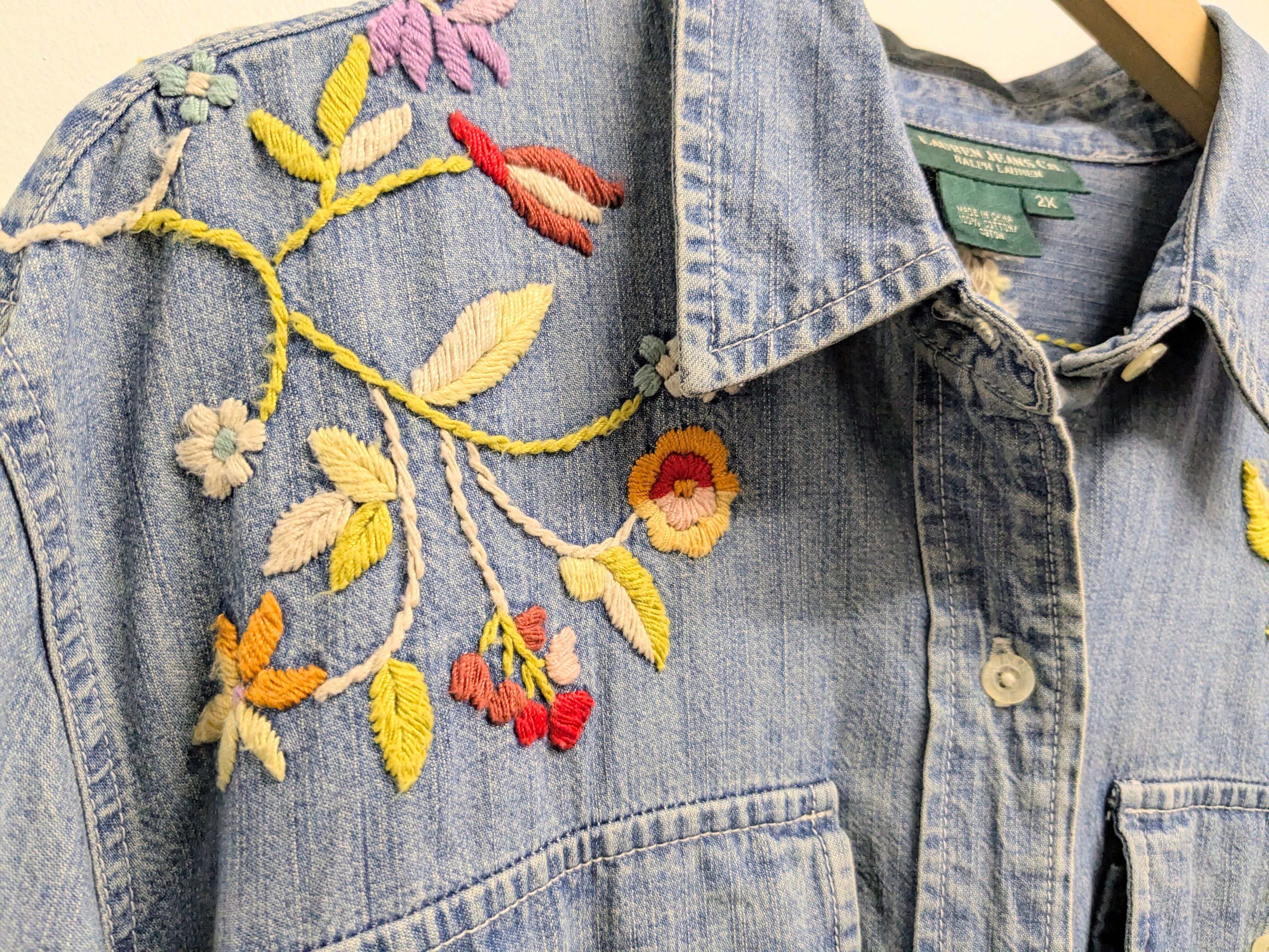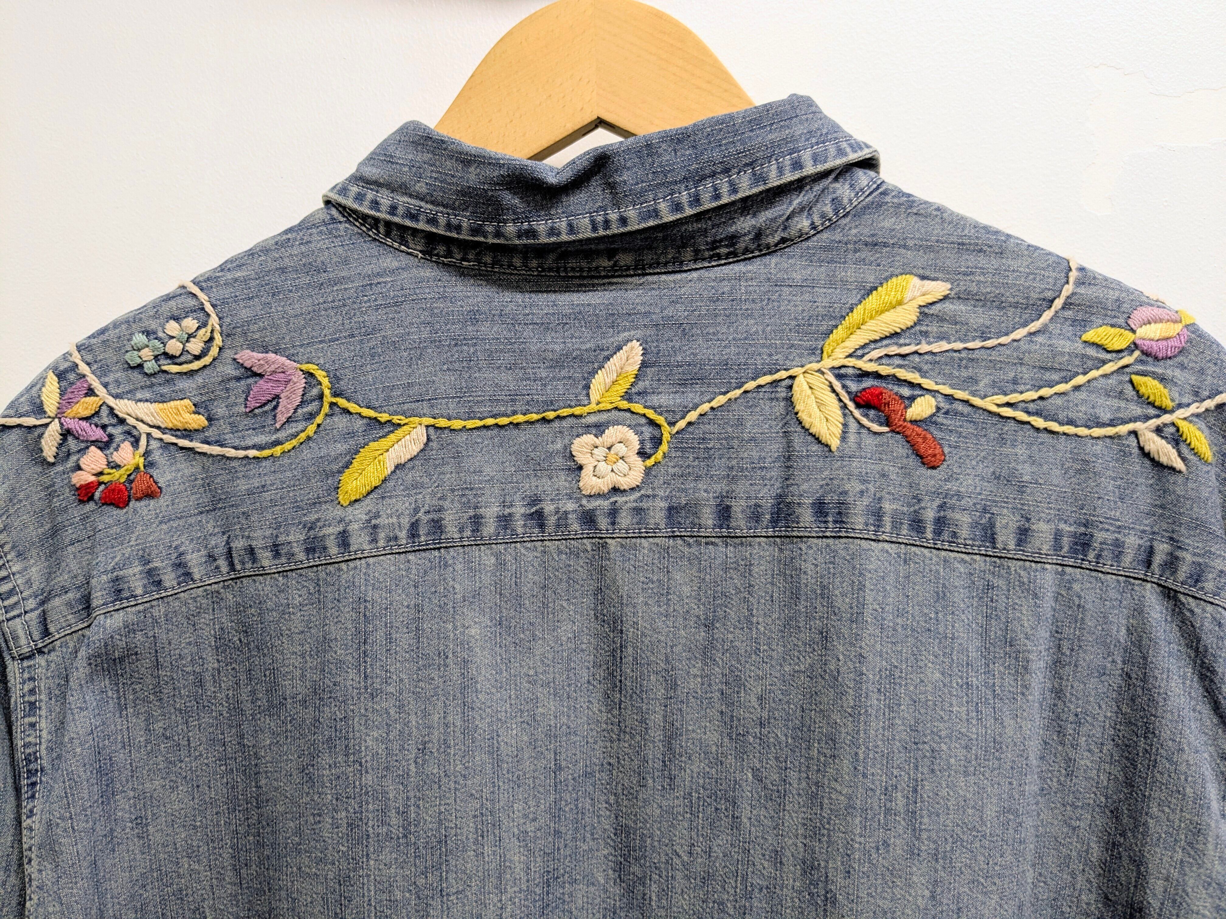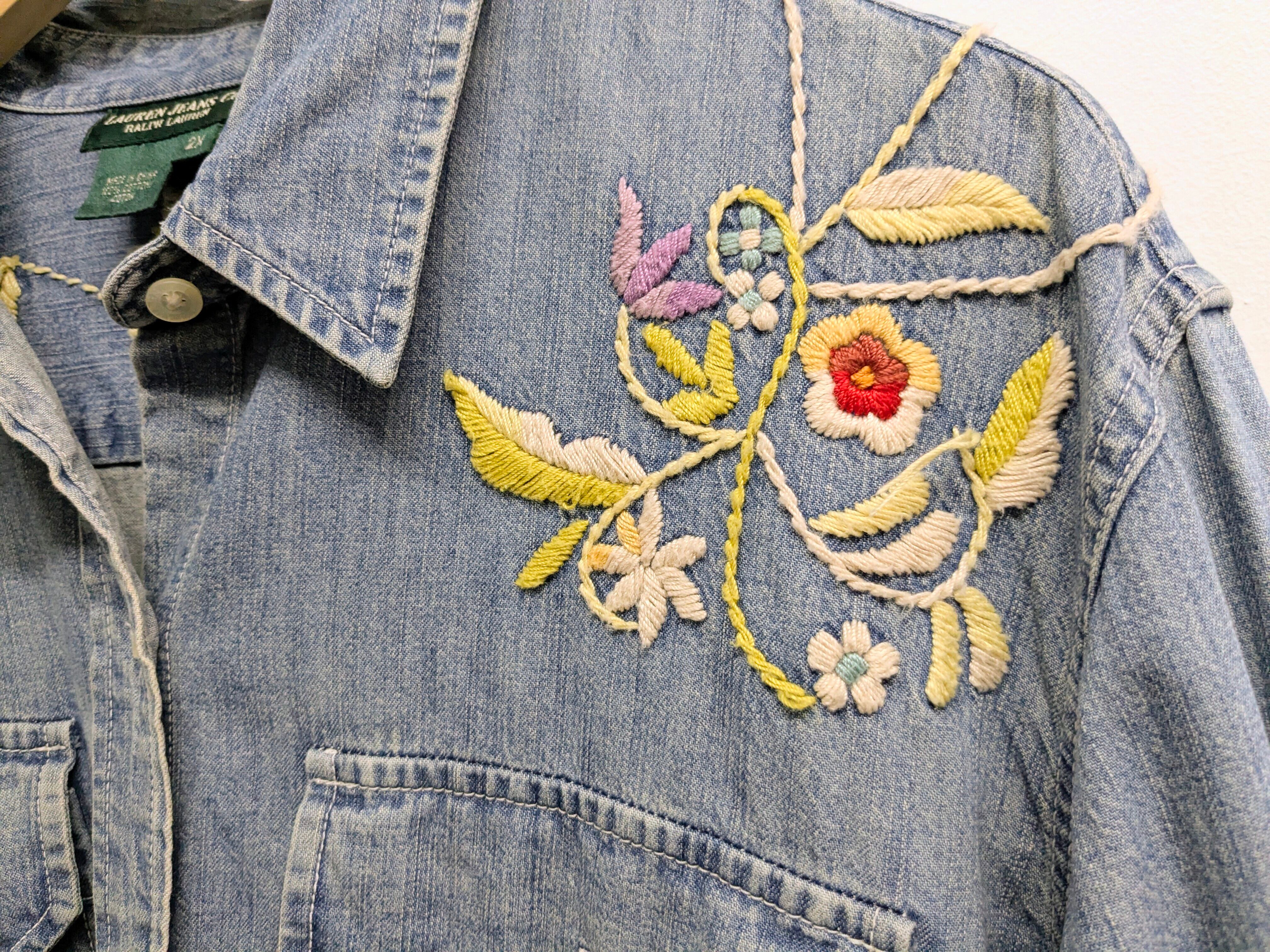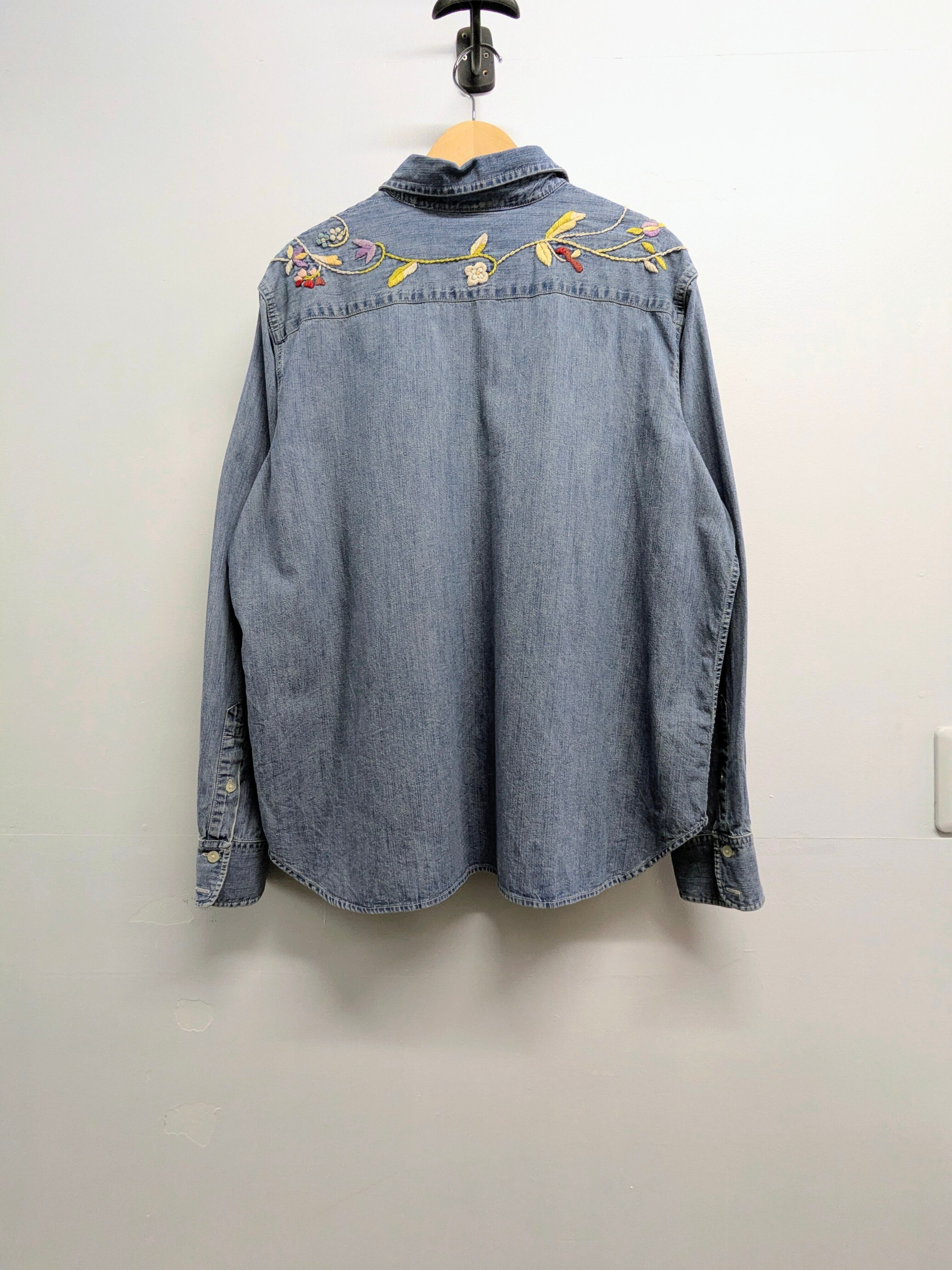 Lauren Jeansのフラワー刺繍のデニムシャツ。サイズ2Xなので、メンズも着ていただけます。短丈のワイドなボックスシルエットがとてとバランス良く着ていただけます。刺繍の色使いなど落ち着いた雰囲気が上品漂う一着。