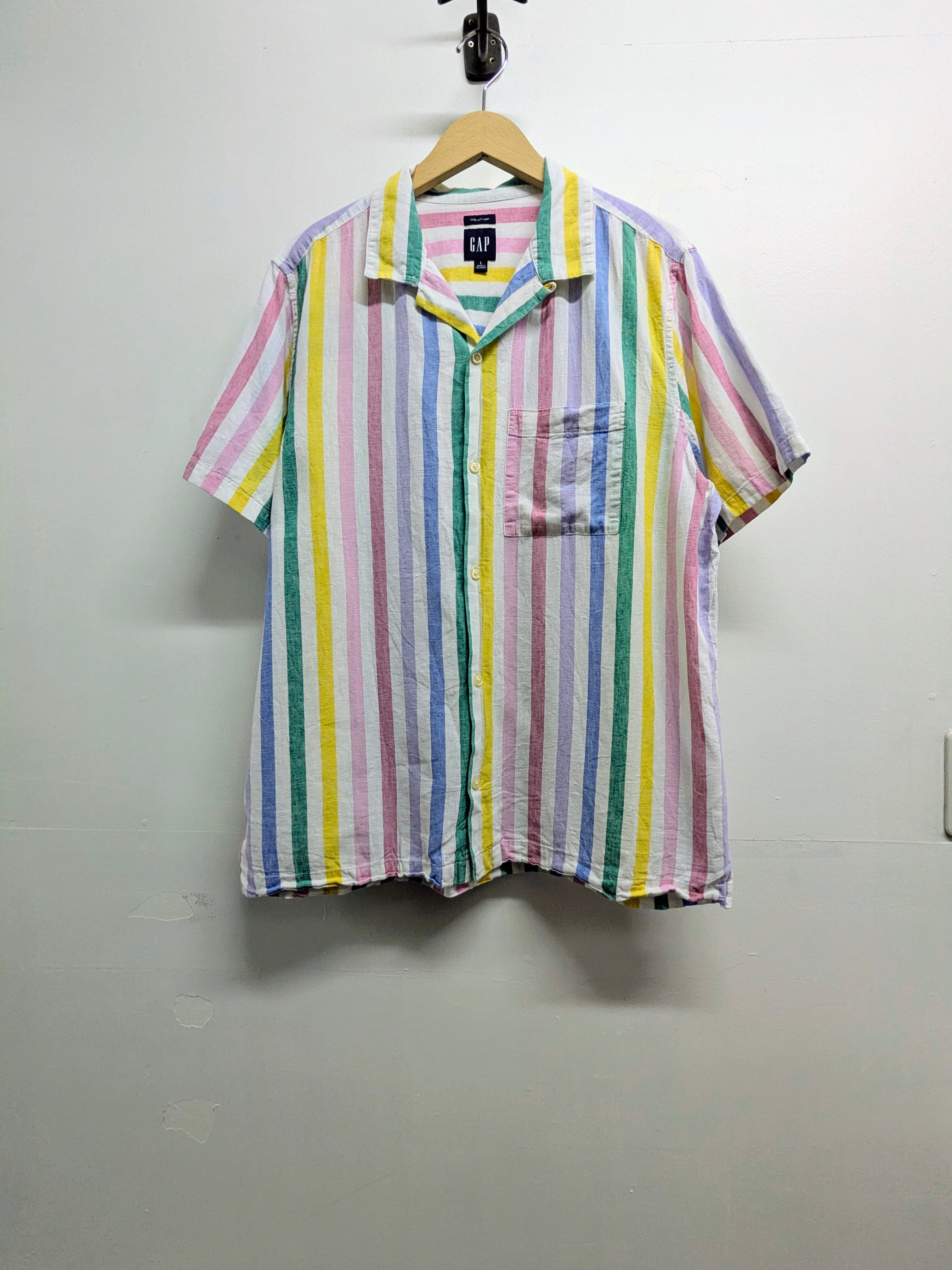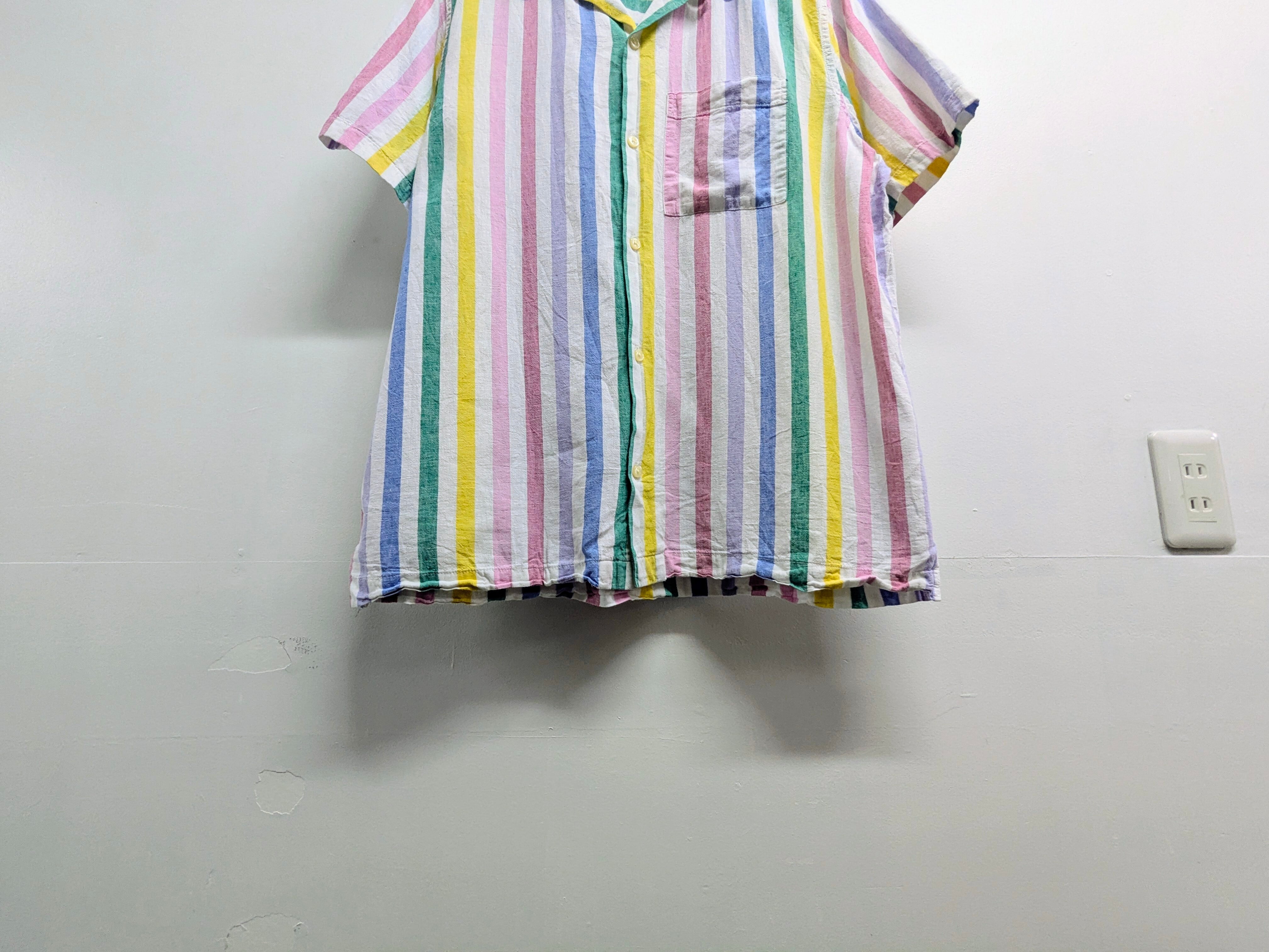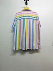 マルチストライプの半袖リネンシャツ。開襟になっているのも個人的にはおすすめポイント。探そうと思うとないこのデザイン。着る機会は間違いなくくるので、お探しの方はこの機会に是非。