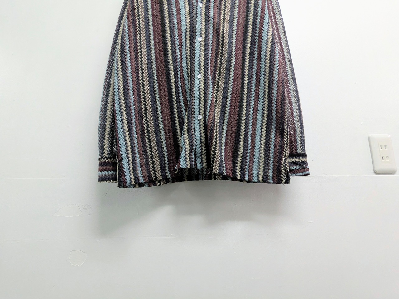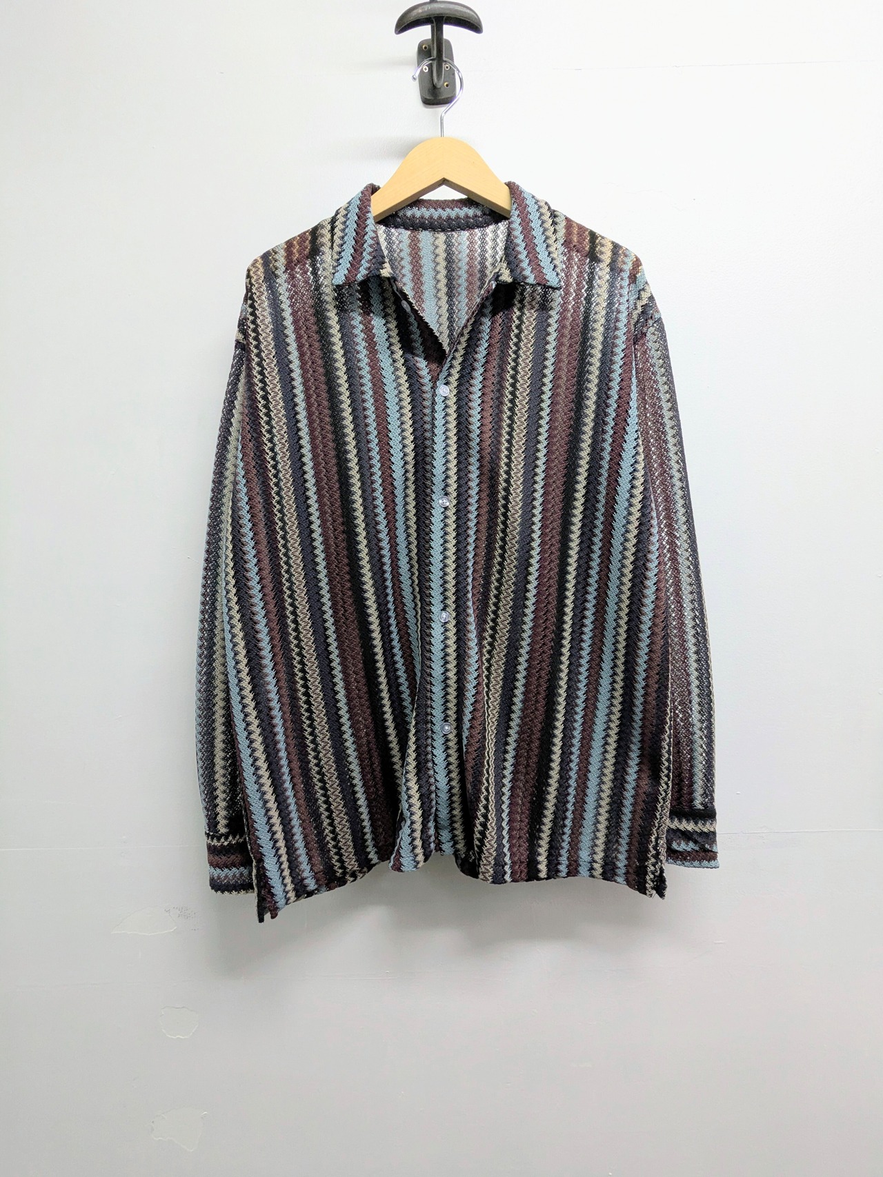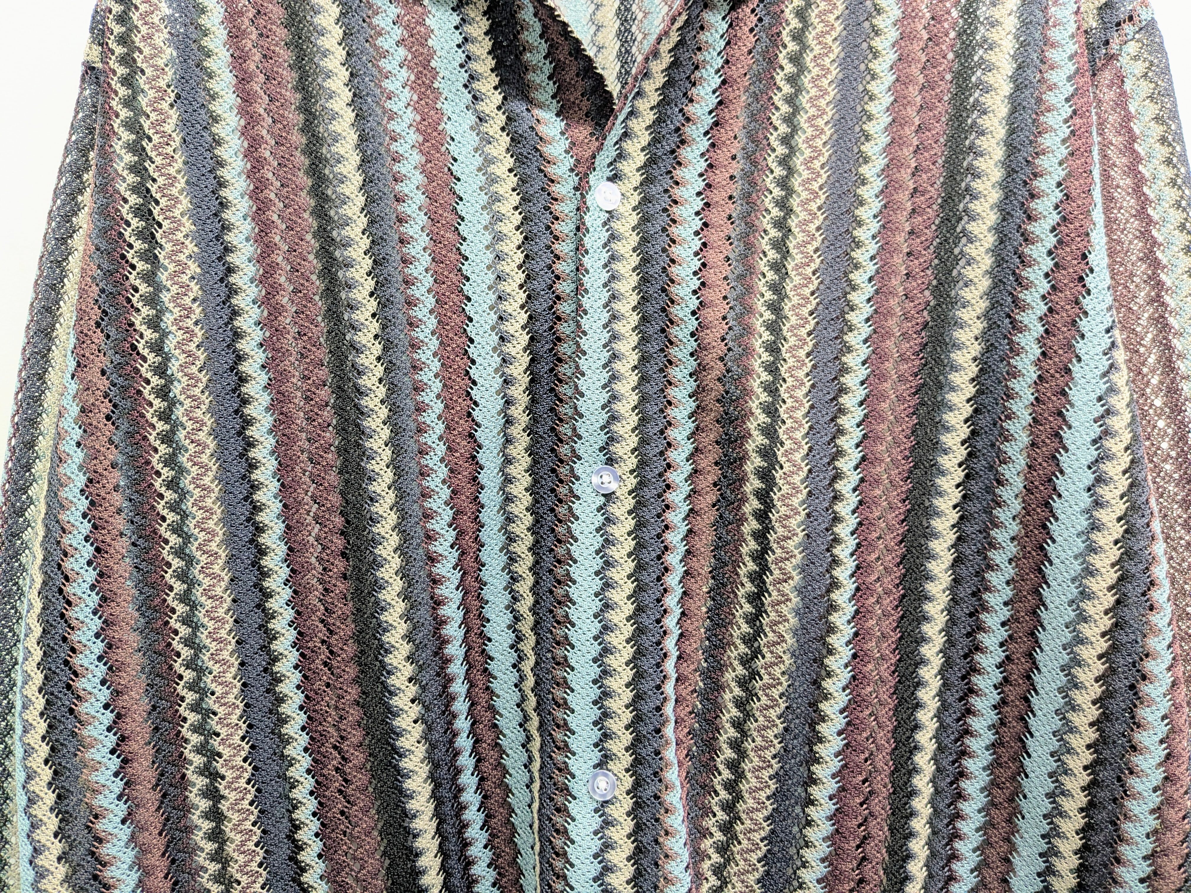 エスニック調のストライプシャツ。メッシュ素材でインナーが透けます。涼しげでこれからの時期に重宝すること間違いなしなのと、インナー次第で表情を変えてくれます。