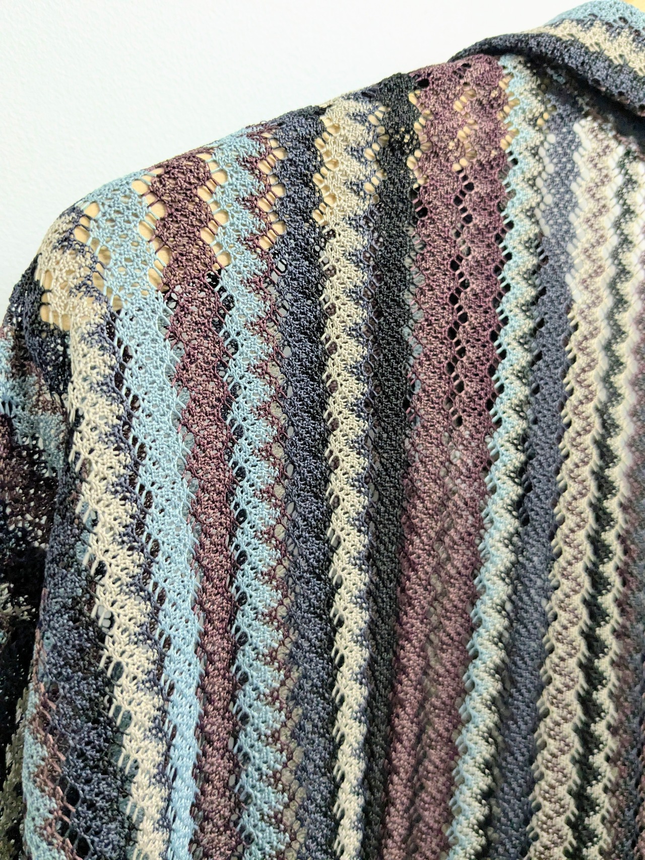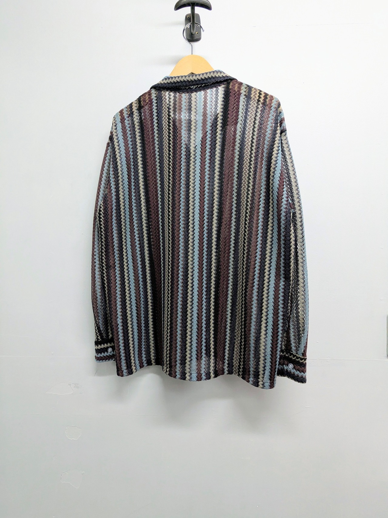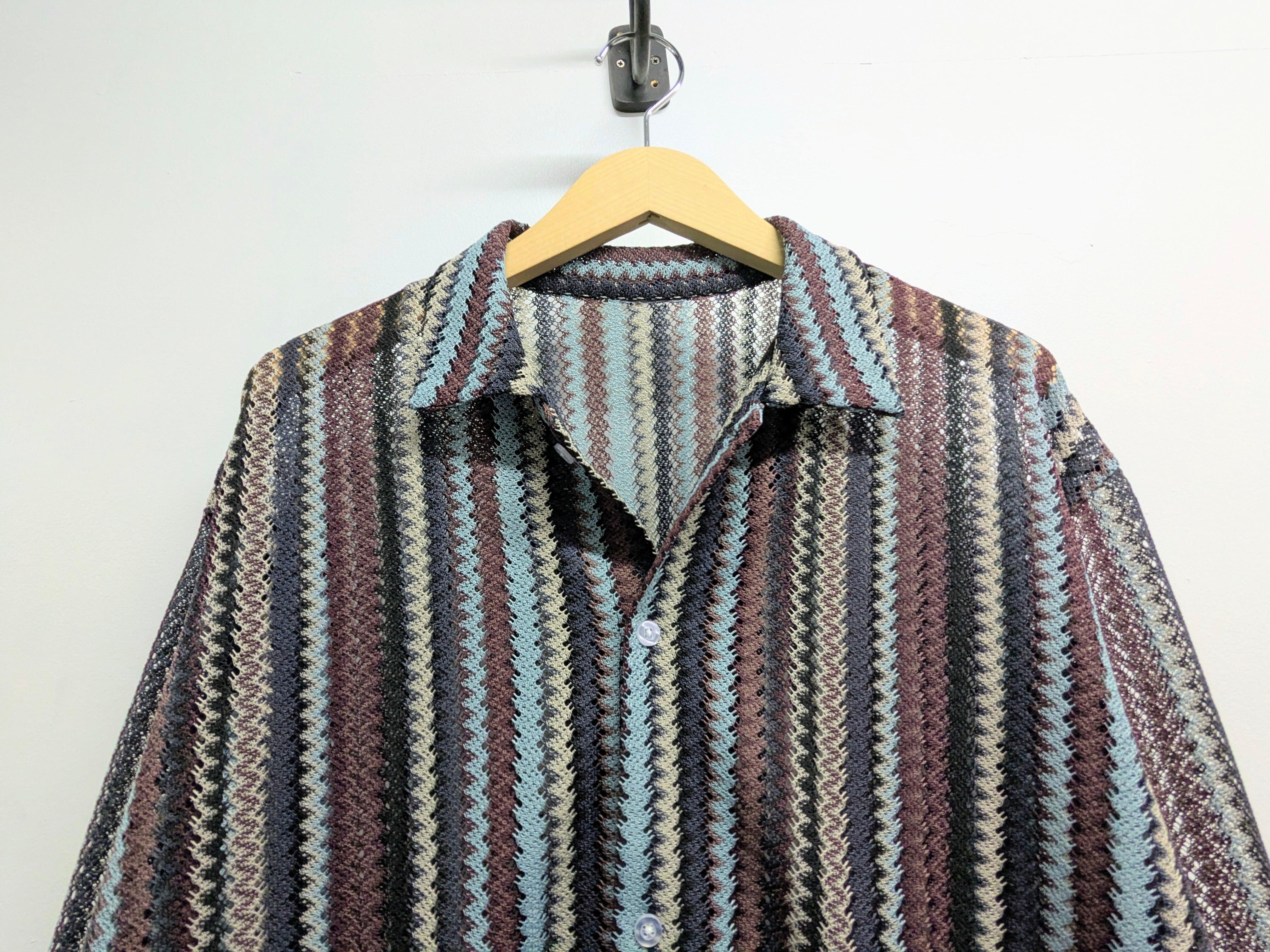 エスニック調のストライプシャツ。メッシュ素材でインナーが透けます。涼しげでこれからの時期に重宝すること間違いなしなのと、インナー次第で表情を変えてくれます。