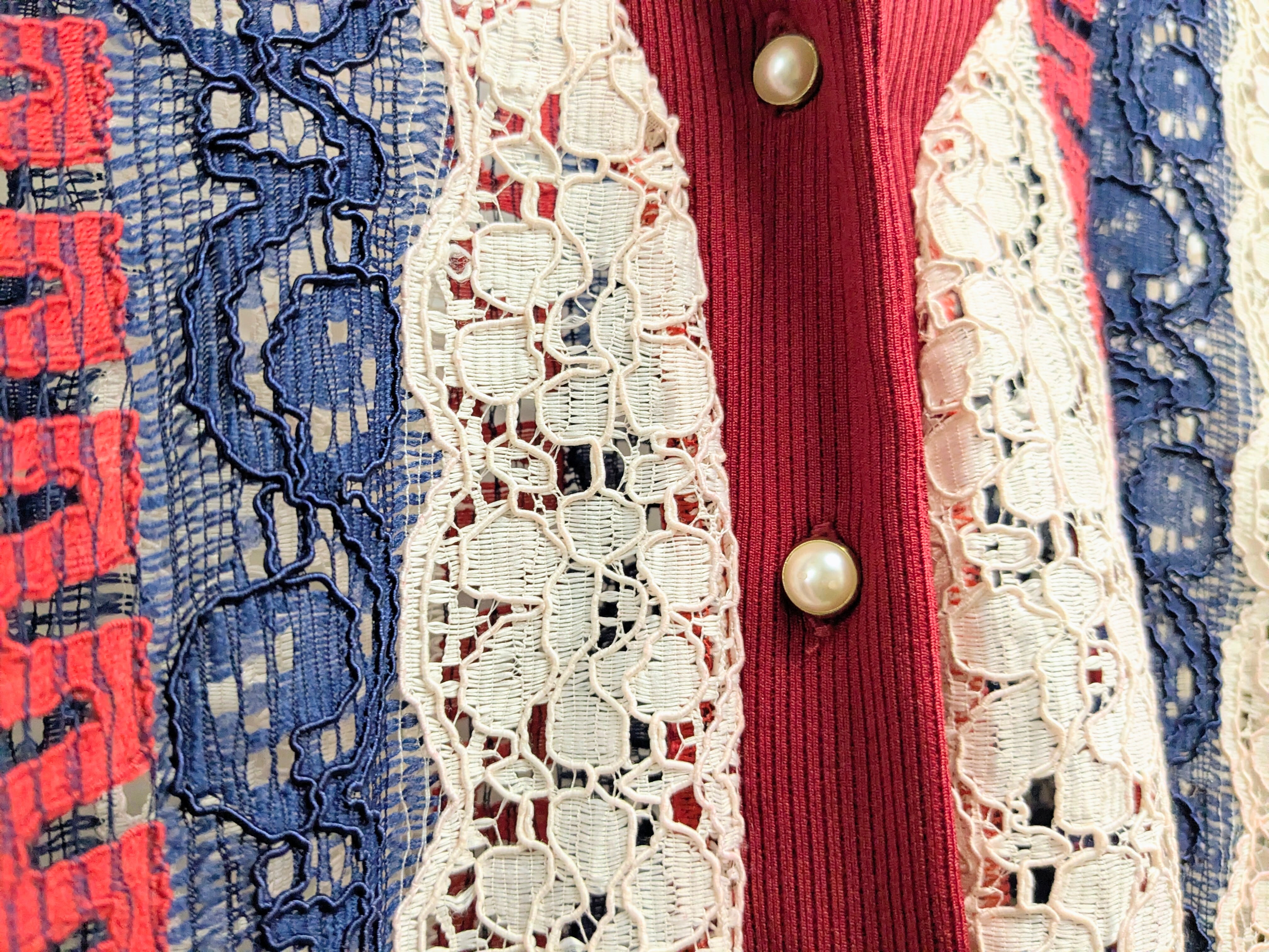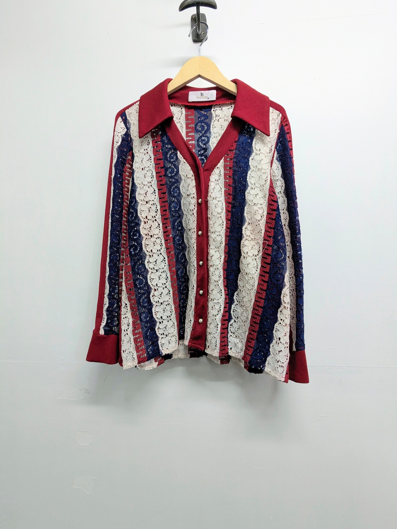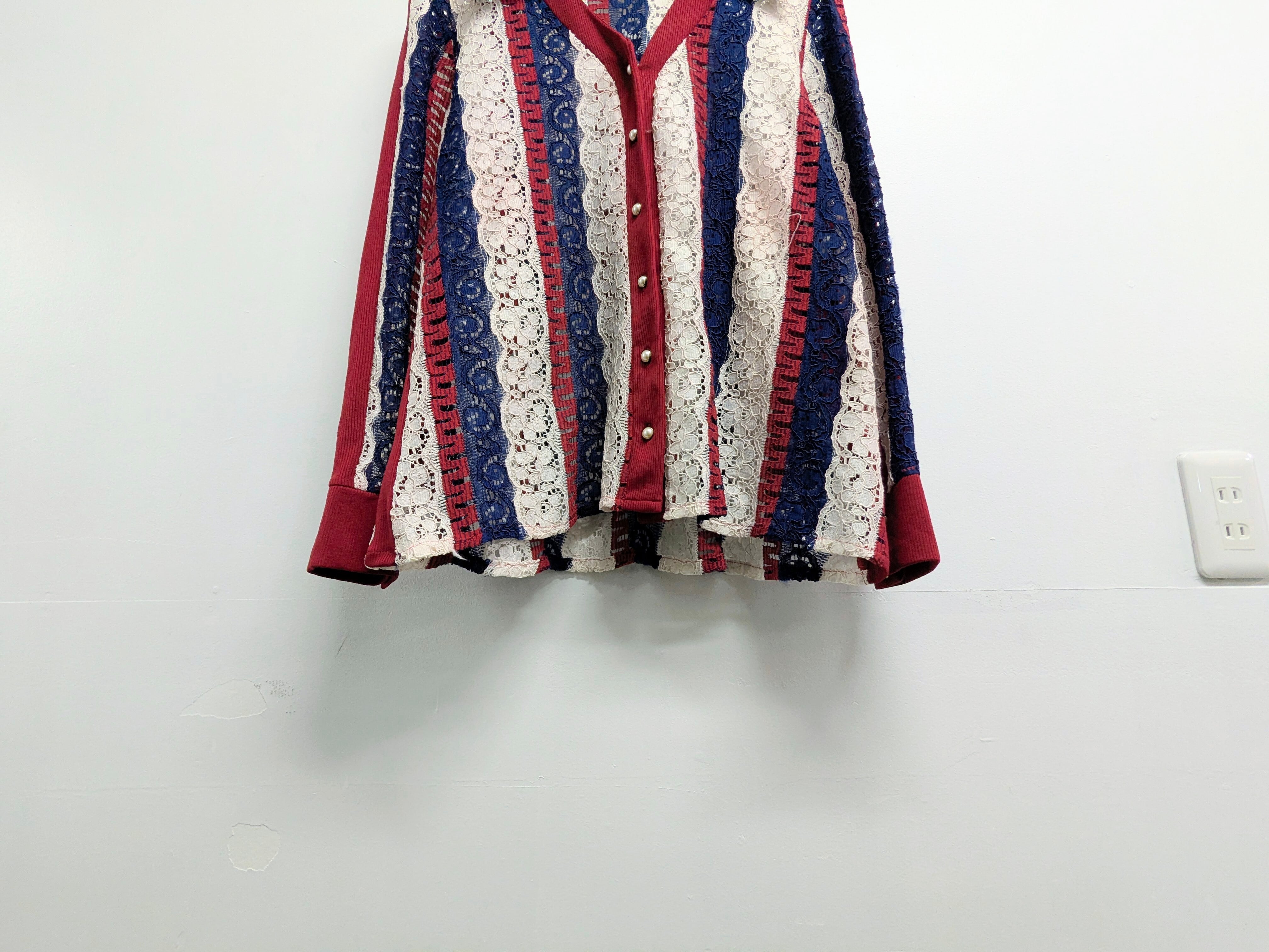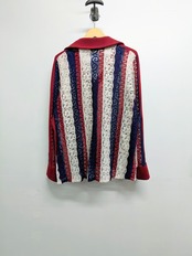 花柄、ペイズリー柄のような編みのレースシャツ。カーディガン、ジャケット、シャツなんと呼んでいいか分からないそんなアイテム。いい襟のカタチ、大きさだったり、こういったのアイテム好きな人多いかと。なかなか同じモノに出会わないとおもいますので、この機会に是非。