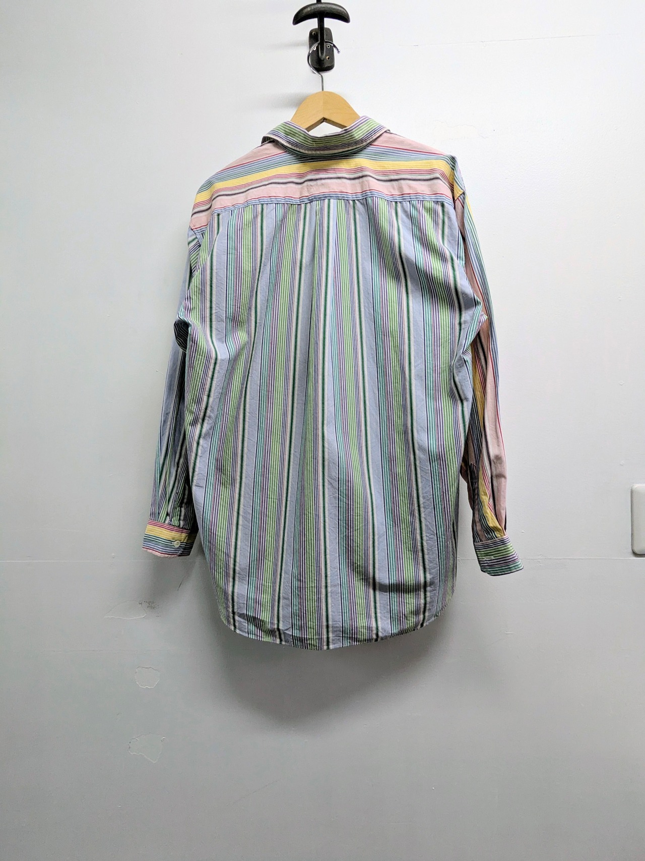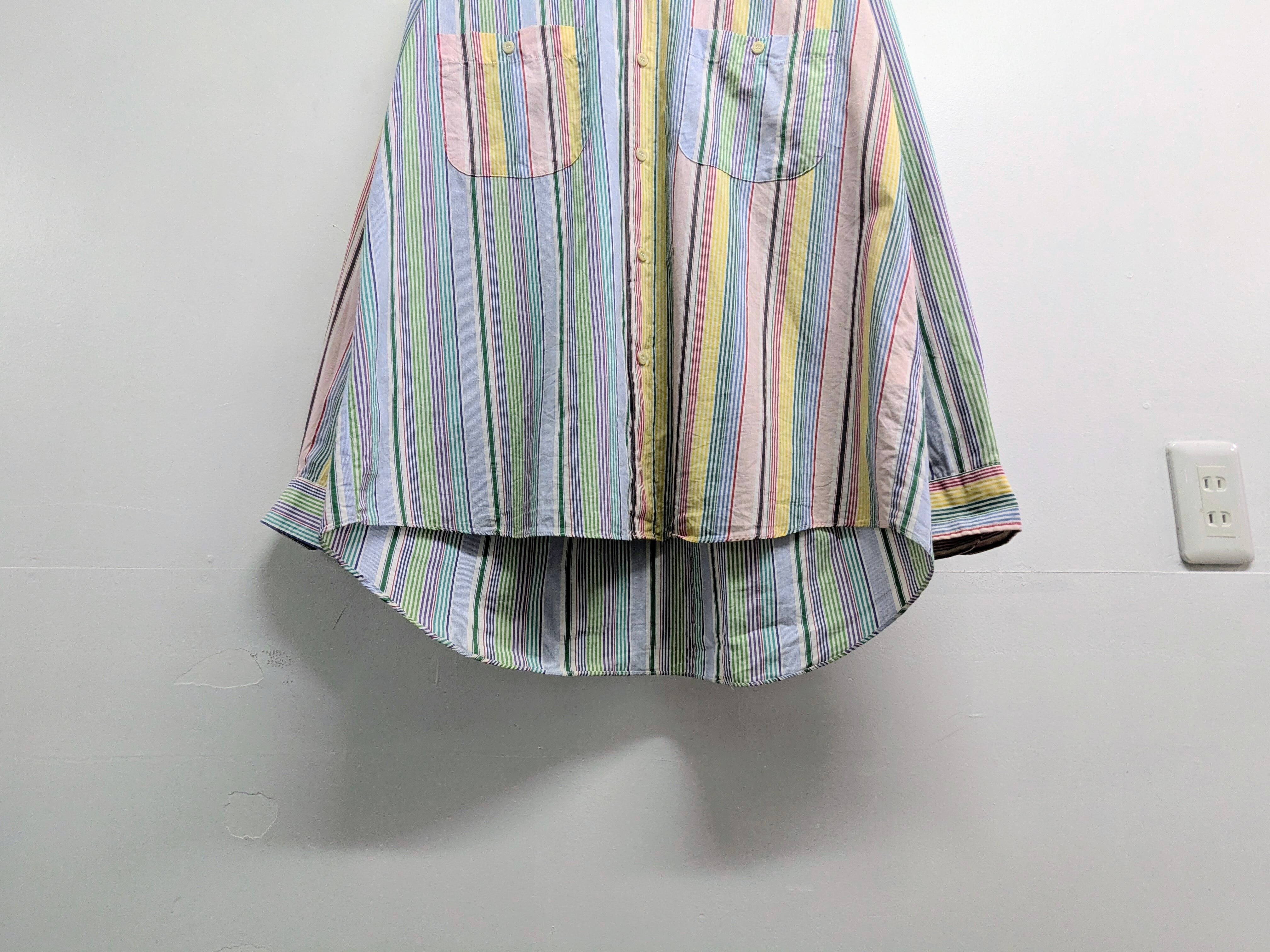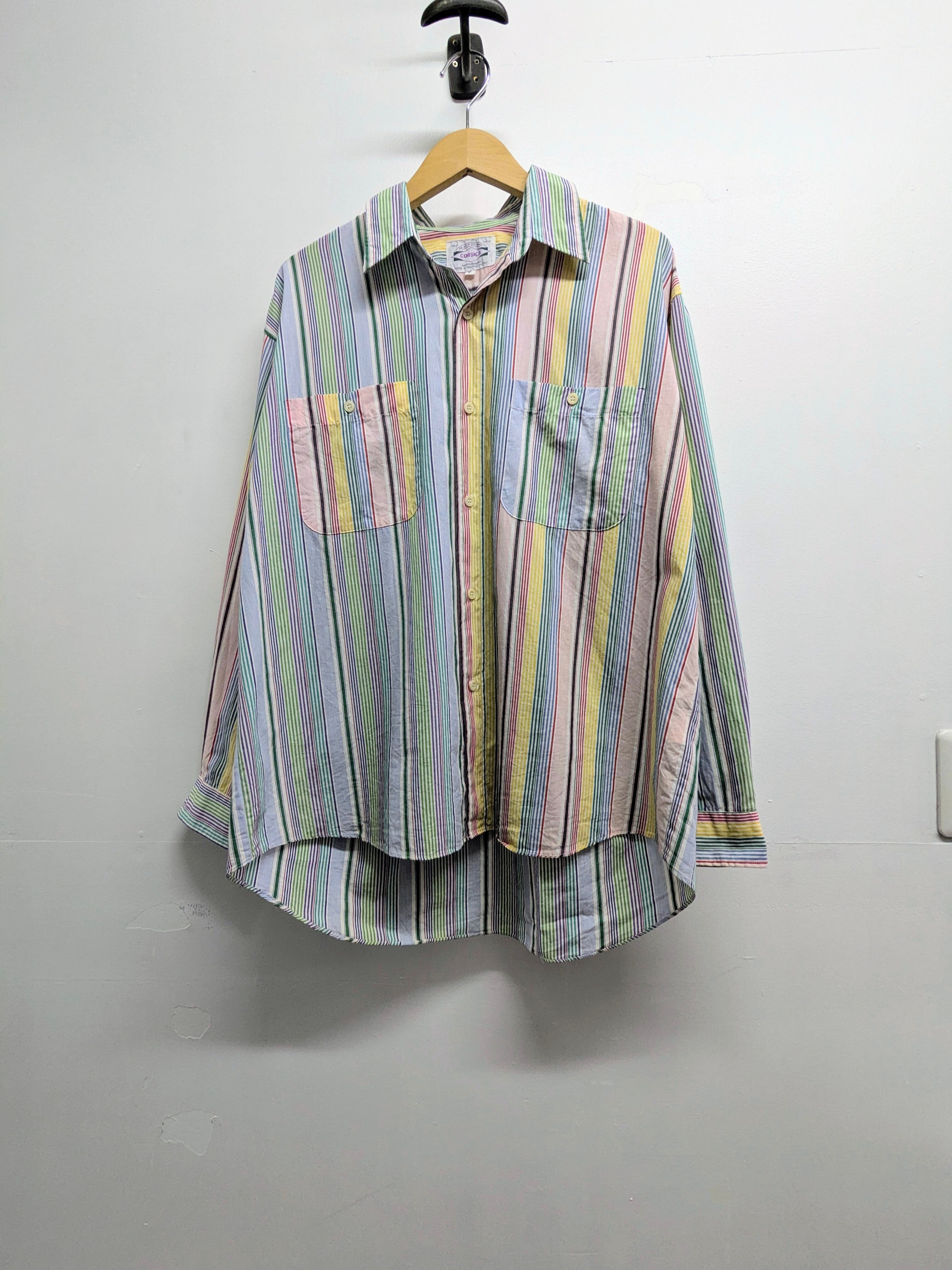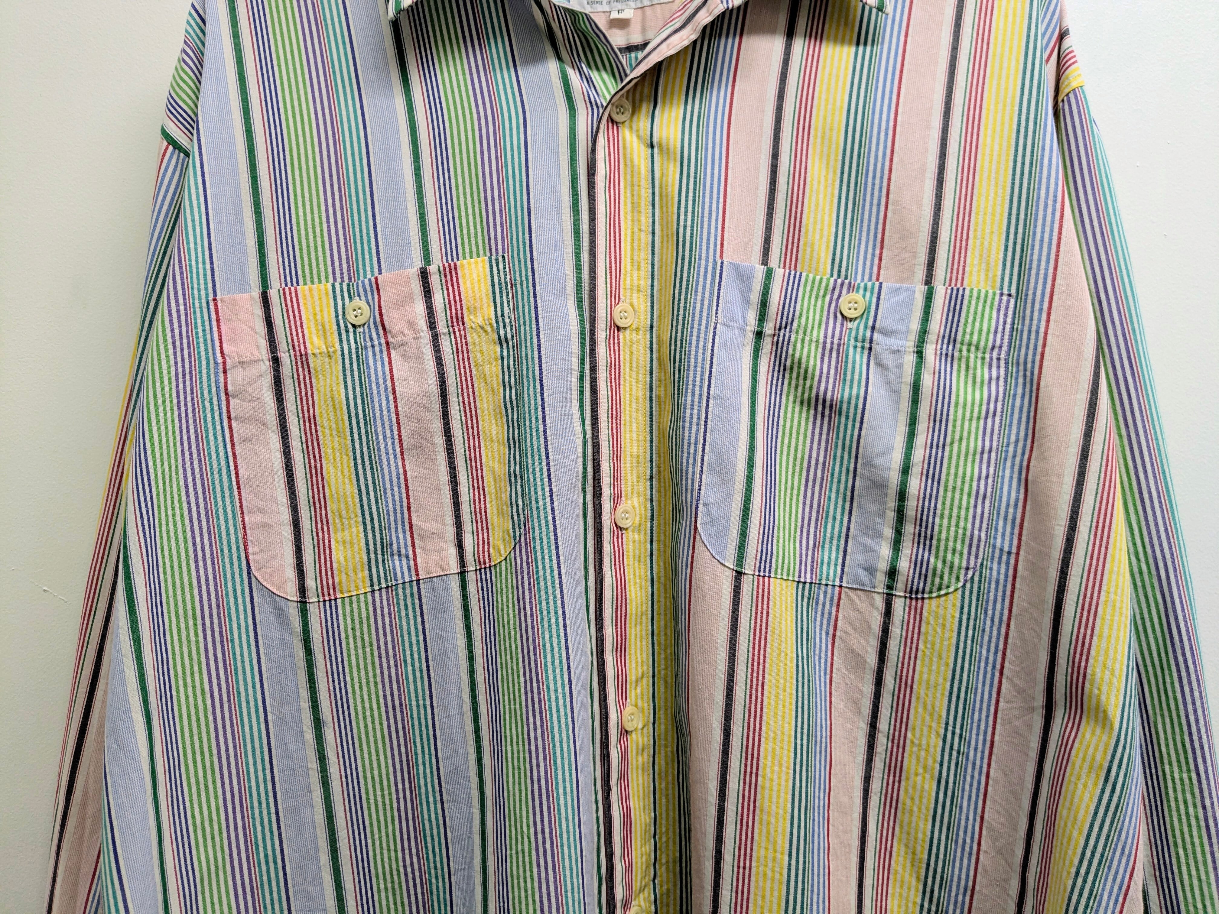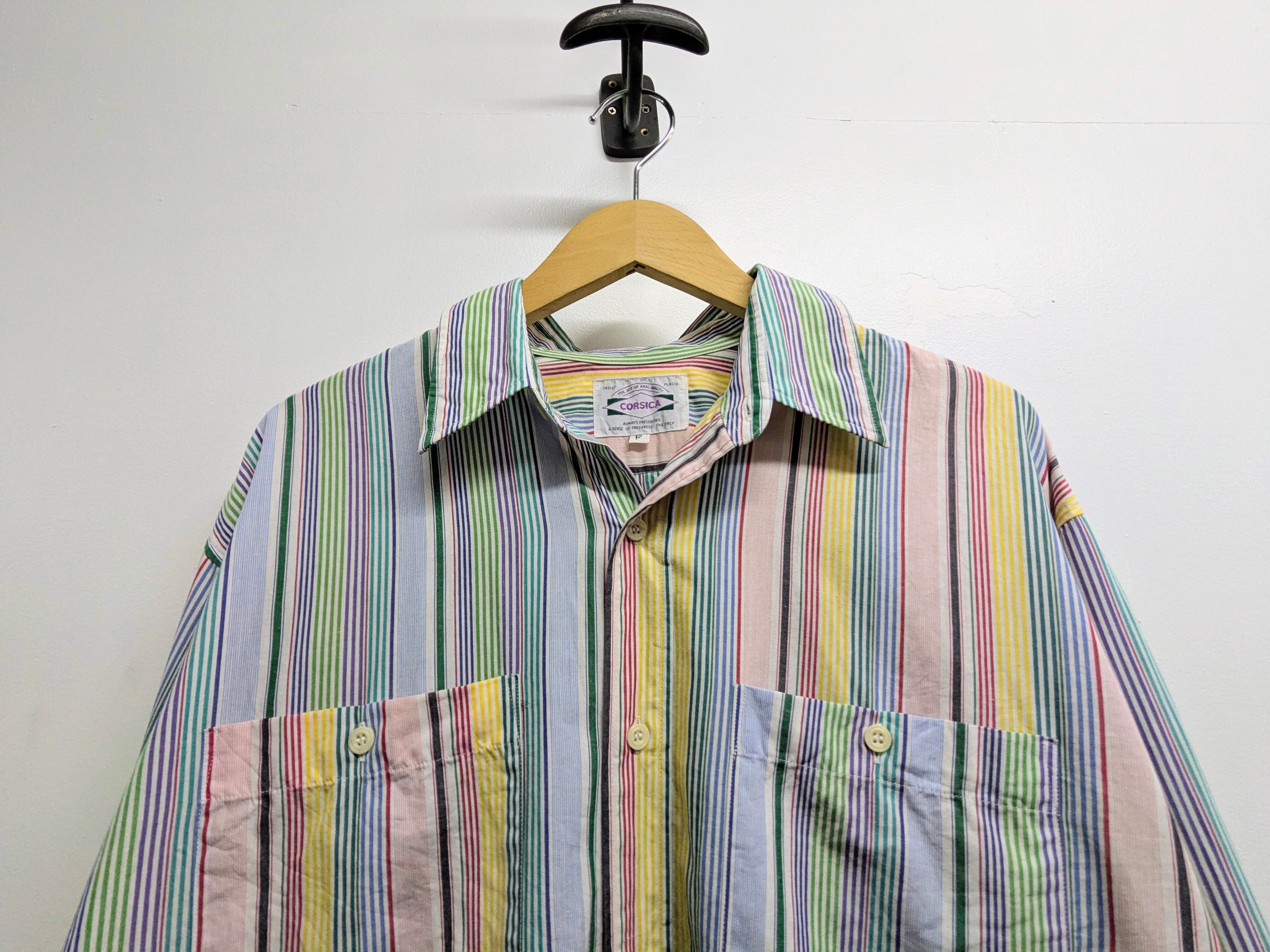 ピッチの違うストライプ、左右での切り返しデザインがシンプルなストライプシャツをひと段階昇華させてるデザインシャツ。