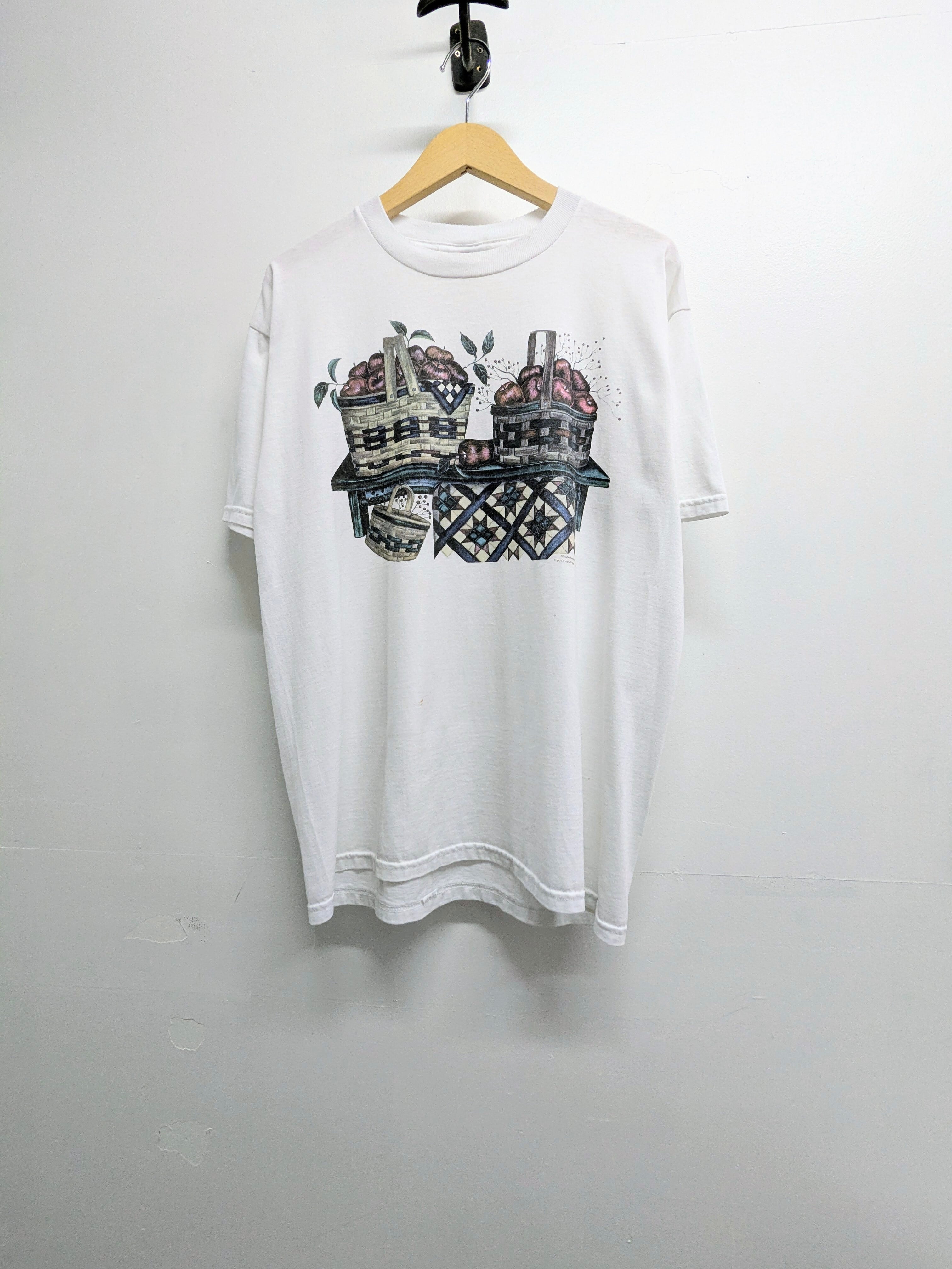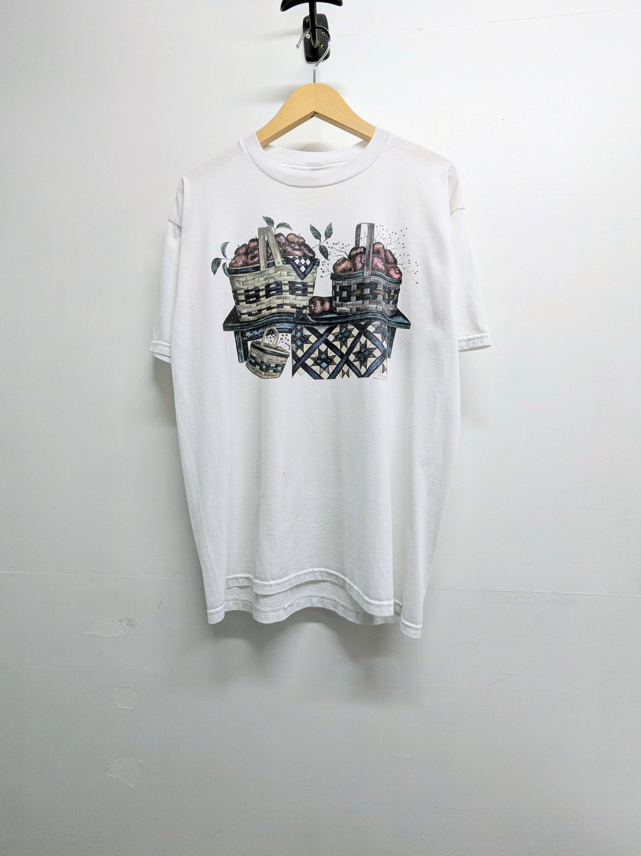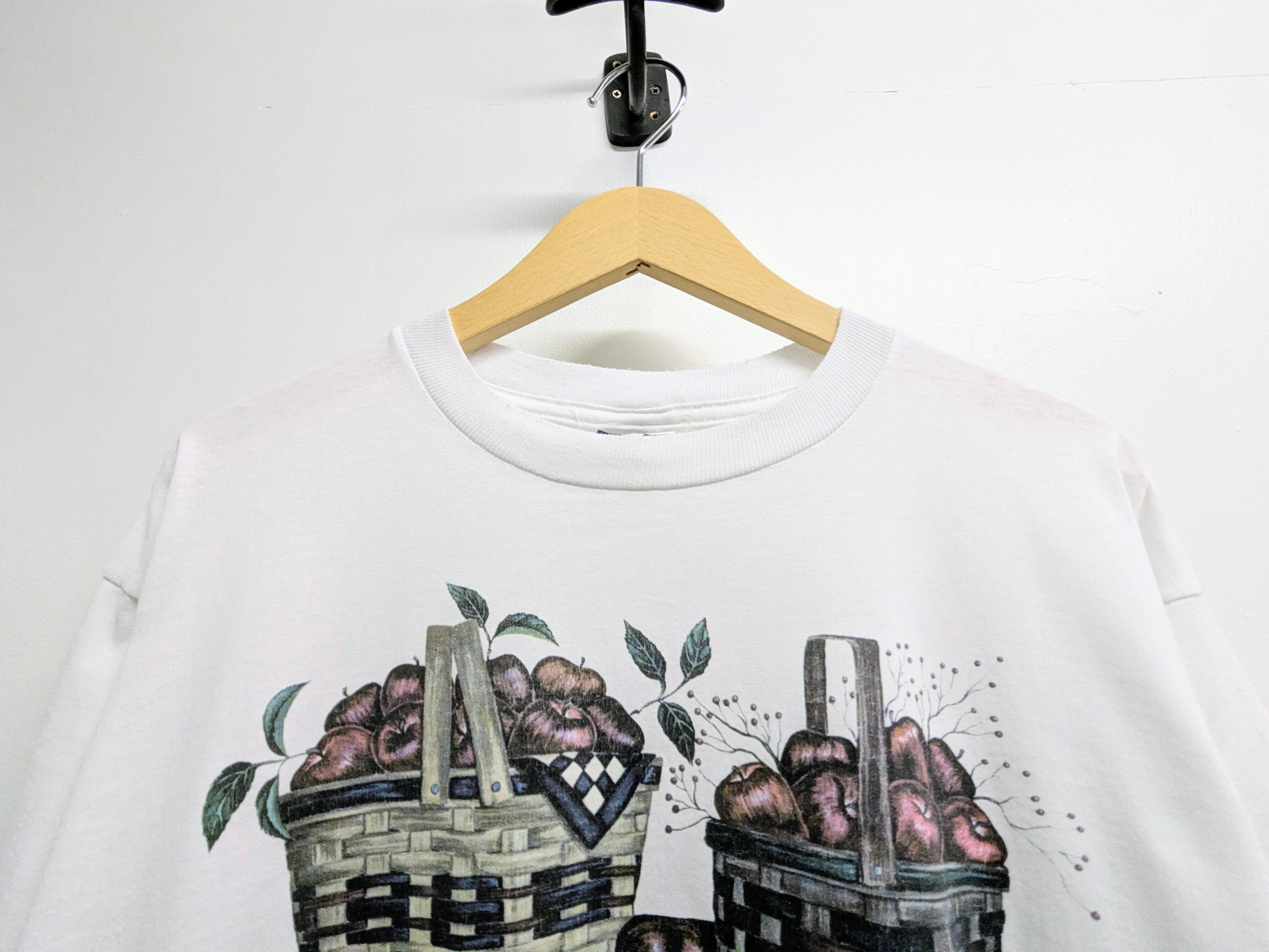 まるで絵画のようなプリントTシャツ。リンゴの絵がとても可愛いのと、落ち着いた色味を使用しており上品さも兼ね備えた一着。汚れあり。