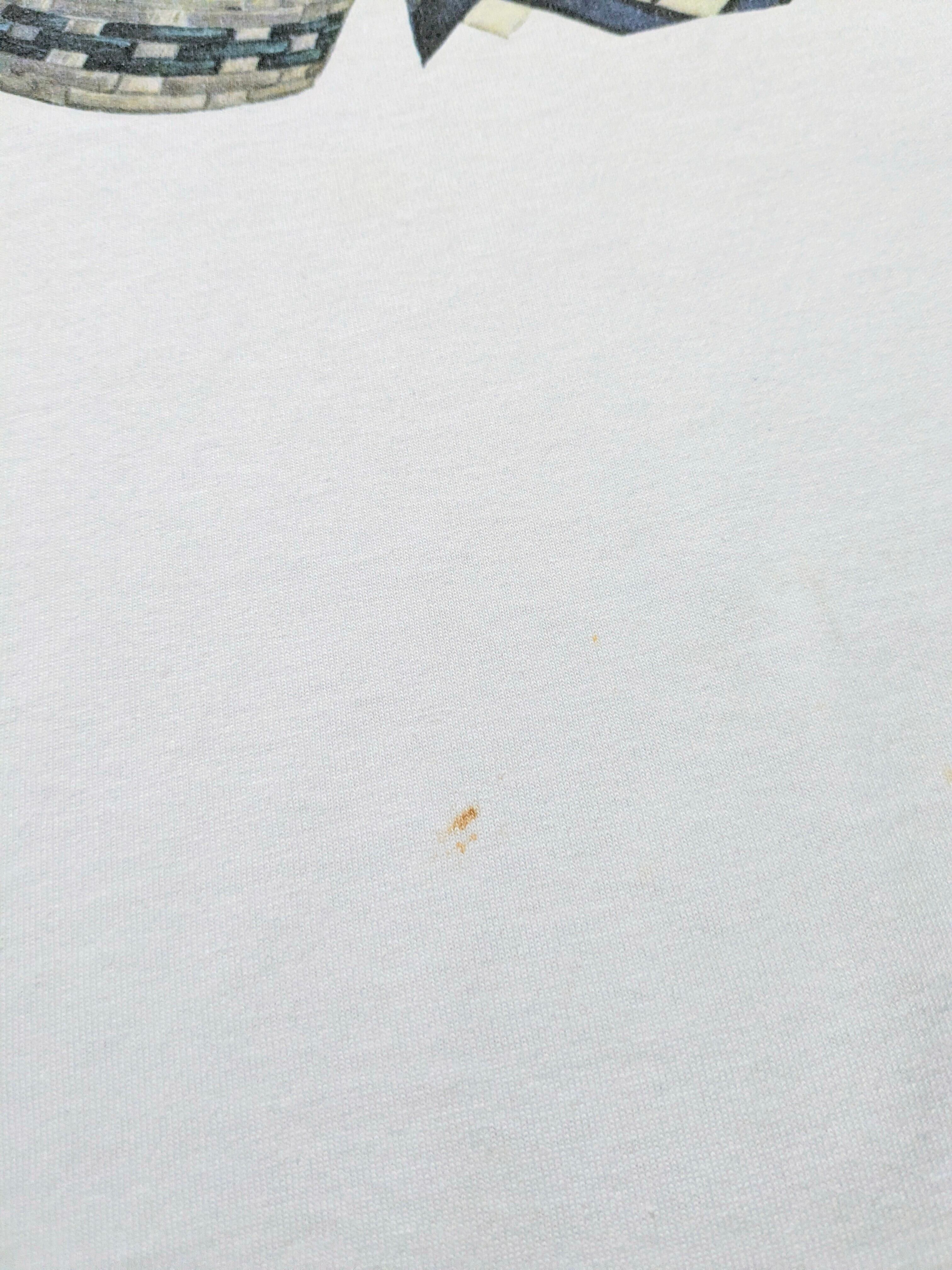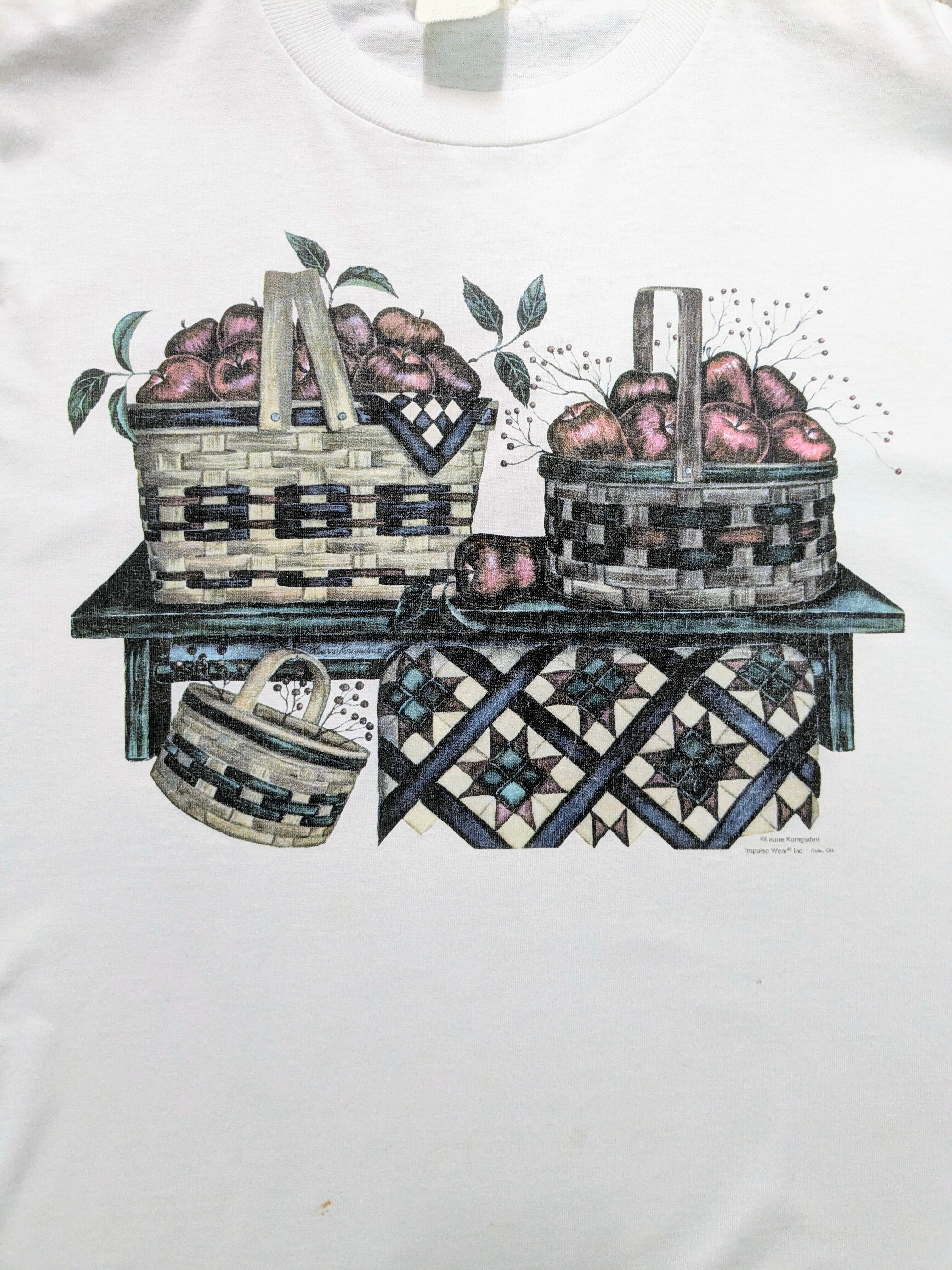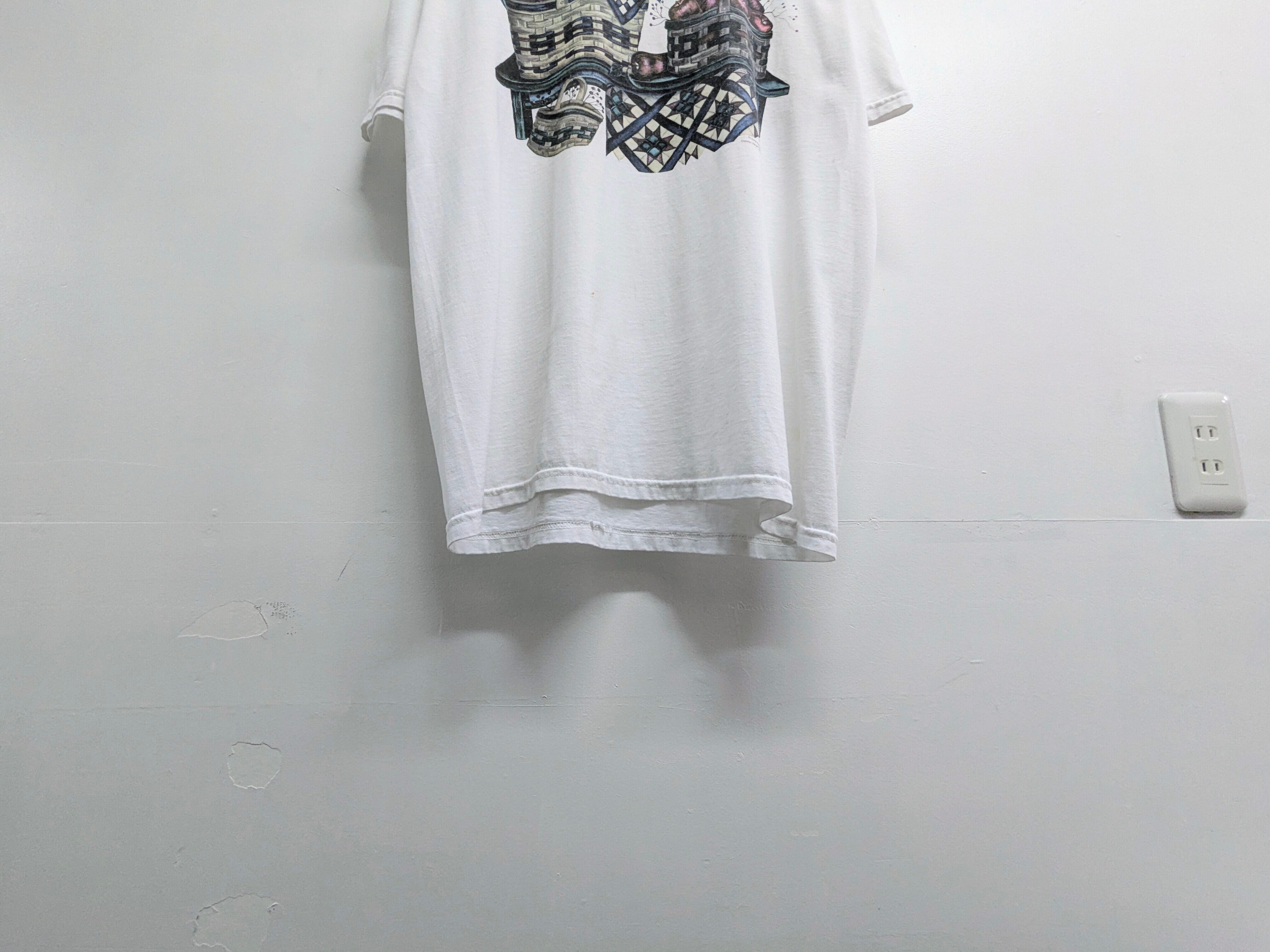 まるで絵画のようなプリントTシャツ。リンゴの絵がとても可愛いのと、落ち着いた色味を使用しており上品さも兼ね備えた一着。汚れあり。