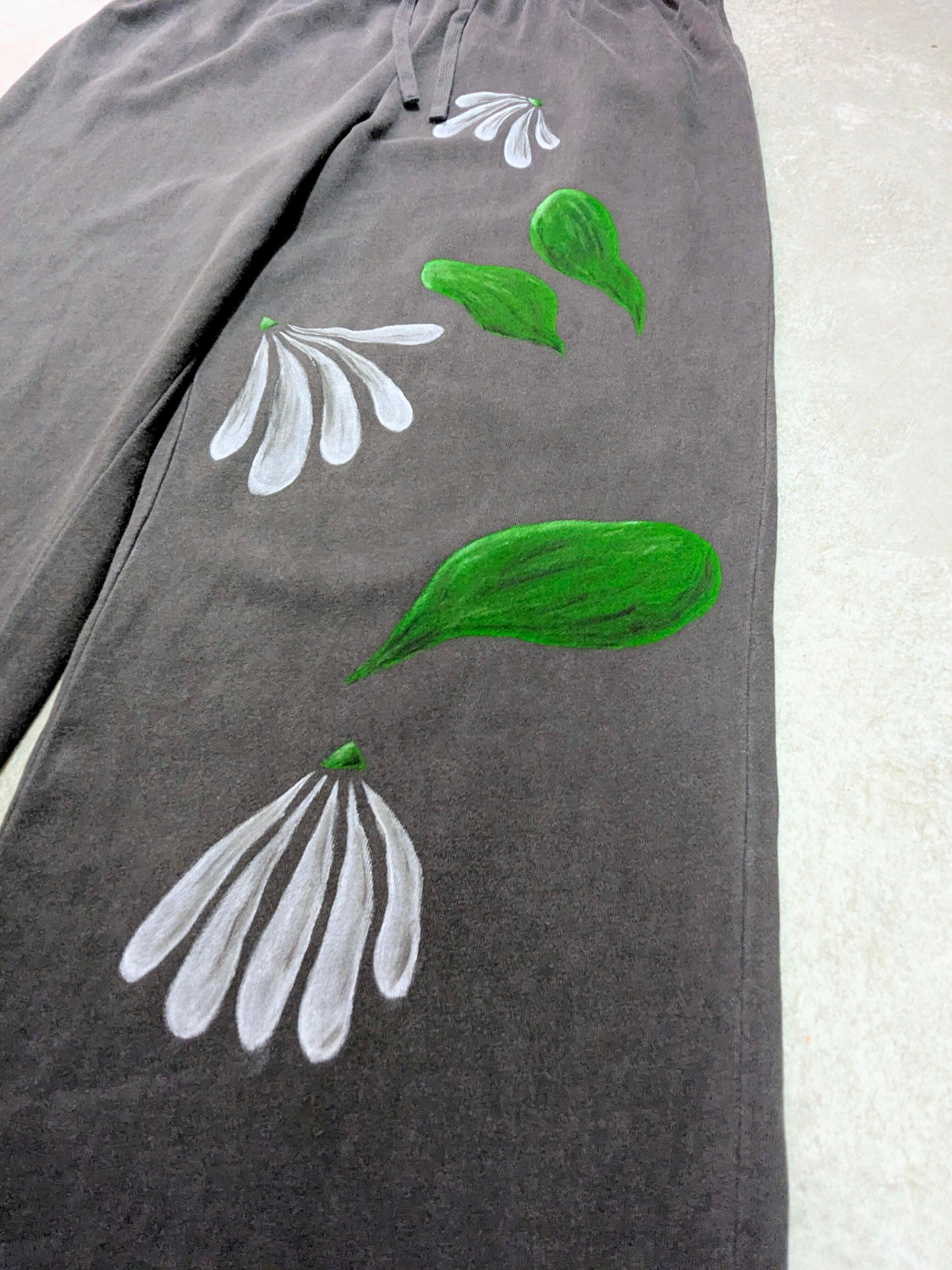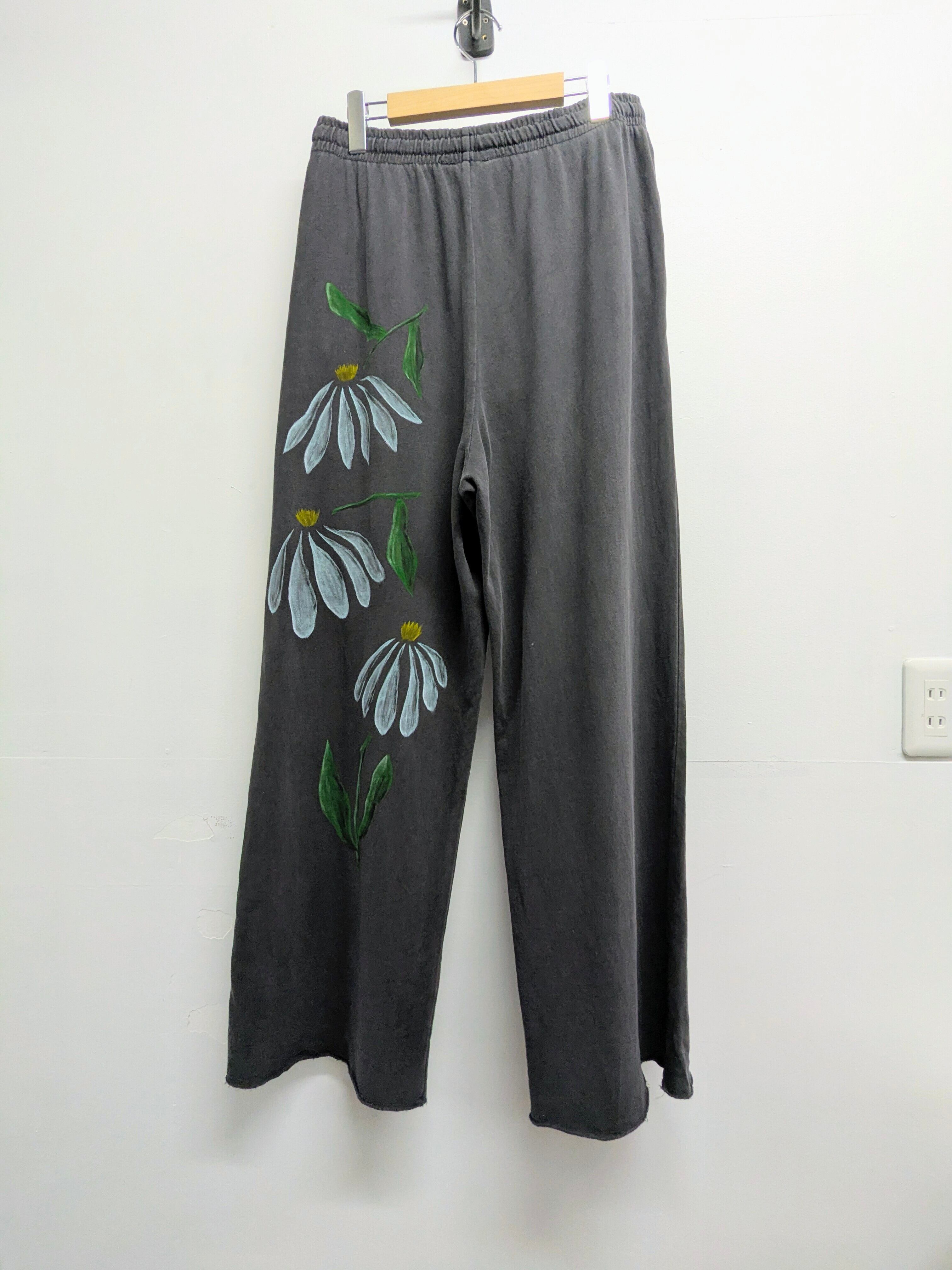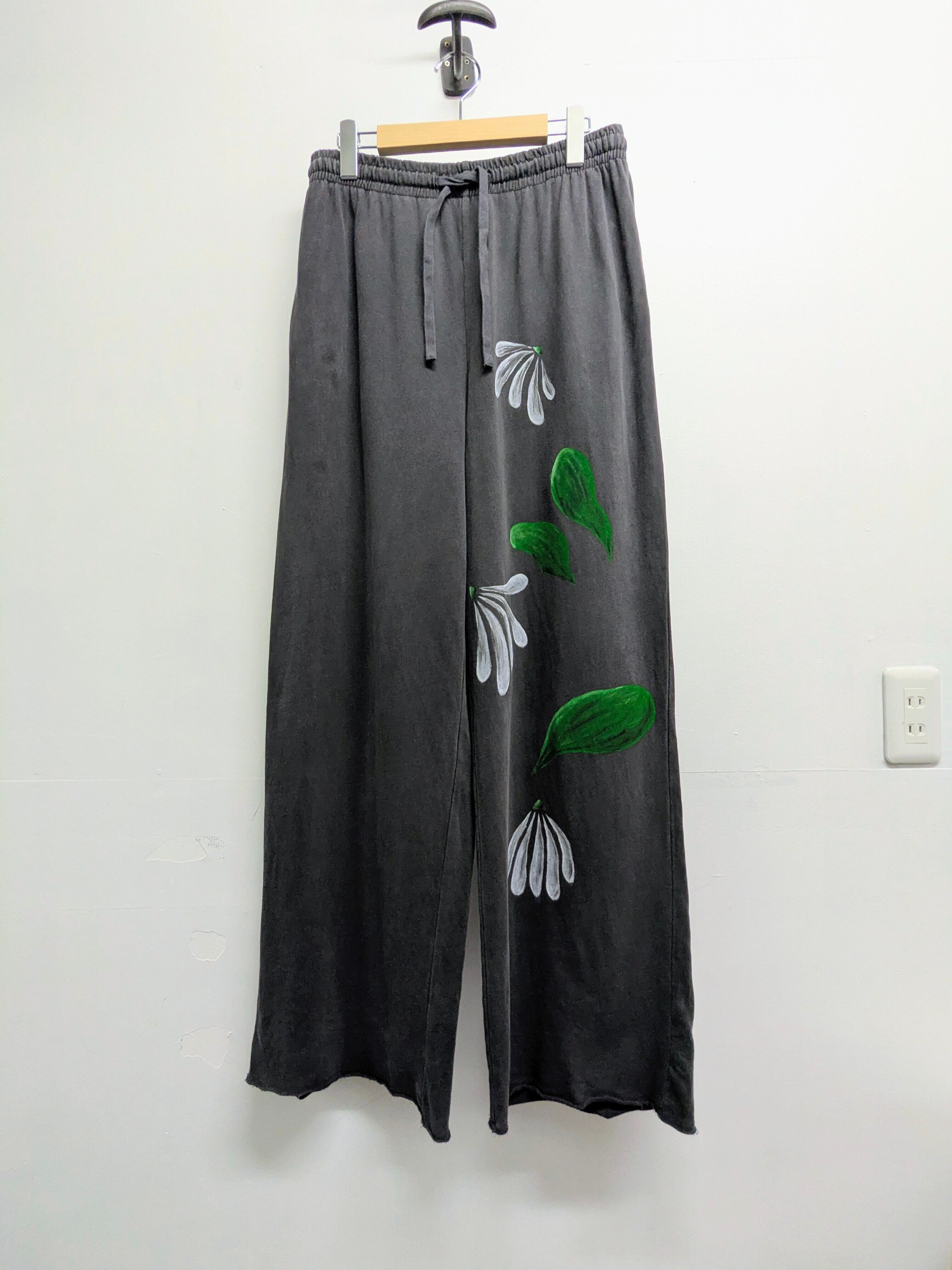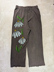 ワイドシルエット、ルーズなスウェットパンツを使用しています。全体的にフェードした色合いが雰囲気抜群。生地も薄手で落ち感のある、軽い素材感です。リアルな花柄のアートな絵がとても綺麗です。手描きのうえ、古着を使用しているので二度と手に入らない一点物となっています。気になるモノがあればこの機会に是非。汚れあり。