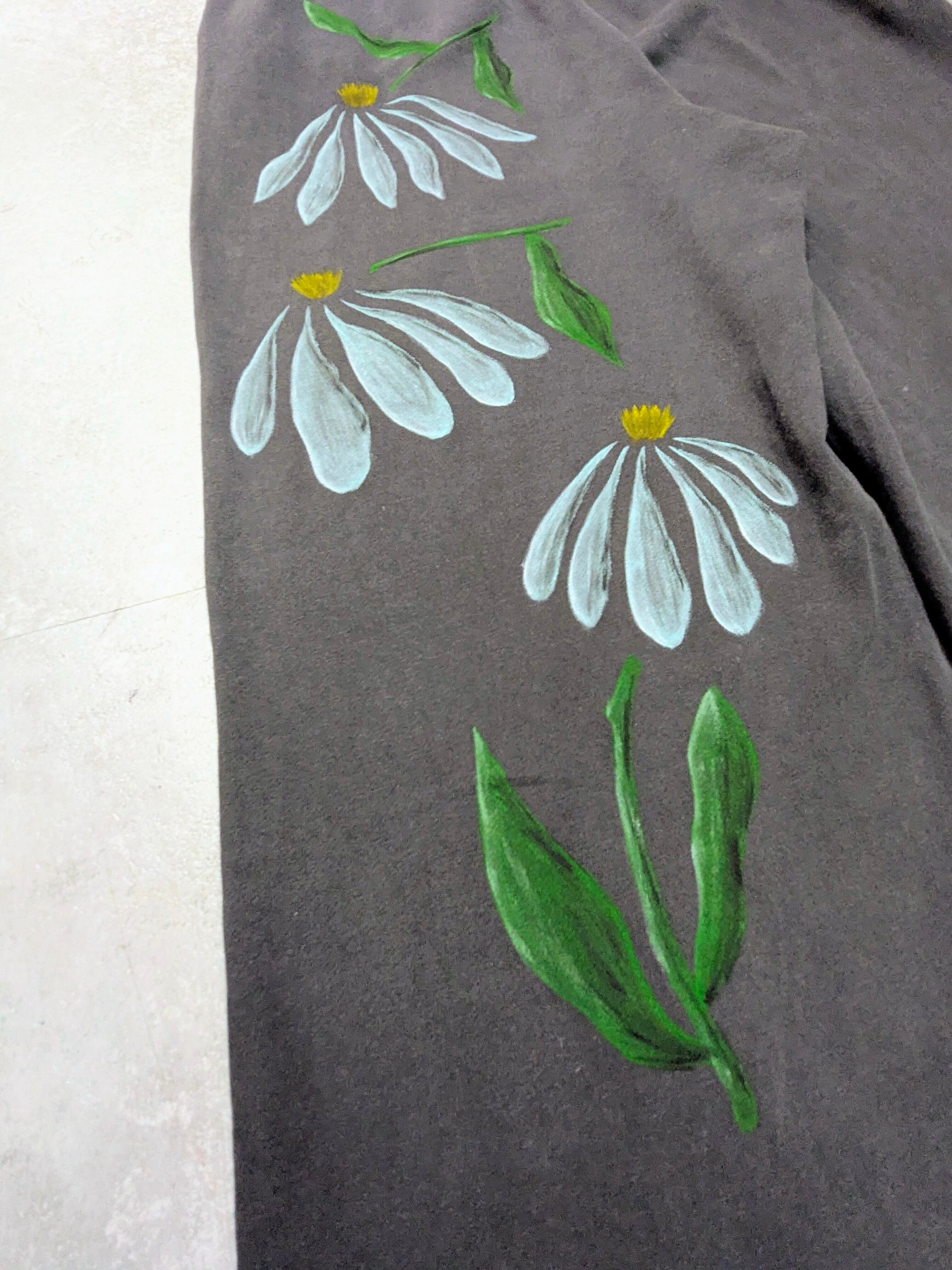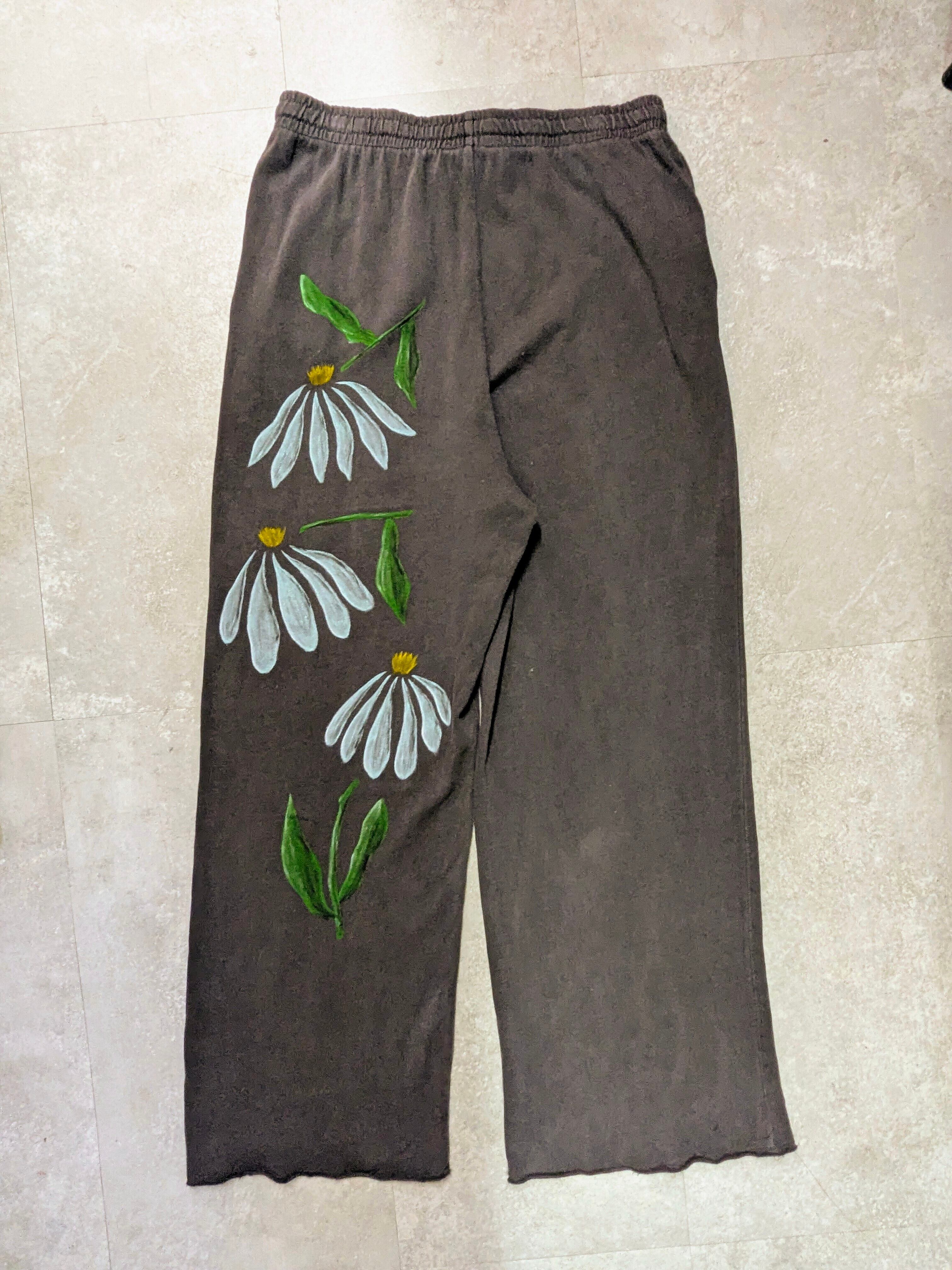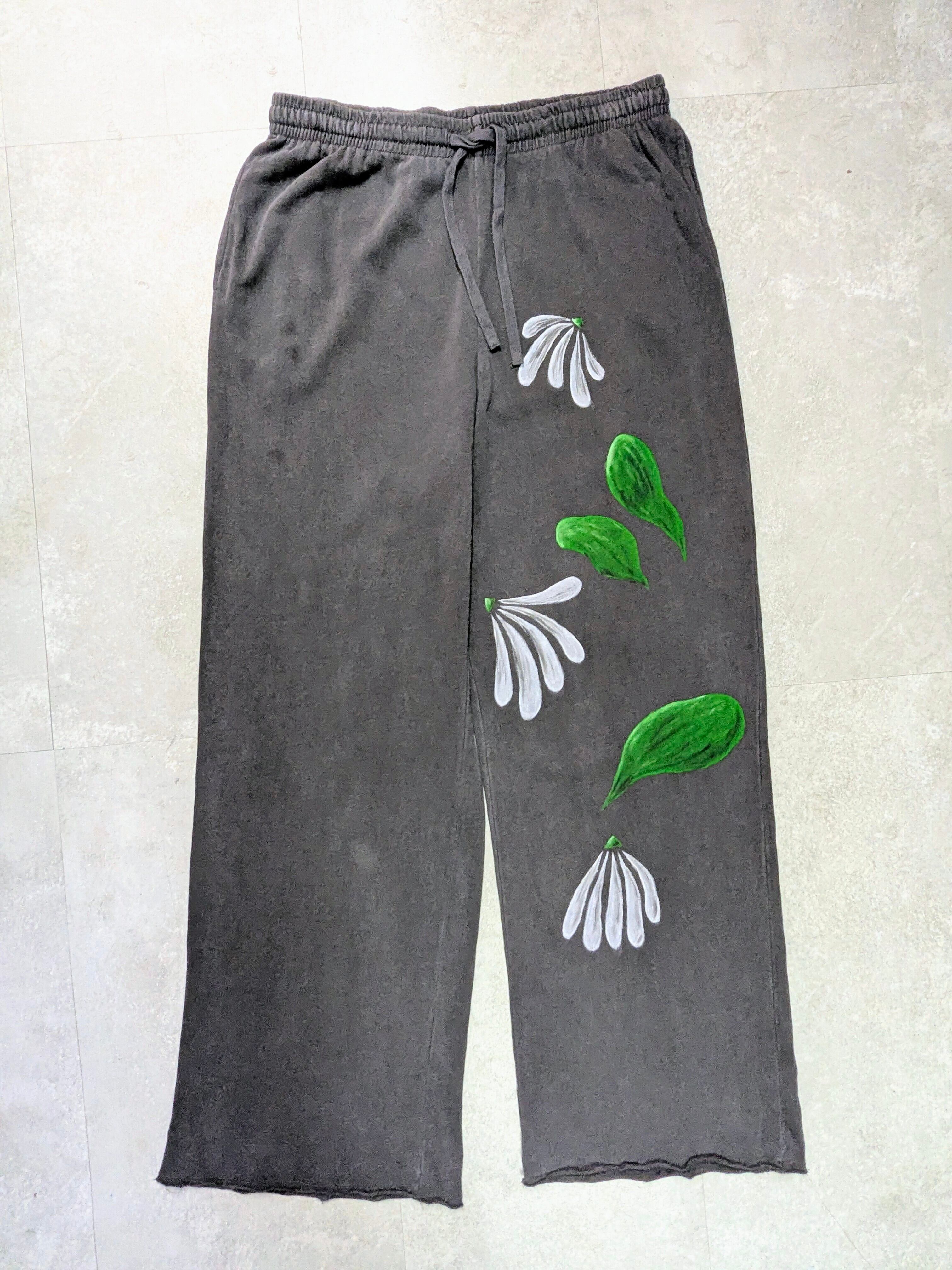 ワイドシルエット、ルーズなスウェットパンツを使用しています。全体的にフェードした色合いが雰囲気抜群。生地も薄手で落ち感のある、軽い素材感です。リアルな花柄のアートな絵がとても綺麗です。手描きのうえ、古着を使用しているので二度と手に入らない一点物となっています。気になるモノがあればこの機会に是非。汚れあり。