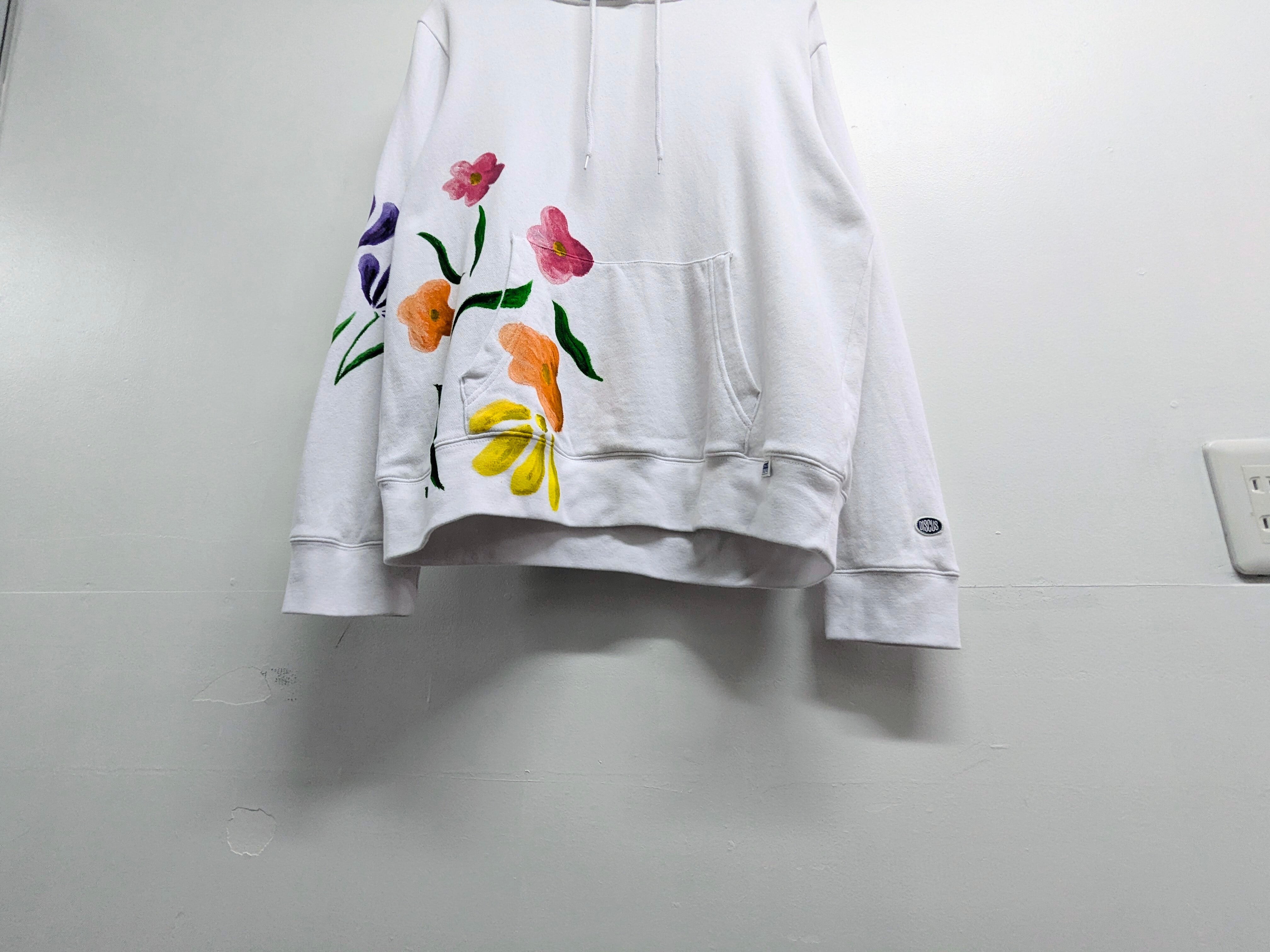 Discusのスウェットパーカーを使用しています。薄手で使い勝手のいい一着となっています。リアルな花柄のアートな絵がとても綺麗です。手描きのうえ、古着を使用しているので二度と手に入らない一点物となっています。気になるモノがあればこの機会に是非。