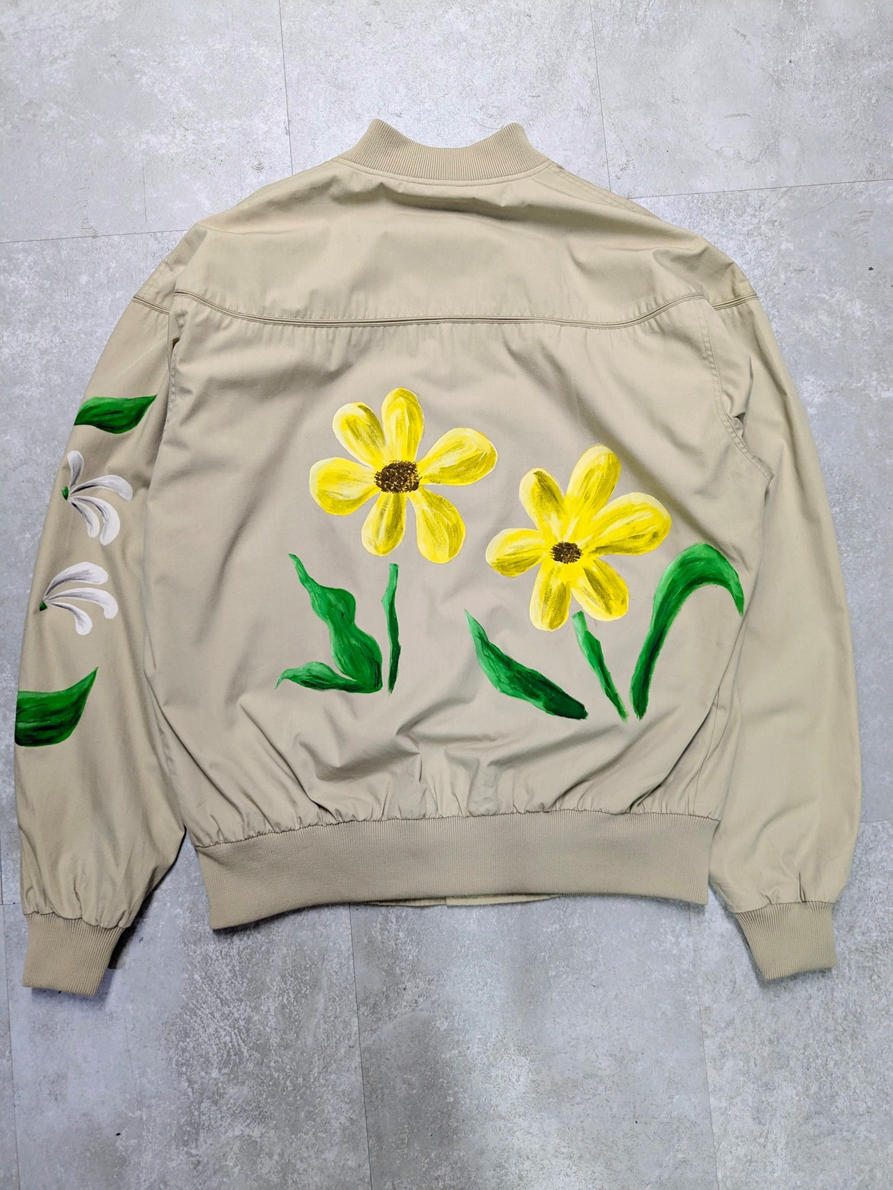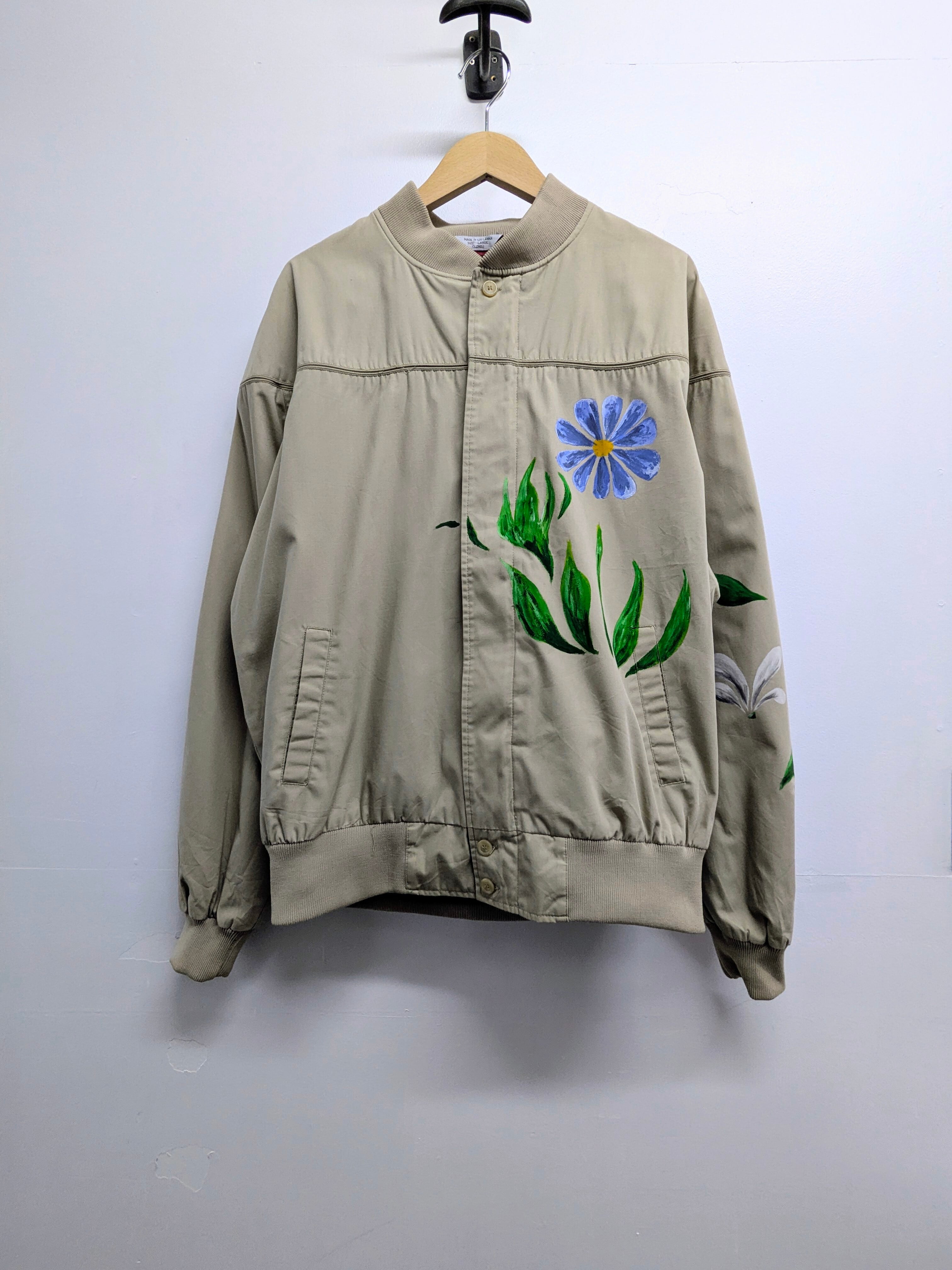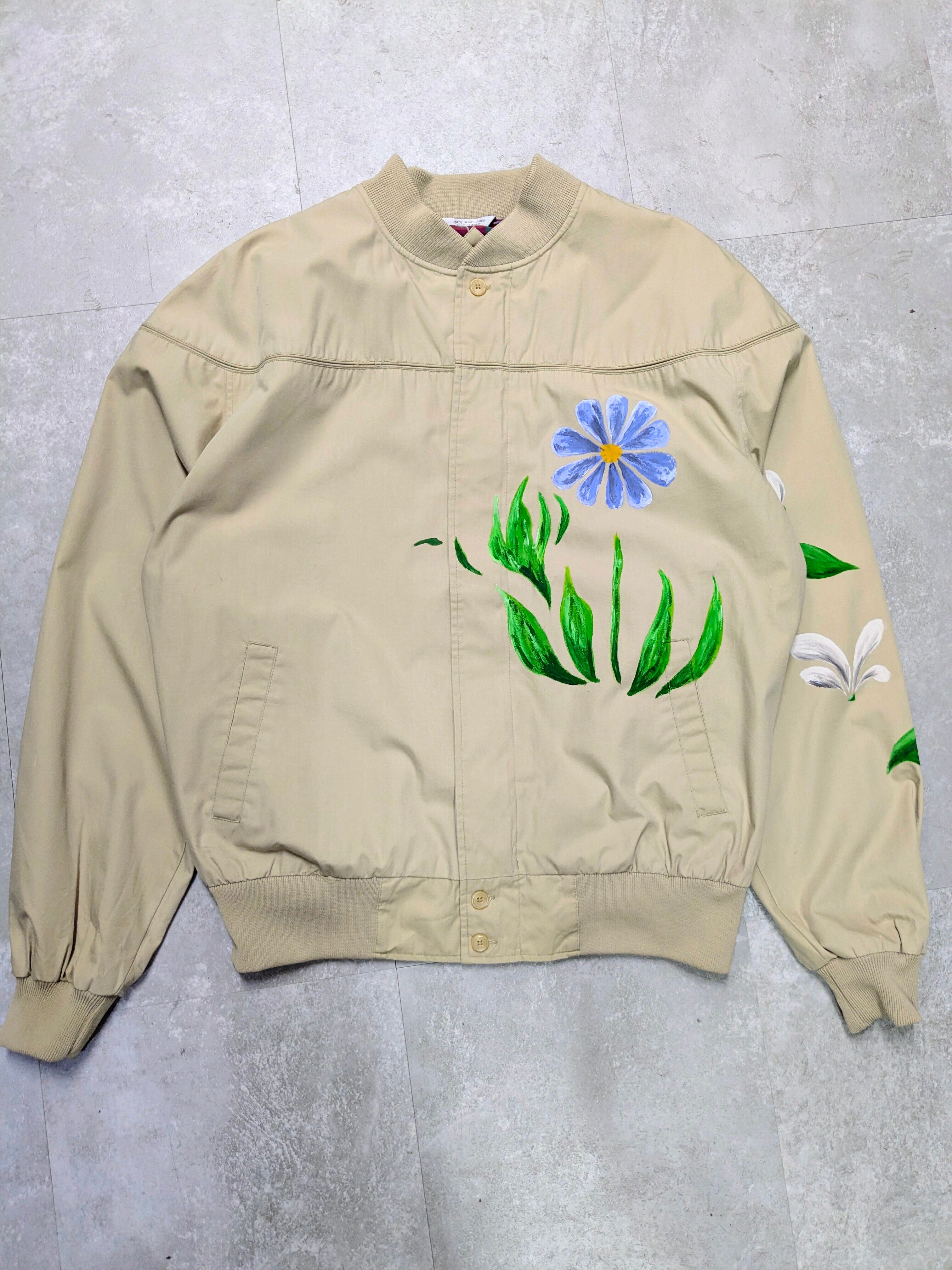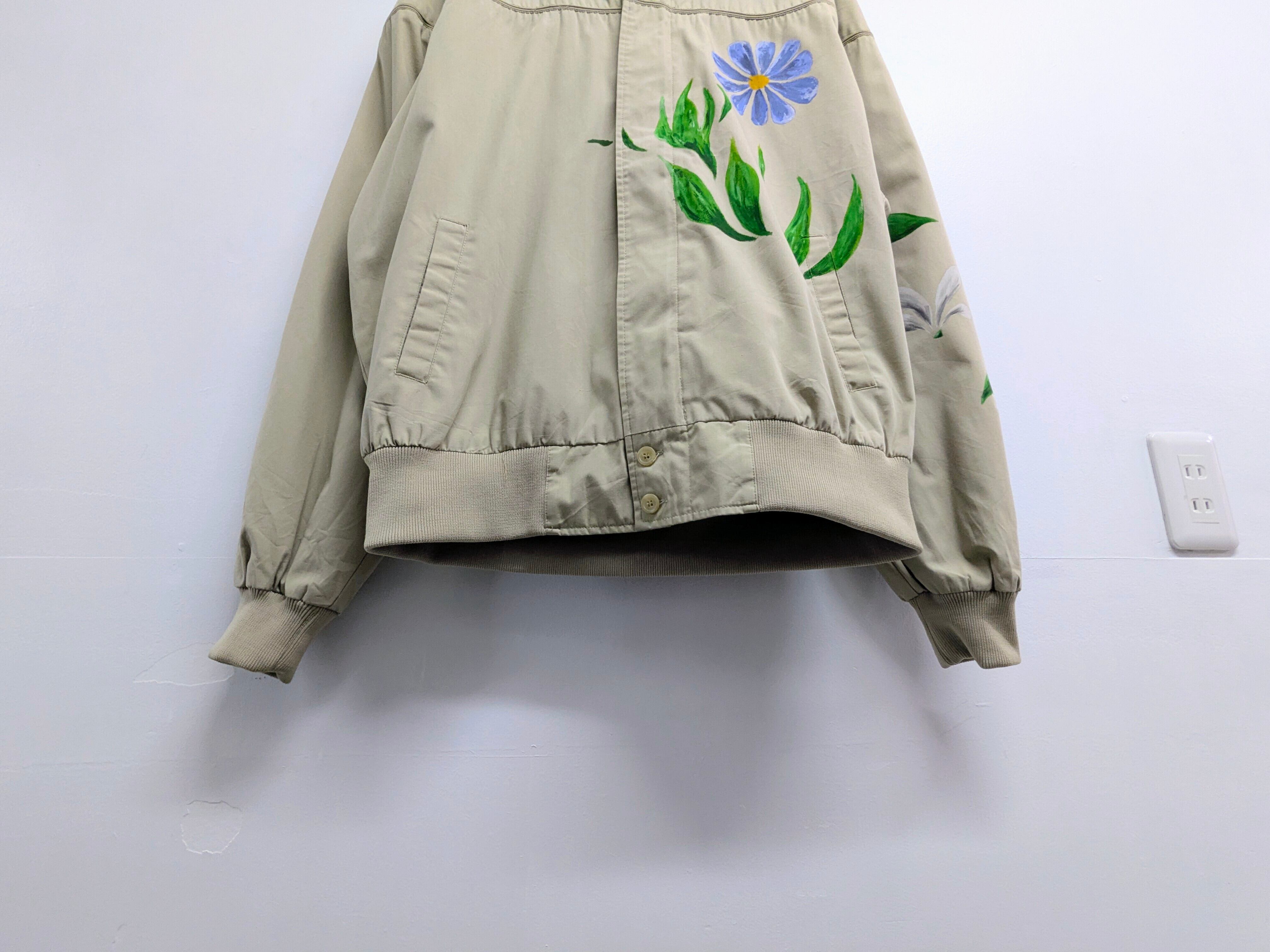 Field & Streamのダービージャケットを使用。カップショルダーのこの形好きな人多いのでは??これからの時期にちょうどいい一着。リアルな花柄のアートな絵がとても綺麗です。手描きのうえ、古着を使用しているので二度と手に入らない一点物となっています。気になるモノがあればこの機会に是非。汚れあり。