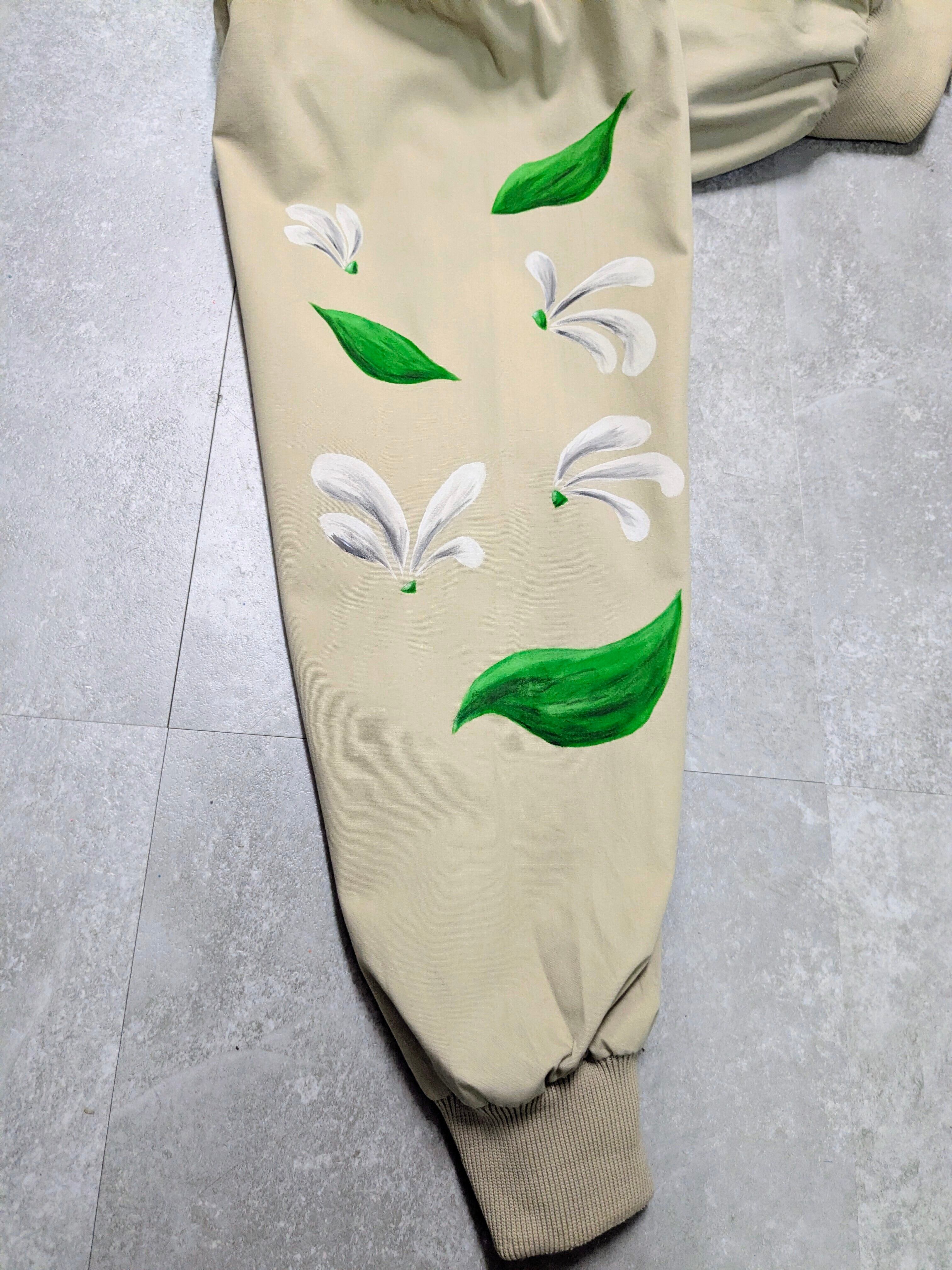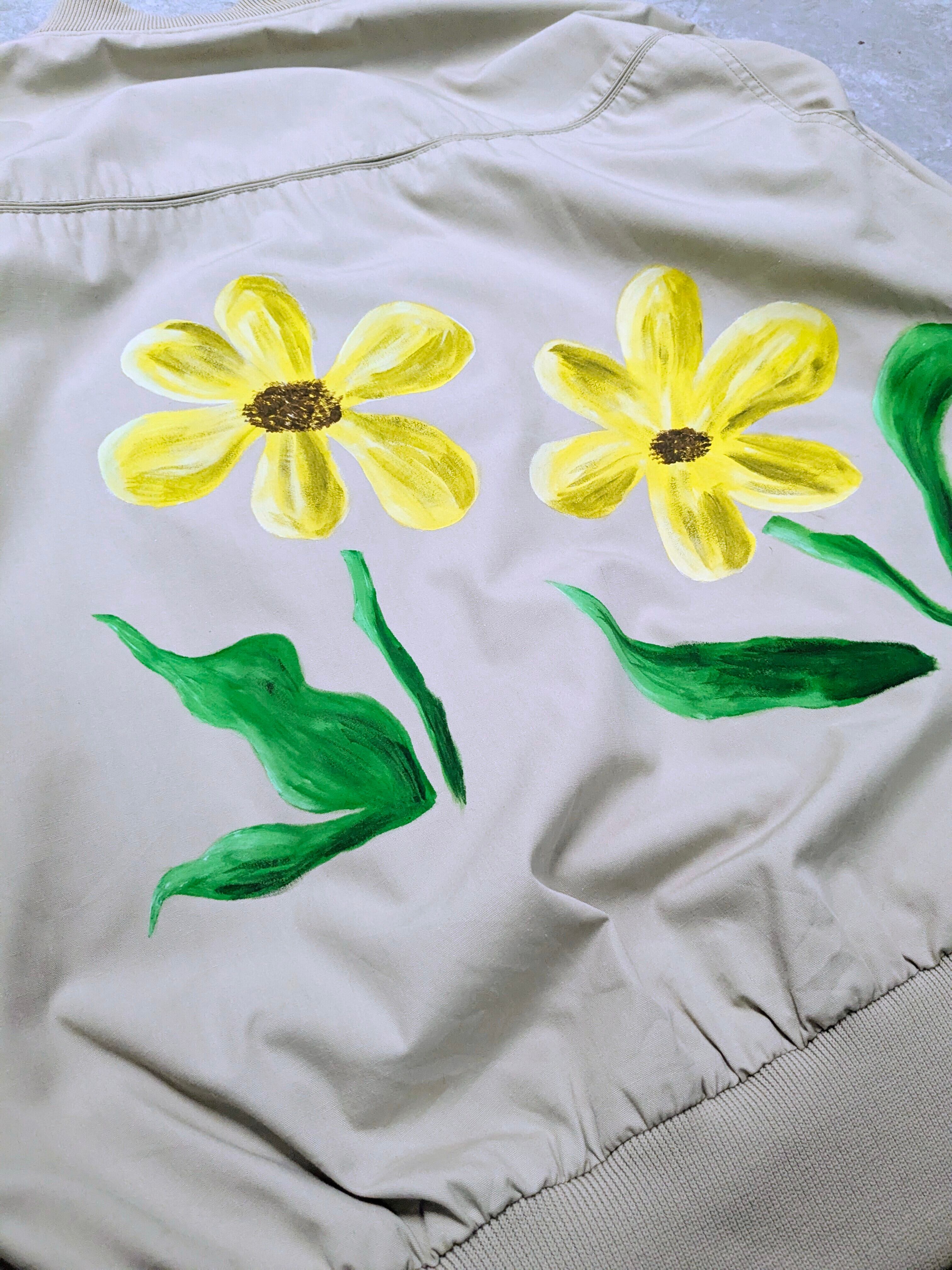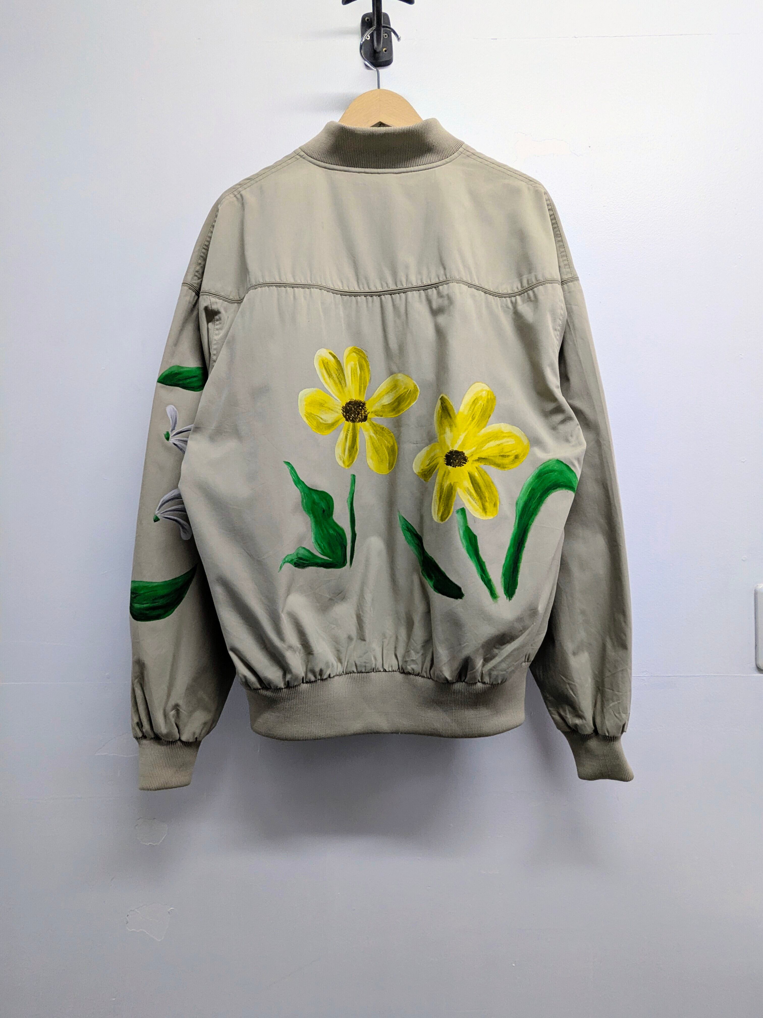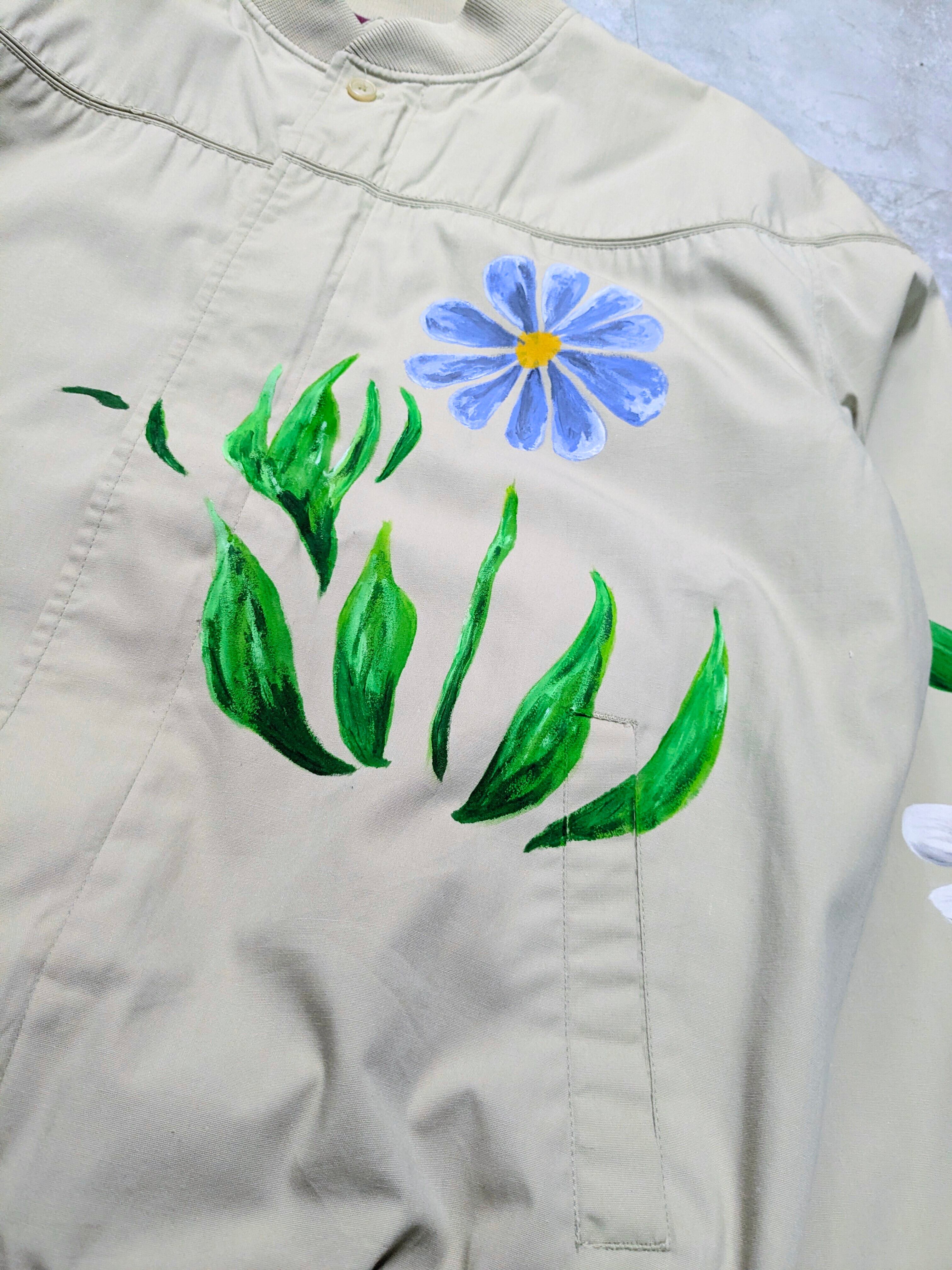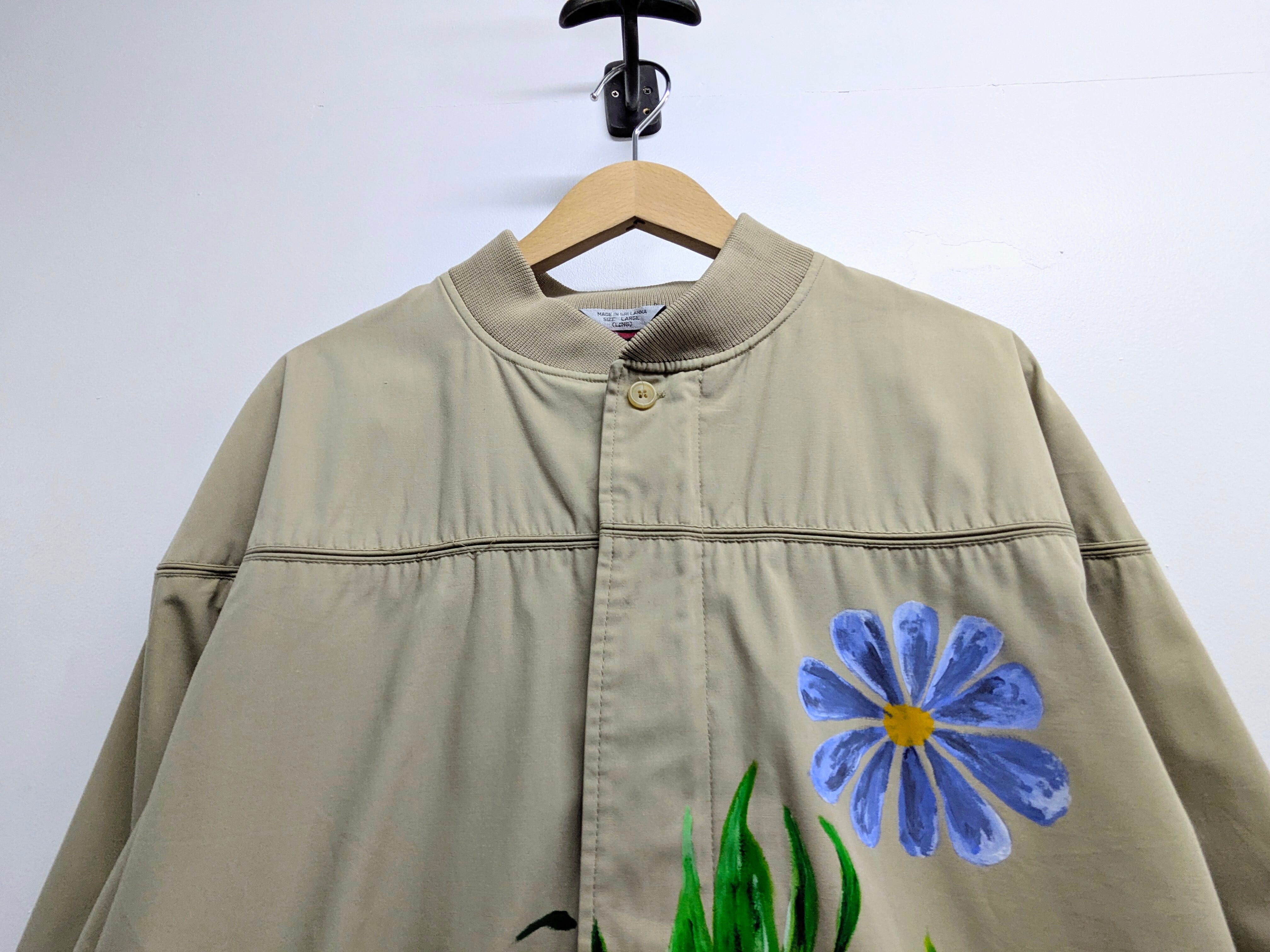 Field & Streamのダービージャケットを使用。カップショルダーのこの形好きな人多いのでは??これからの時期にちょうどいい一着。リアルな花柄のアートな絵がとても綺麗です。手描きのうえ、古着を使用しているので二度と手に入らない一点物となっています。気になるモノがあればこの機会に是非。汚れあり。