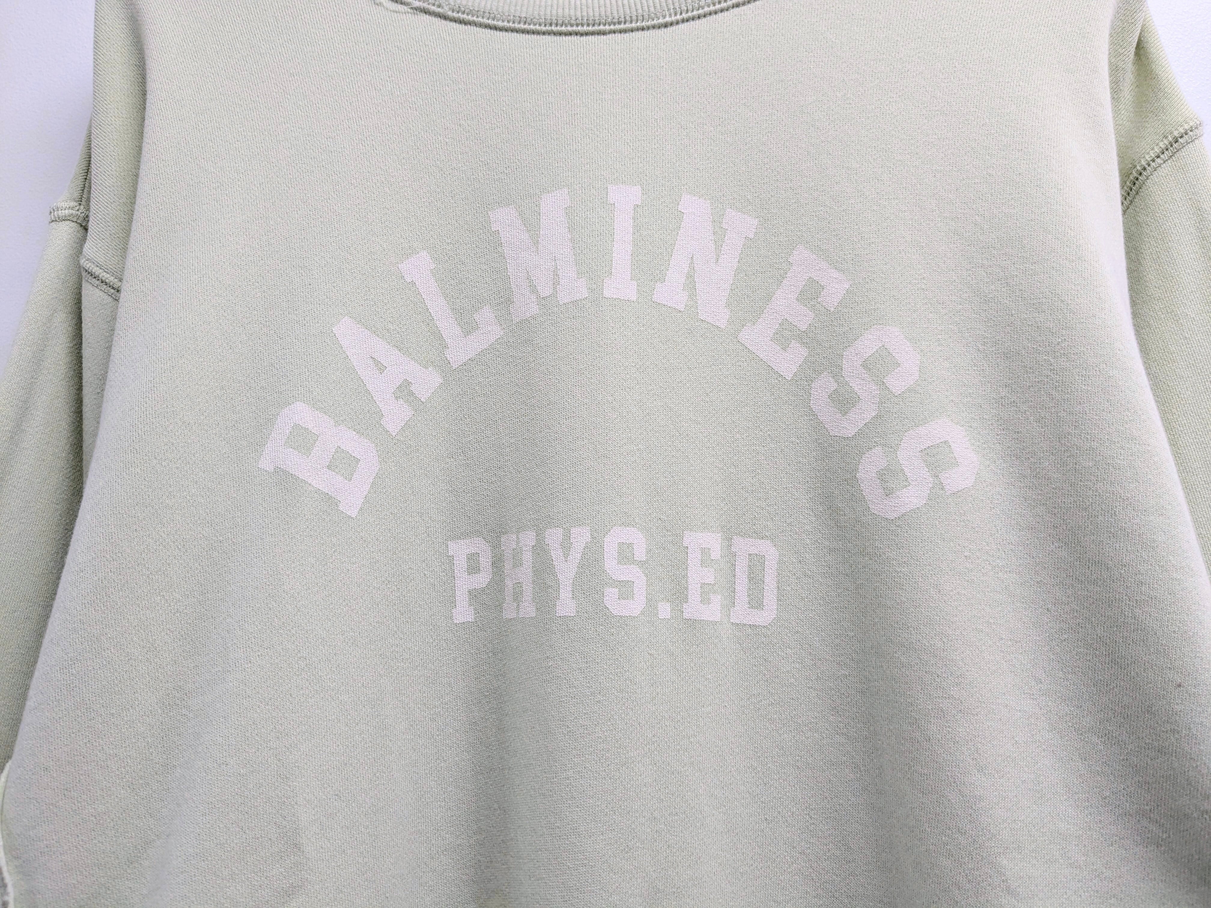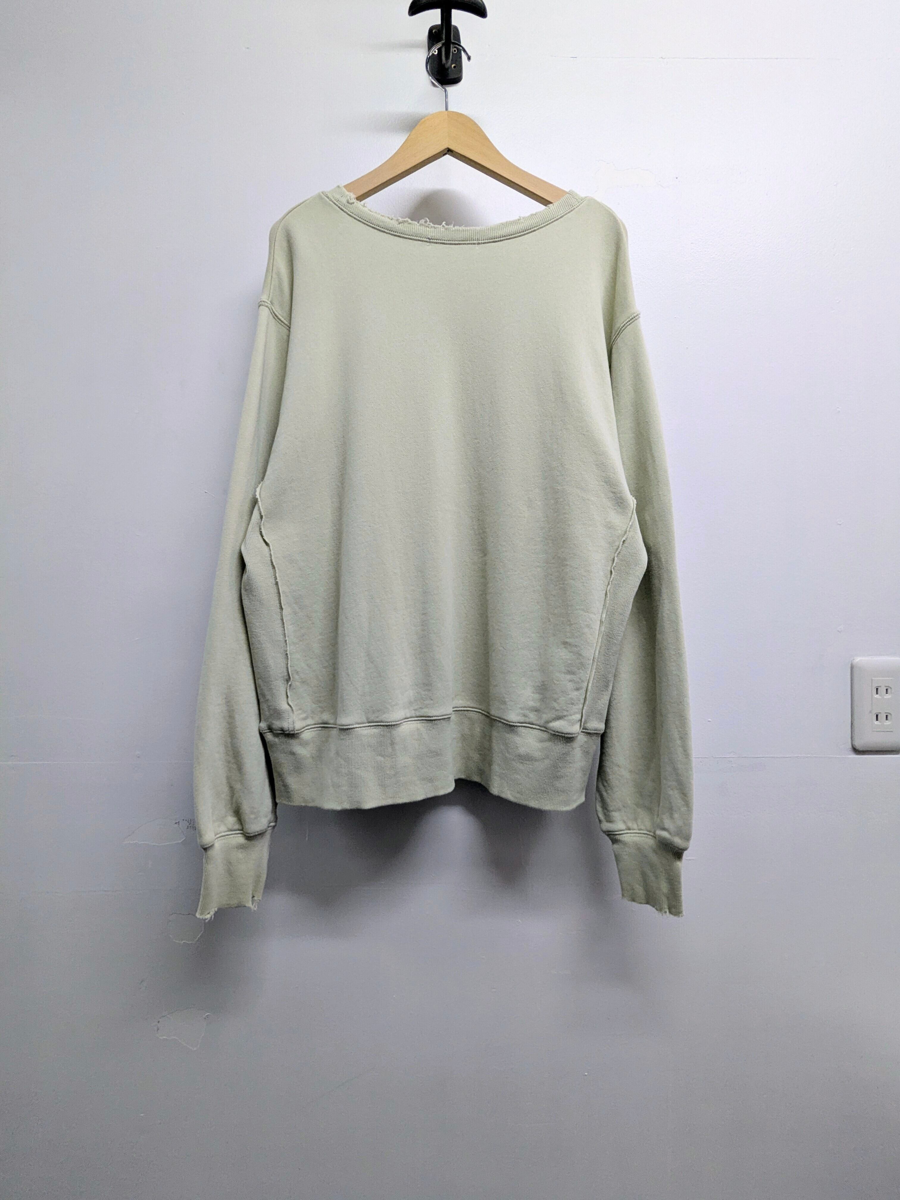 薄いライムグリーンのような綺麗な色のスウェット。生地感はかなり薄く、長期的にお使いいただけます。襟、袖などに適度にダメージが入っています。