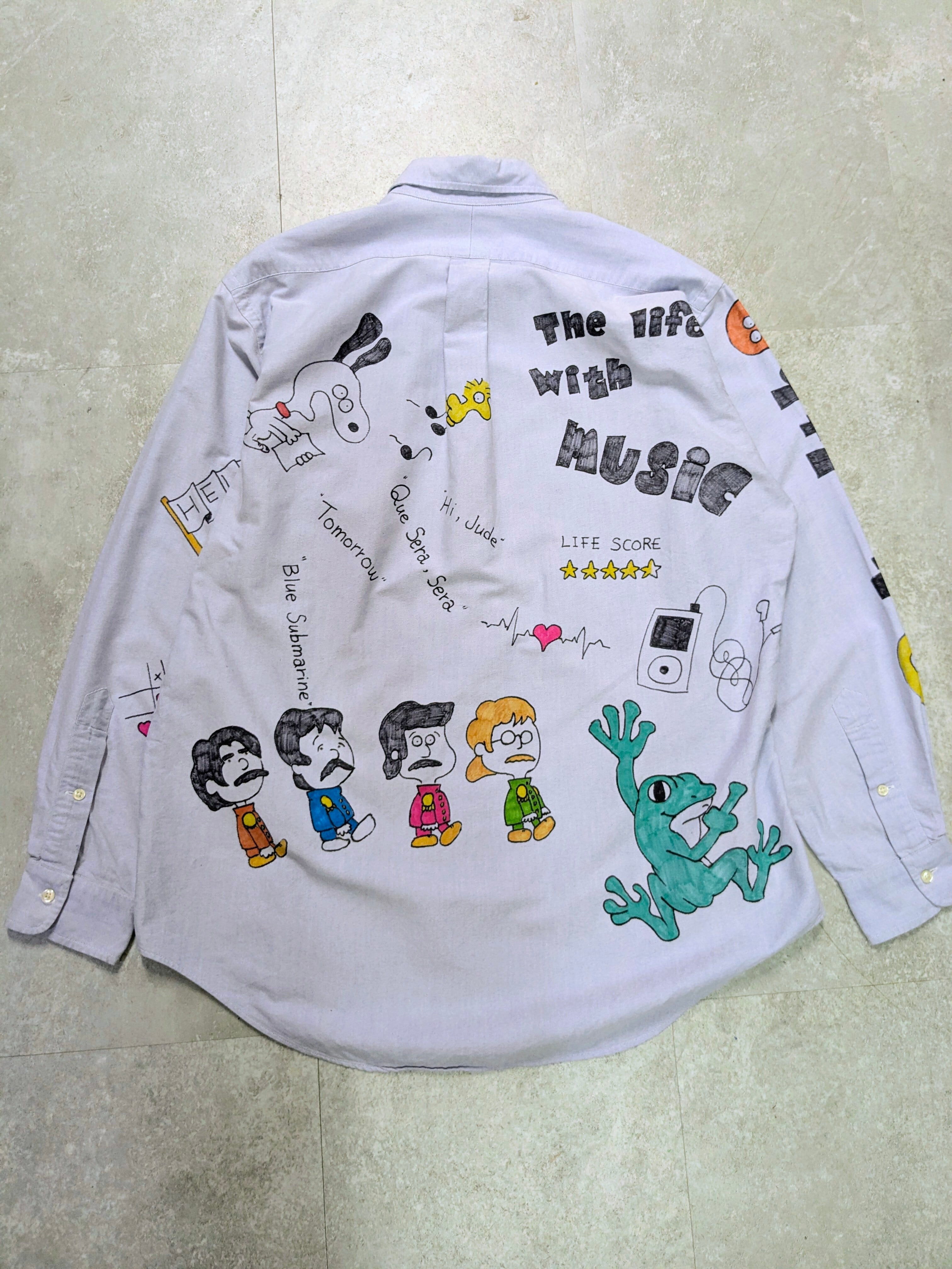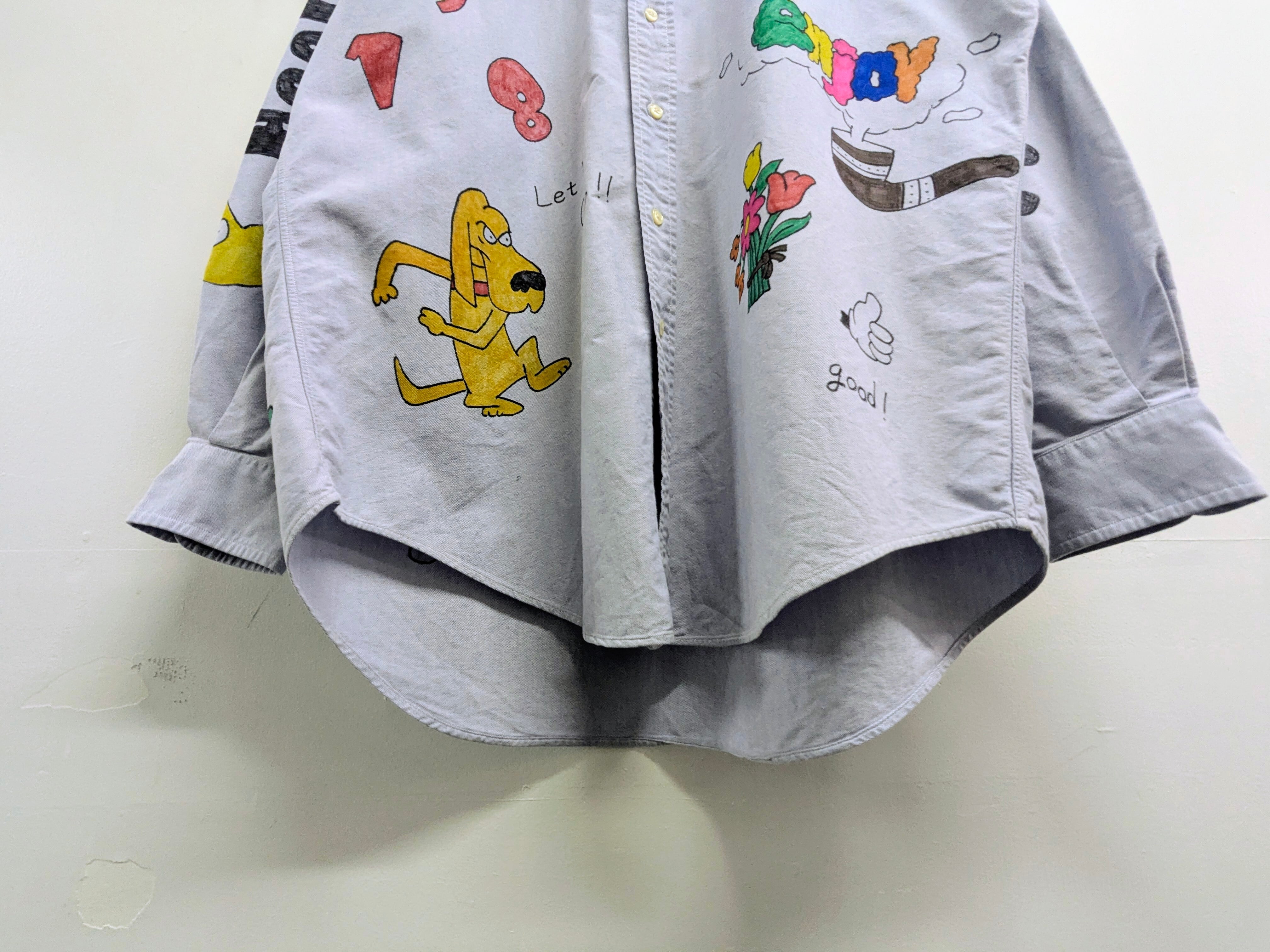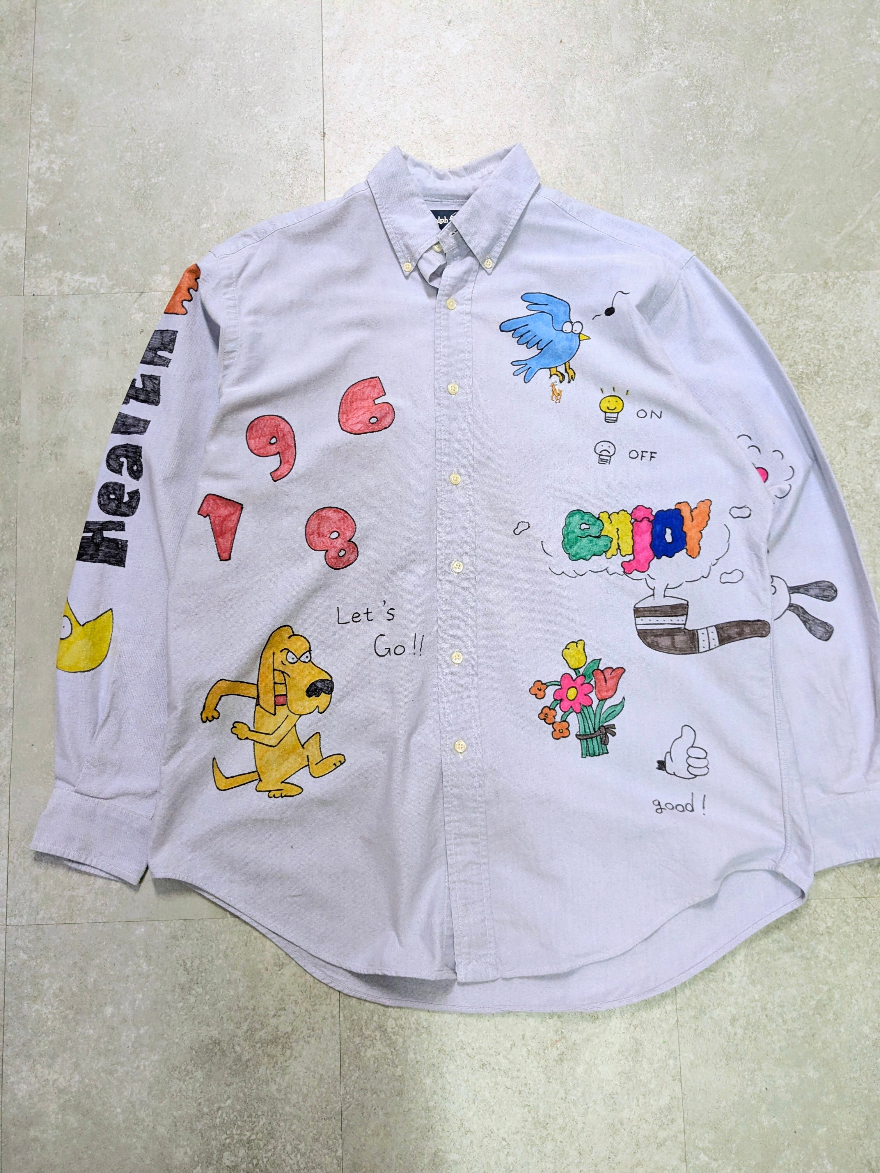 定番で人気のラルフローレンのオックスシャツにイラストを加えております。メモリアル要素もありつつ、どこか見たことあるようなキャラクターがいたりととても可愛いアイテム。ユーズドアイテム使用、手描きのため唯一無二の一点物となっています。