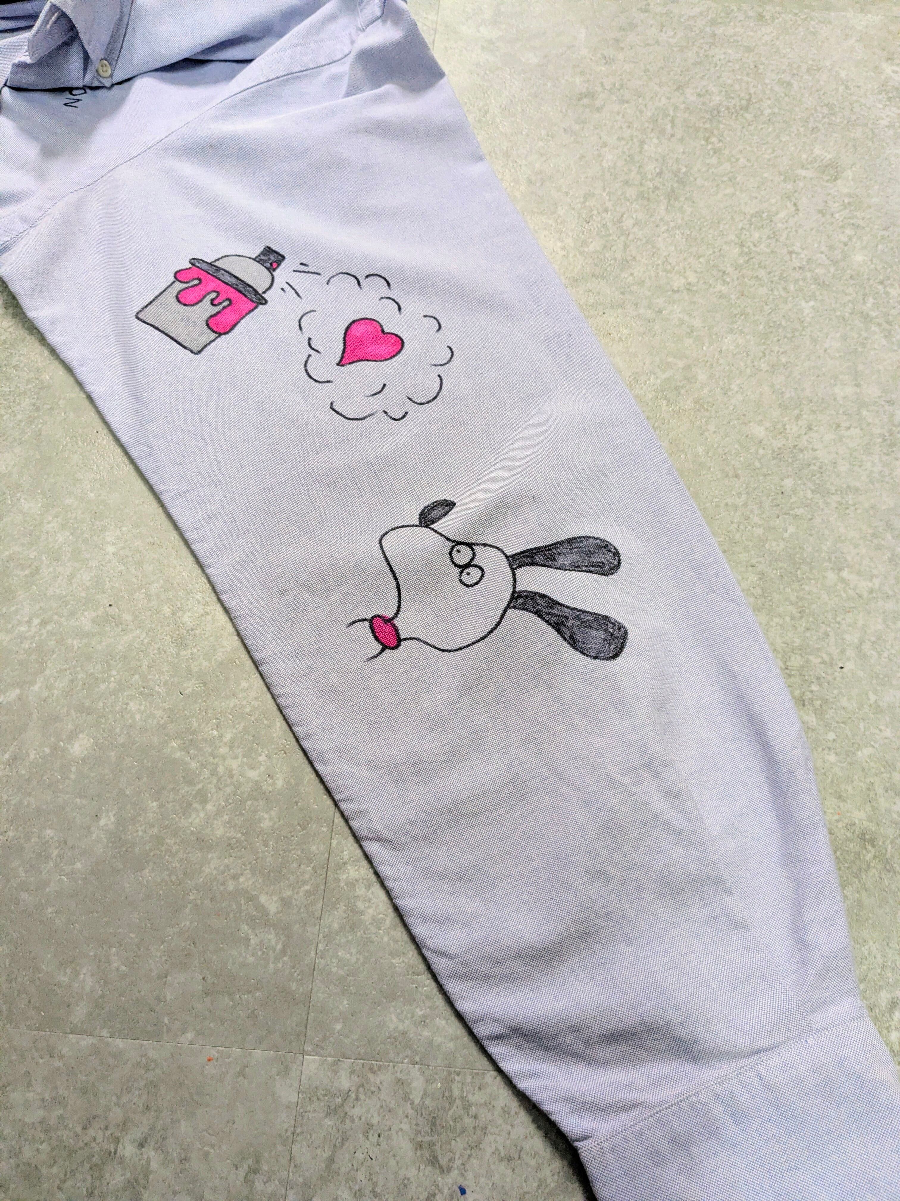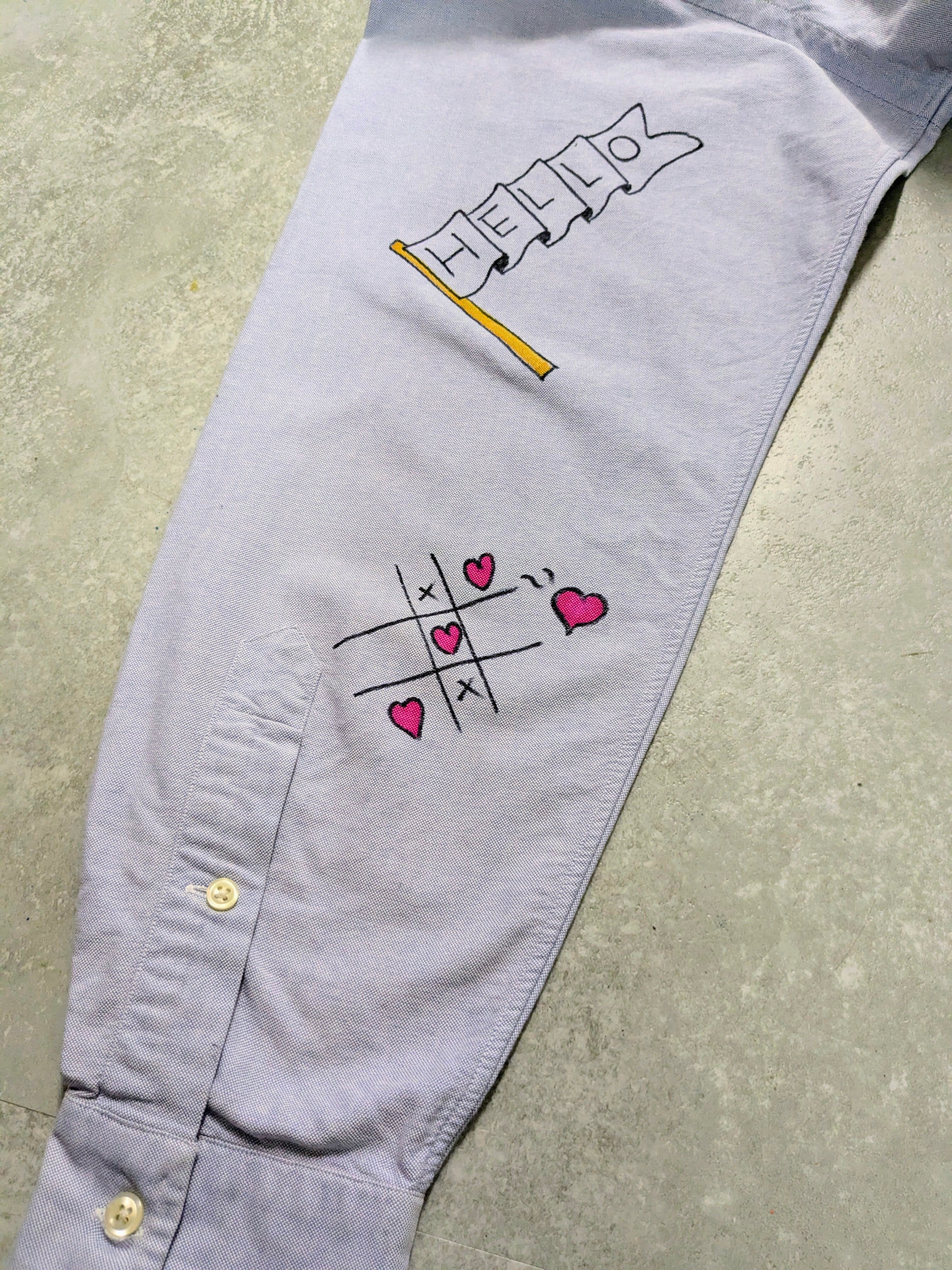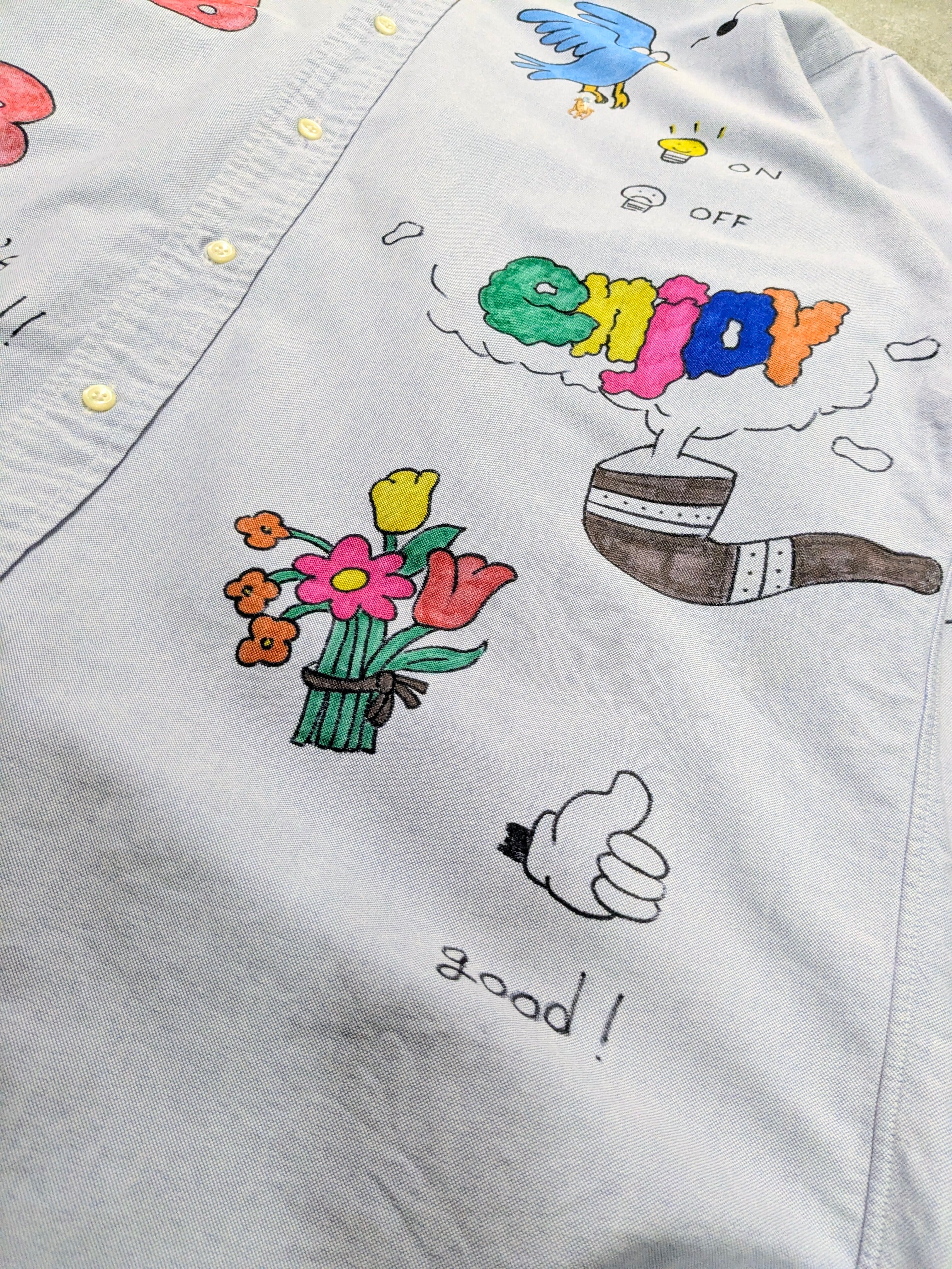 定番で人気のラルフローレンのオックスシャツにイラストを加えております。メモリアル要素もありつつ、どこか見たことあるようなキャラクターがいたりととても可愛いアイテム。ユーズドアイテム使用、手描きのため唯一無二の一点物となっています。