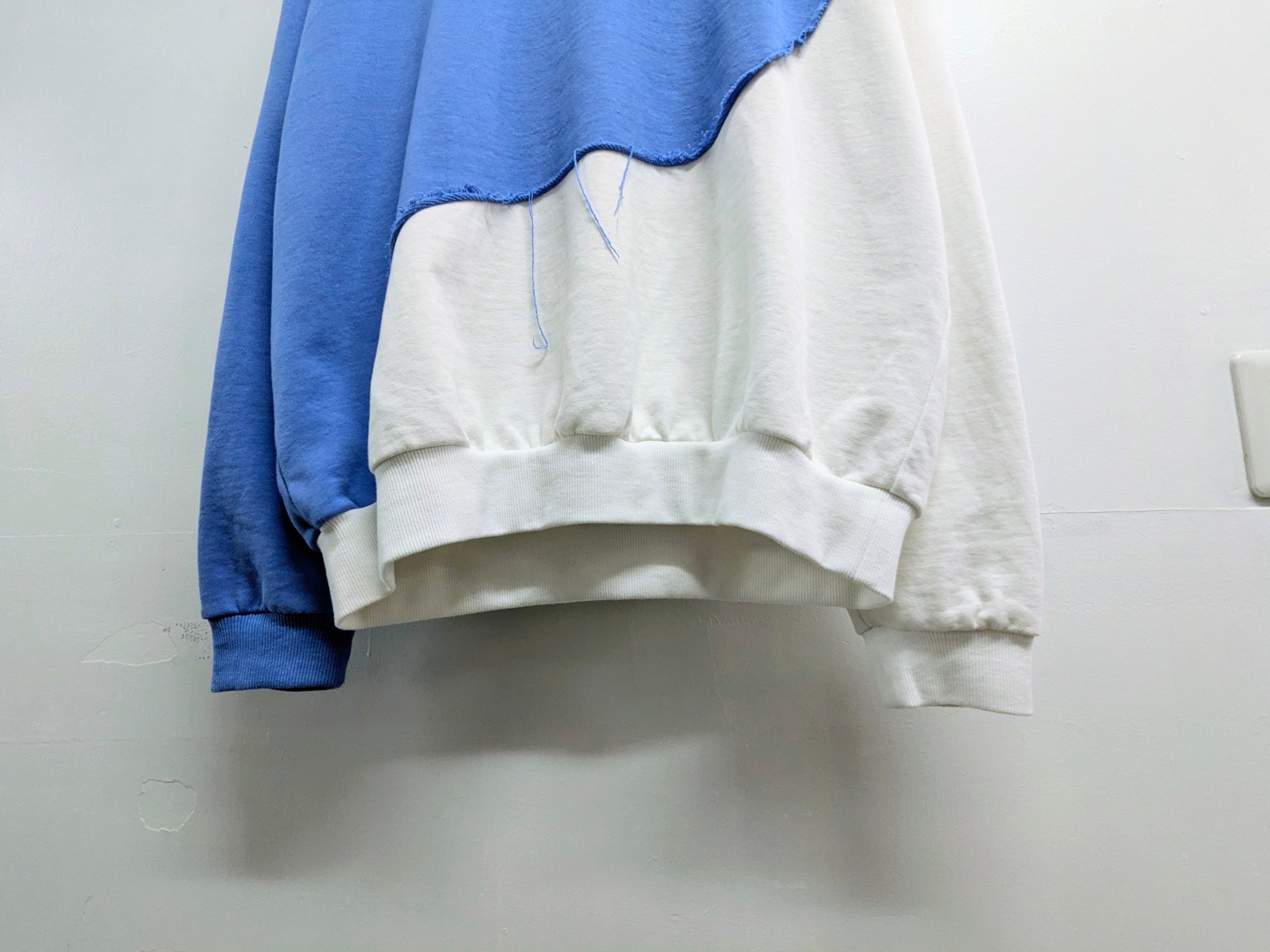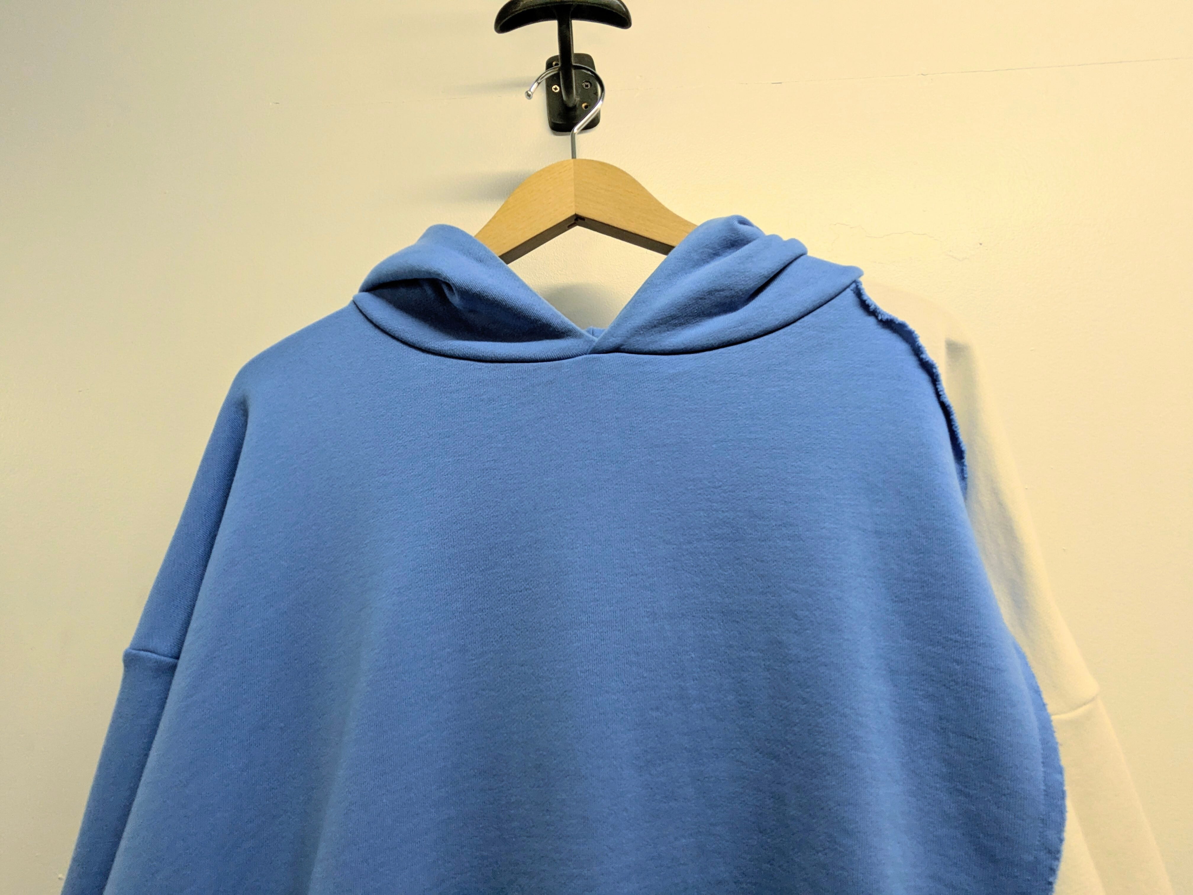 切り替わったデザインのスウェットパーカー。再構築かと思いきやの、白のボディの上から青の部分がのせてあります。ただ、フード部分などはどうなっているのかちょっと分からない複雑なデザイン。