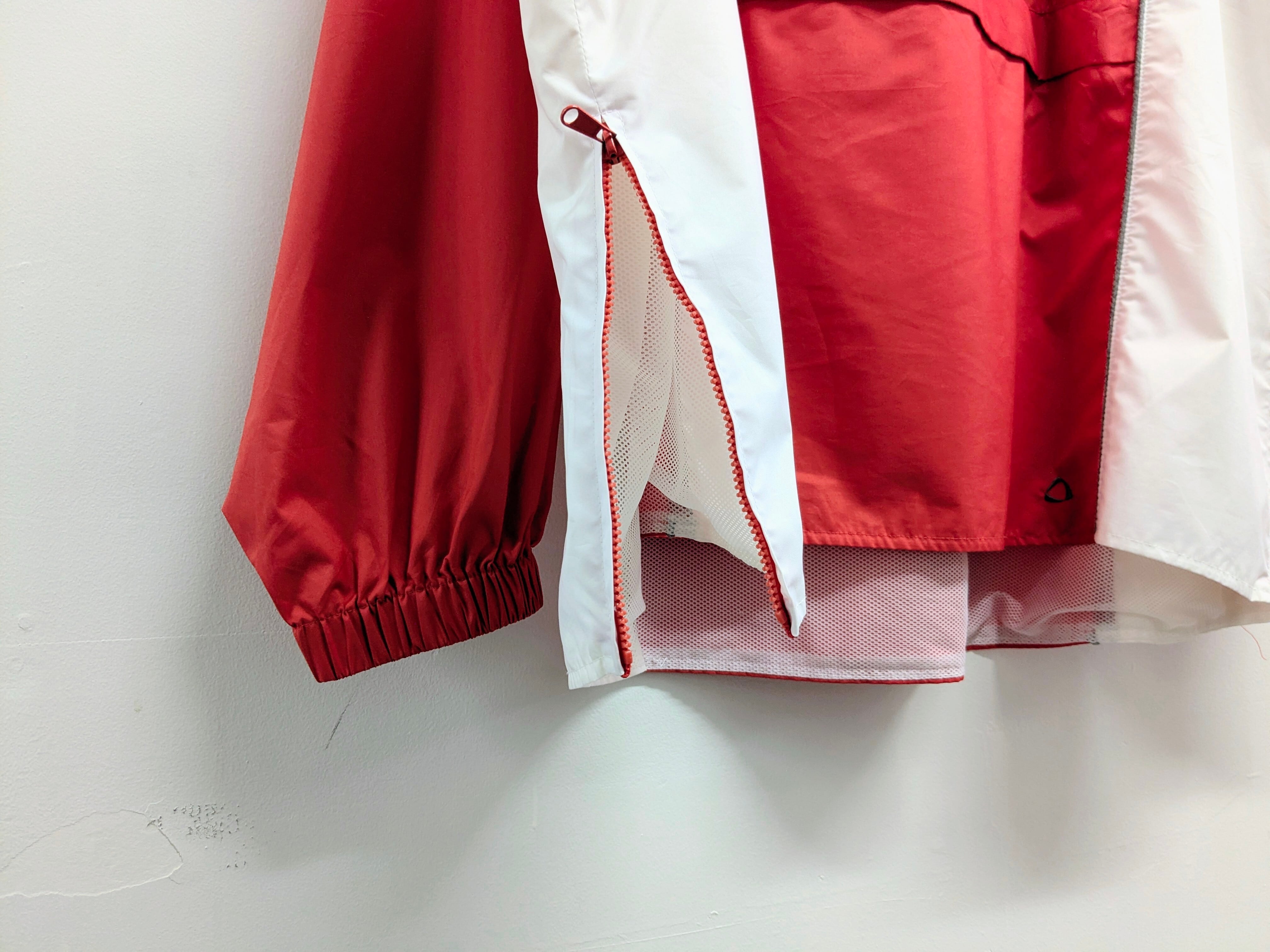 とても綺麗な色合いのアノラックパーカー。とても軽く、柔らかい素材で着やすい一着。大きめのカンガルーポケットがあります。裾は両サイドジップになっており、スリットとして開閉が可能です。裏地はメッシュになっていますので、ベタついたりせず快適に着ていただけます。