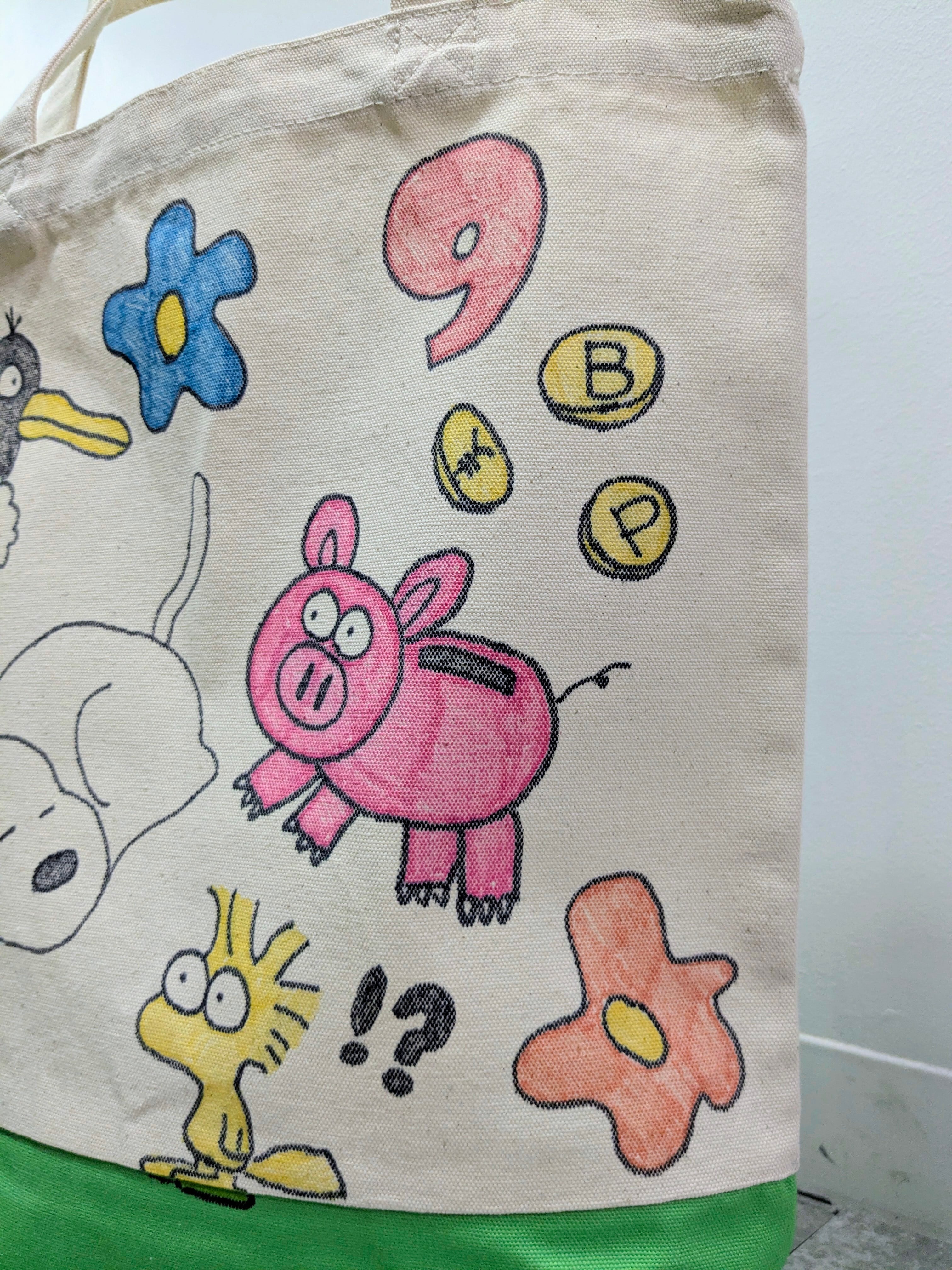 キャンバスのトートバッグにイラストを加えています。メモリアルの要素があり、どこか見たことあるキャラクターがいたりと、とにかく可愛いアイテム。全て手作業になるので、唯一無二の一点物となります。