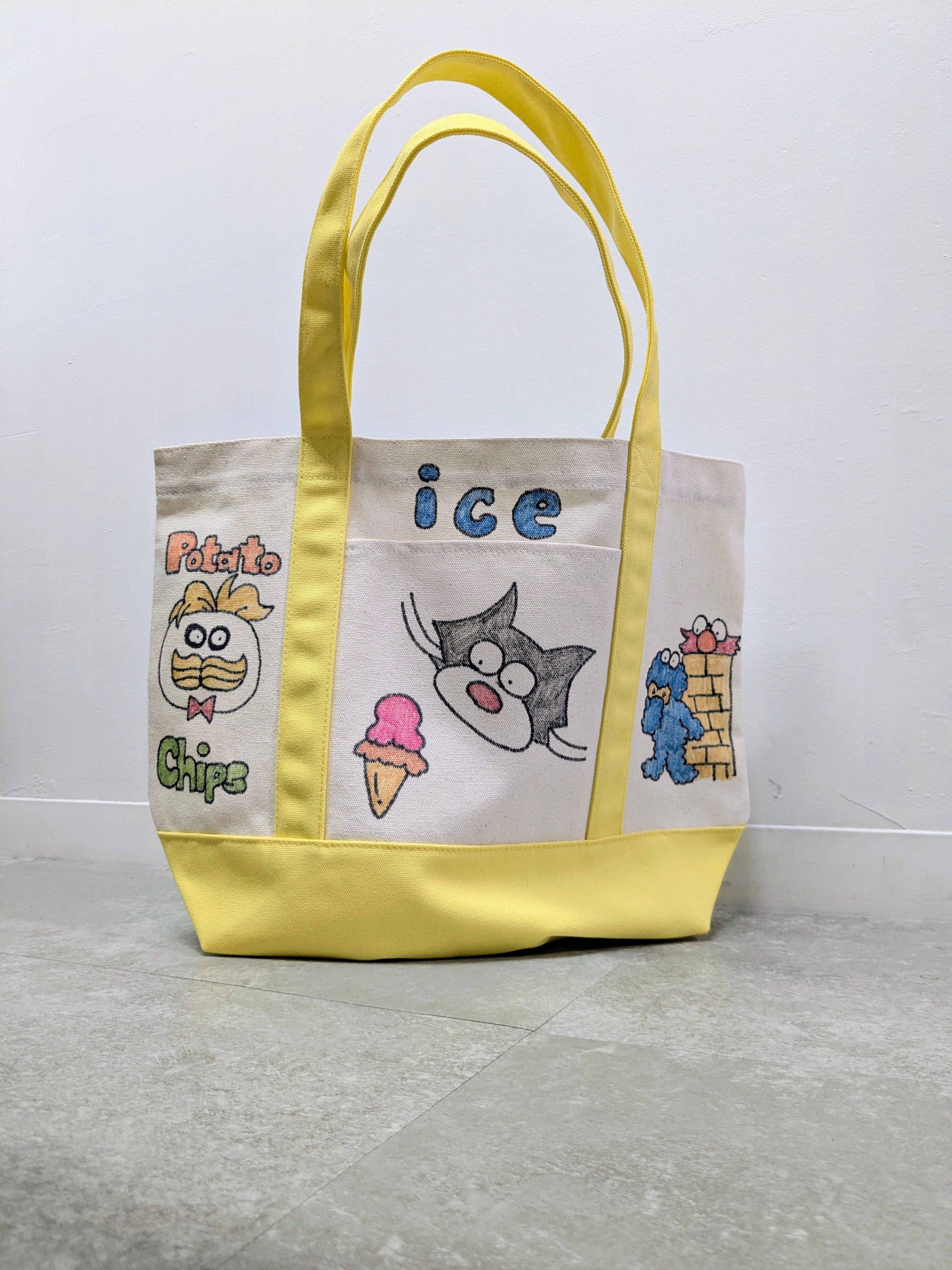 キャンバスのトートバッグにイラストを加えています。メモリアルの要素があり、どこか見たことあるキャラクターがいたりと、とにかく可愛いアイテム。全て手作業になるので、唯一無二の一点物となります。