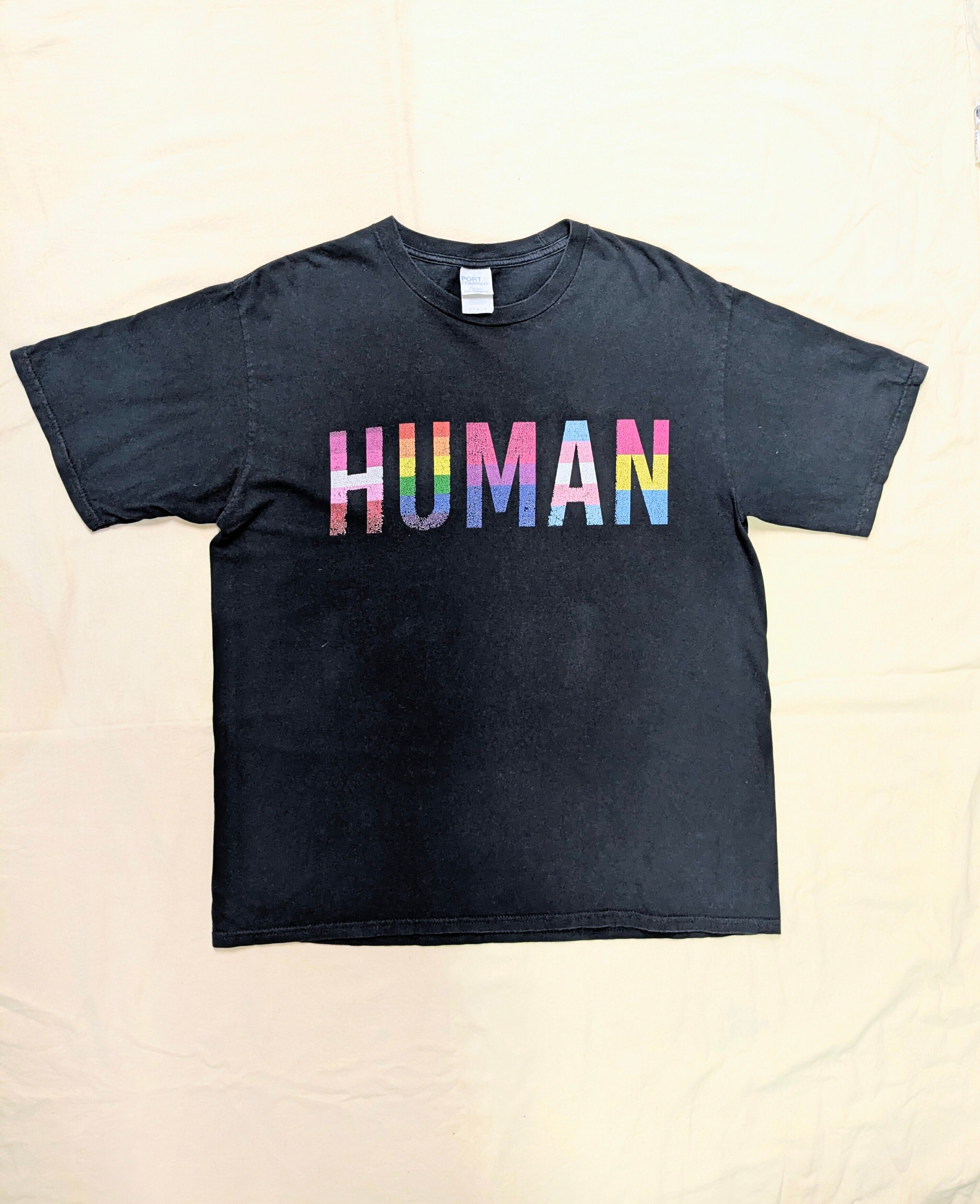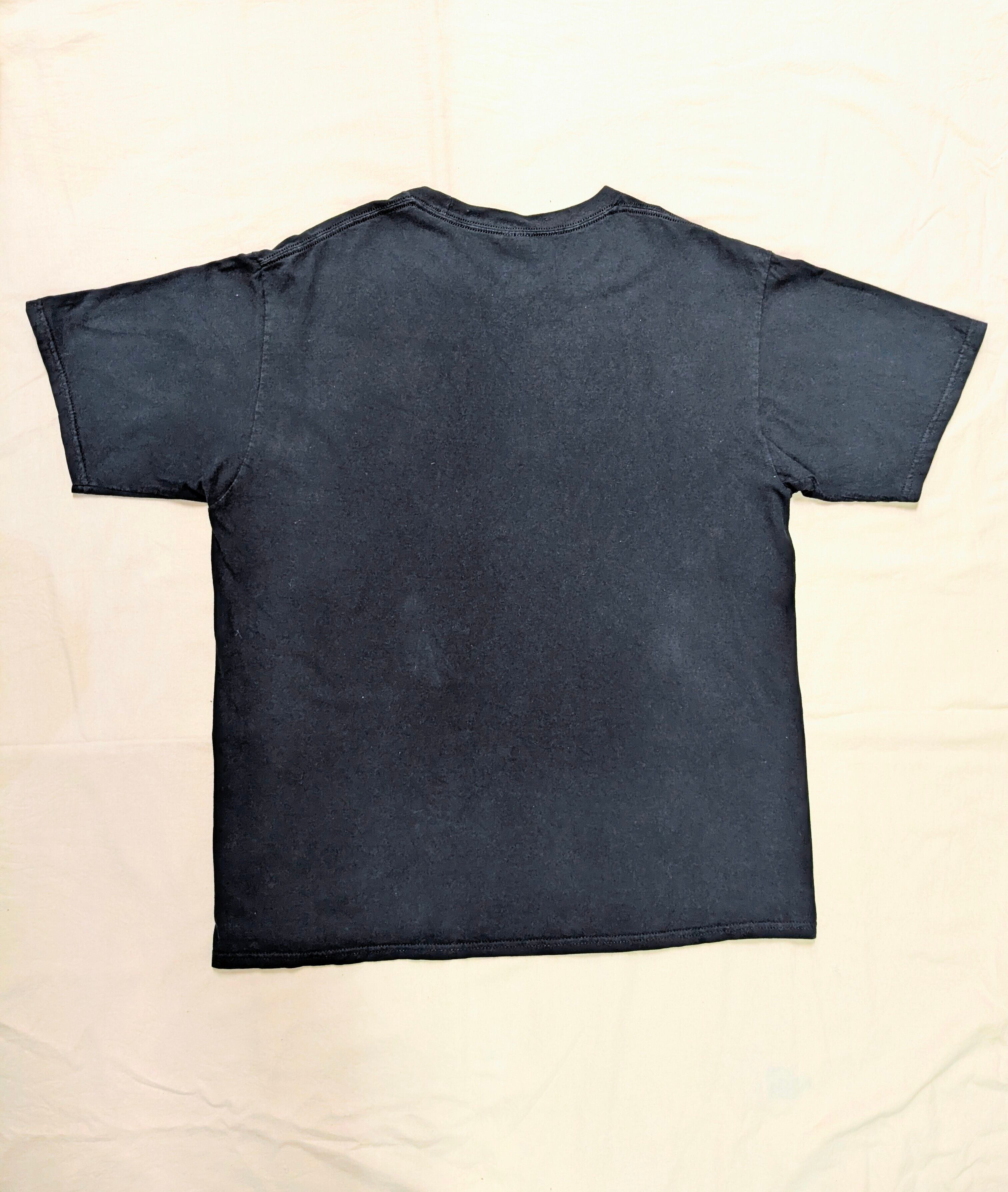 どこかの国旗の色合いにも見える、カラフルなロゴプリントTシャツ。プリントのクラック感、全体の色褪せ感など雰囲気がいいTシャツ。インナーでも、1枚着でも活躍する一着。