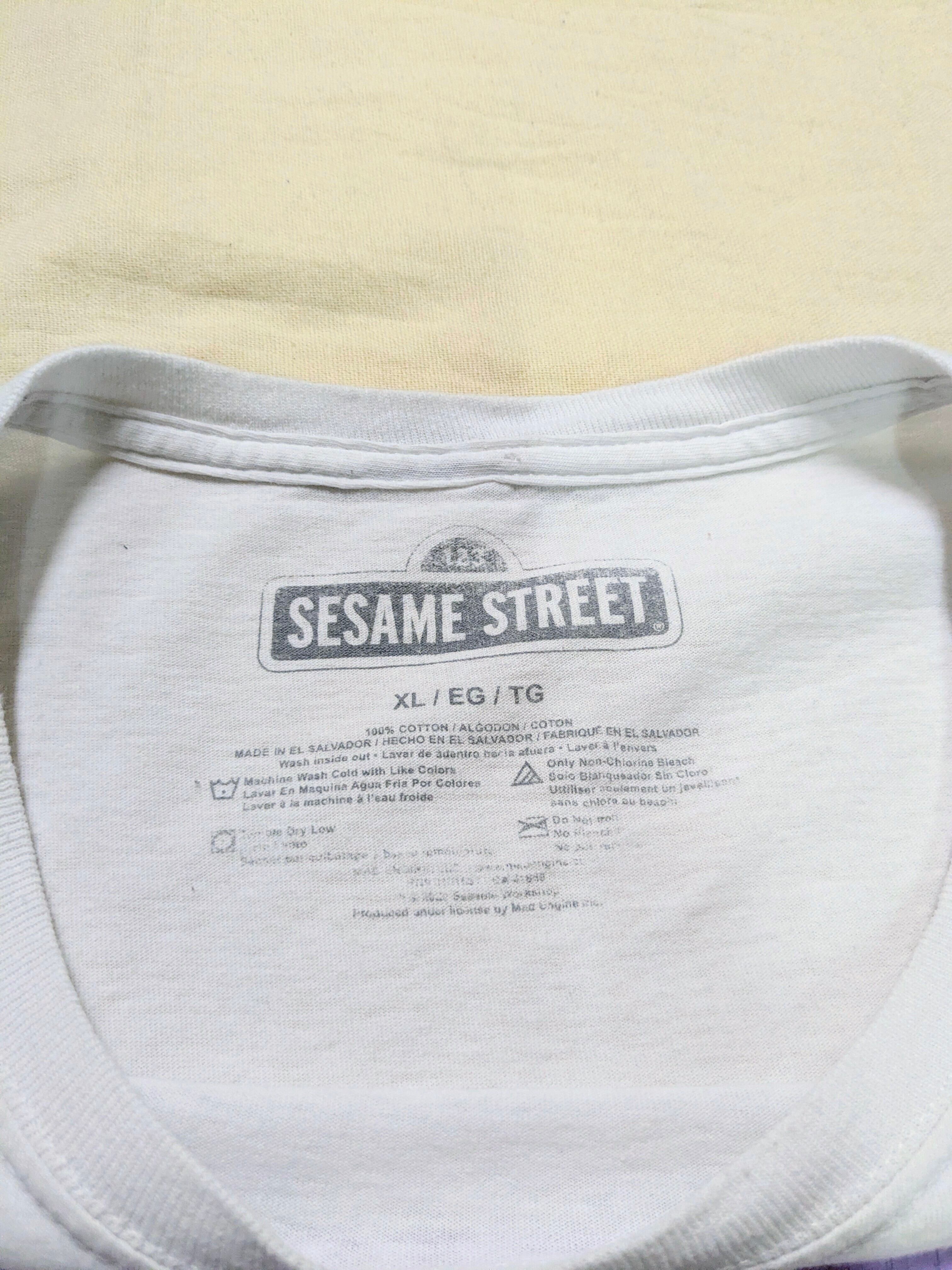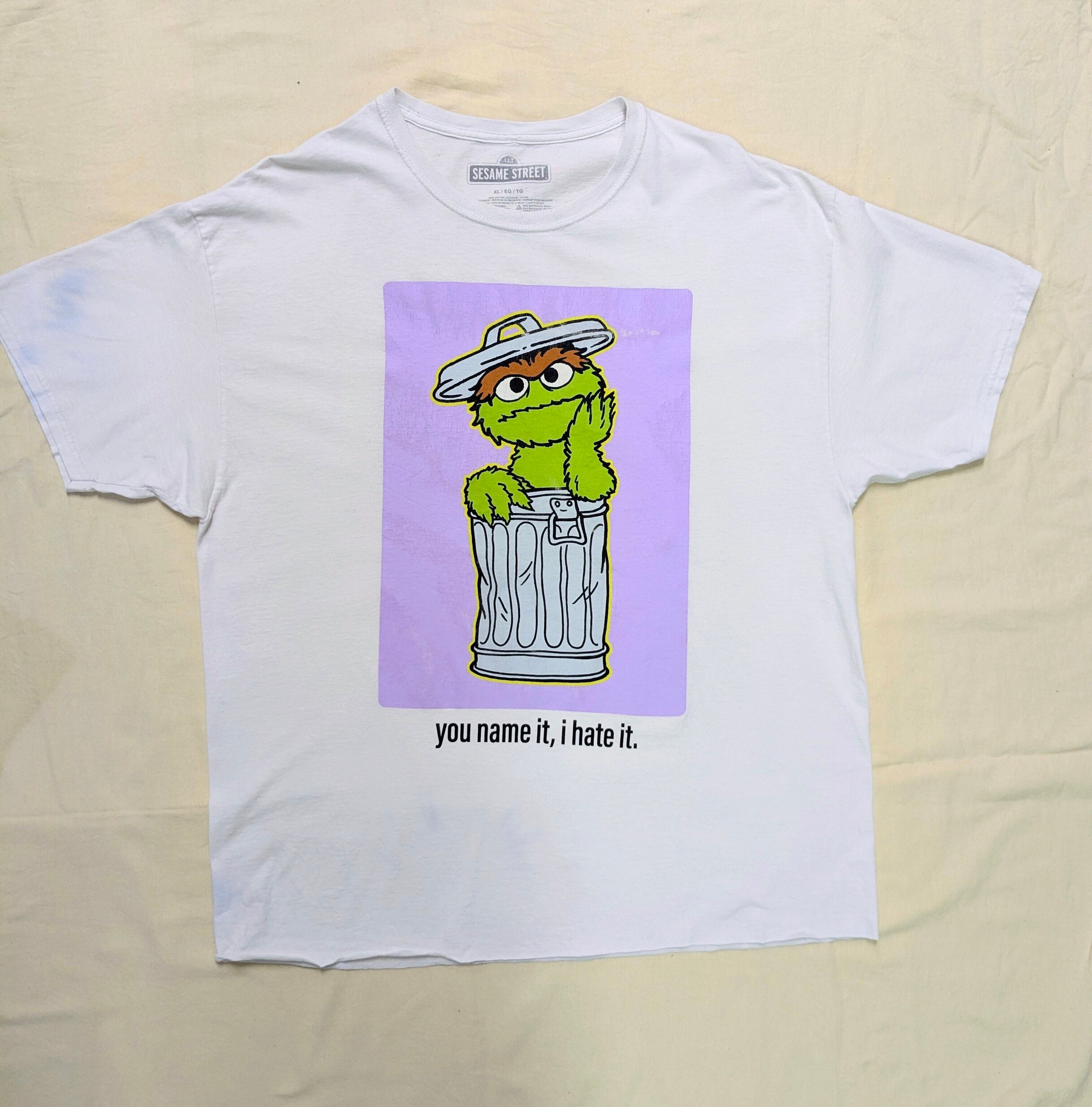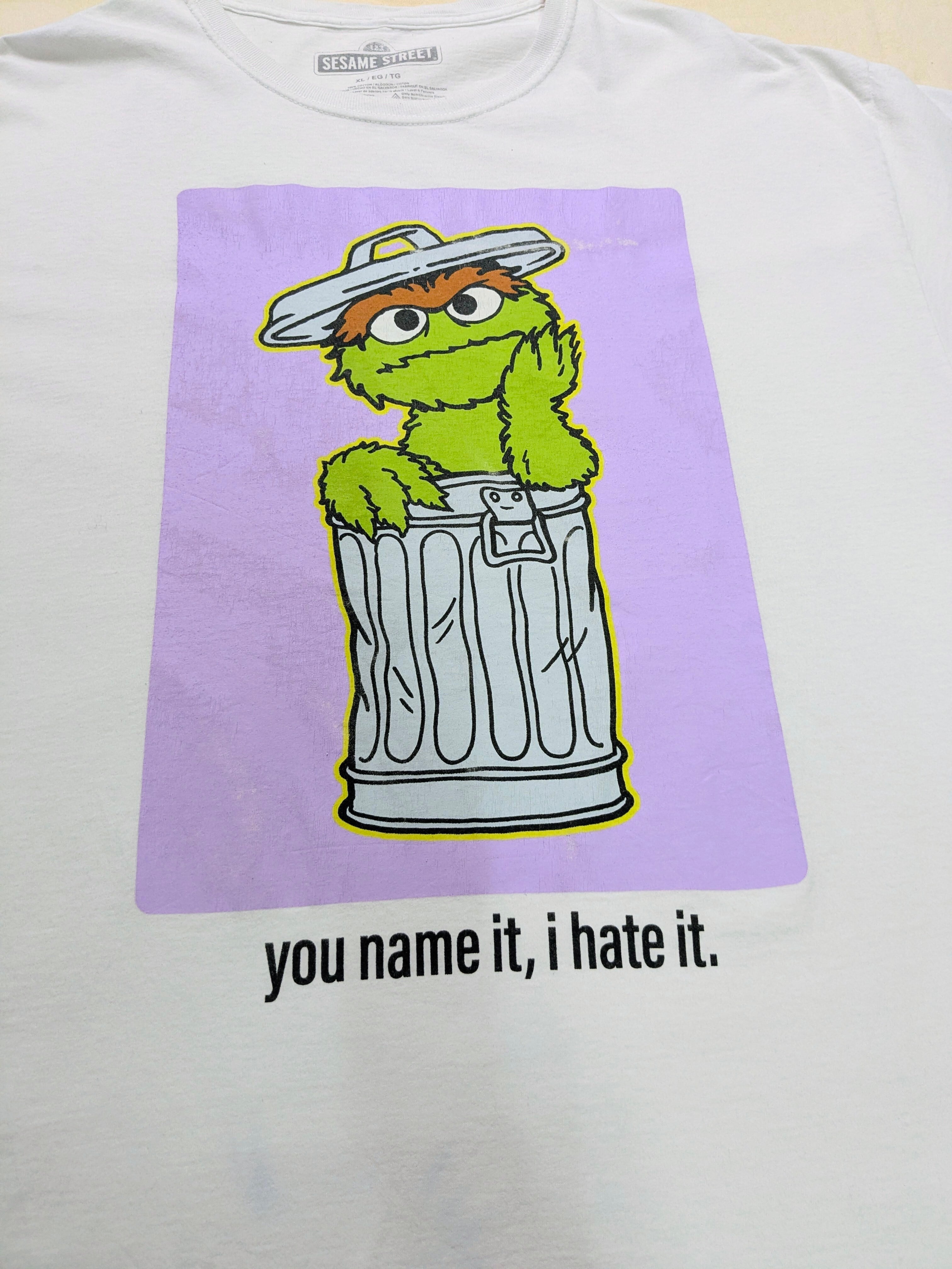 セサミストリートのオスカープリントTシャツ。プリントのクラック感が可愛さを中和して単純にTシャツとしてカッコよくなっています。裾は切りっぱなしになっており、着丈が短くなっています。部分的に移染あり。