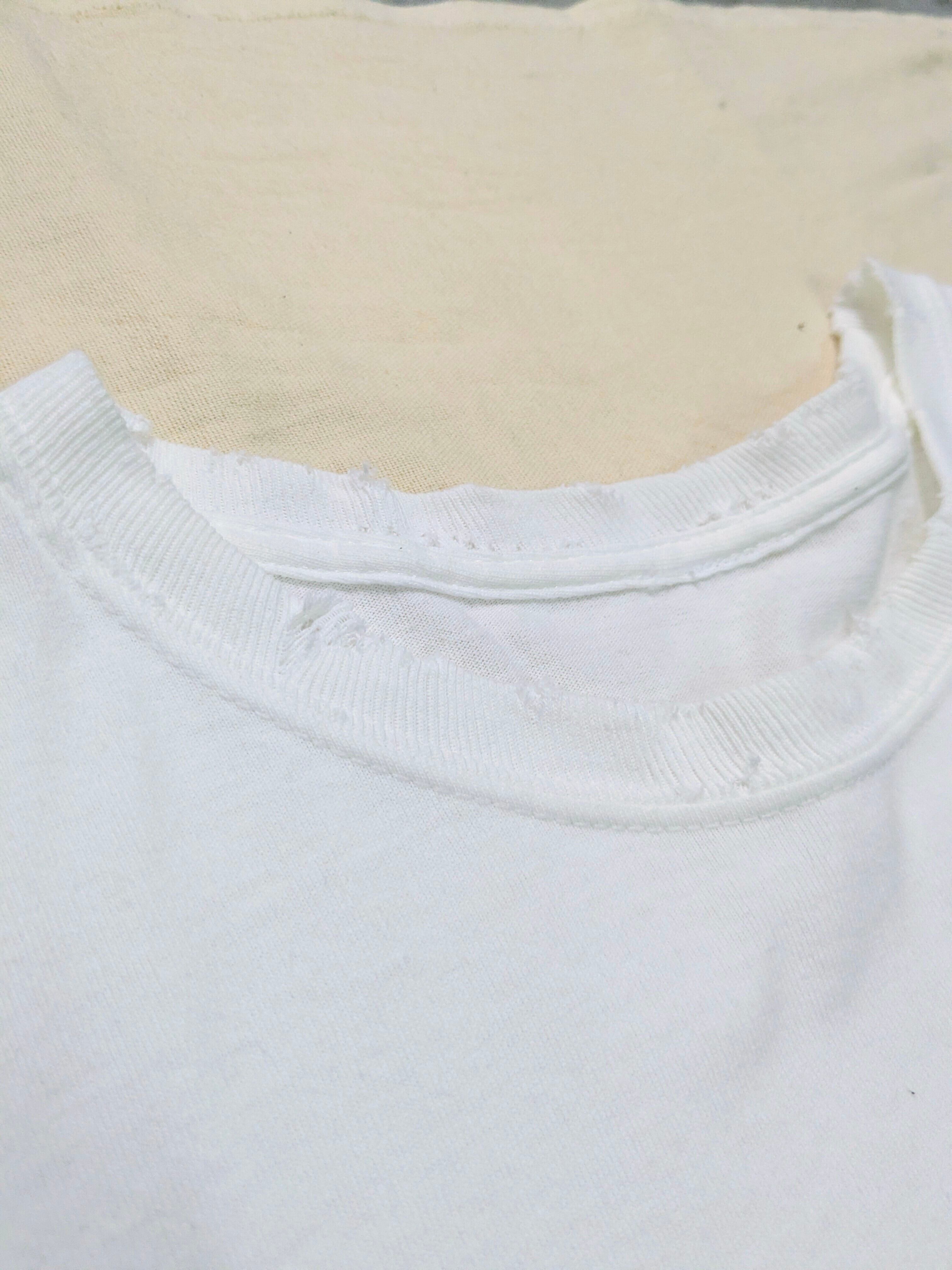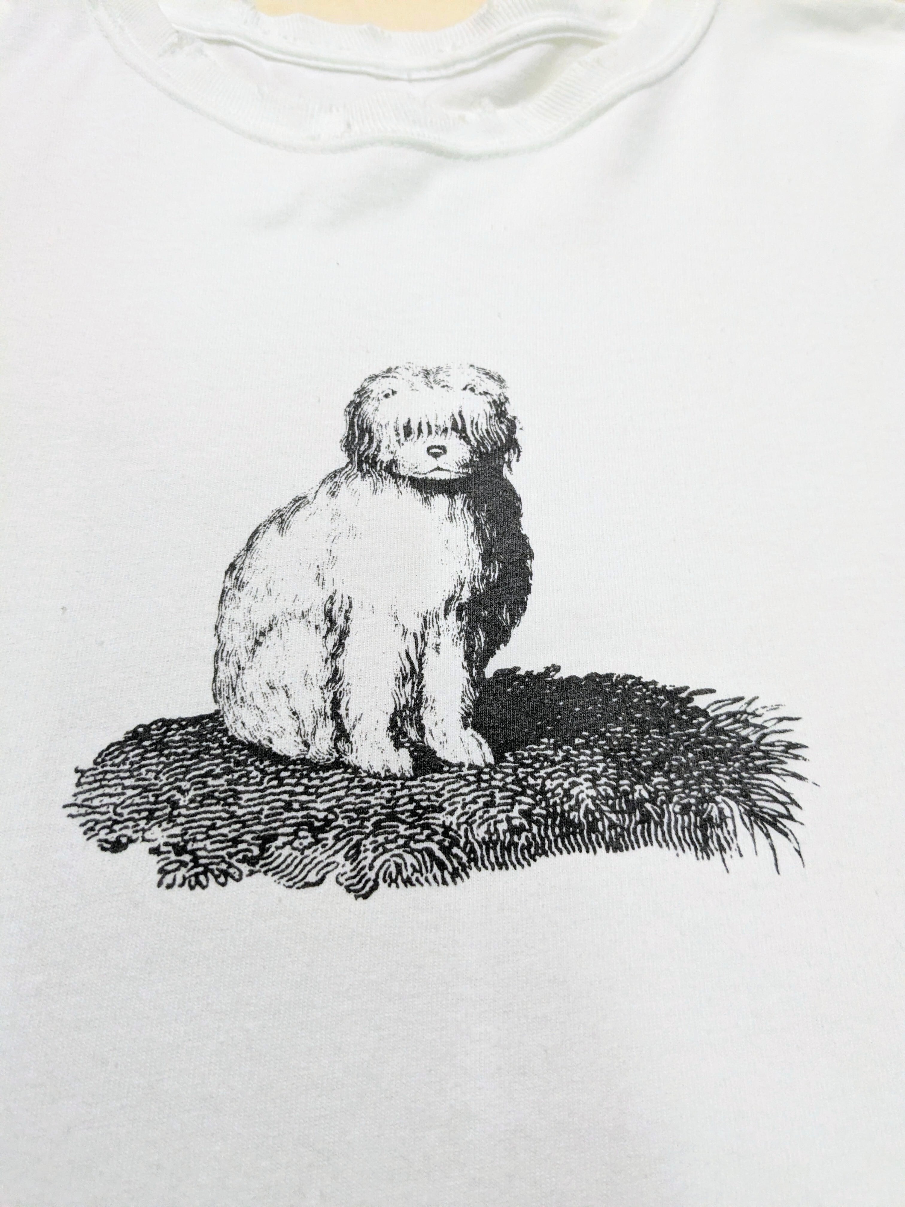 まるで手描きのようにプリントされた犬Tシャツ。とても可愛いです、、、。Tシャツ自体はかなりルーズなサイズ感。着用してなったのかデザインなのかは不明ですが、ダメージが入っています。