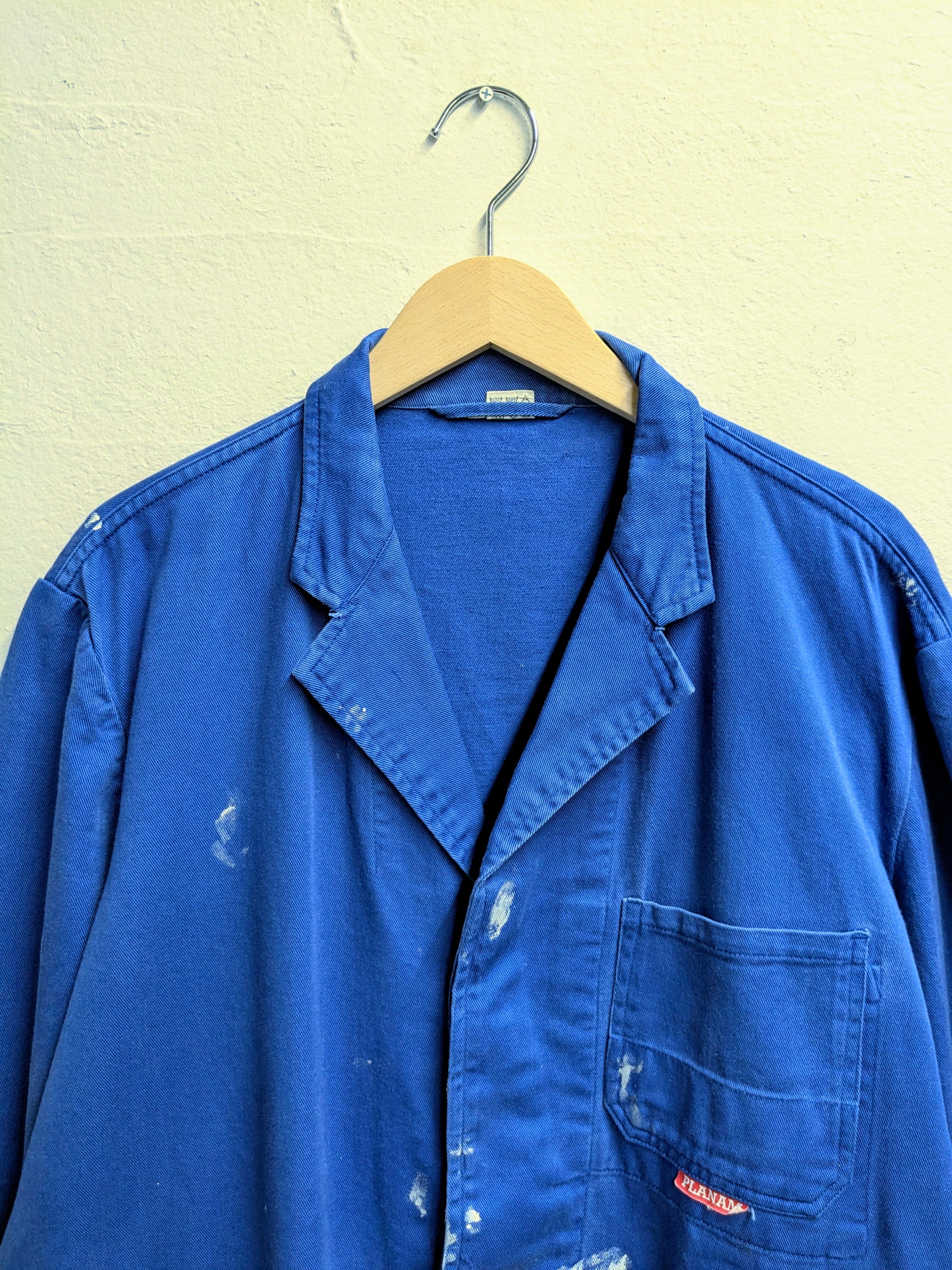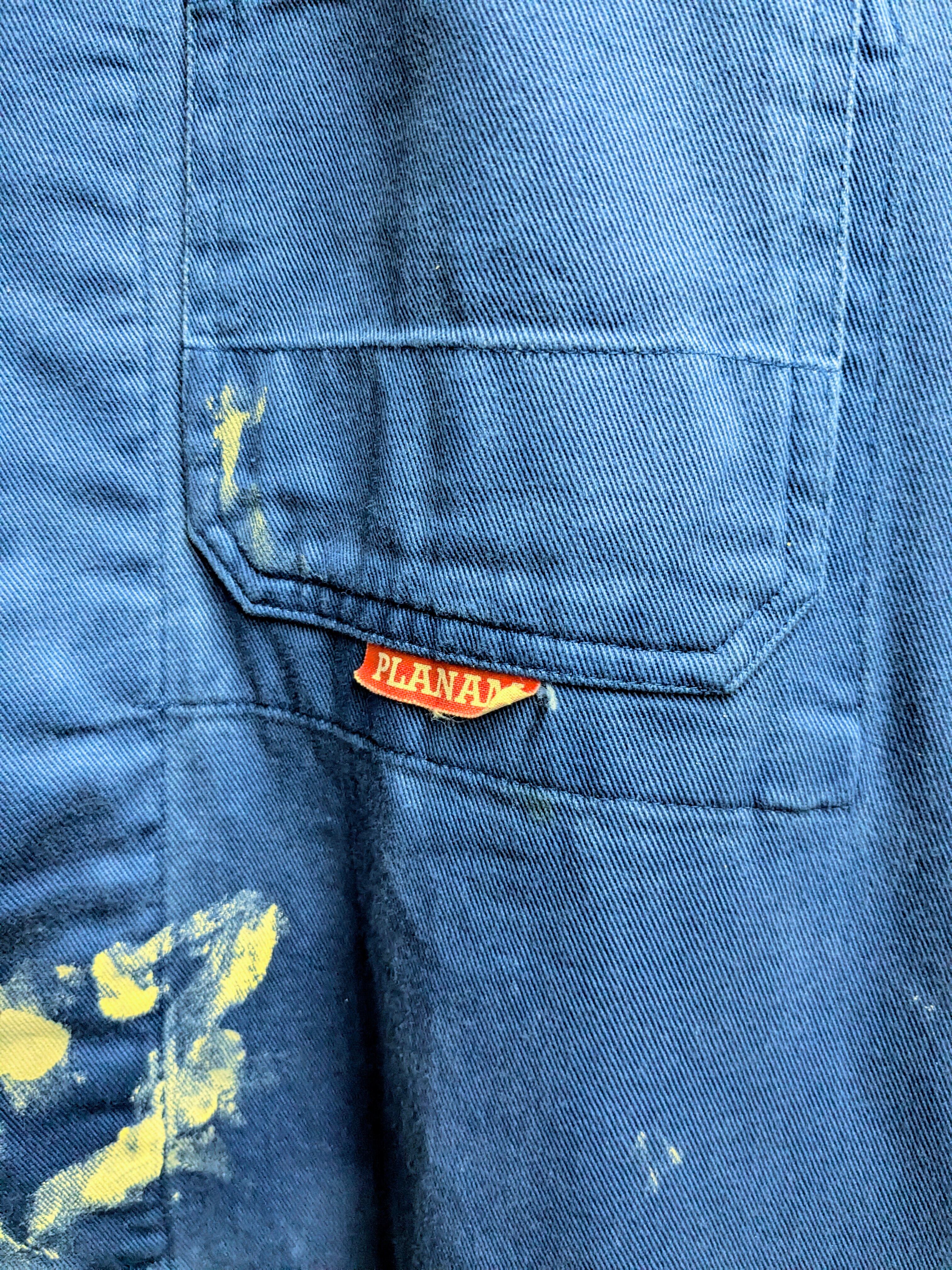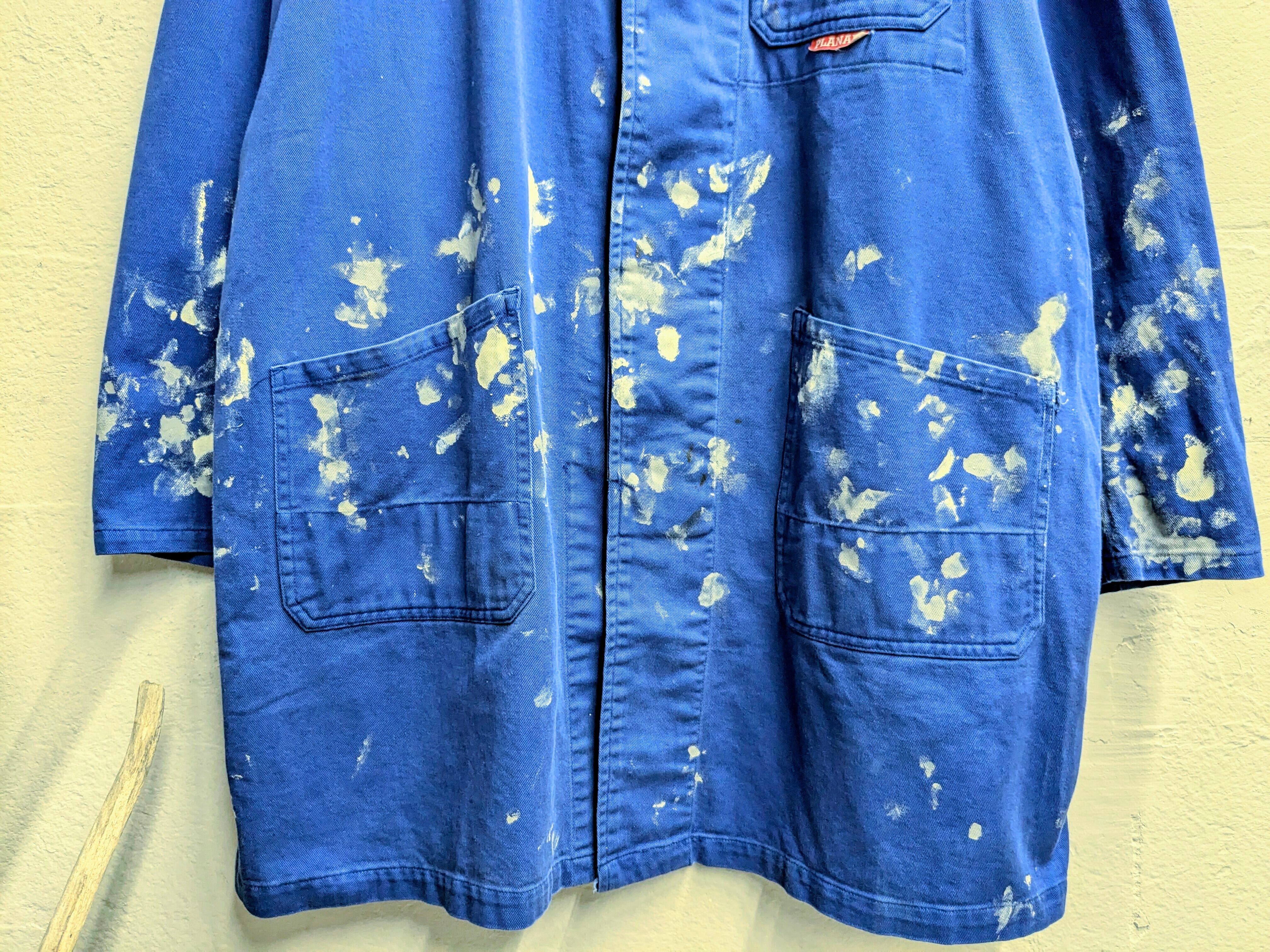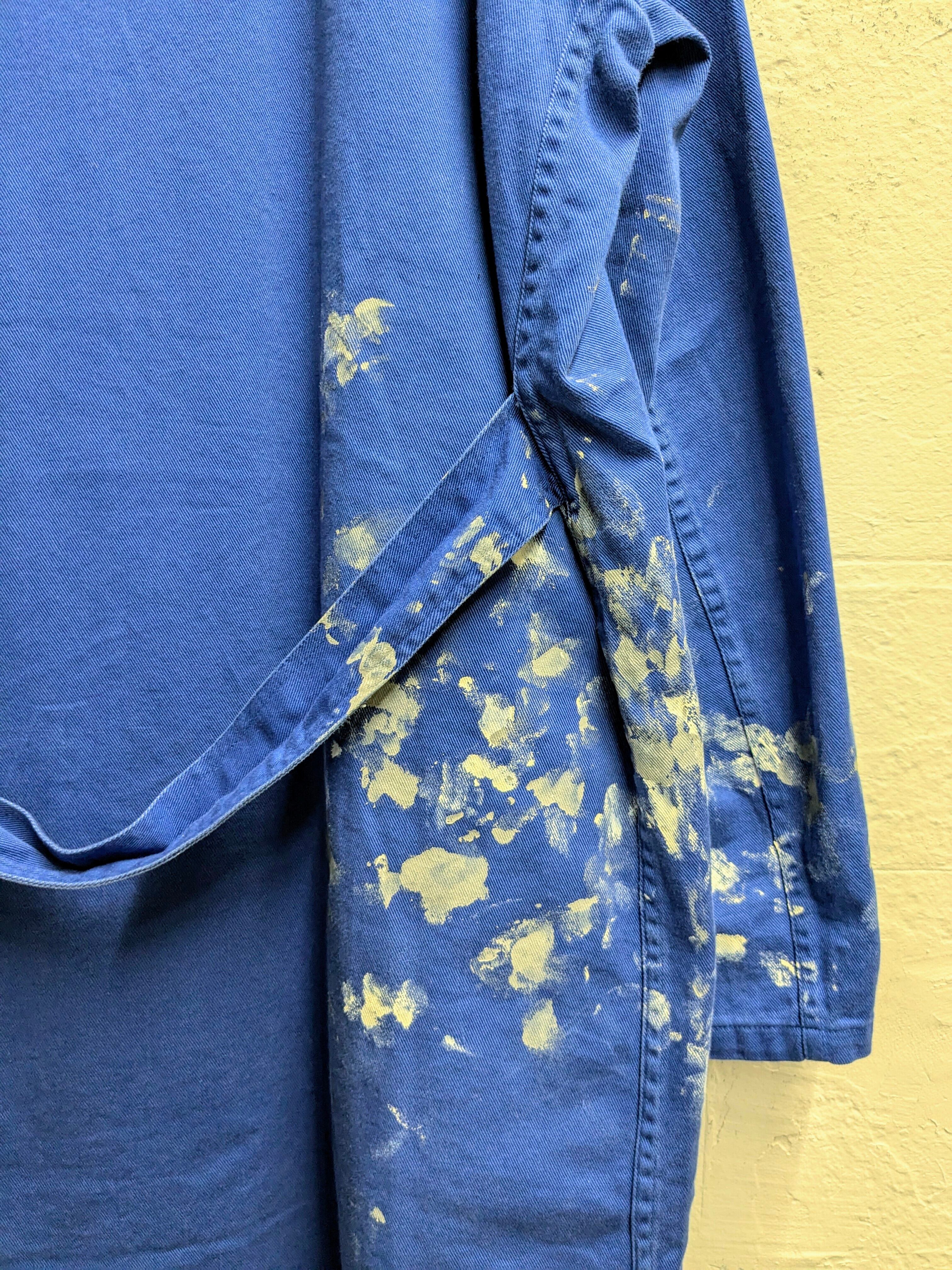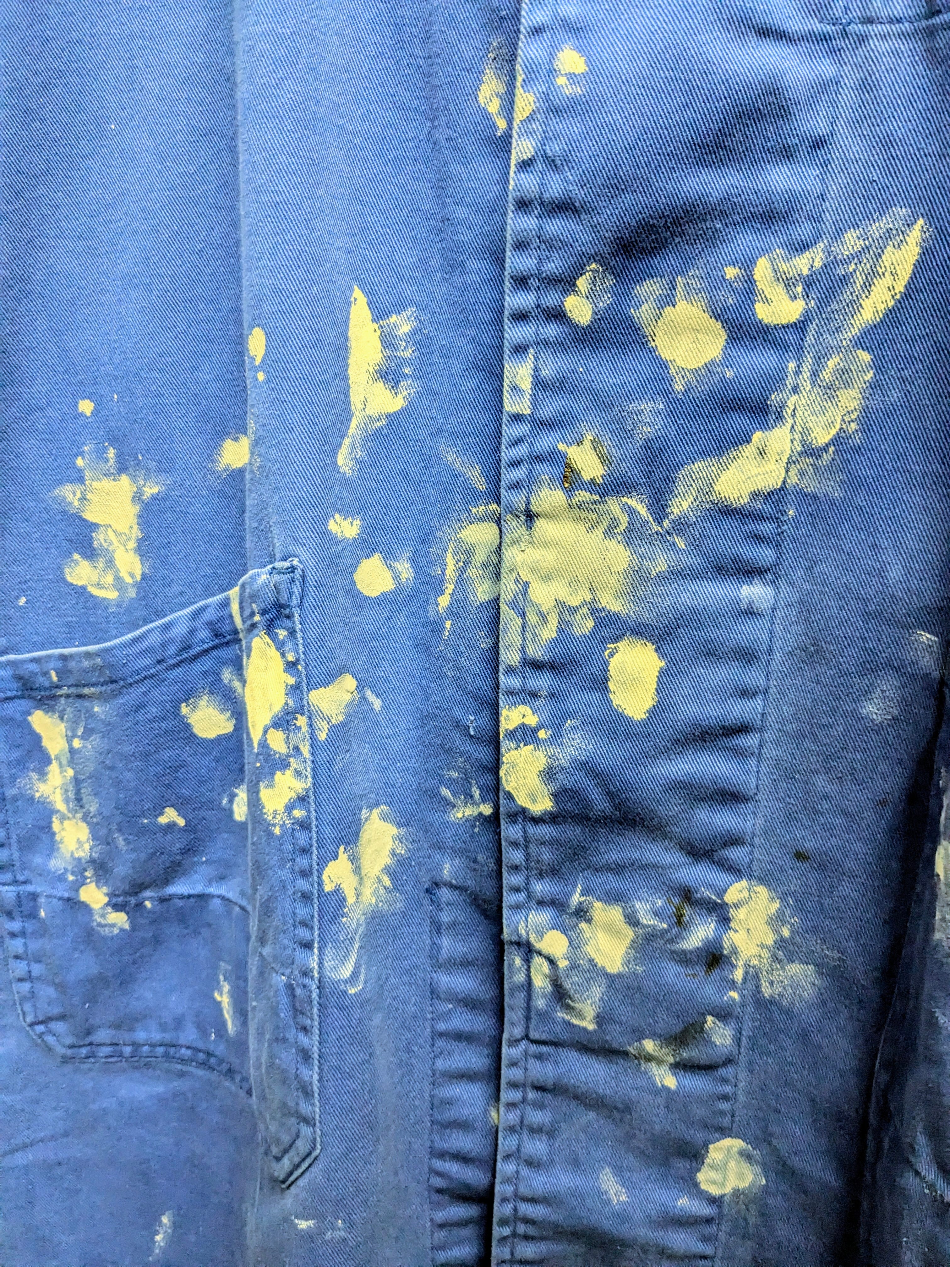 元々の汚れがあったり、生地の色もフェードしているところもあったりと、とてもペンキが馴染んでおり雰囲気抜群です。サイズも大きめでゆったりと着ていただけるかと思います。