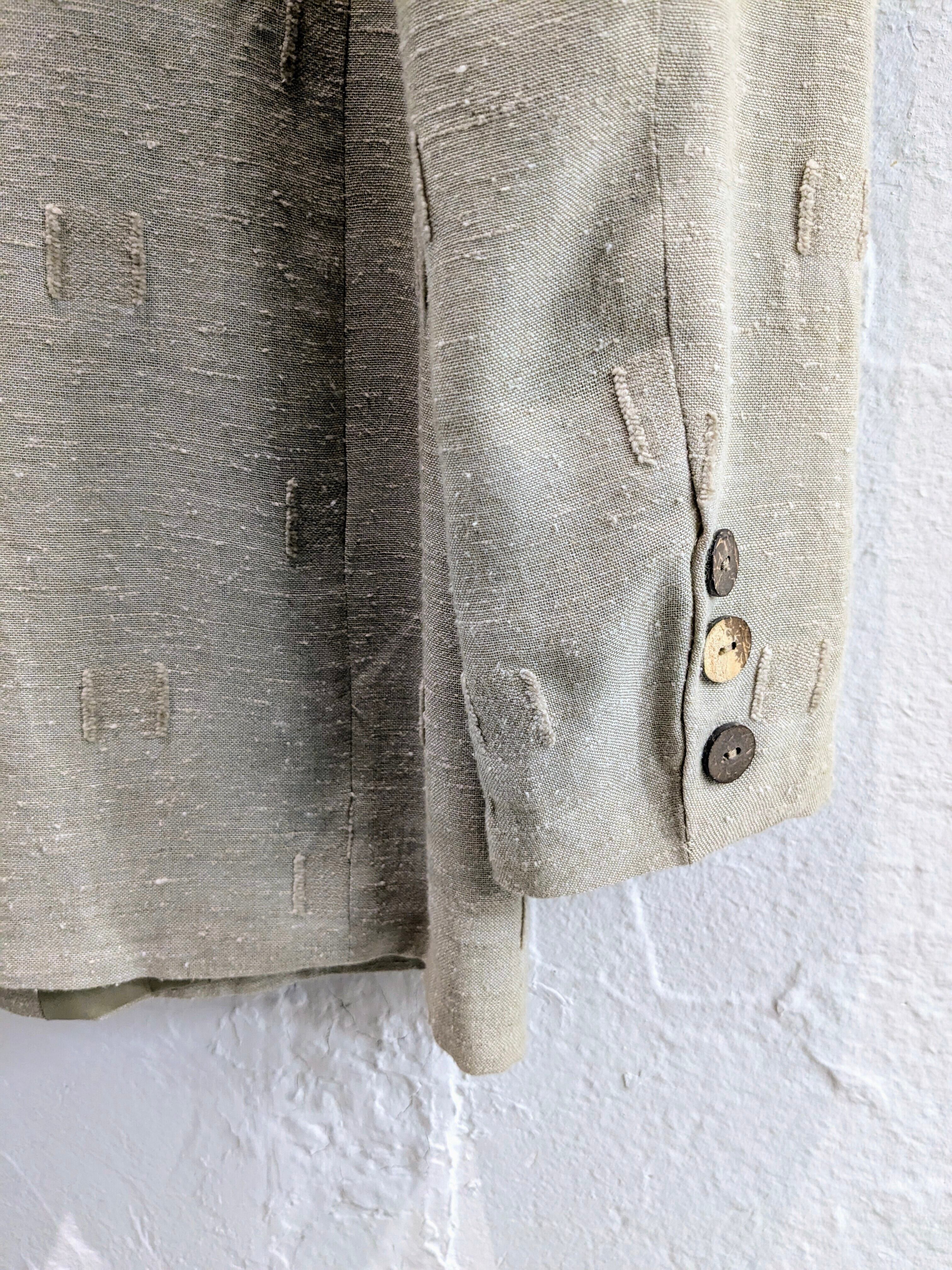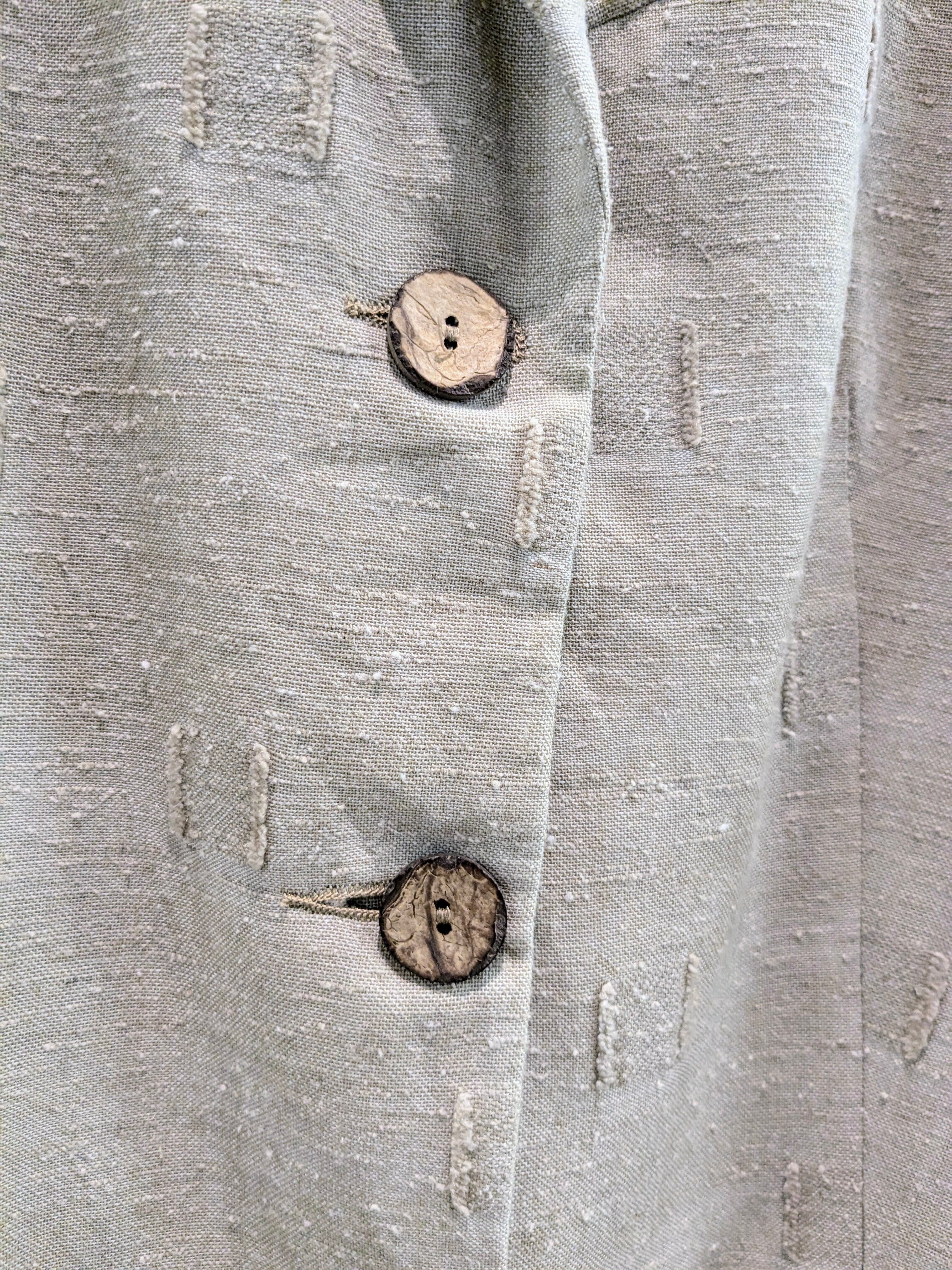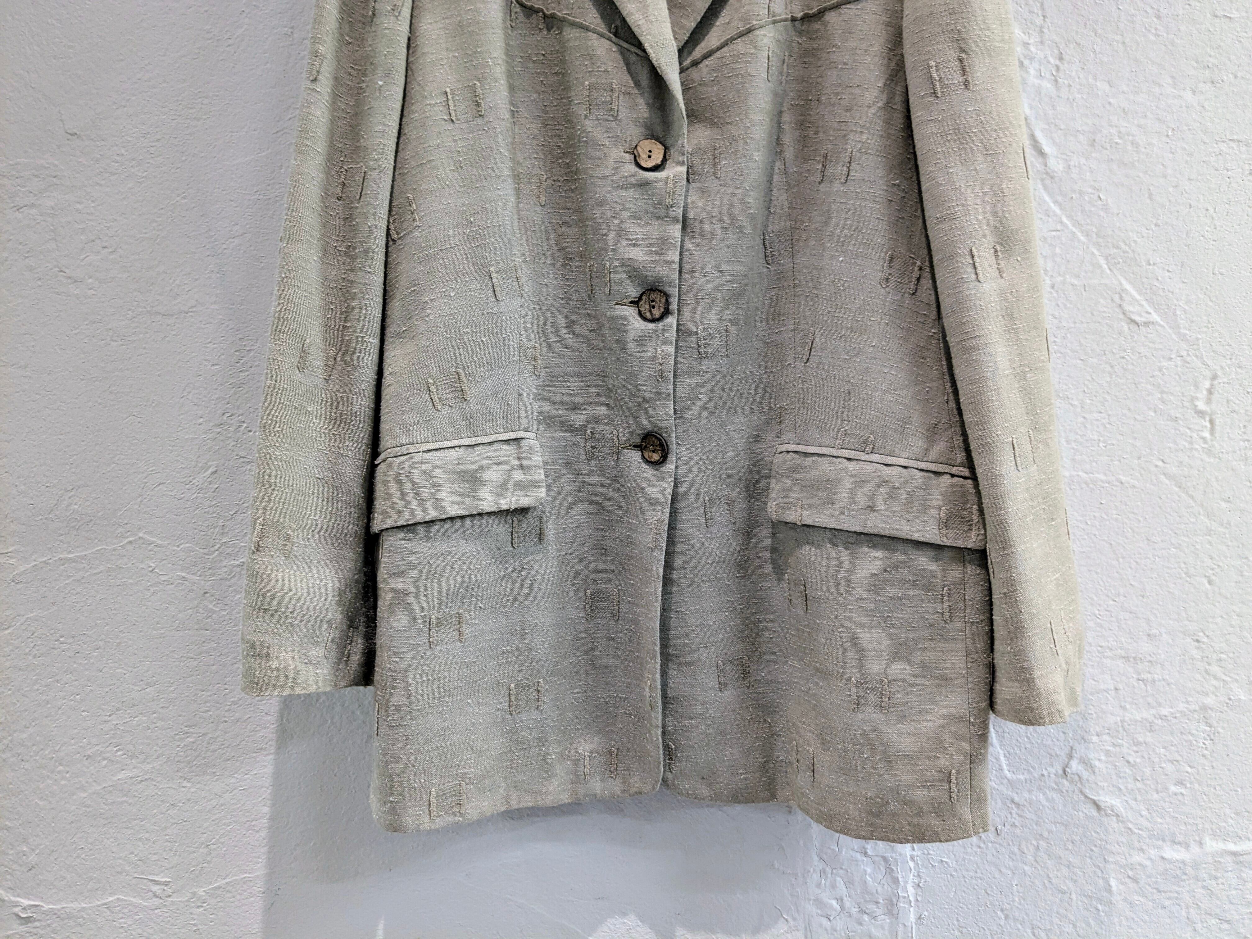 同色での刺繍デザインがあり、程よいデザイン性がポイントのジャケット。裏地もしっかりはってあり、着心地の面でもとても着やすくなっています。ボタンがウッドボタンとなっていたりと、刺繍もそうですがちょっとしたデザインにこだわりを感じる一着。