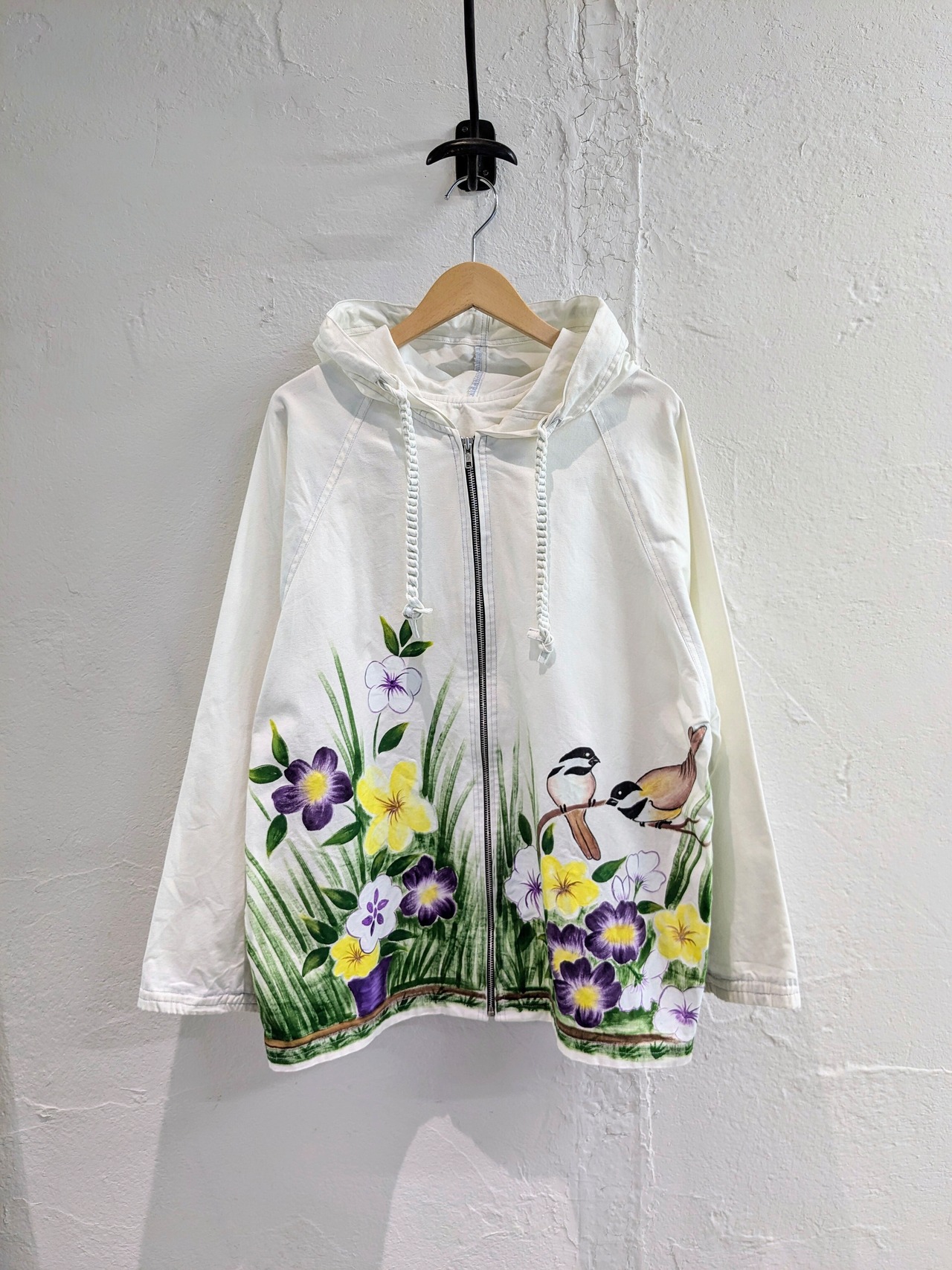 買付した時からの状態で、元々は何もなく前のオーナー様が描いたのか、元々こういうデザインのモノで販売していたのか不明。ただ、デザインがたまらなく好きで買付してきました。コットン地のマウンテンパーカーのようなデザイン。ラグランスリーブなのもストレスフリーで着れて嬉しいポイント。サイズ表記はSですが、かなり大きめな作りとなっています。