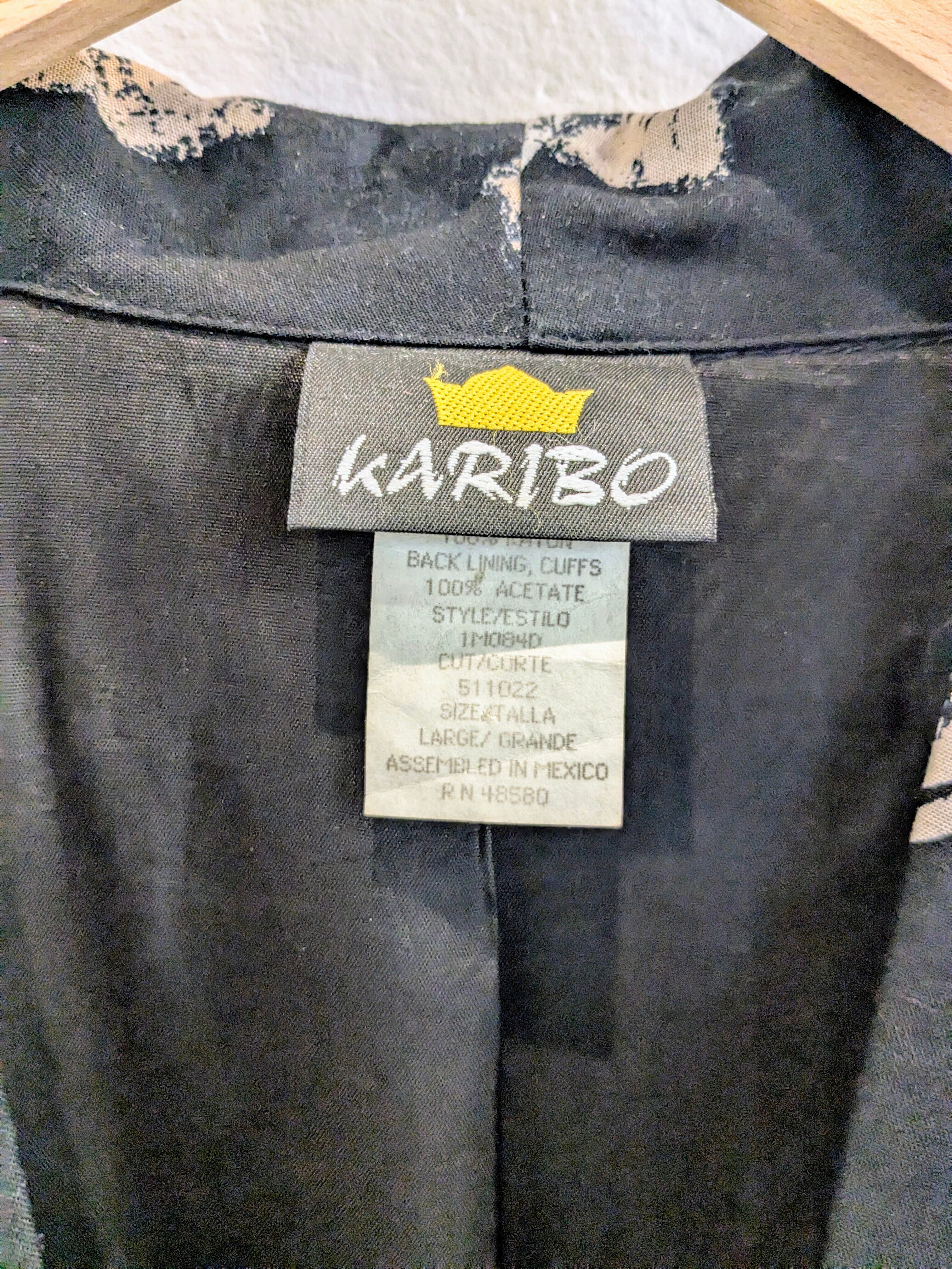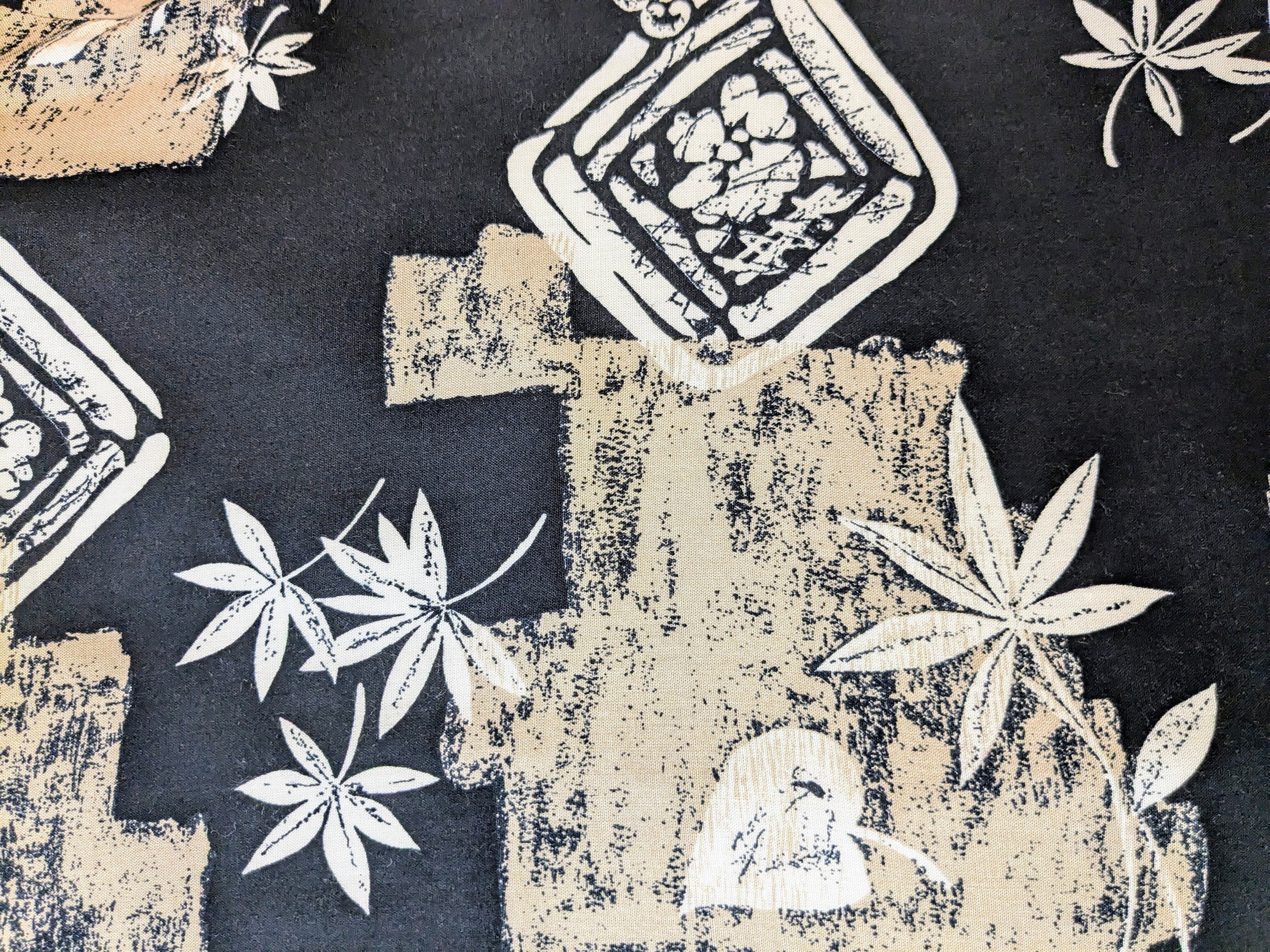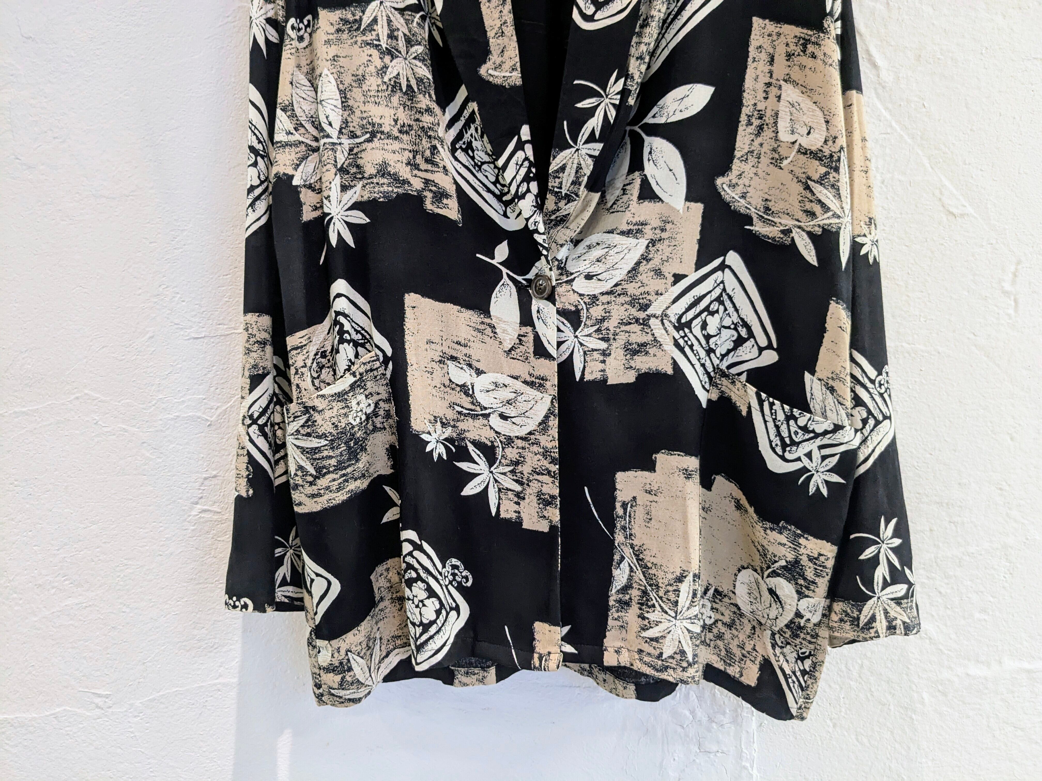 ブラックボディにスタンプされたかのように葉っぱの模様がプリントされています。生地はレーヨン100%となっており、落ち感、柔らかさ、軽さのありシャツ感覚で羽織っていただけます。裏地は背抜きになっており、裏地がついていない部分に関しては、透け感が出そうなくらいの薄さになっています。