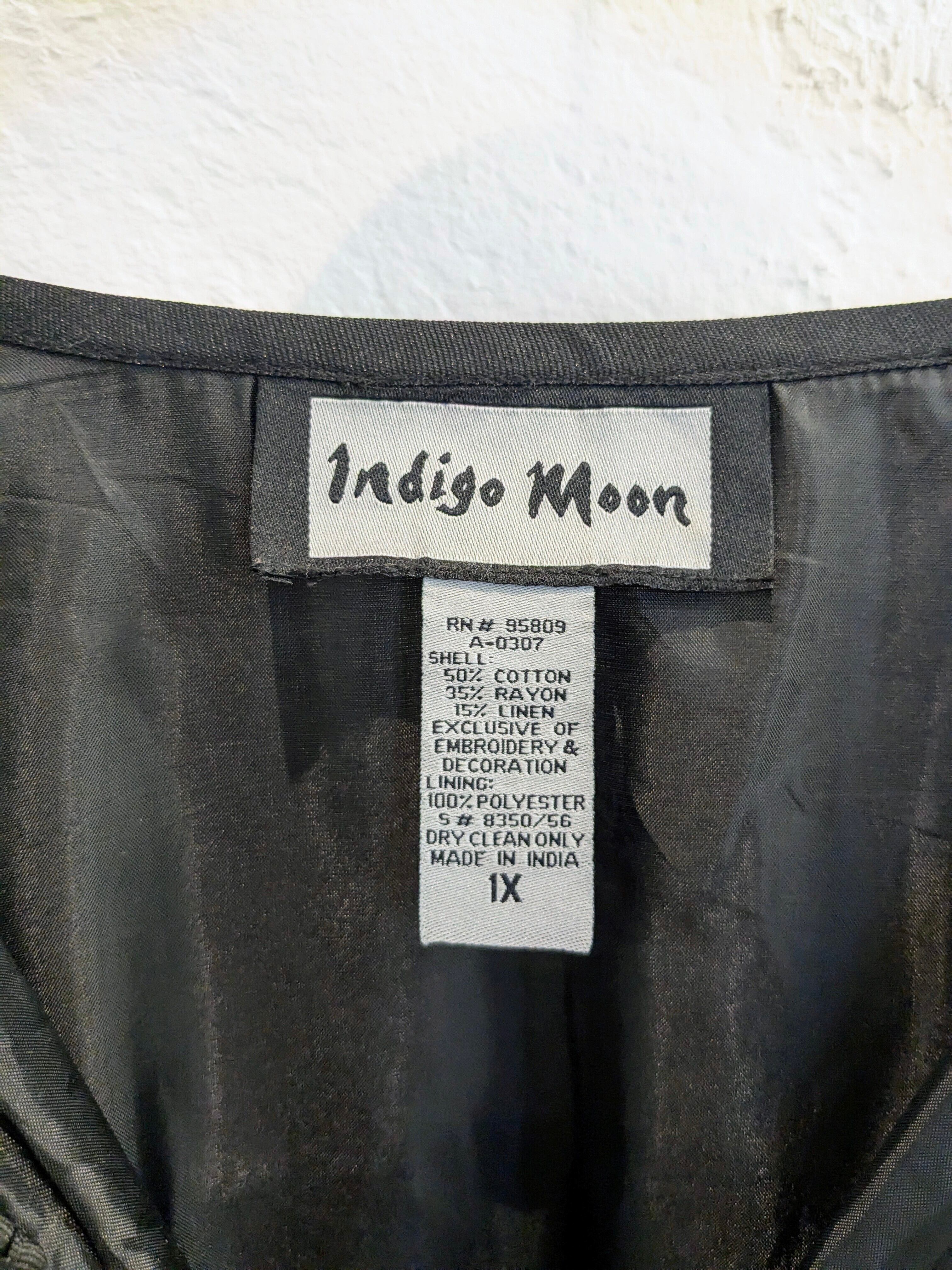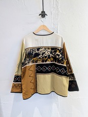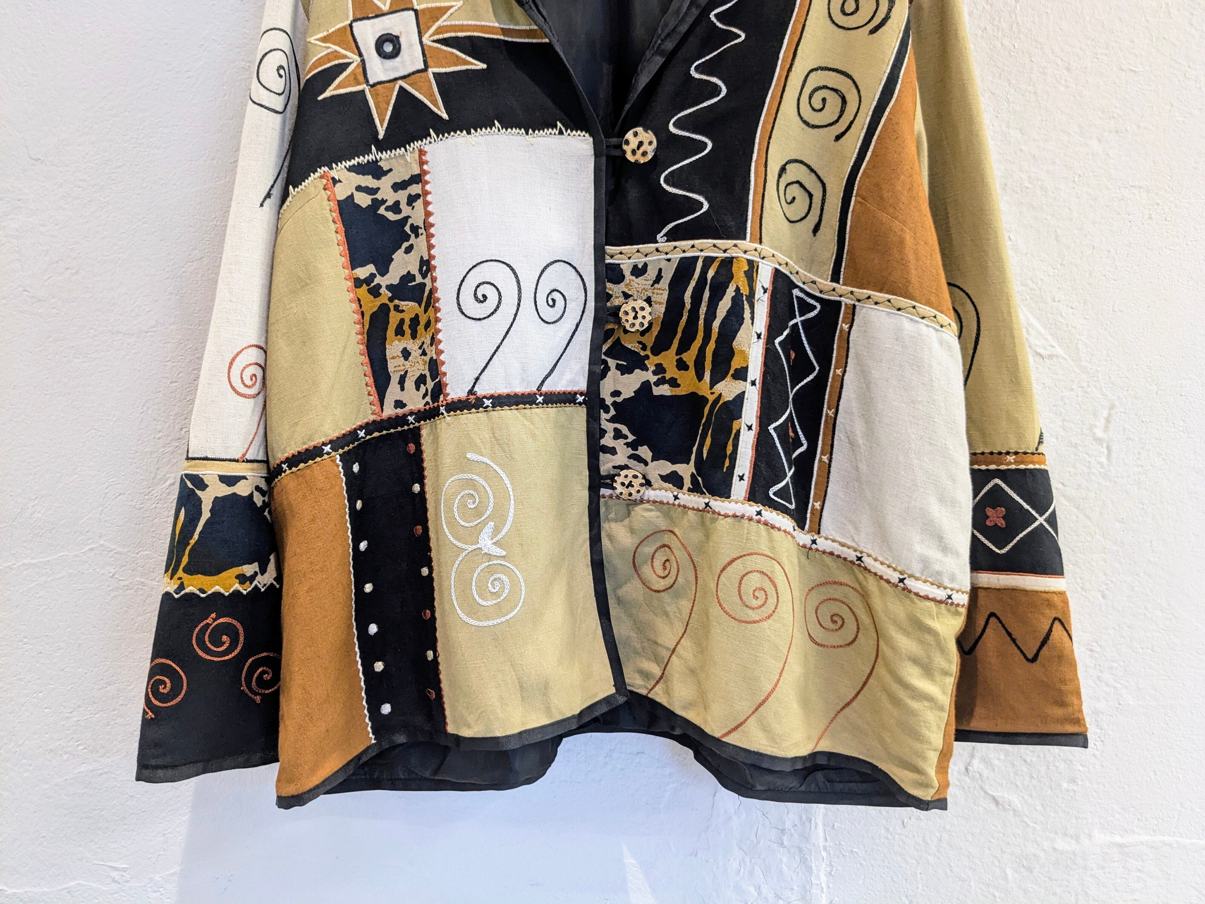 エスニックテイストのパッチワークデザイン、ノーカラージャケットになります。刺繍、レオパード柄の生地が当て込んであったり、デザイン性高いアイテムかと思います。生地的には、とても軽く、落ち感があるほど柔らかく、着やすくなっています。