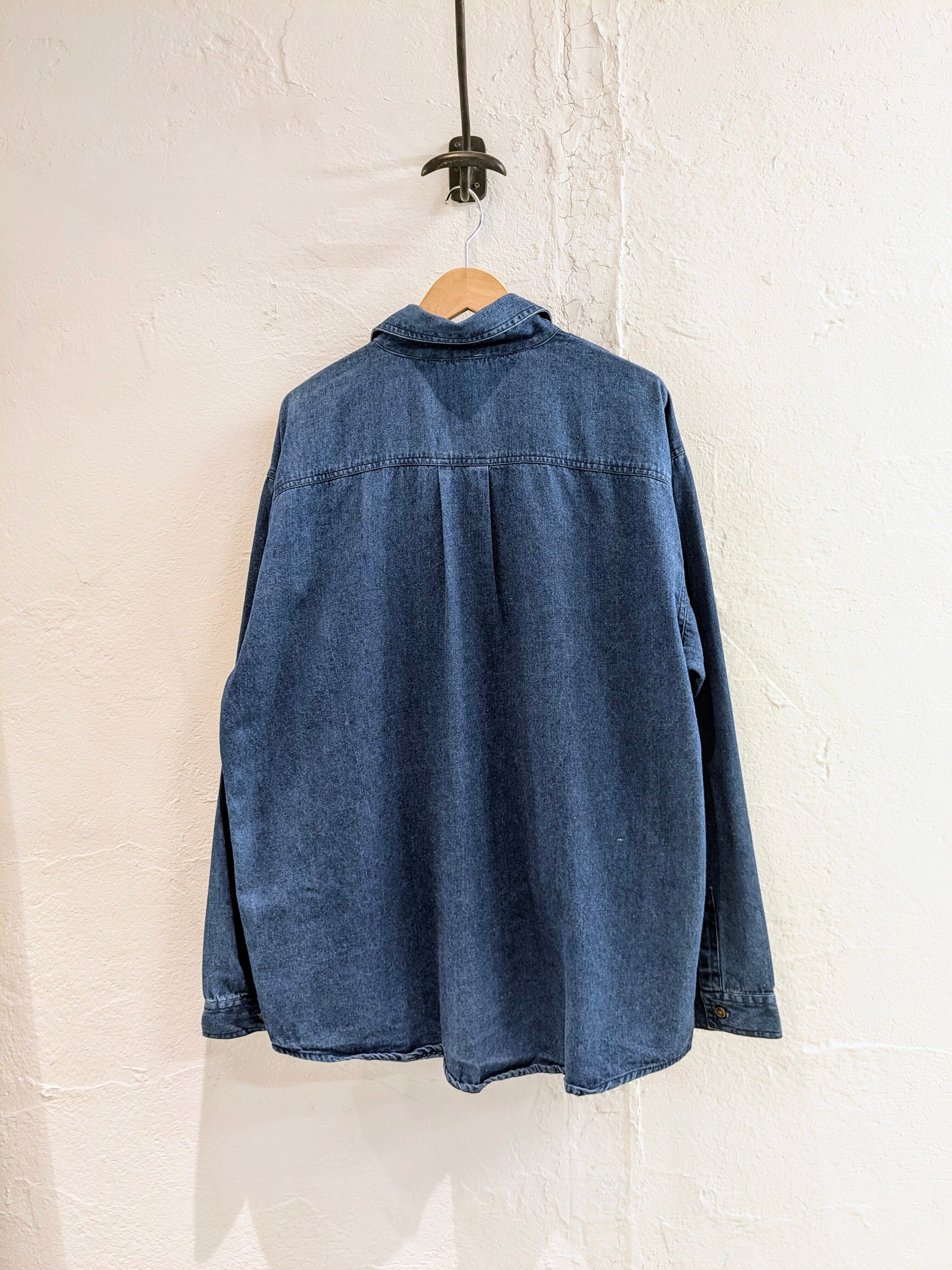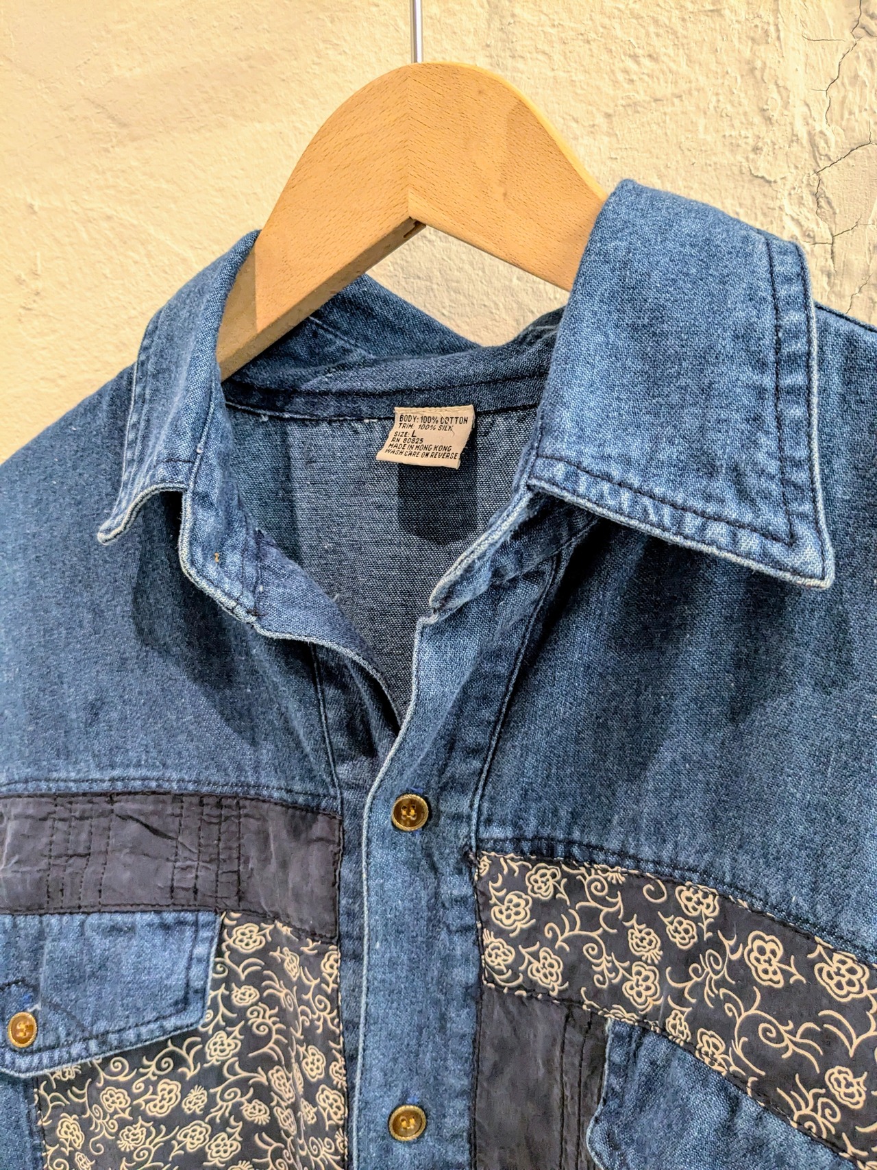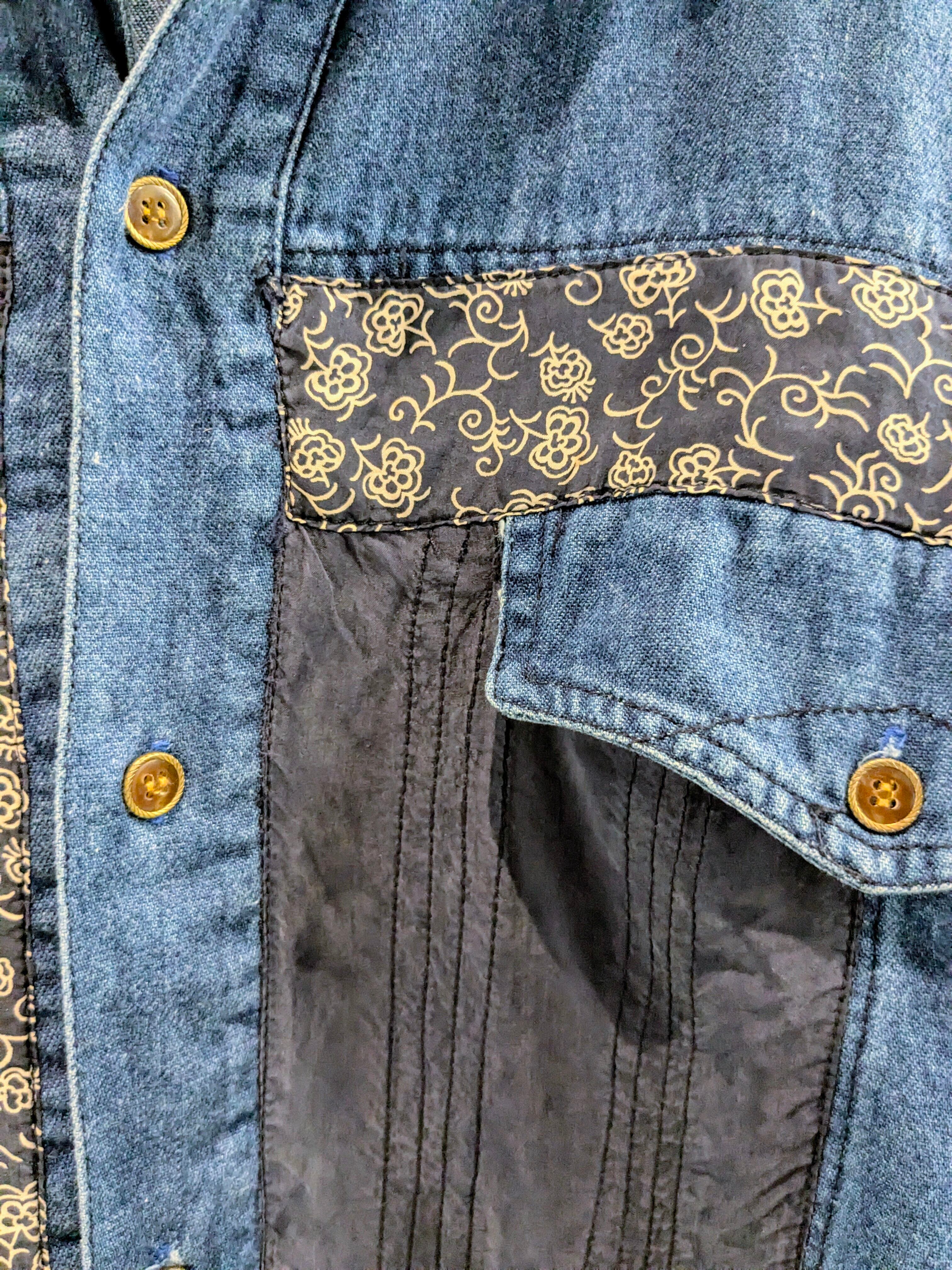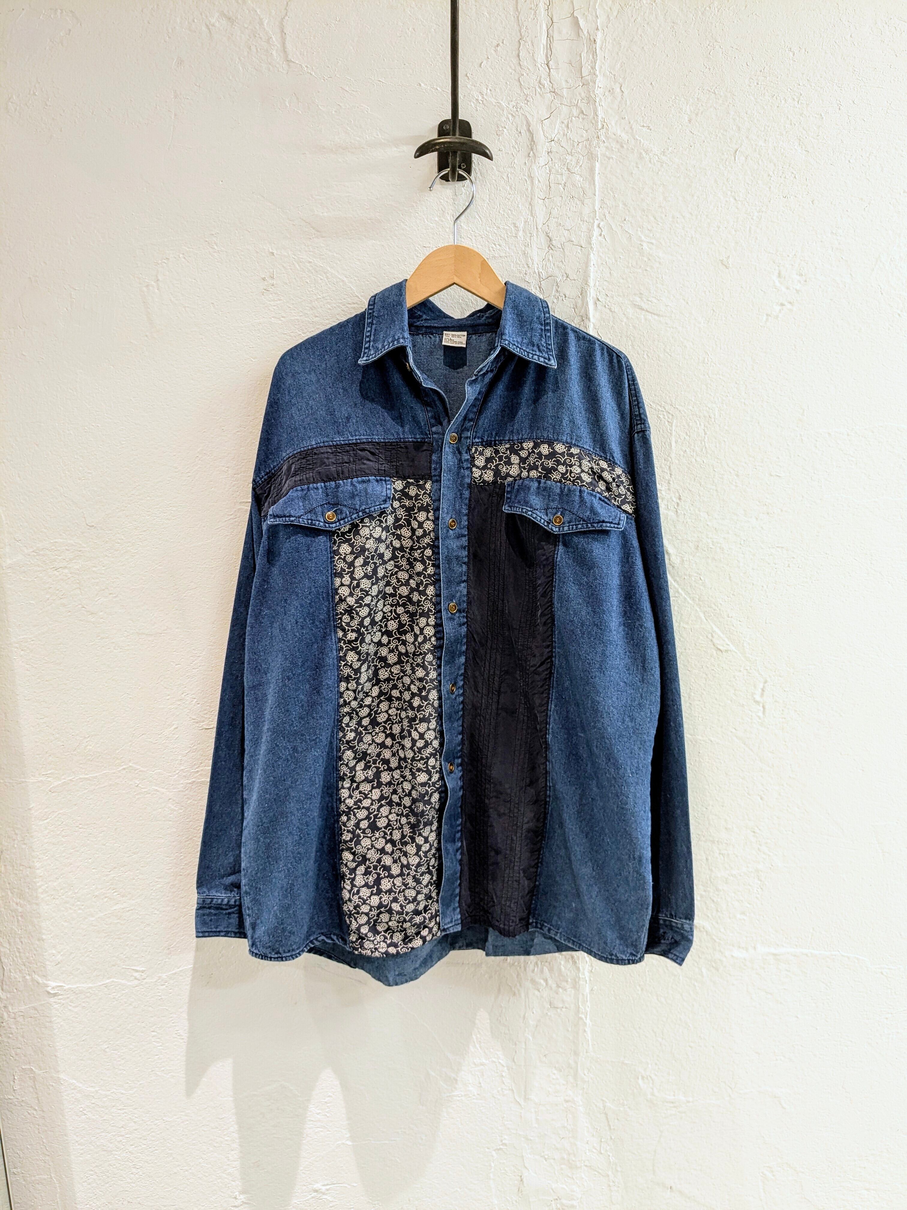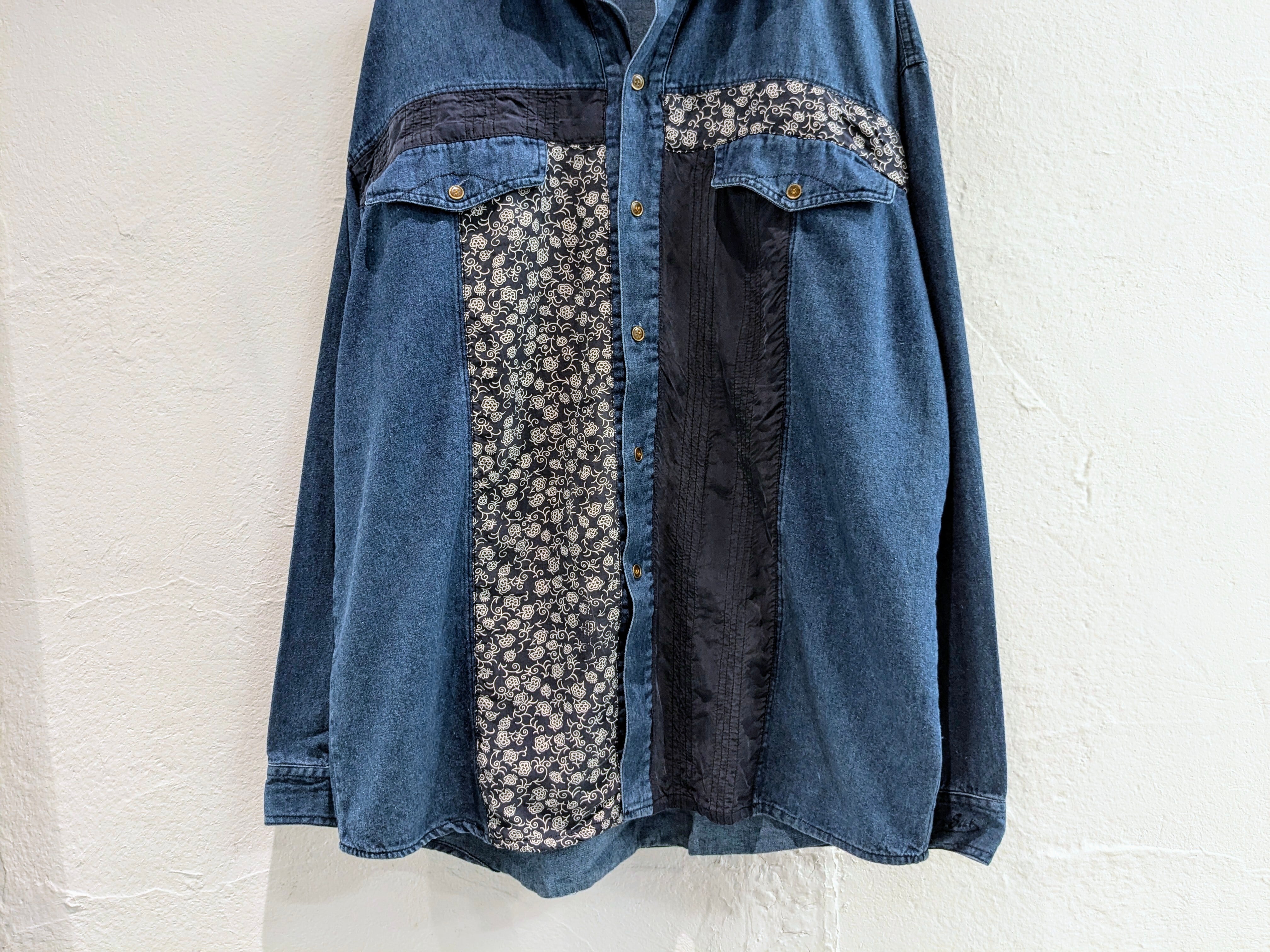 デニムシャツに、花柄のシルクがパッチワークデザインされています。
