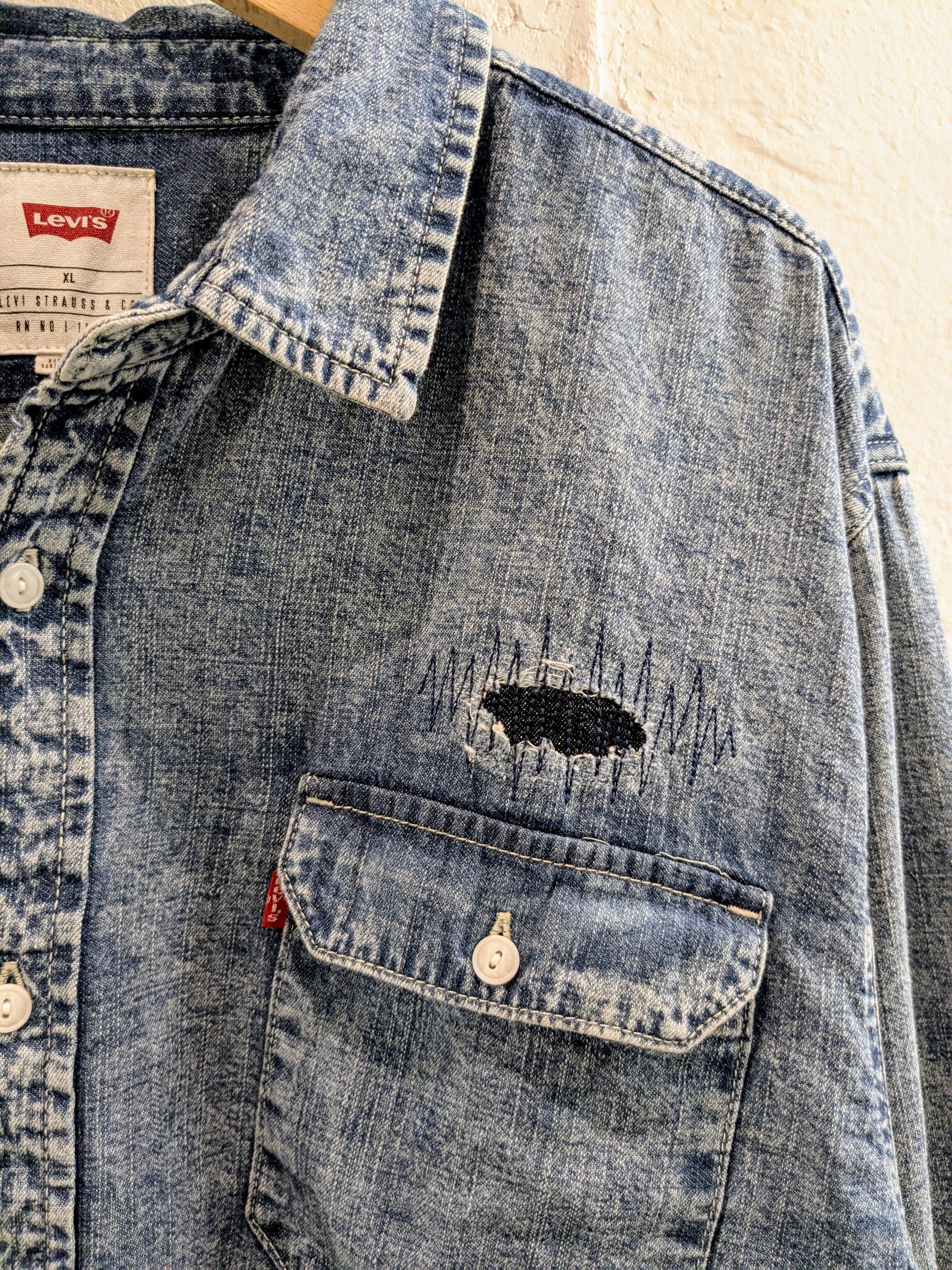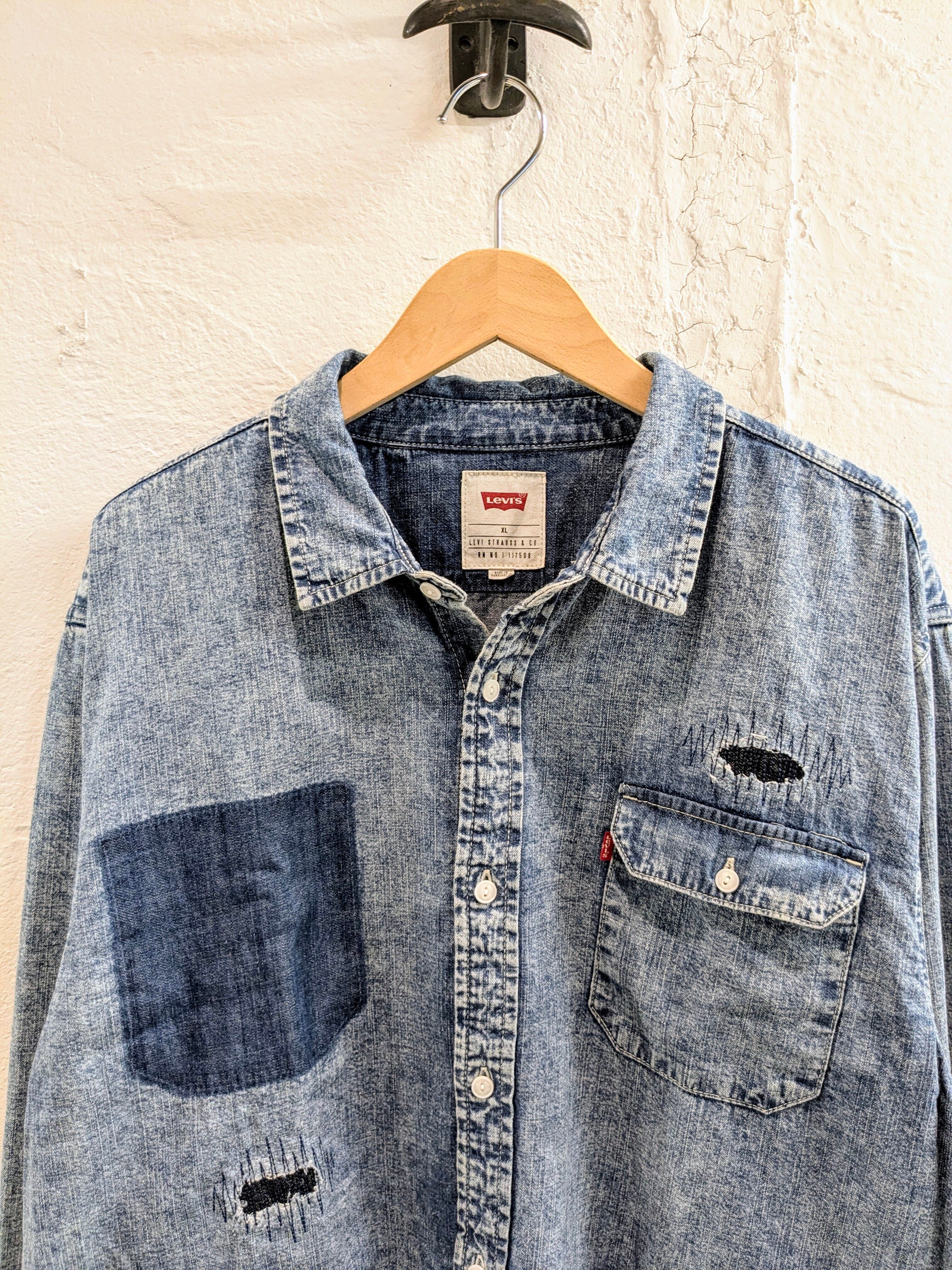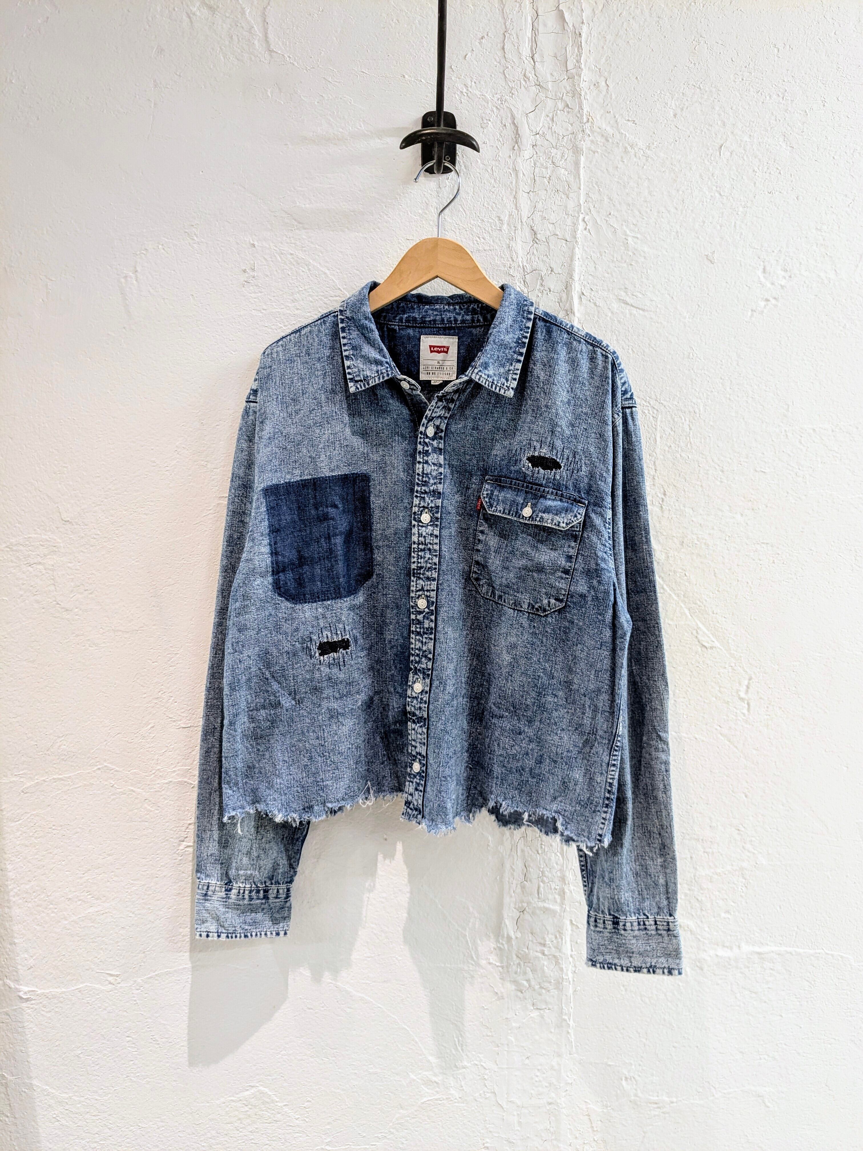 DAMAGE AND REPAIR CUTOFF DENIM SHIRT