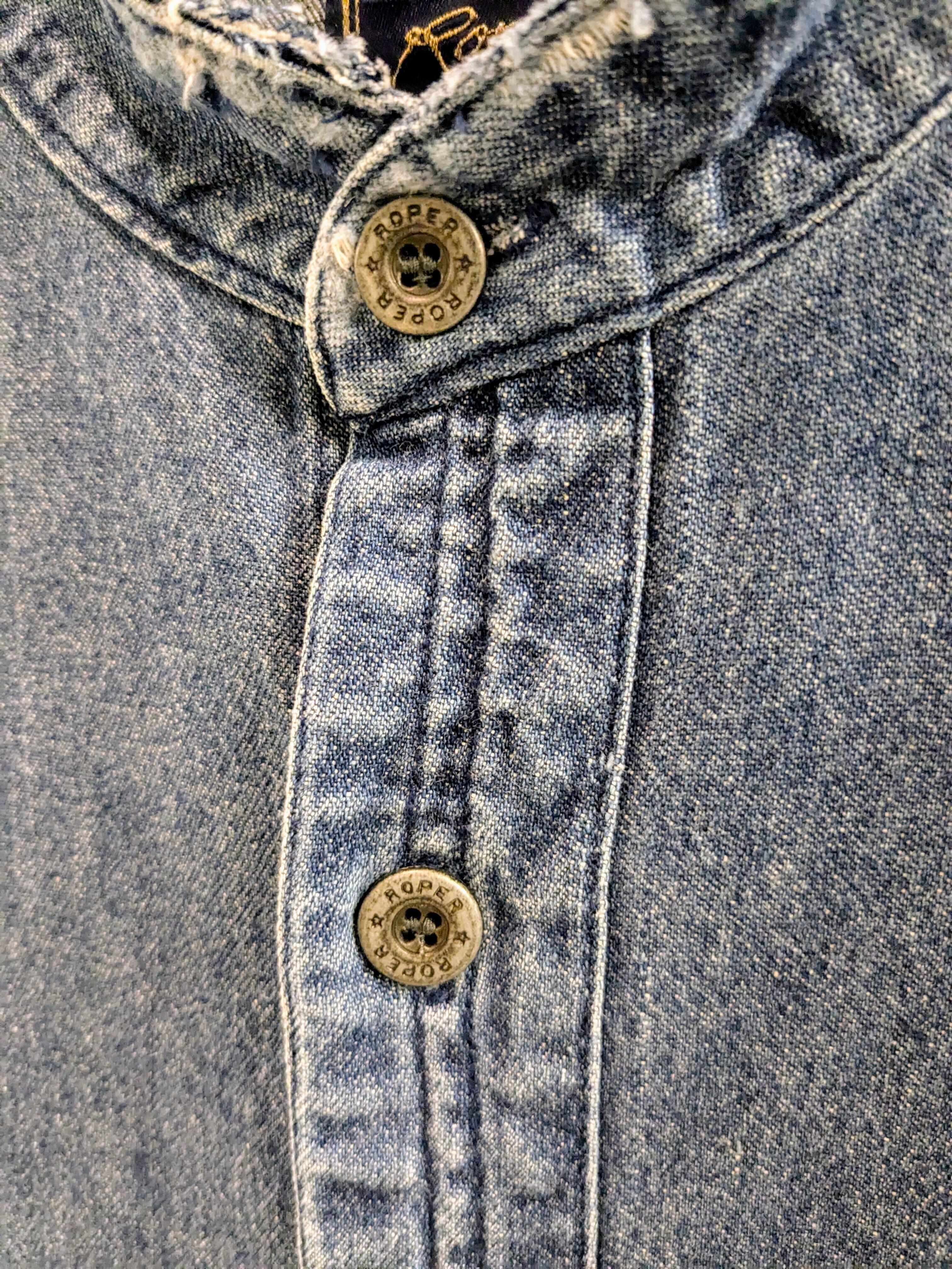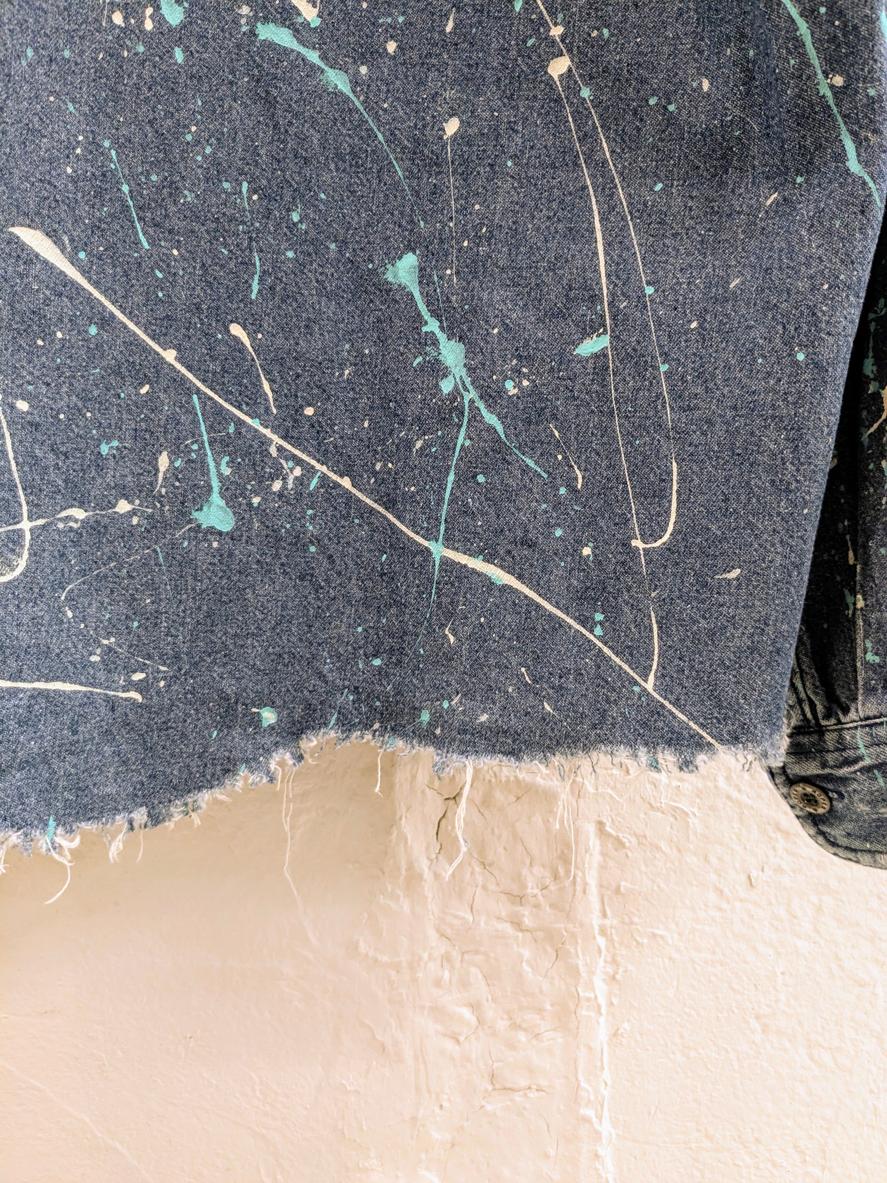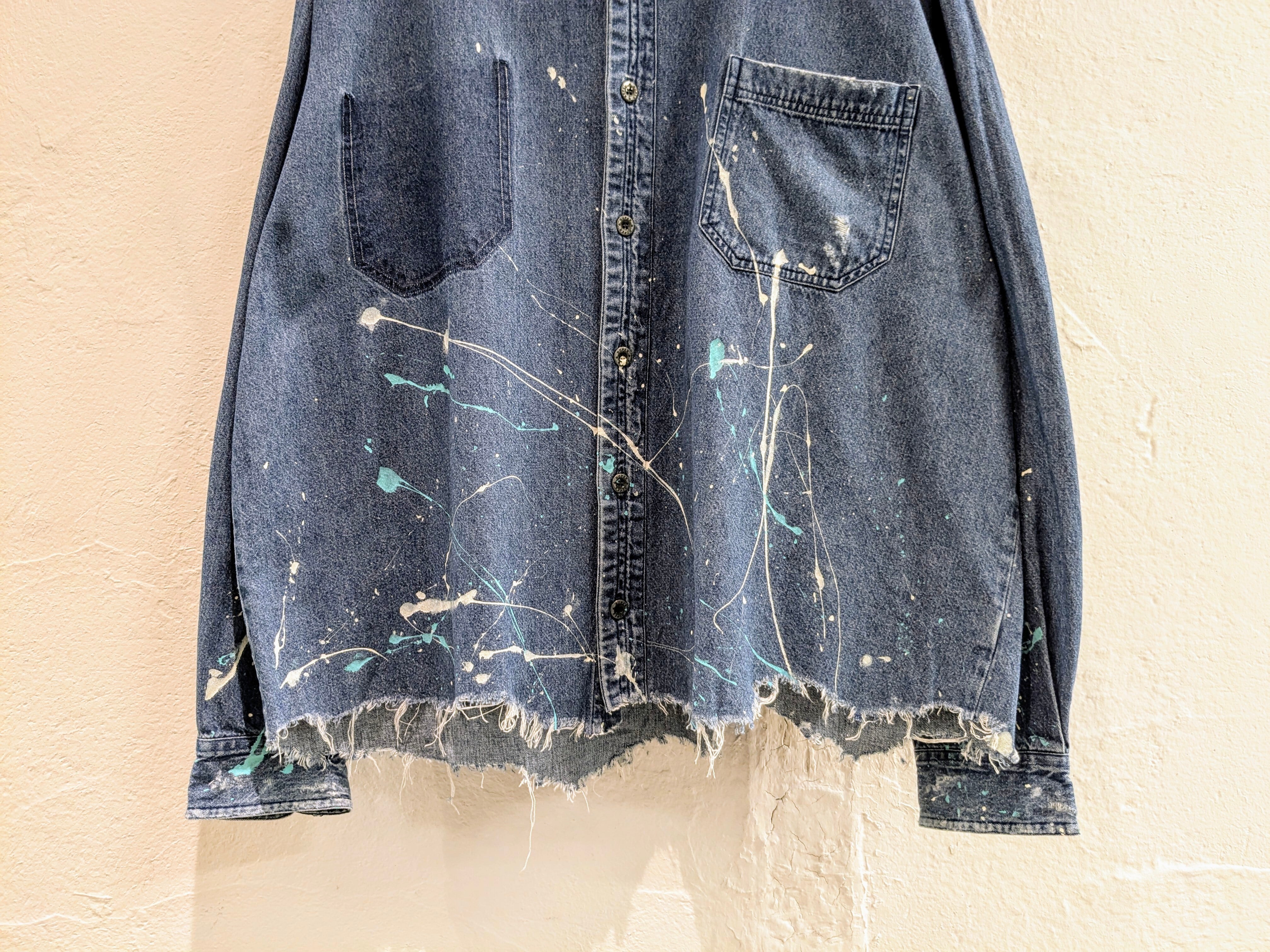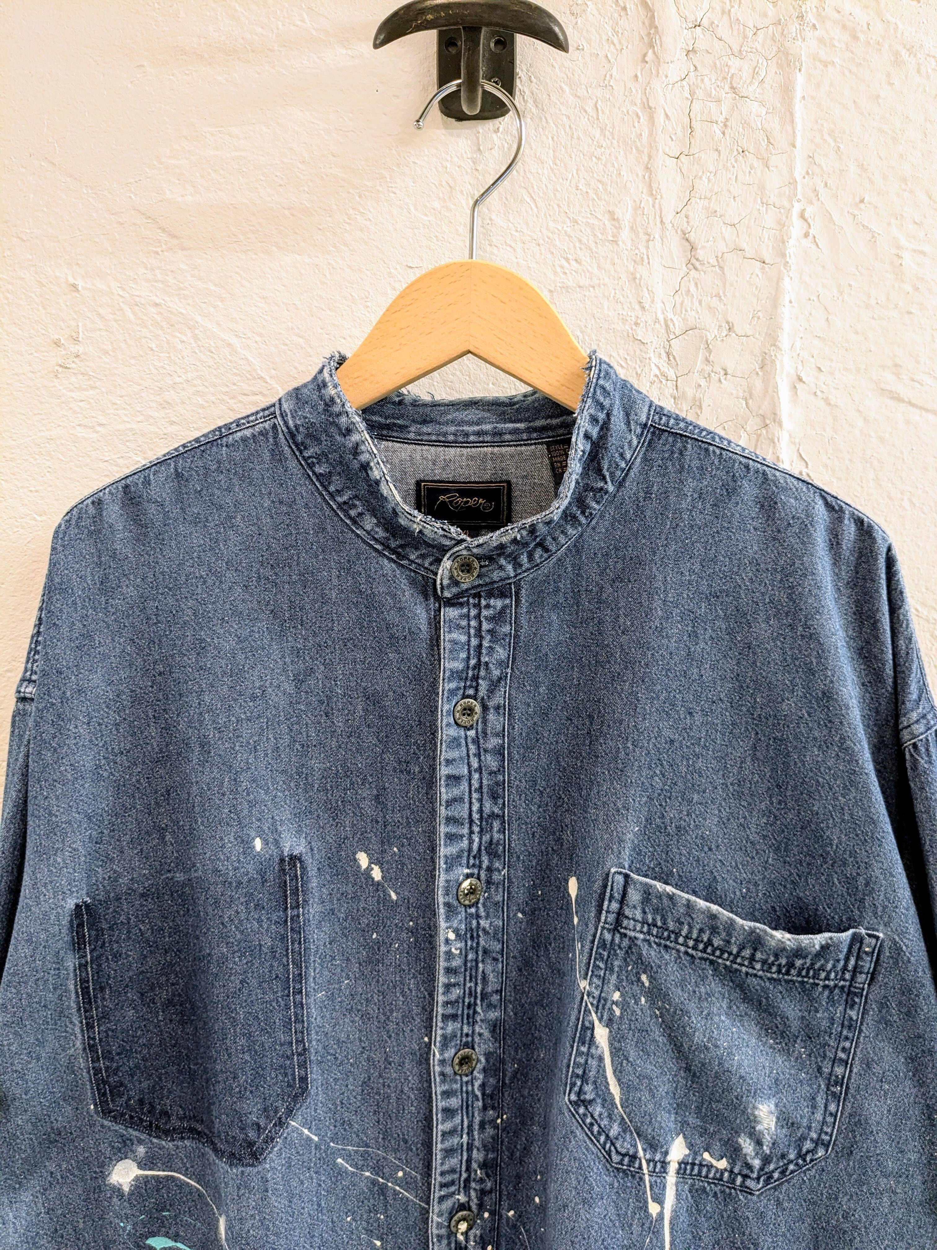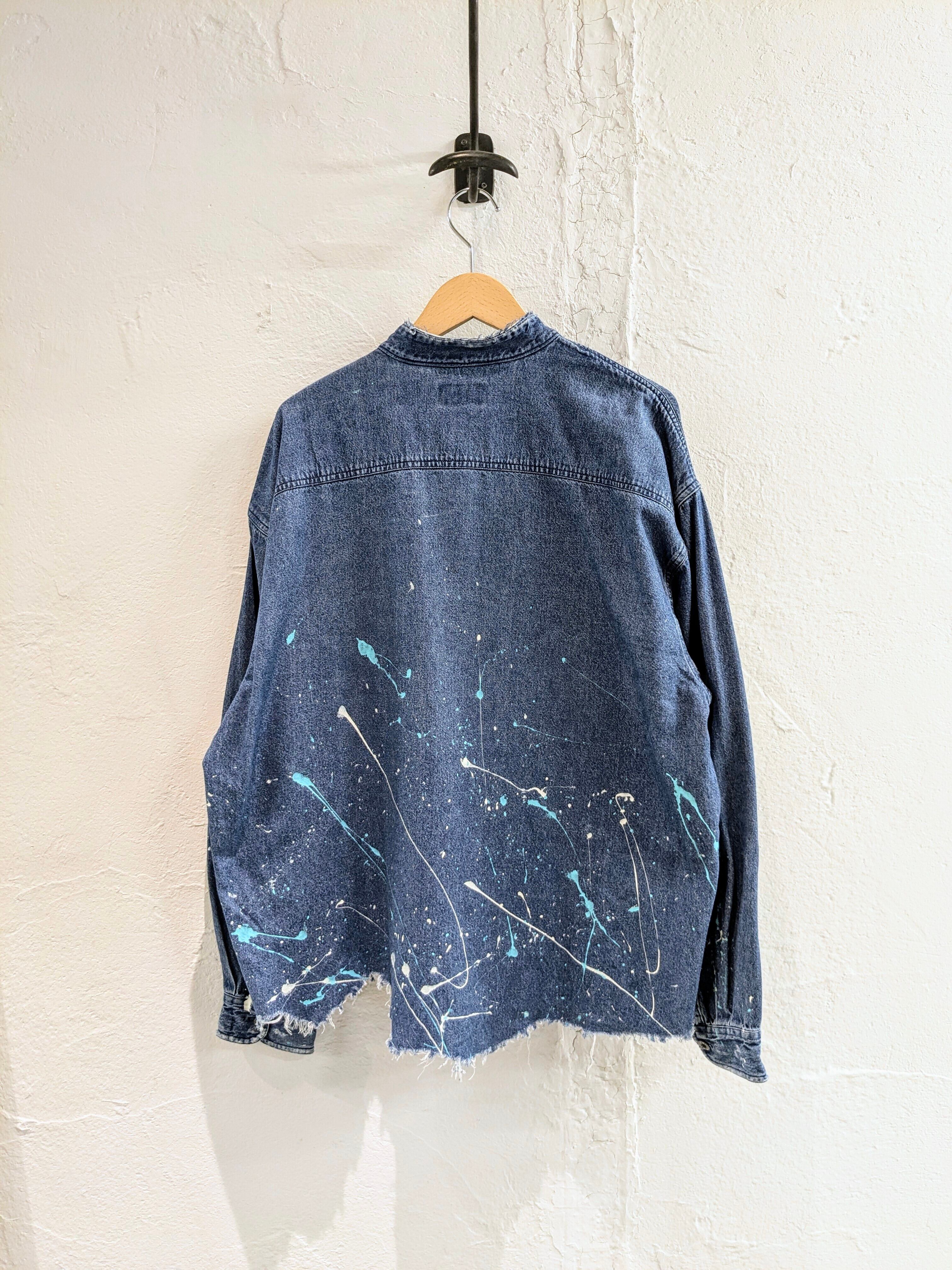 DAMAGE AND PAINTED DENIM BAND COLLAR SHIRT