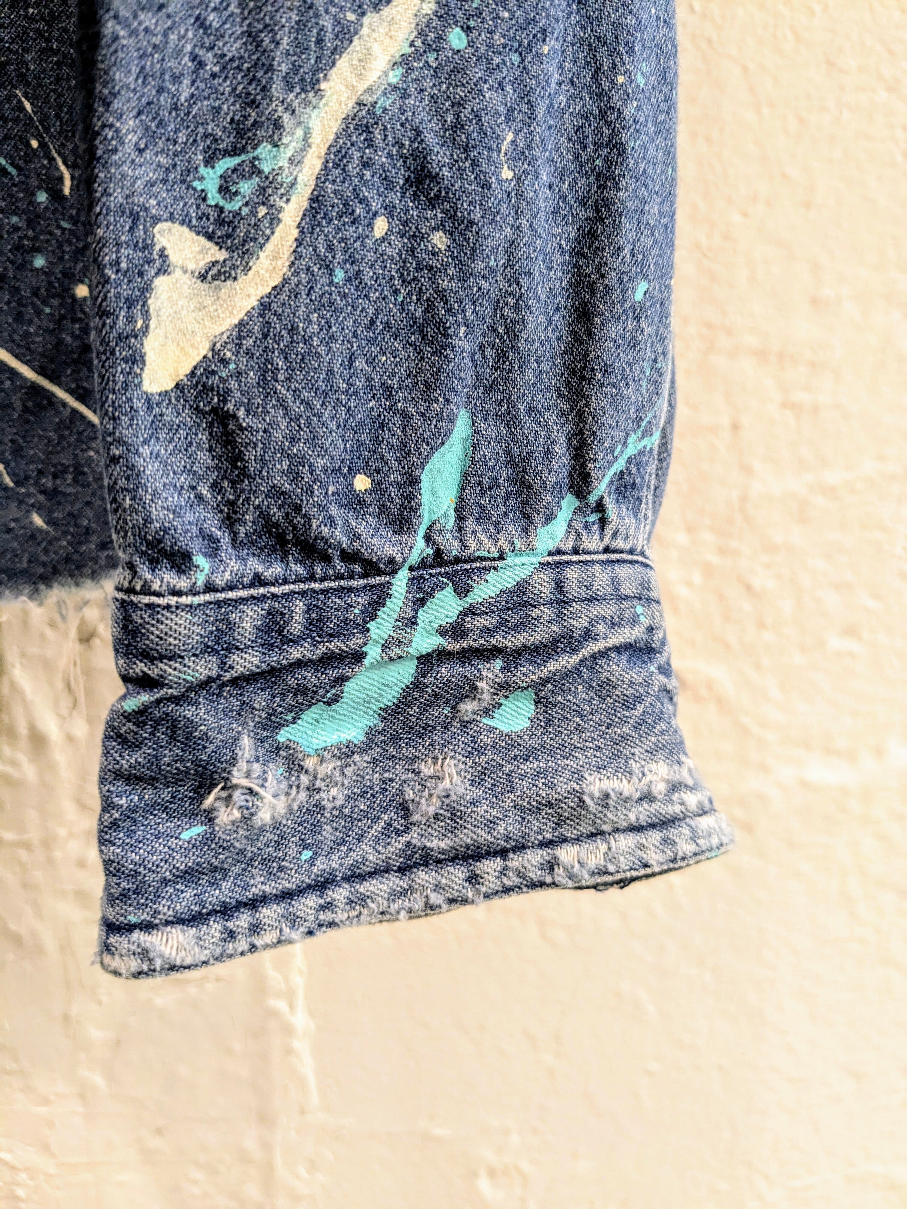 部分的にダメージ、ペンキ汚れがありとても雰囲気良くカッコいい一着。ブルゾンのように、短丈にしていますので、レイヤードが楽しめるのと、ボトムもワイド、スリムと選ばずバランス良く着れるのでオススメです。
