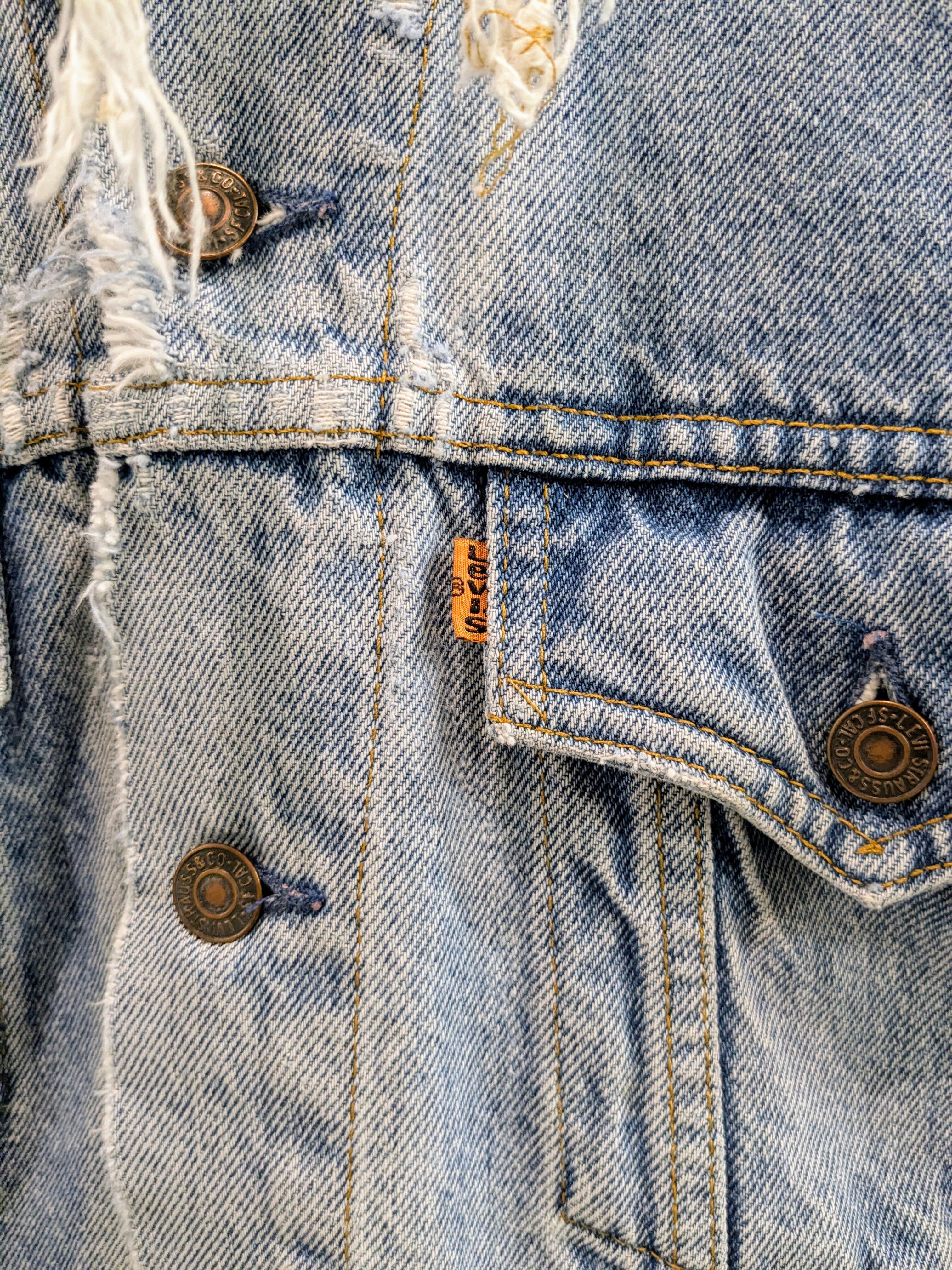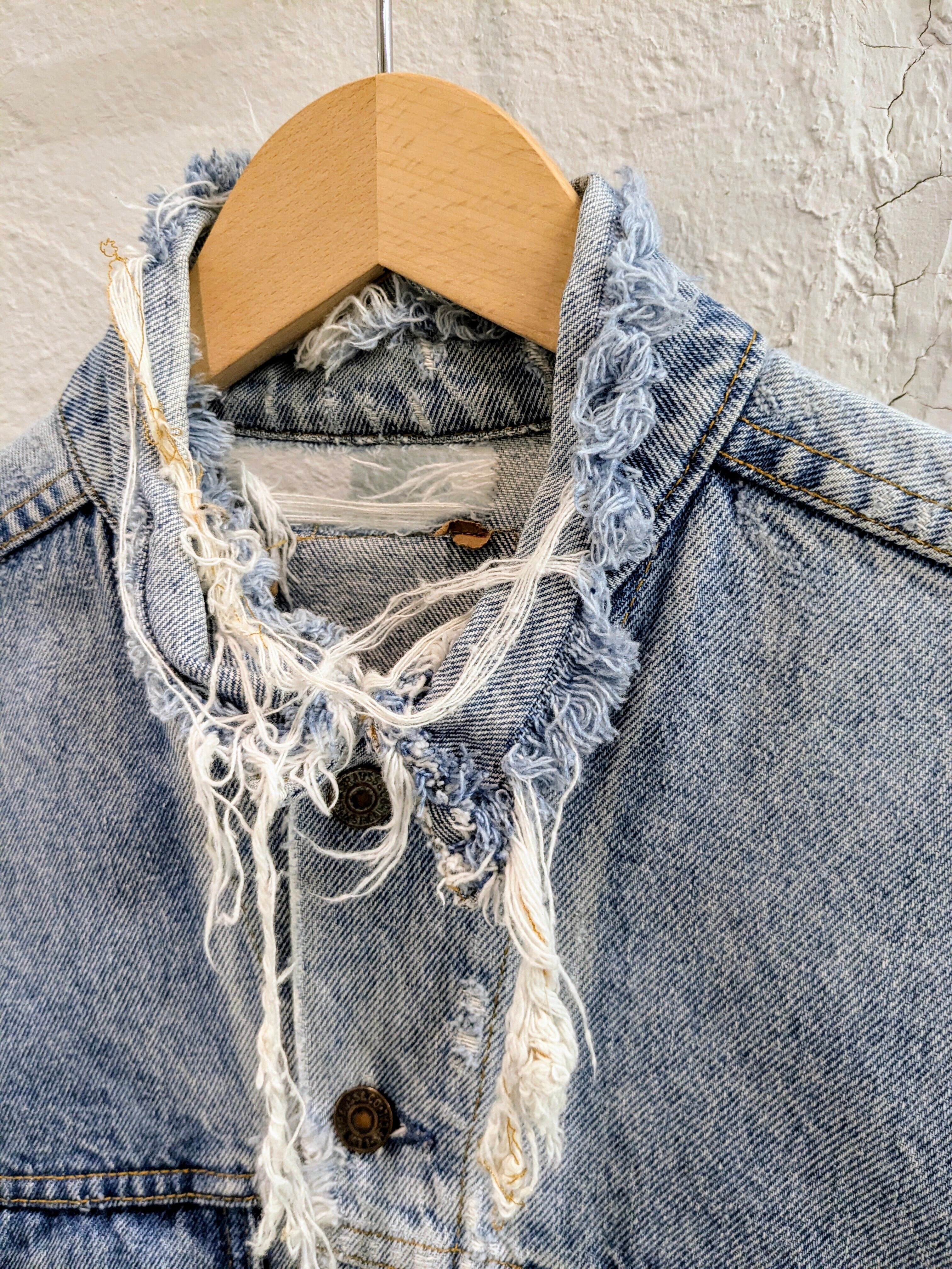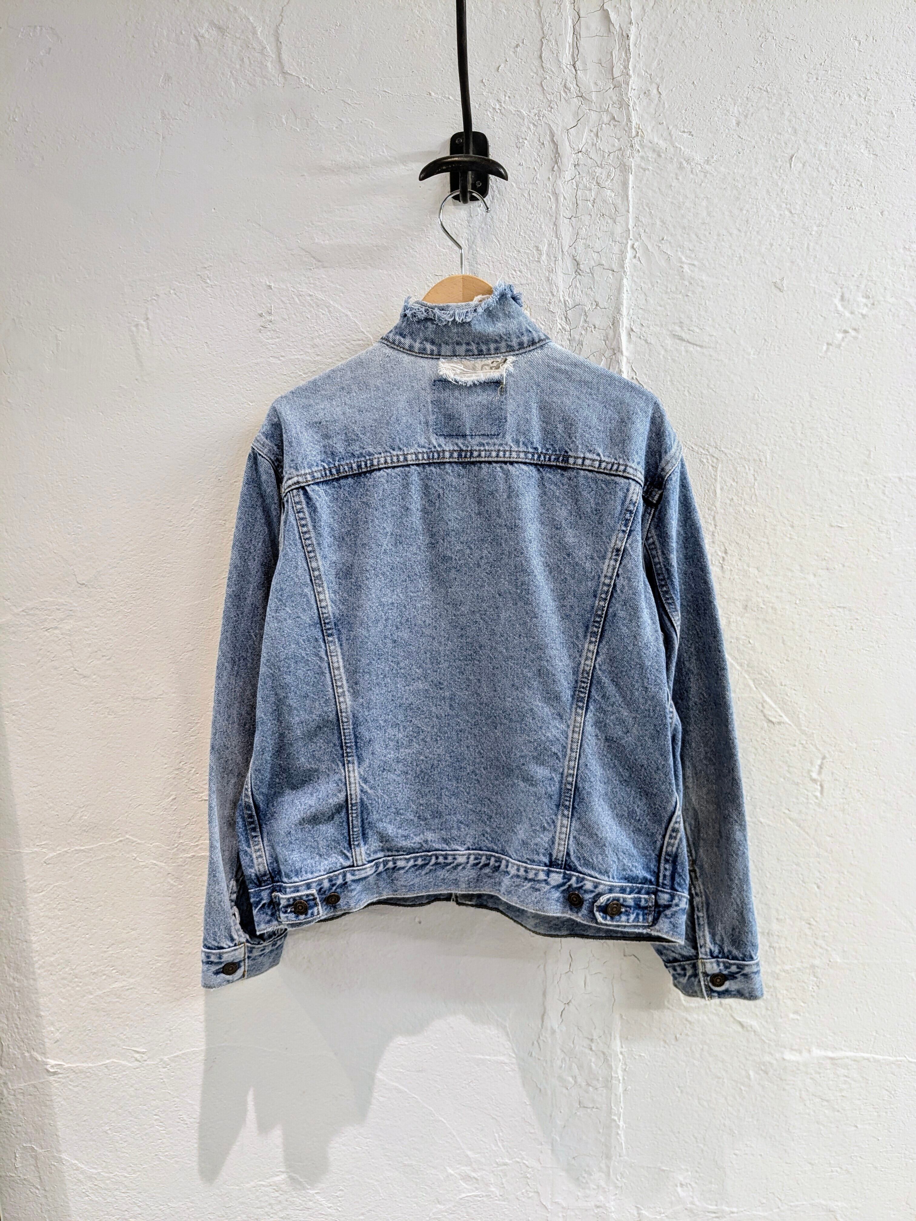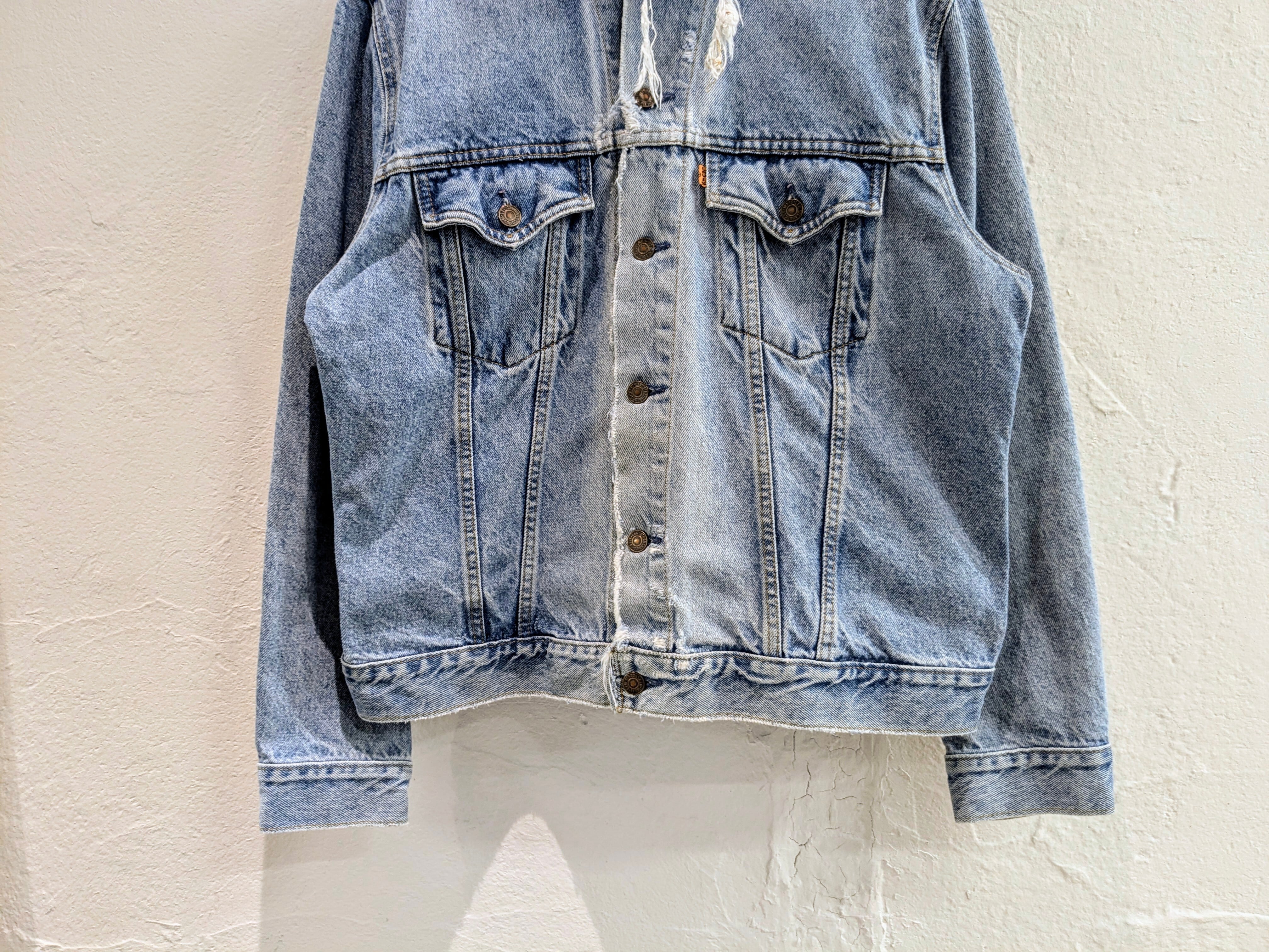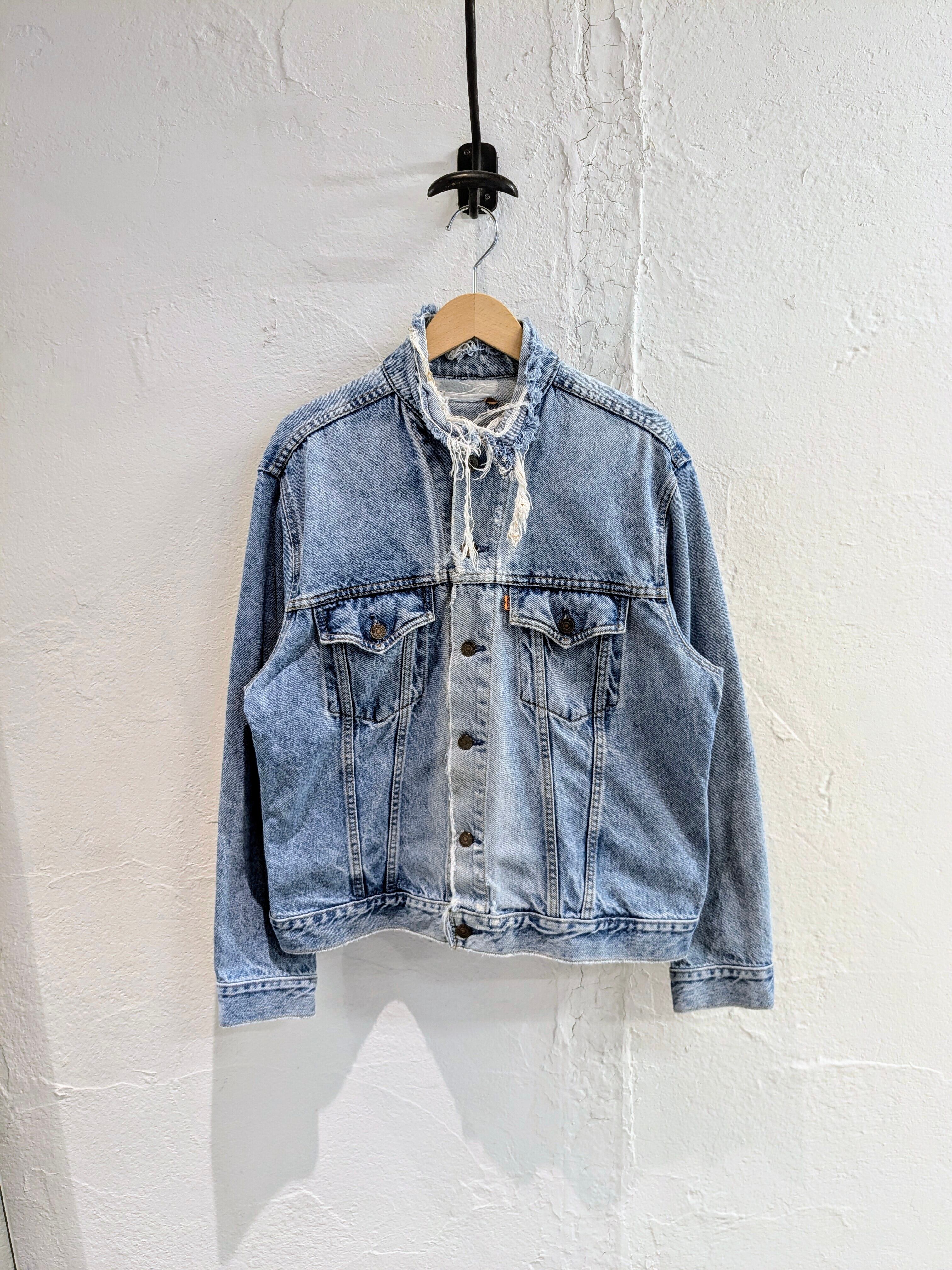 襟がなかったり、全体的に細かいダメージがあったりといい感じにボロのデニムジャケットです。