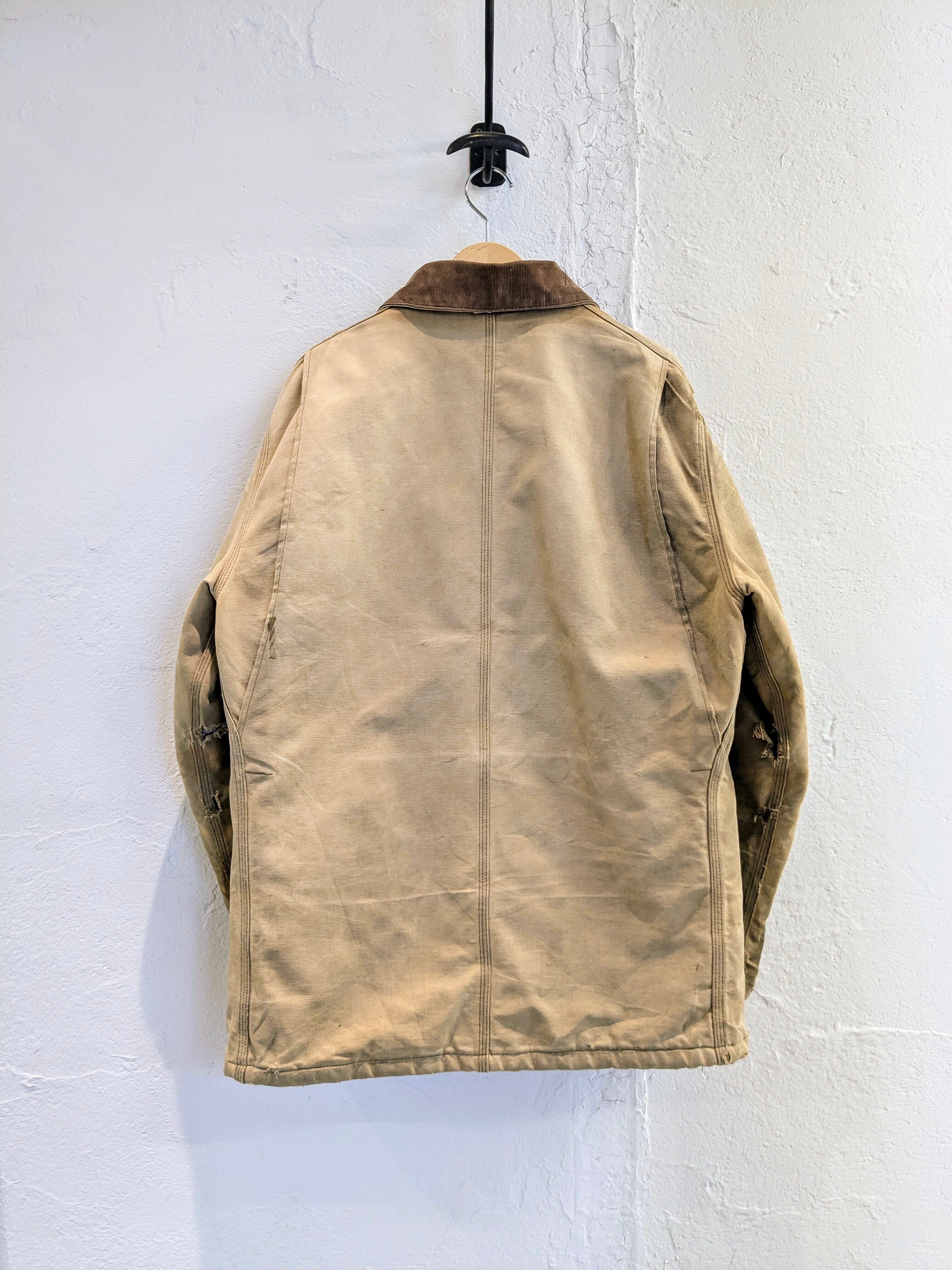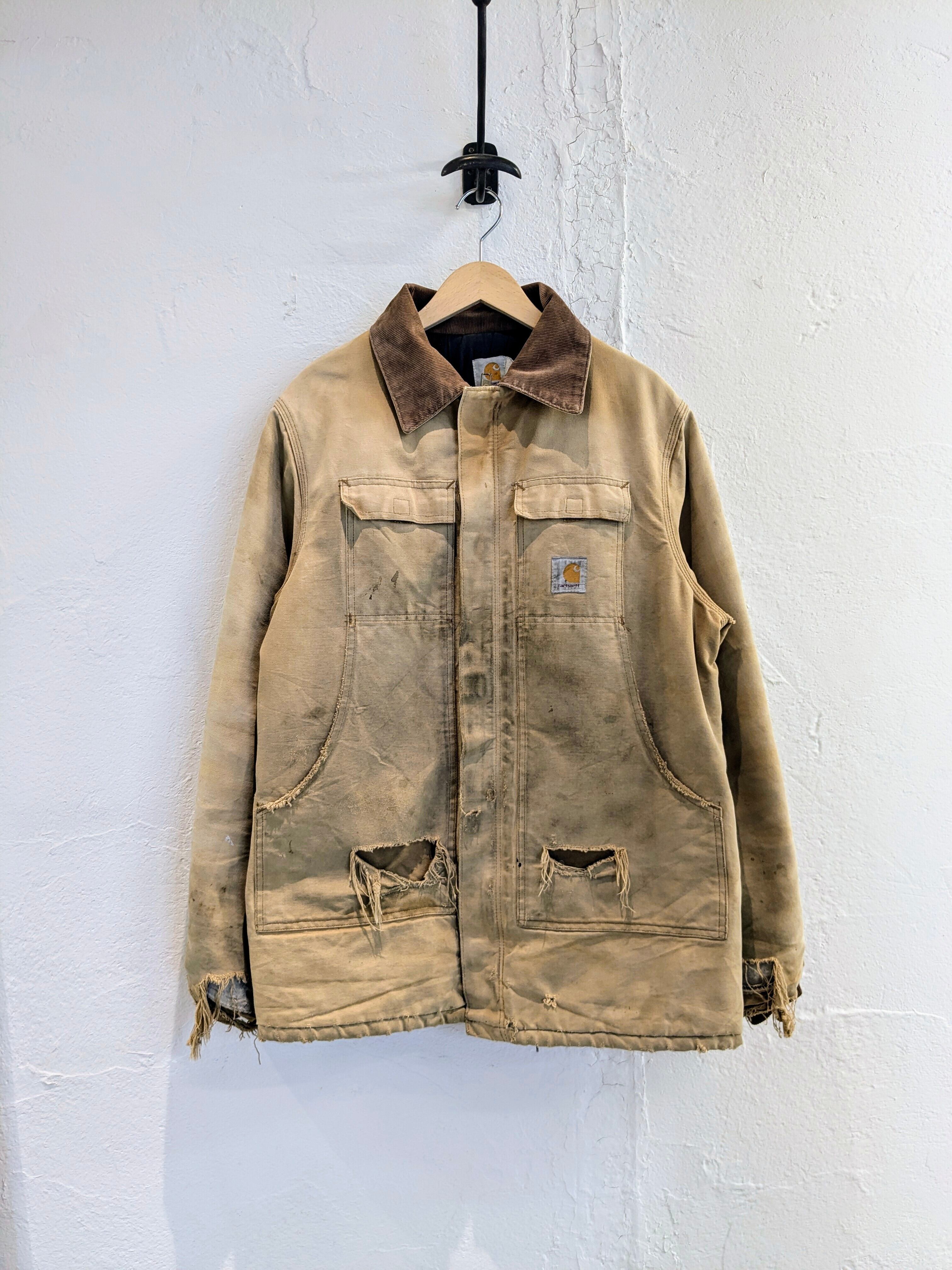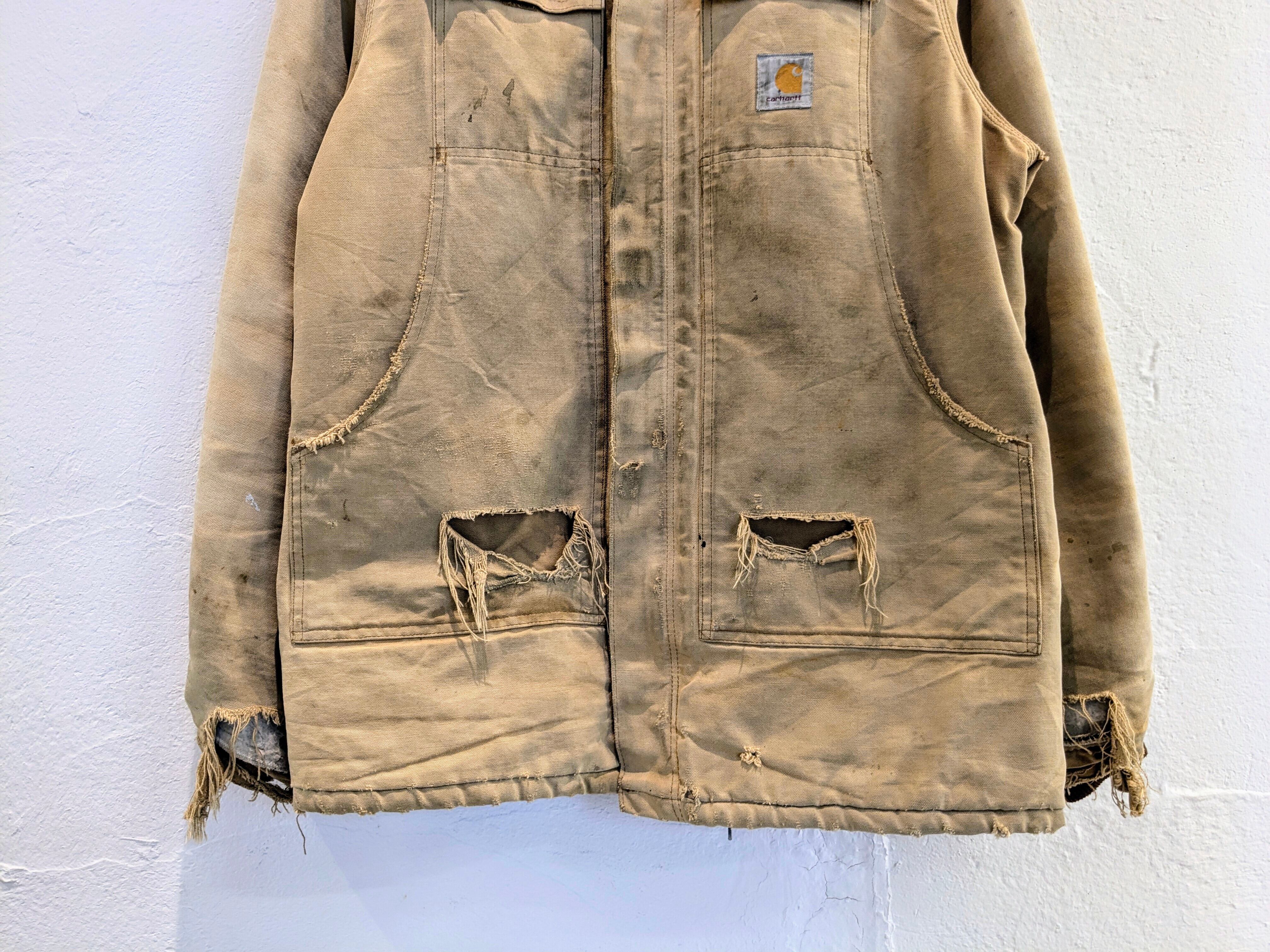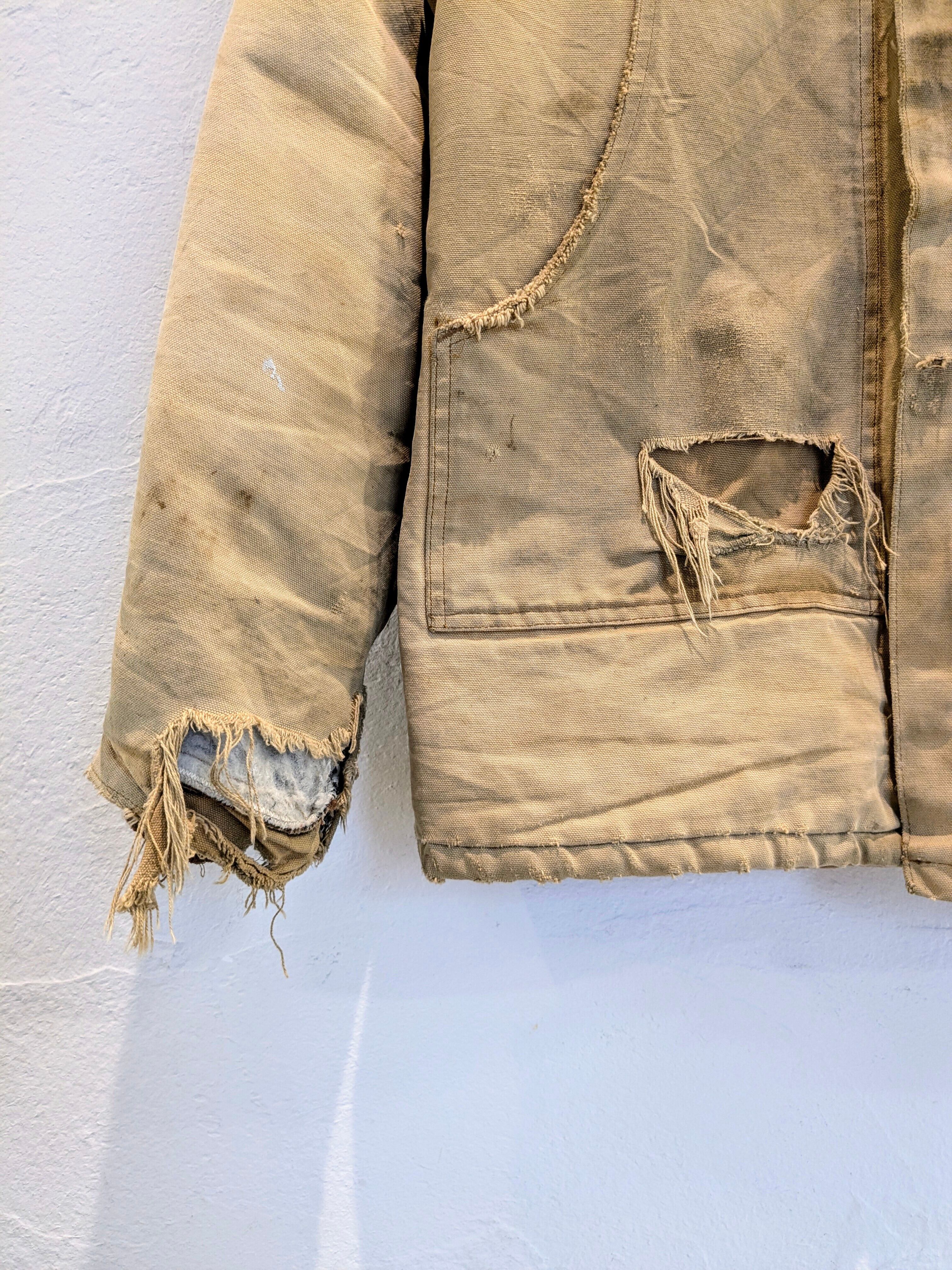 写真で見てもらった通りかなりのボロとなっています。ポケットも貫通、袖口と全体的にもダメージと汚れがあります。こういったボロ加減がお好きな方も多いかと思います。裏地のキルティング部分に関しては綺麗でまだまだ着ていただけます。こんなに味のある古着はなかなか探すとないかと思います。