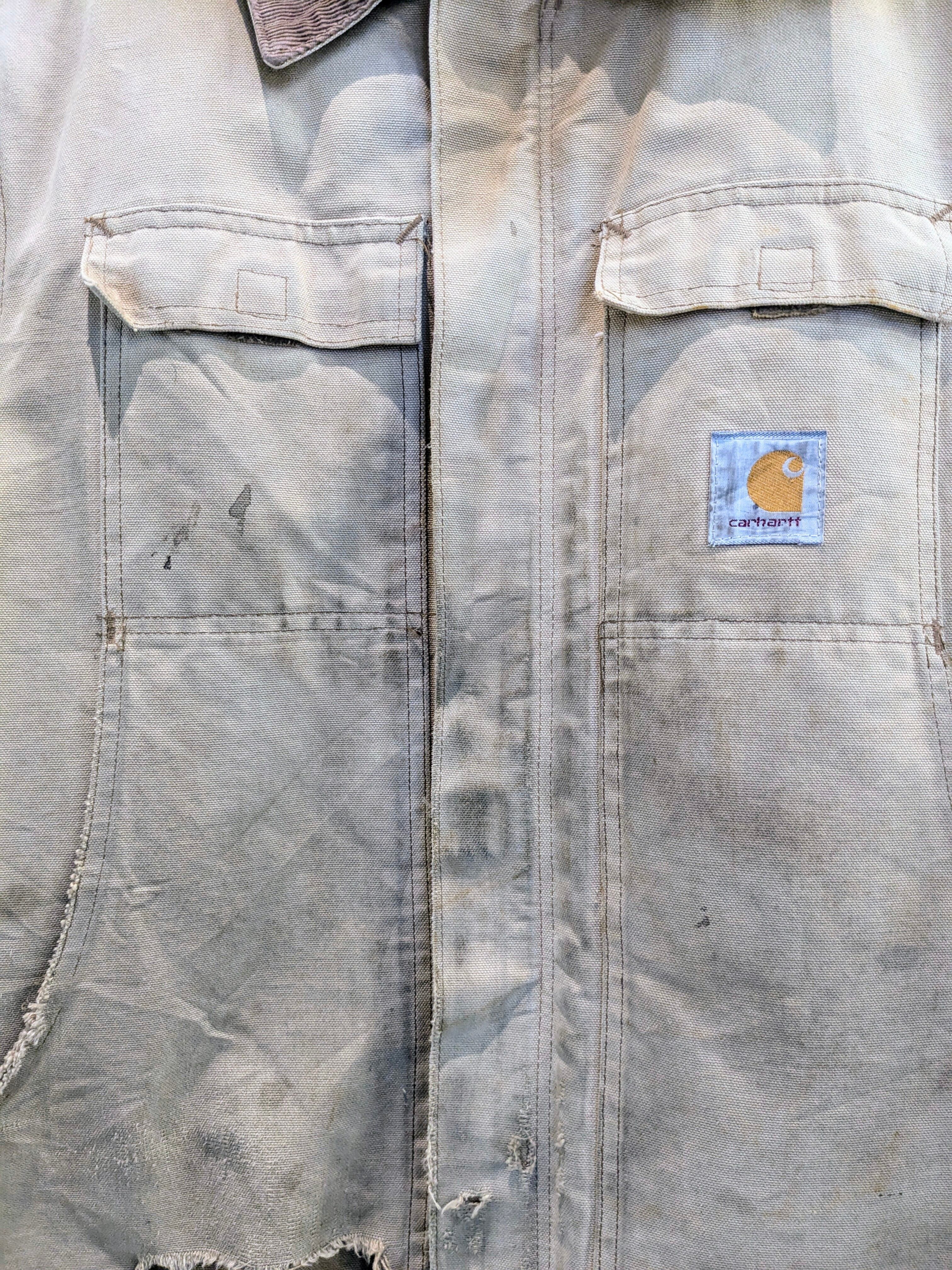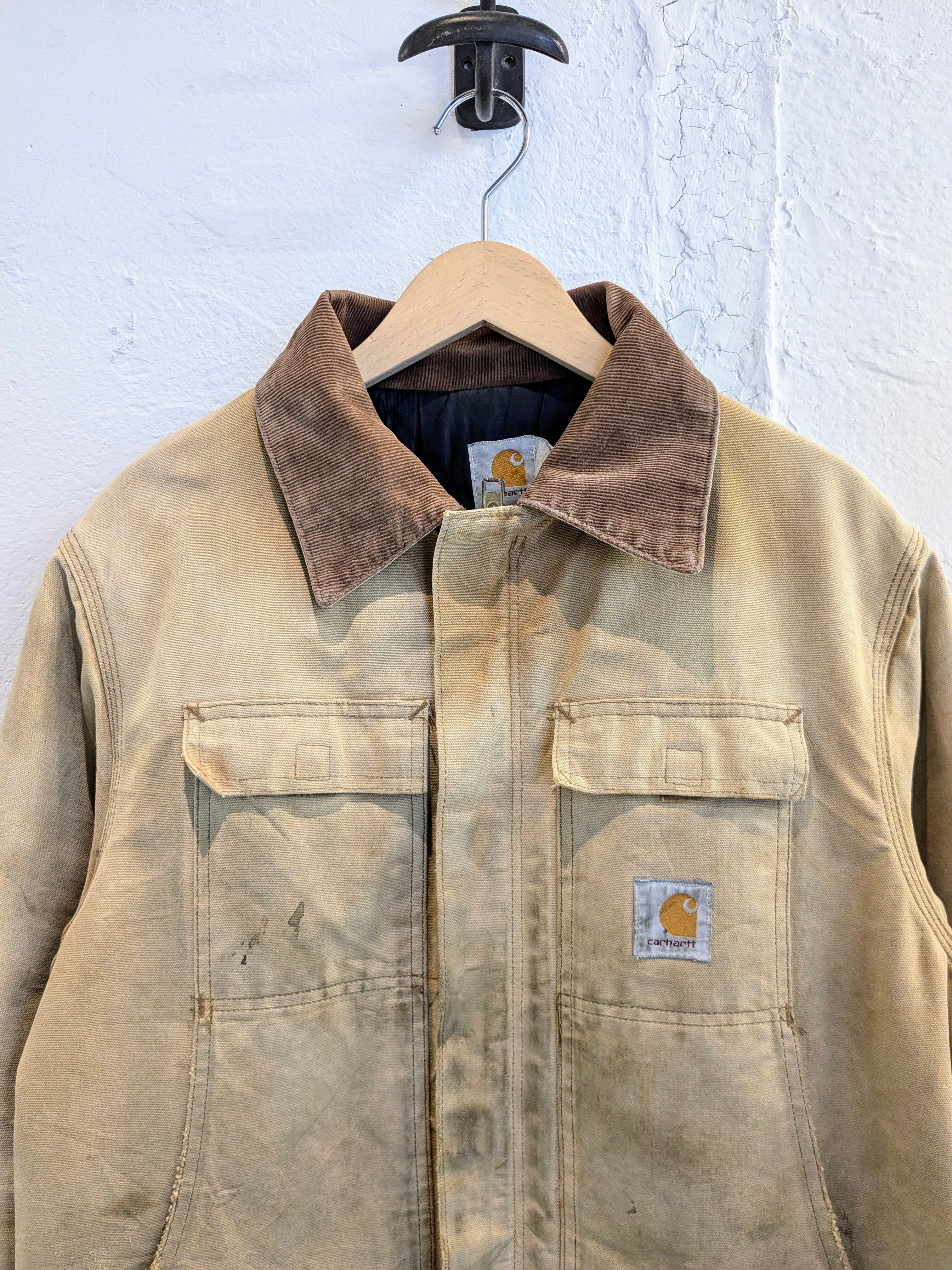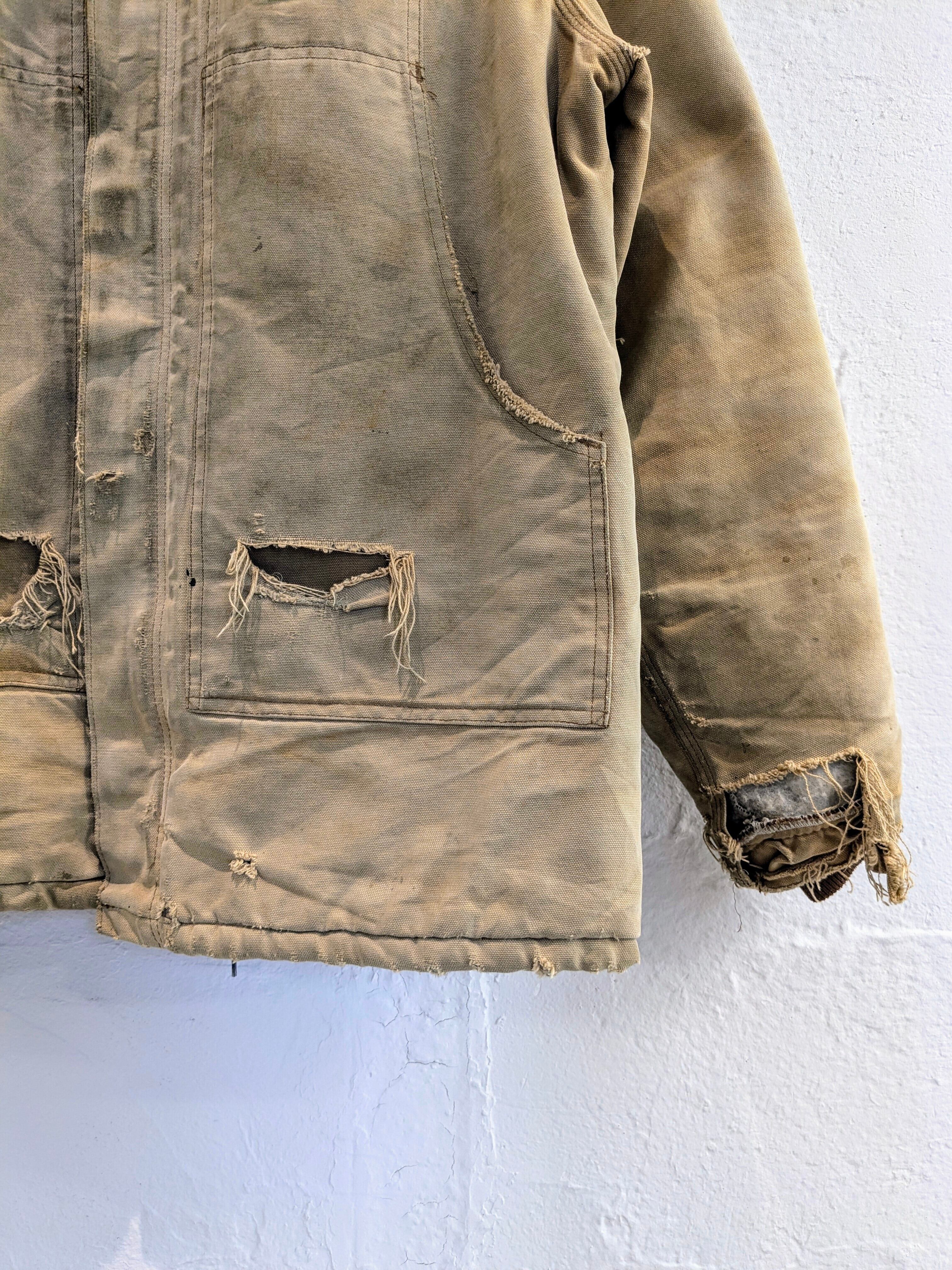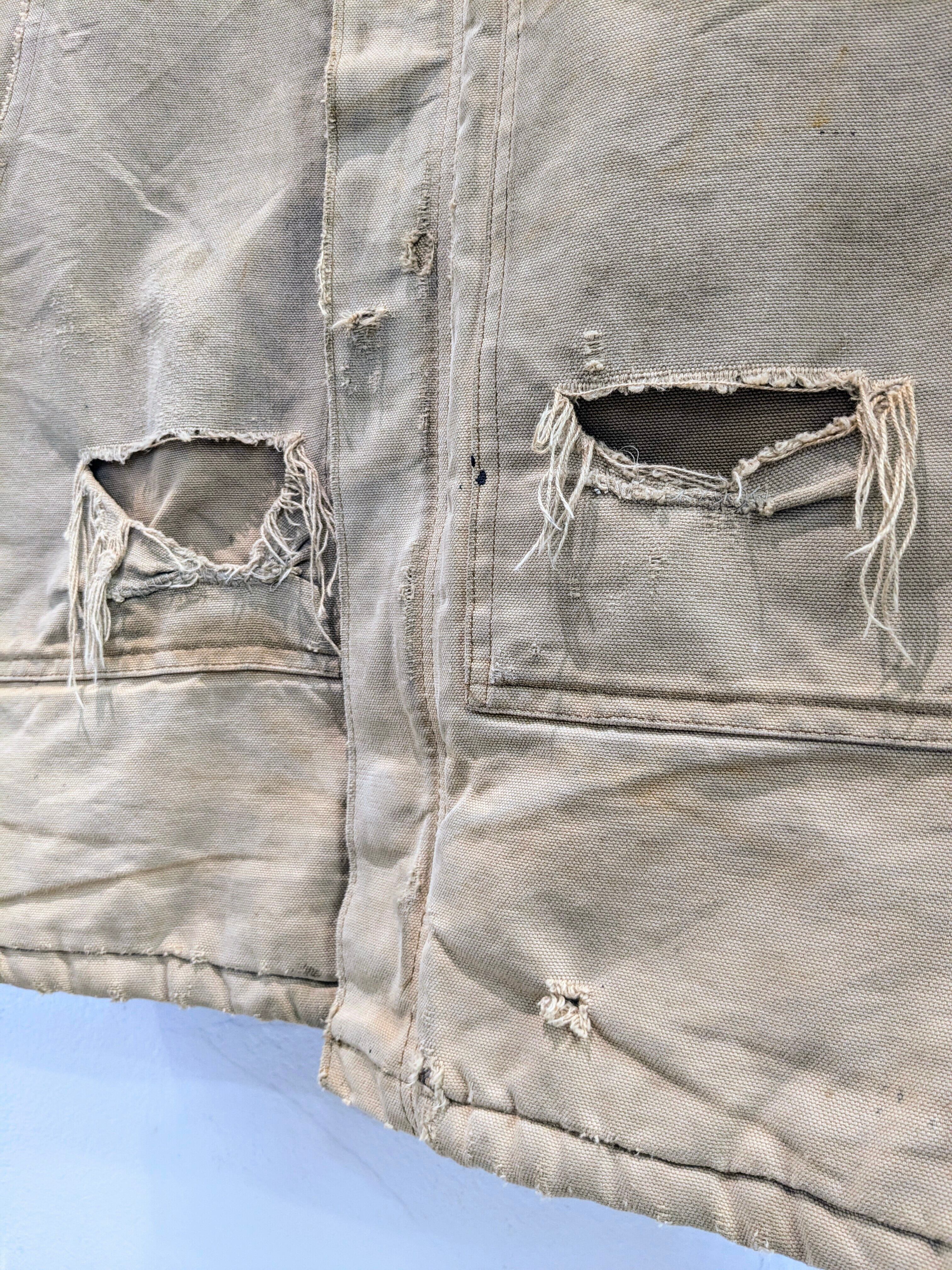 写真で見てもらった通りかなりのボロとなっています。ポケットも貫通、袖口と全体的にもダメージと汚れがあります。こういったボロ加減がお好きな方も多いかと思います。裏地のキルティング部分に関しては綺麗でまだまだ着ていただけます。こんなに味のある古着はなかなか探すとないかと思います。