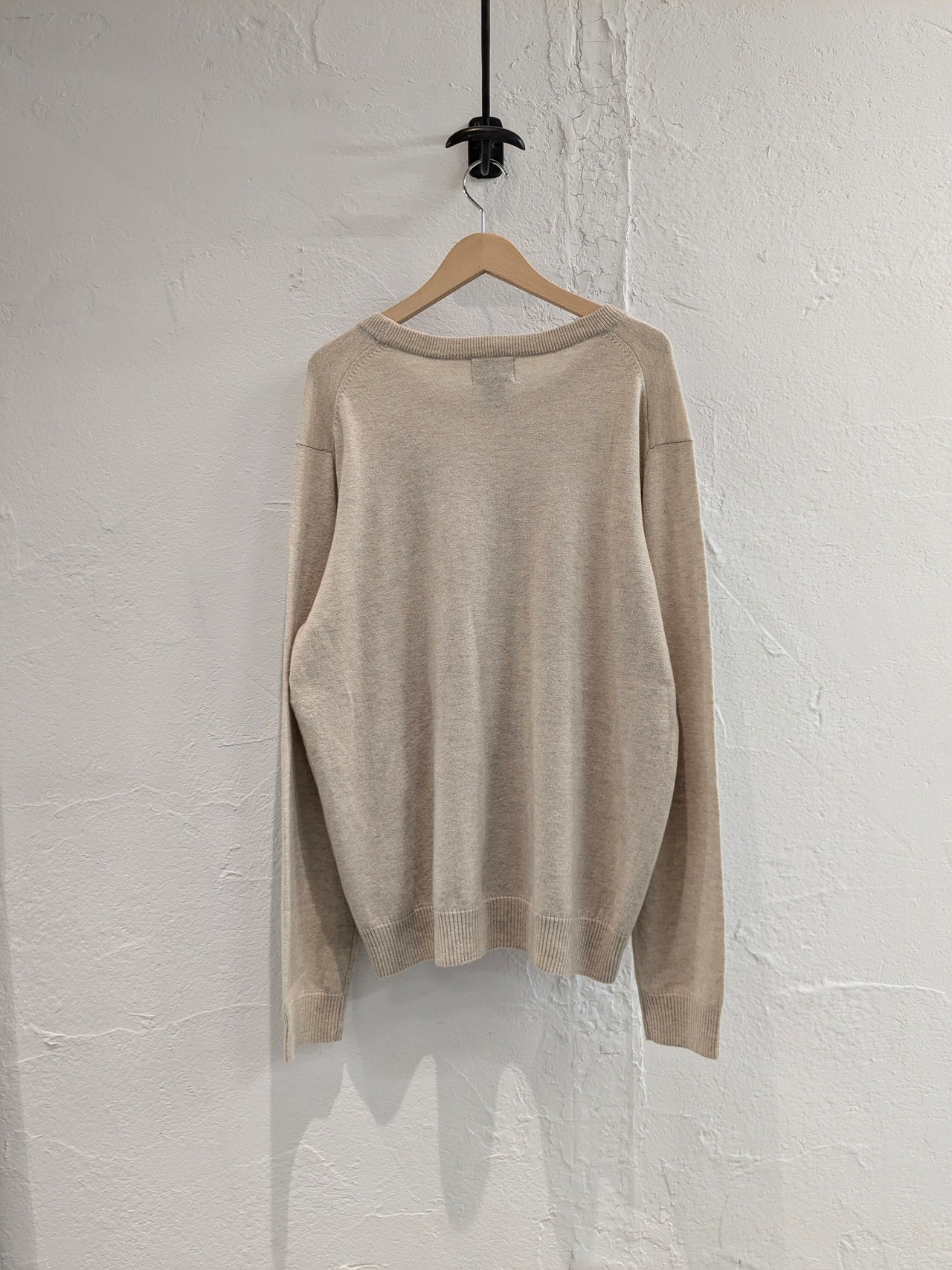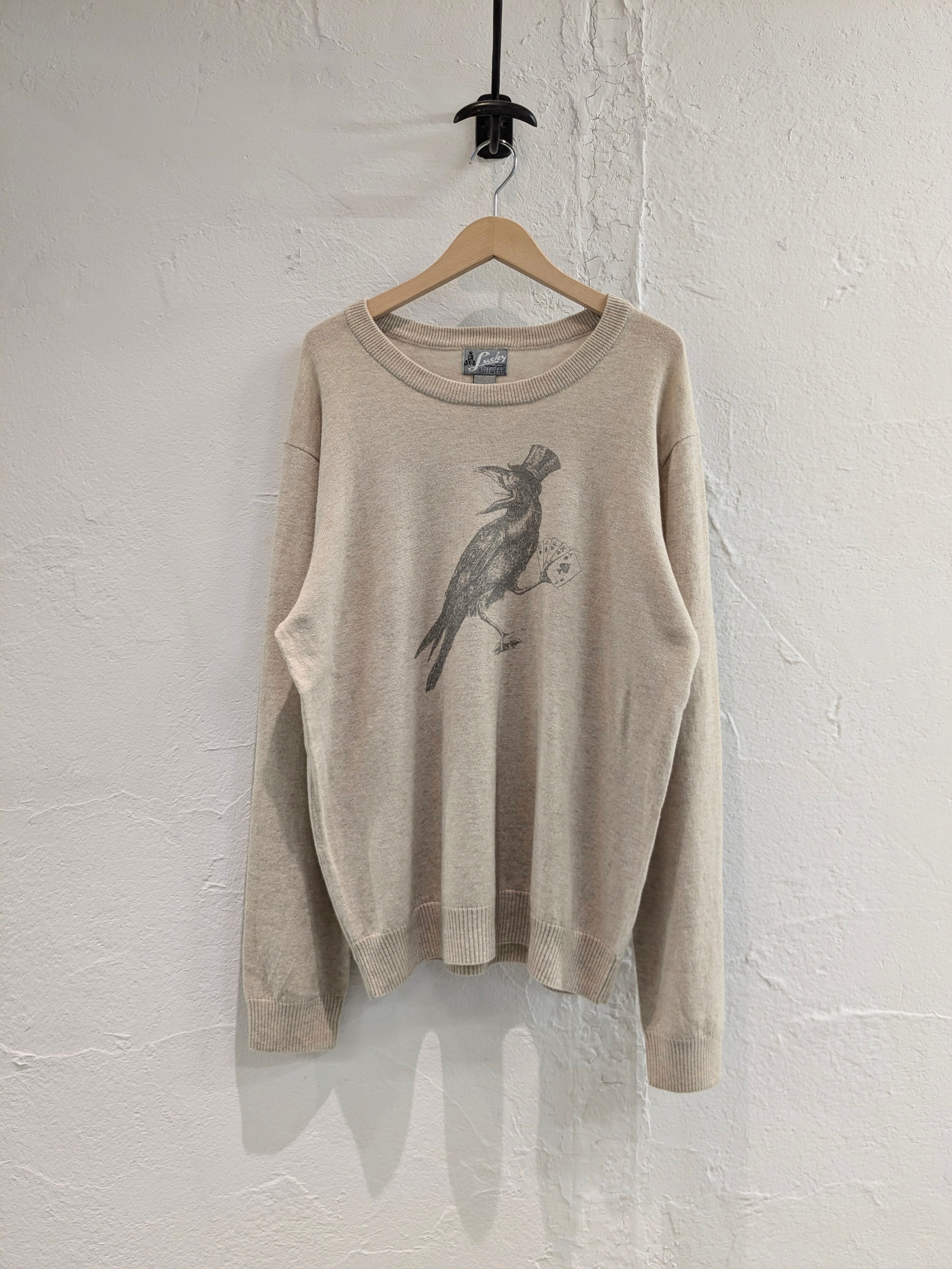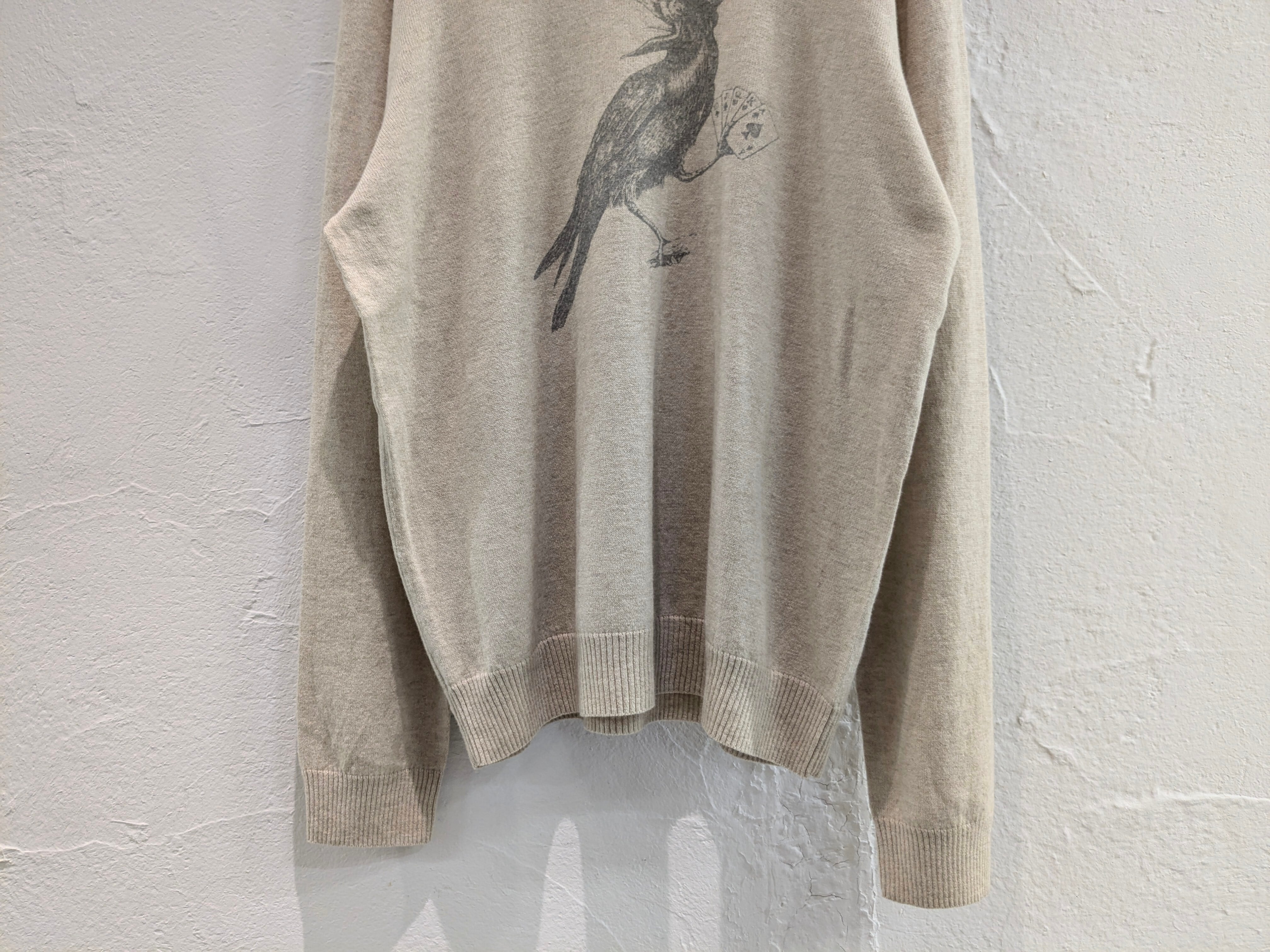 カラスがトランプでロイヤルストレートフラッシュを出しているデザインが入ったハイゲージニット。ウールの比率が高いですが、チクチクせずとても肌触りがいいニットです。生成りの色がまた肌なじみがいい色となっていますので、スタイリングに取り入れやすいです。