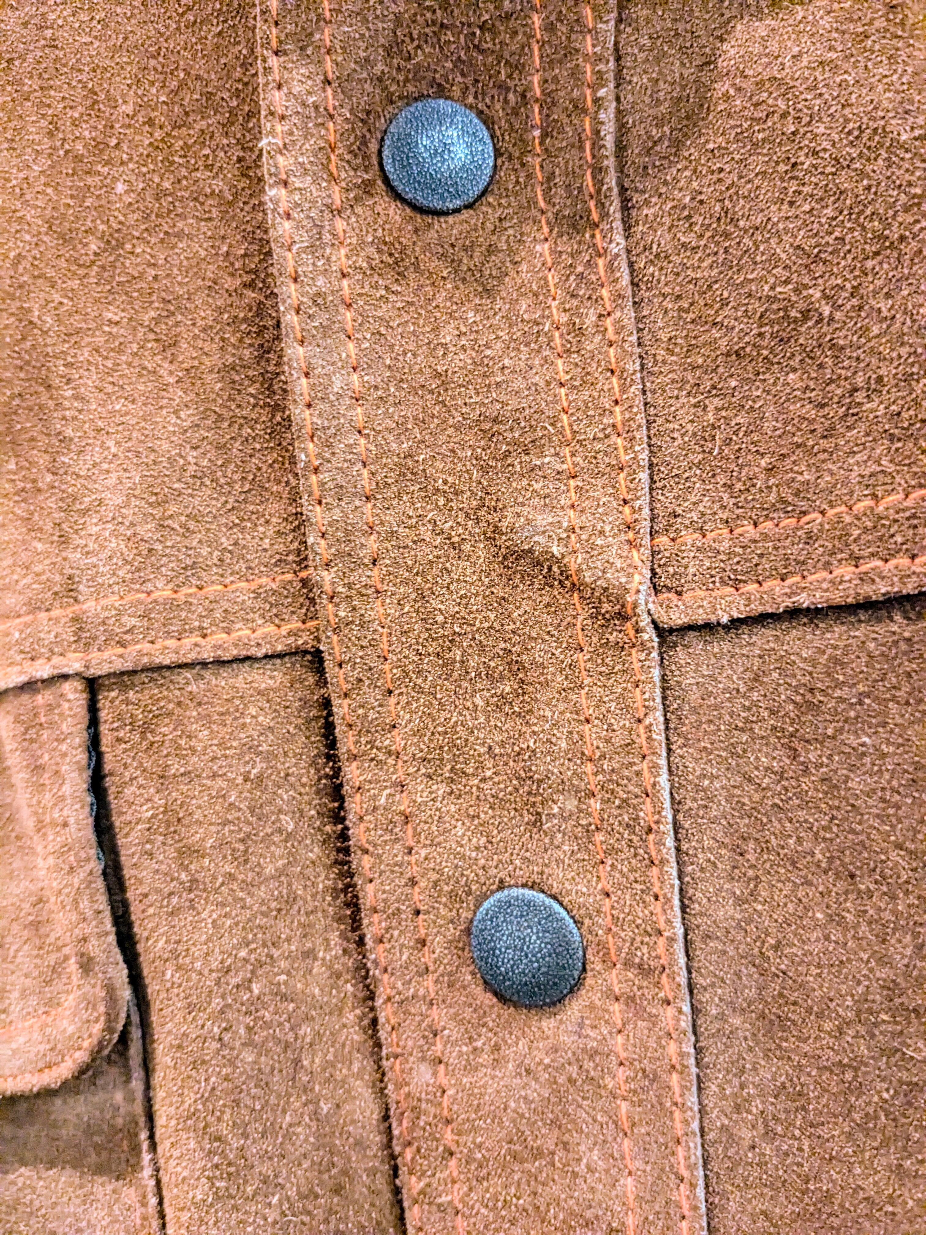 ブラウンのボディにオレンジのステッチが効いています。生地に重みもあり、裏地も付いているので、防風性なども高く、これからの時期もちょうどいいかと。